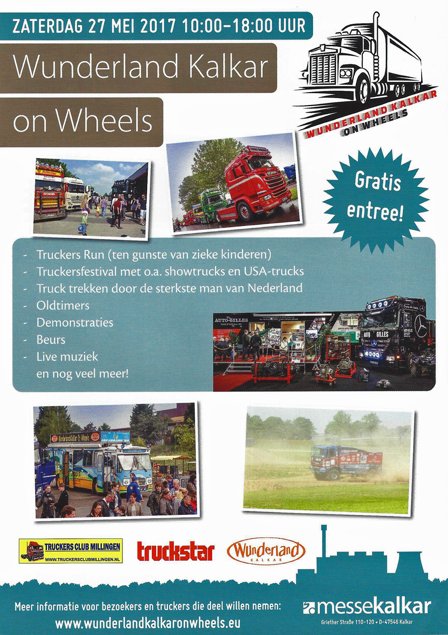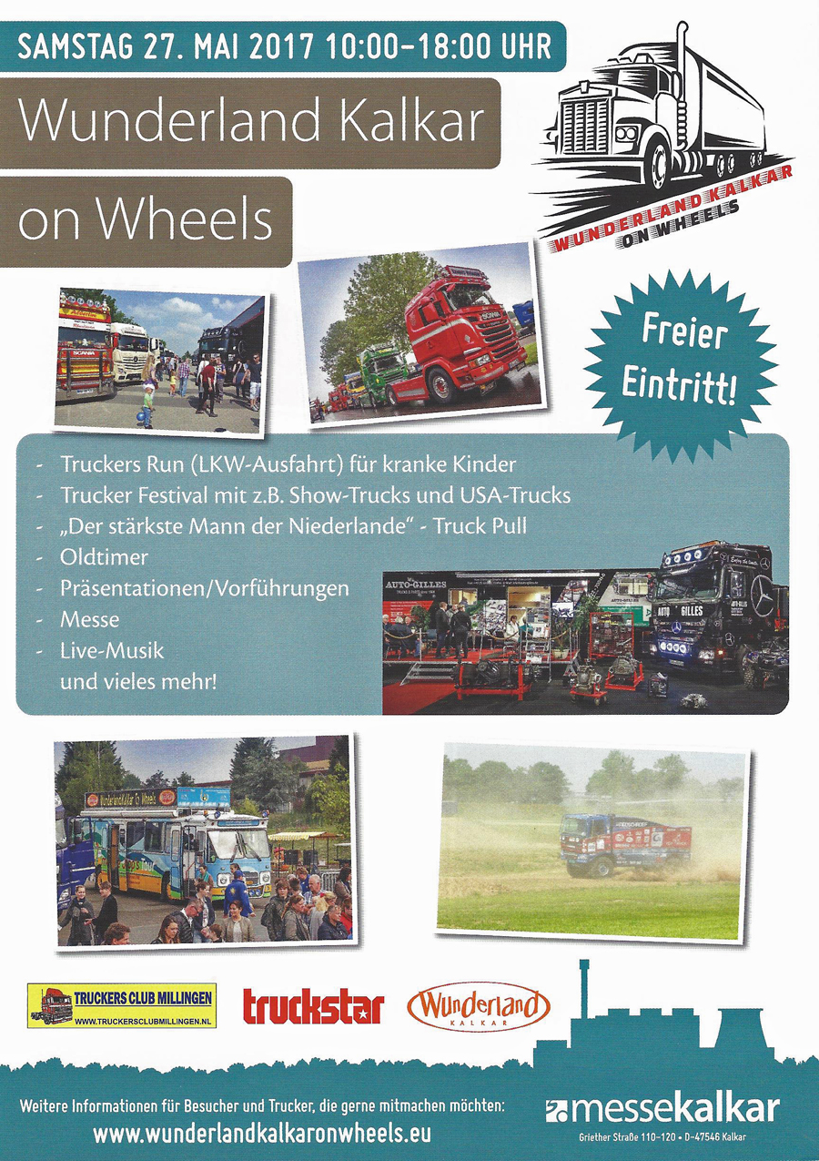 In diesem Jahr findet das deutsch-niederländische Truckersfestival "Wunderland Kalkar on Wheels" bereits zum vierten mal auf dem Gelände des Kernwasserwunderlands in Kalkar statt. Im Rahmen der Show findet auch wieder ein Truckers Run (LKW-Ausfahrt) für kranke Kinder statt, an dem rund 130 deutsche und niederländsiche LKW teilnehmen werden. Die Show bietet normale Trucks, SHowtrucks, US-Trucks, Oldtimier und Schwertransport-LKW. Eine ganze Messehalle ist für Aussteller reserviert, die Zubehör und LKW zeigen werden. Dazu gibt es Live-Musik und noch mehr..... Und das alles bei freiem Eintritt. Ausreichend kostenlose Parkplätze für Besucher sind vorhanden.