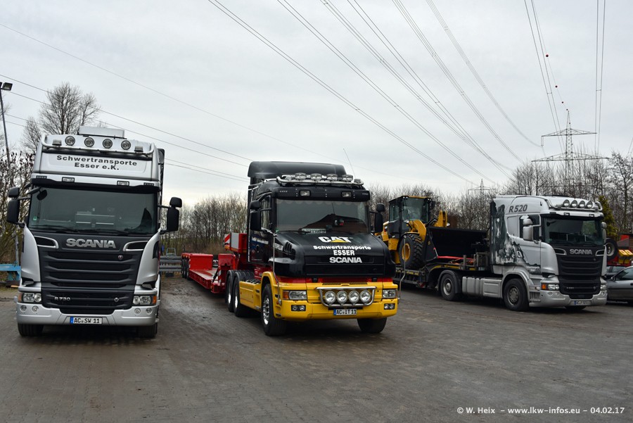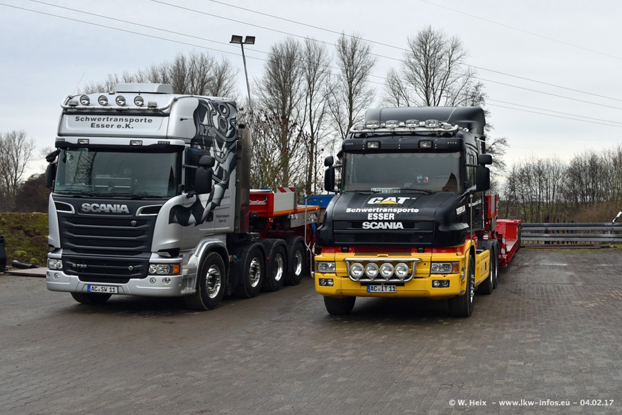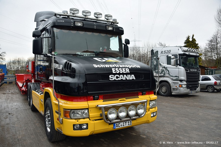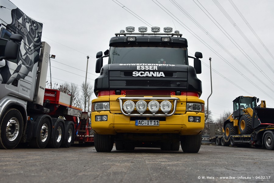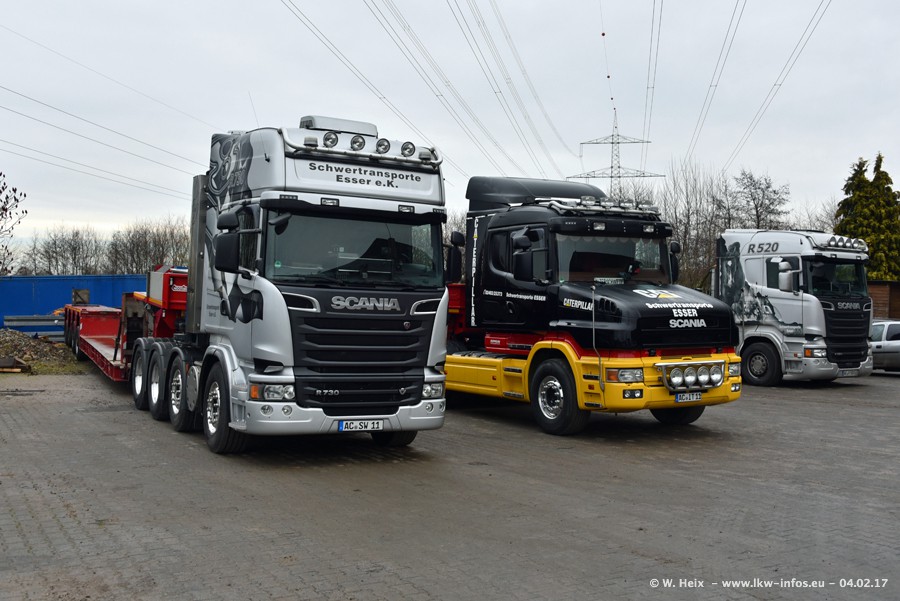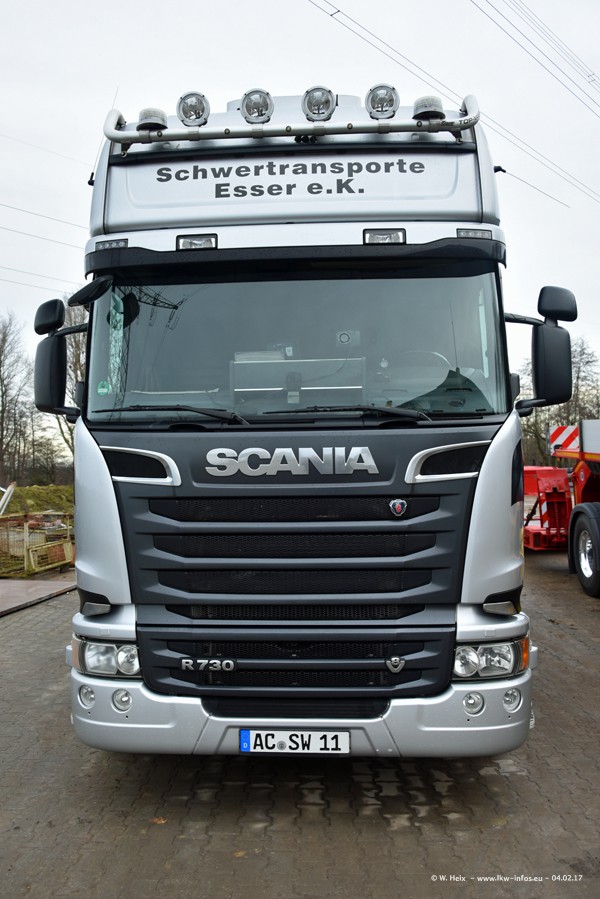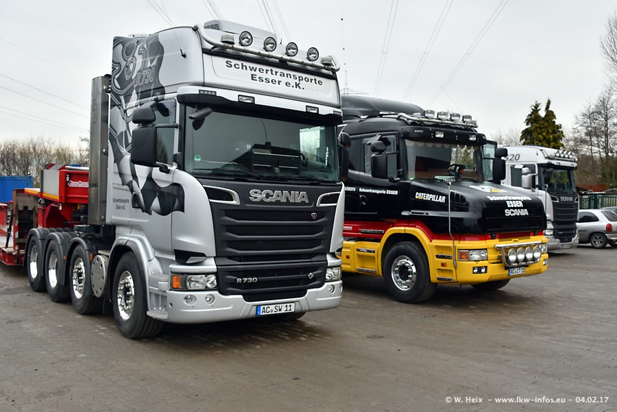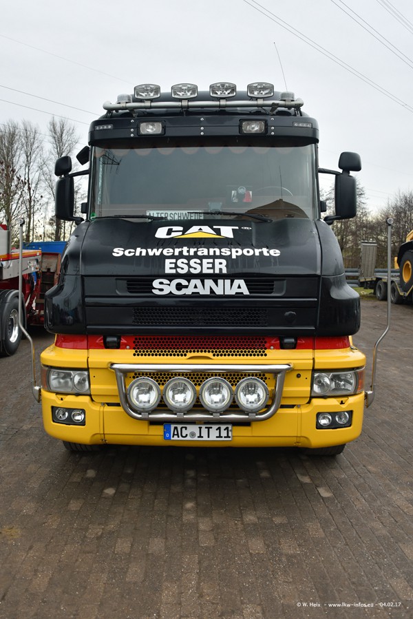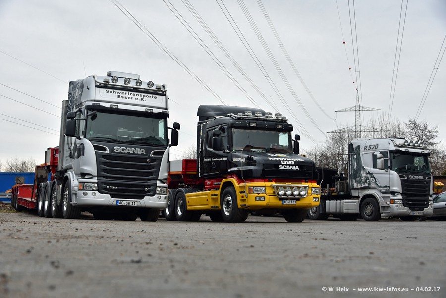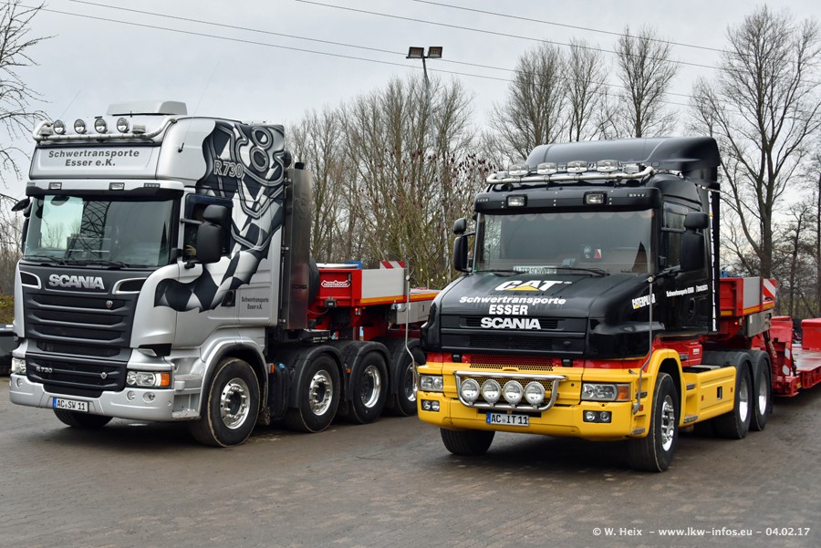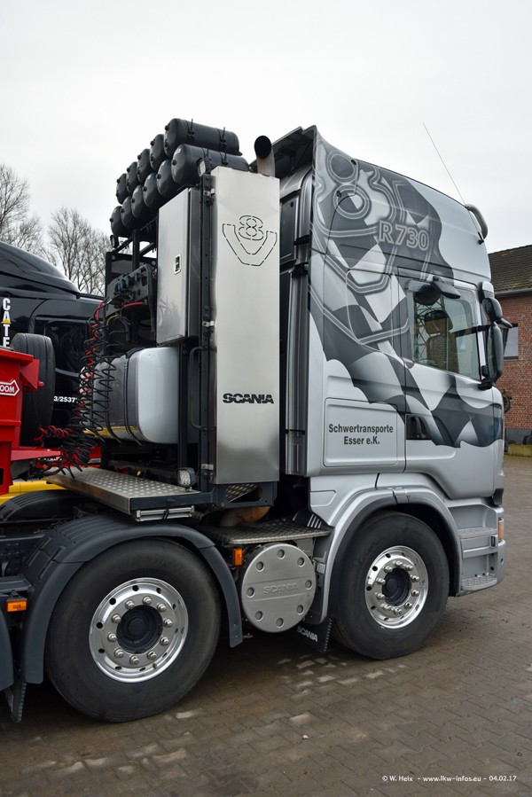Dies war mein erster Besuch bei der Firma Esser Schwertransporte in Würselen. Der Furhpark besteht aus 7 LKW: 1 DAF, 2 Volvo 4 Scania. Leider waren ein Scania und der Volvo FH16 750 10x4 in der Werkstatt. Bilder vom Volvo gibt es aber im Teil 2 zu sehen und nach dem nächsten Besuch bei Esser... Der Scania T 164 G 580 V8 ist Baujahr 2001 und wurde komplett neu aufgebaut (innen und außen). Dieser LKW wird noch regelmässig eingesetzt und nicht verkauft!