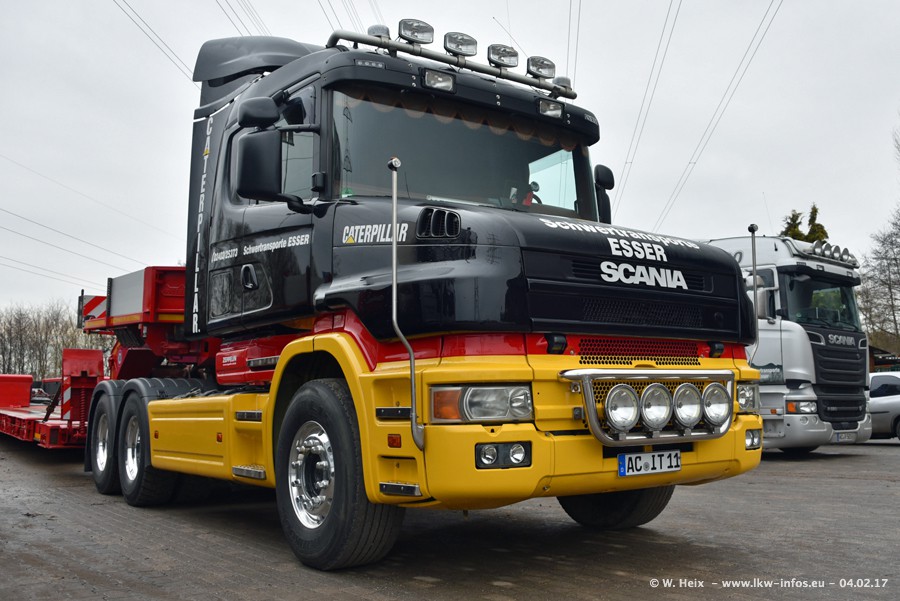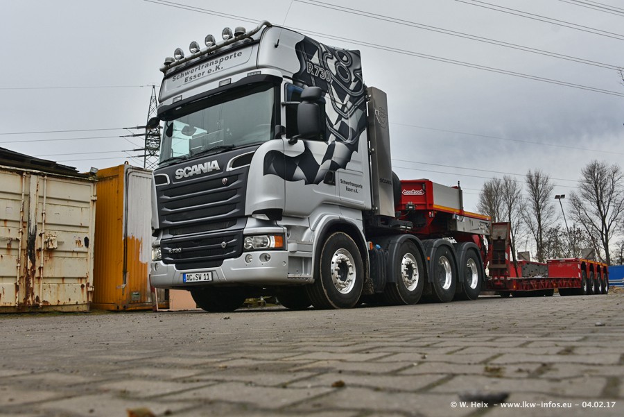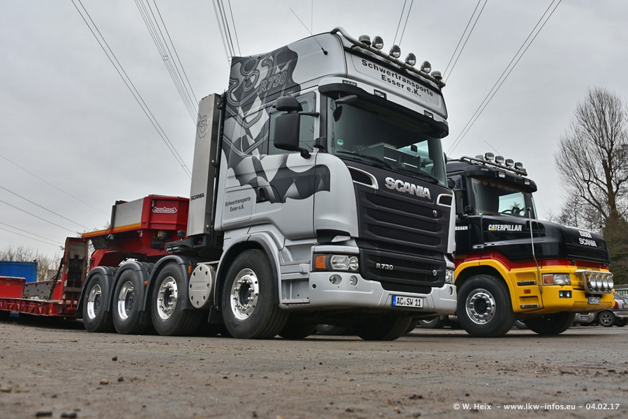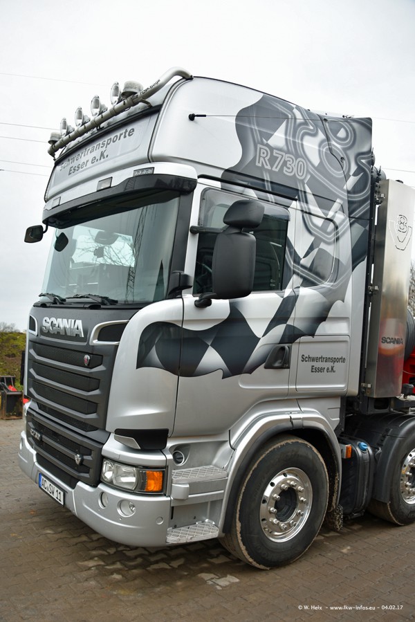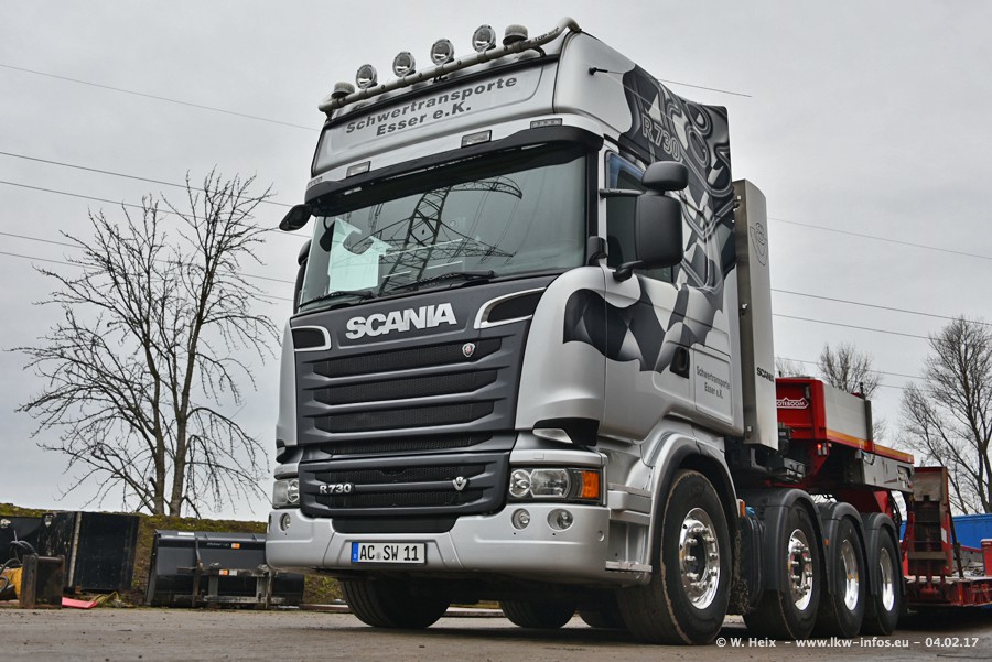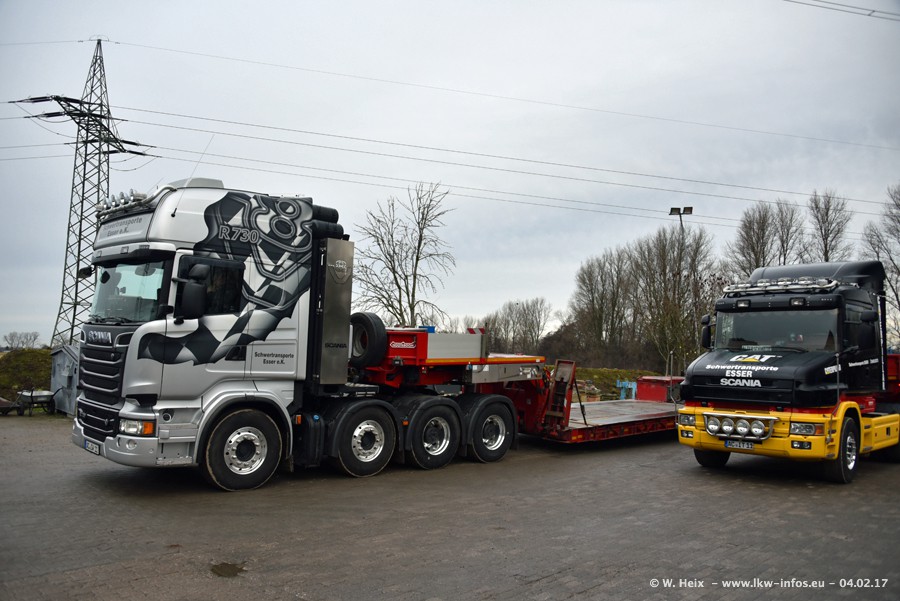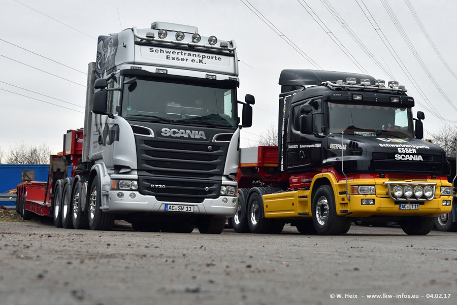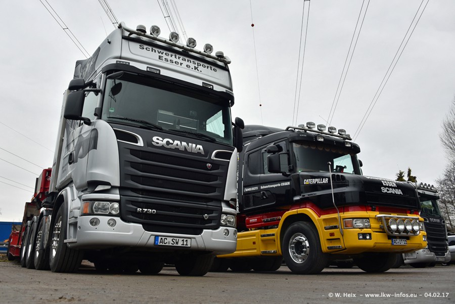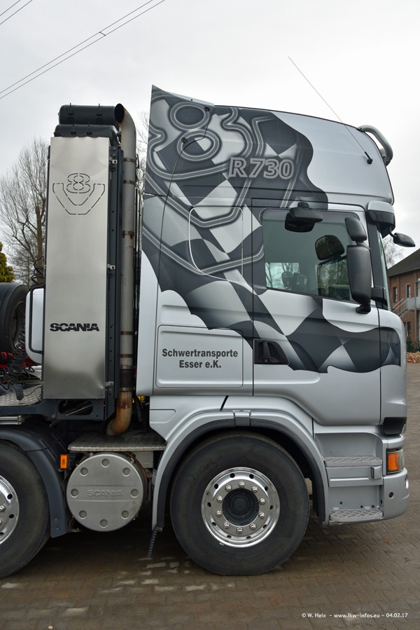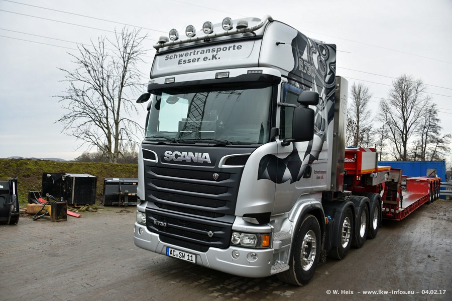 Dies war mein erster Besuch bei der Firma Esser Schwertransporte in Würselen. Der Furhpark besteht aus 7 LKW: 1 DAF, 2 Volvo 4 Scania. Leider waren ein Scania und der Volvo FH16 750 10x4 in der Werkstatt. Bilder vom Volvo gibt es aber im Teil 2 zu sehen und nach dem nächsten Besuch bei Esser... Der Scania T 164 G 580 V8 ist Baujahr 2001 und wurde komplett neu aufgebaut (innen und außen). Dieser LKW wird noch regelmässig eingesetzt und nicht verkauft!
