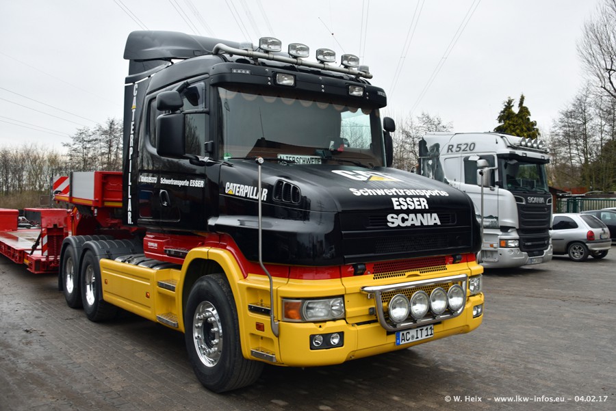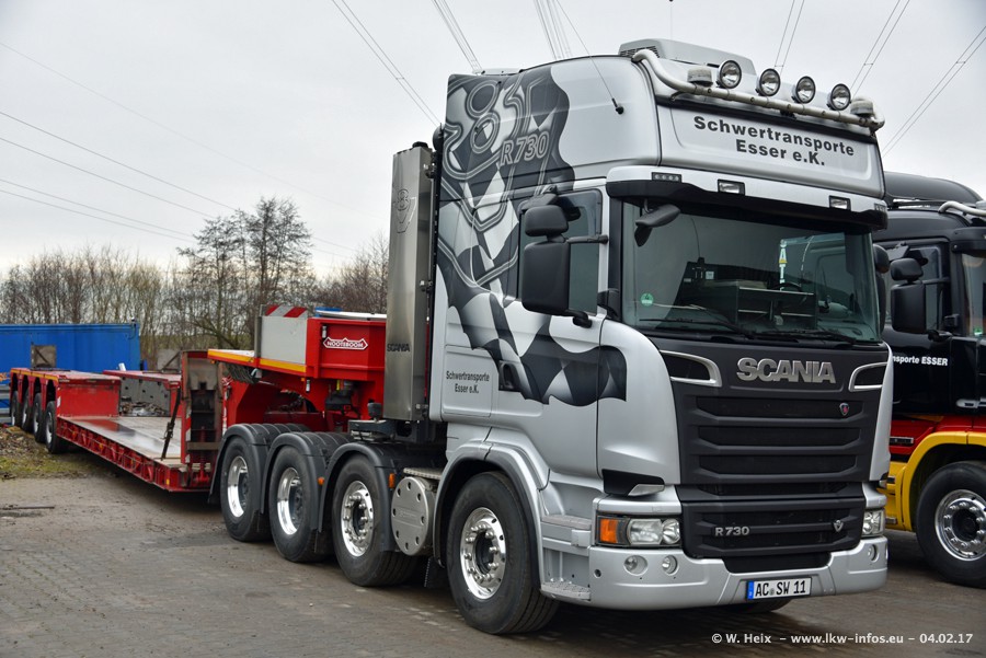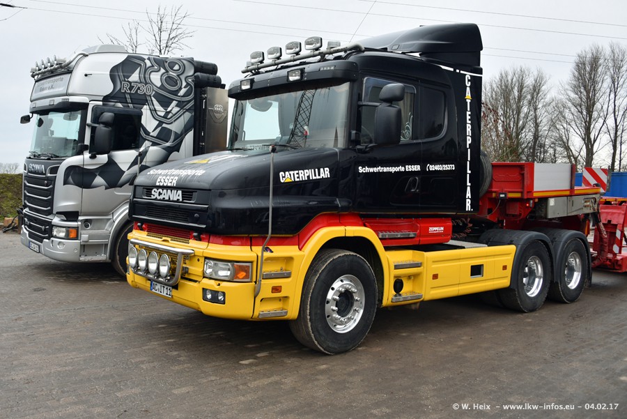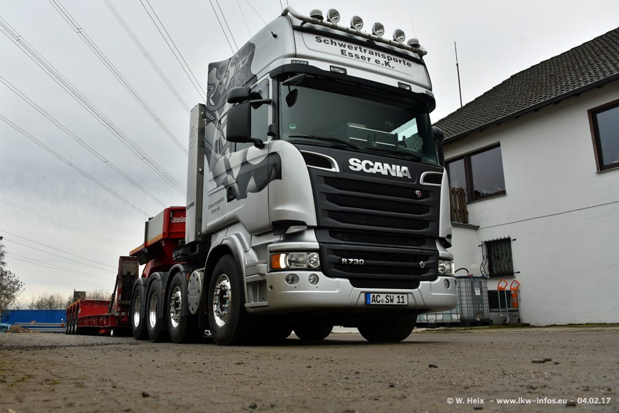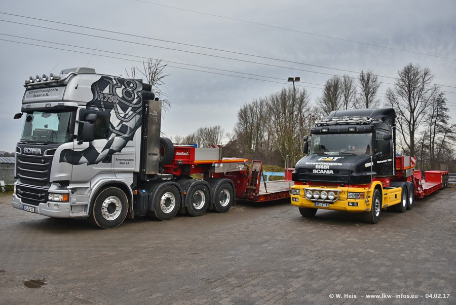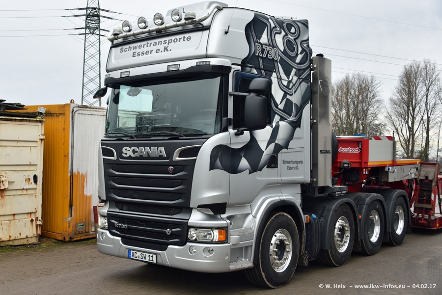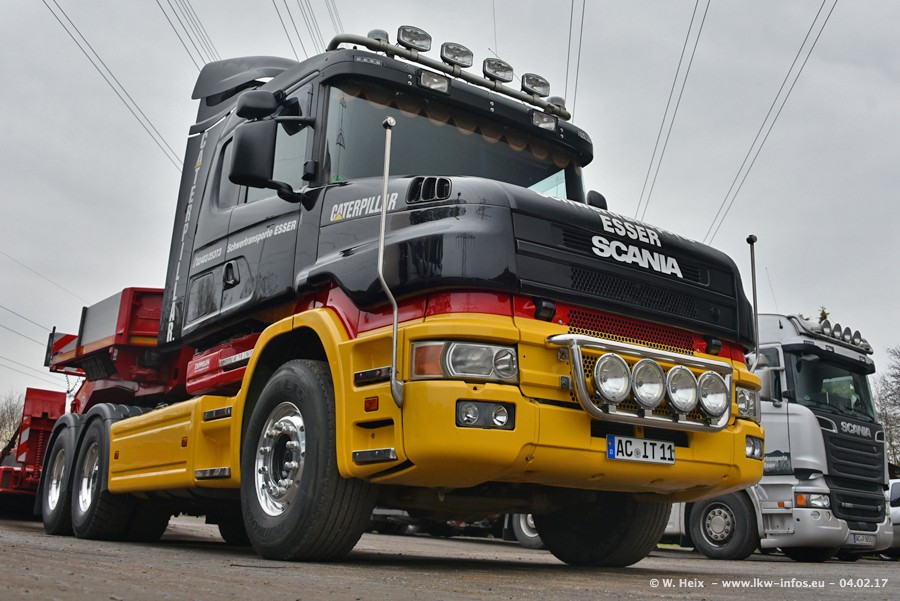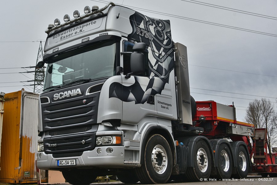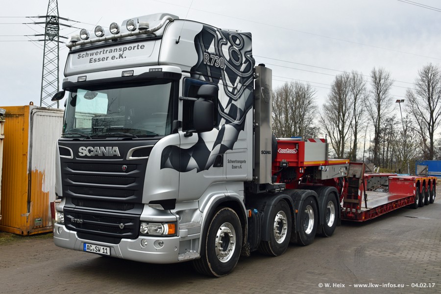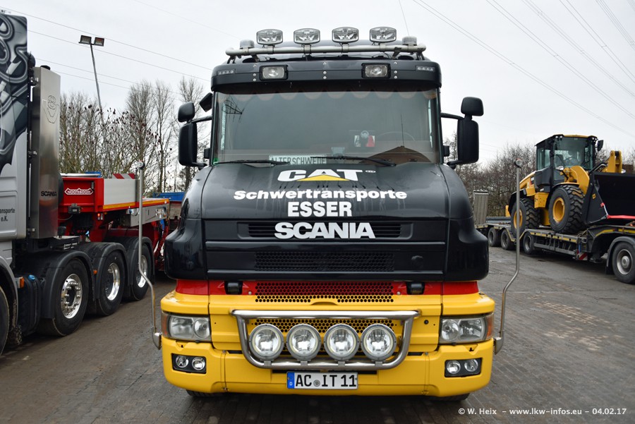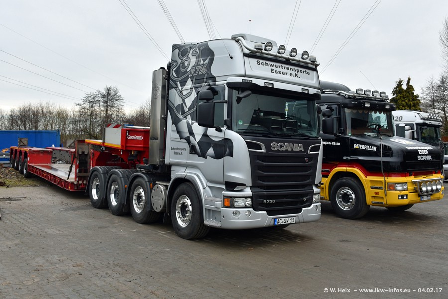 Dies war mein erster Besuch bei der Firma Esser Schwertransporte in Würselen. Der Furhpark besteht aus 7 LKW: 1 DAF, 2 Volvo 4 Scania. Leider waren ein Scania und der Volvo FH16 750 10x4 in der Werkstatt. Bilder vom Volvo gibt es aber im Teil 2 zu sehen und nach dem nächsten Besuch bei Esser... Der Scania T 164 G 580 V8 ist Baujahr 2001 und wurde komplett neu aufgebaut (innen und außen). Dieser LKW wird noch regelmässig eingesetzt und nicht verkauft!