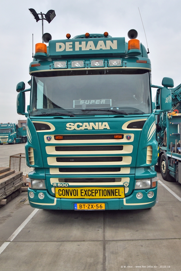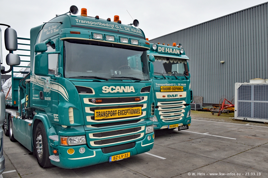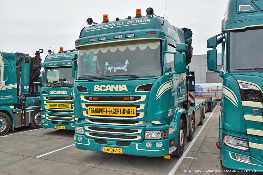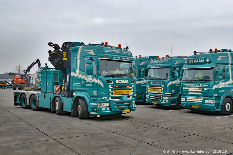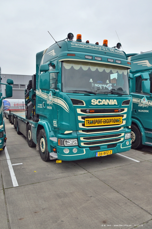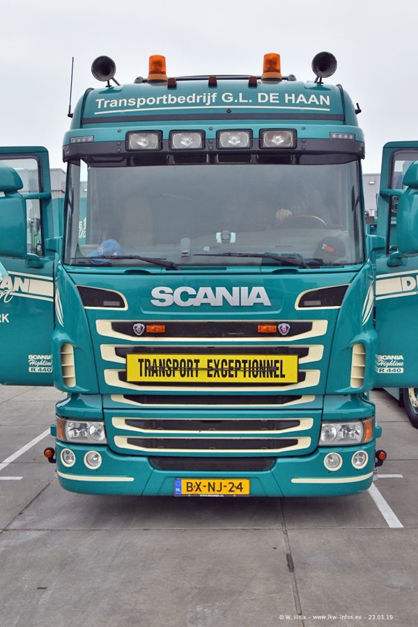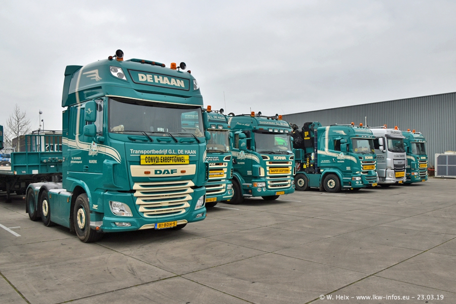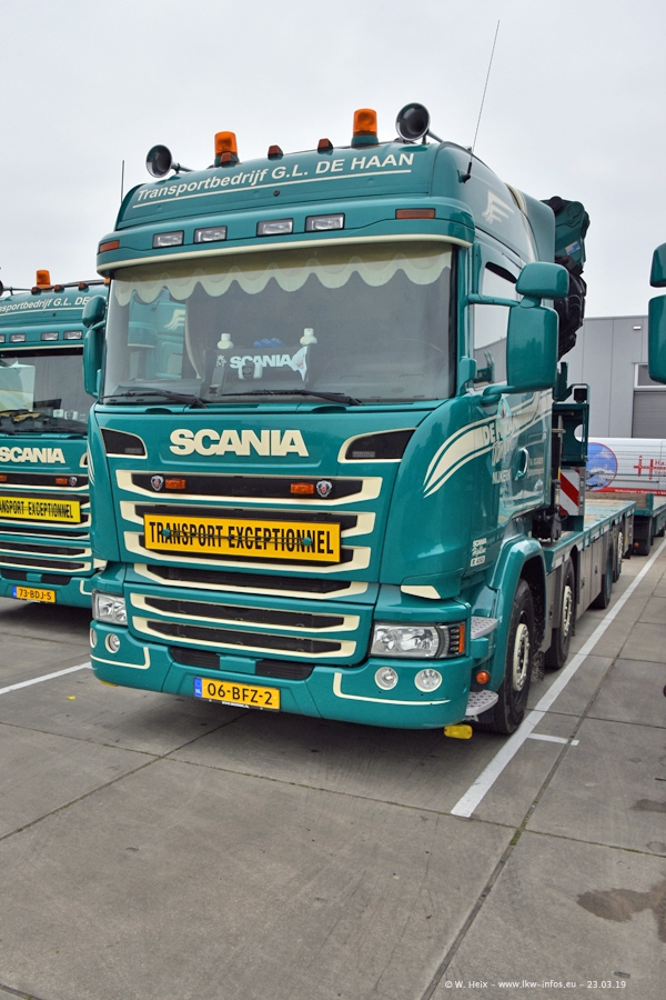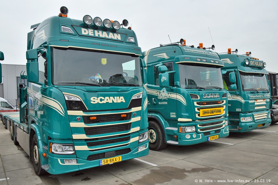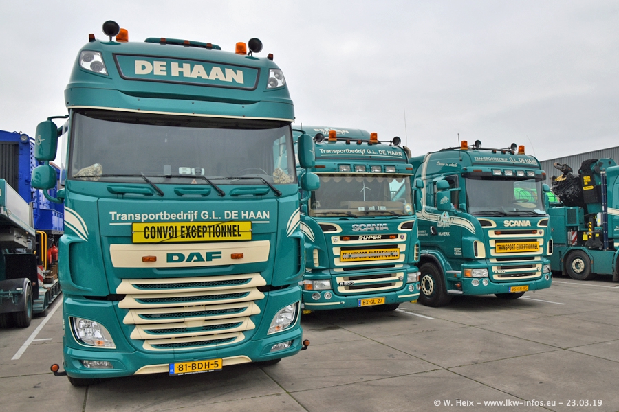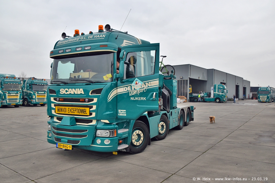 Mein erster Besuch bei der Firma de Haan war im Januar 2016. Inzwischen sind also über 3 Jahre vergangen und es hat sich viel verändert. Gab es 2013 noch einige Fahrzeuge im Design der Firma van Maanen, deren Spezialtansport-Bereich nach der Insolvenz von van Maanen übernommen wurde, sind diese weitgehend raus aus dem Fuhrpark. Einige wenige, wie z.B. der Scania R 500 V8 8x4 wurden damals unlackiert und sind noch vorhanden. Es gibt seit Mitte 2018 die ersten SCANIA R 410 NextGen und viele neue DAF XF Euro 6.