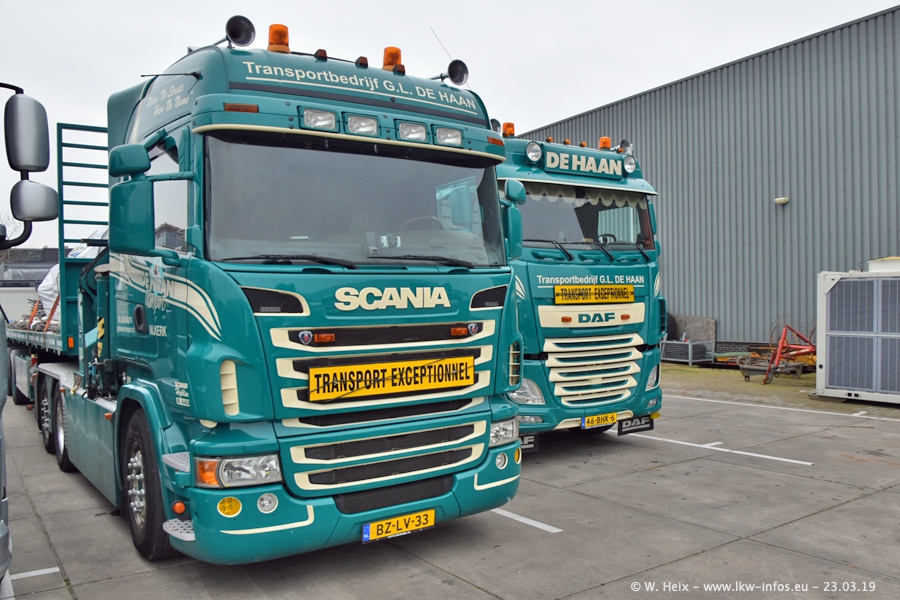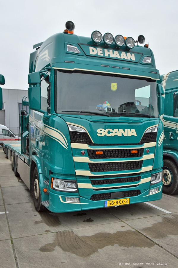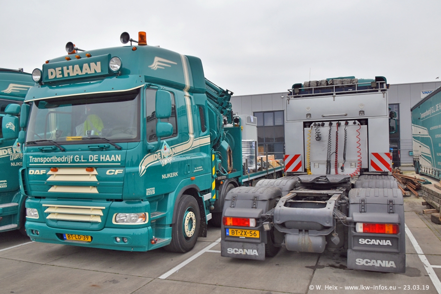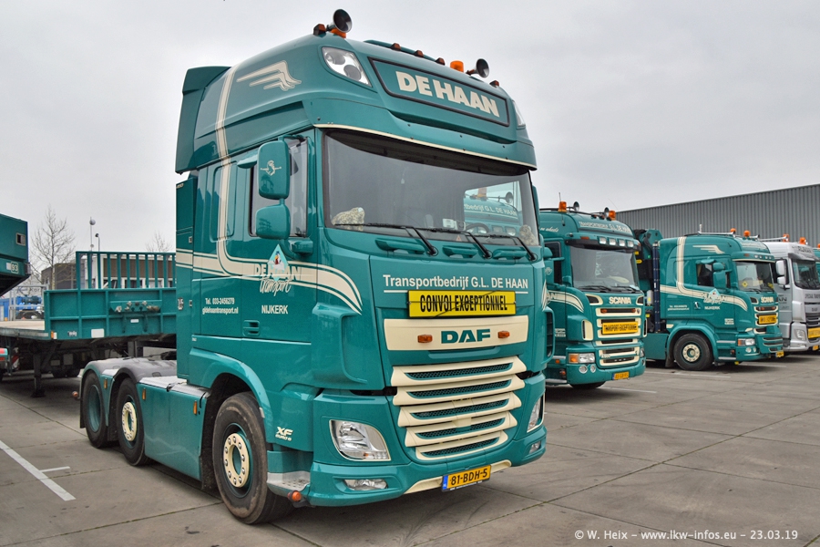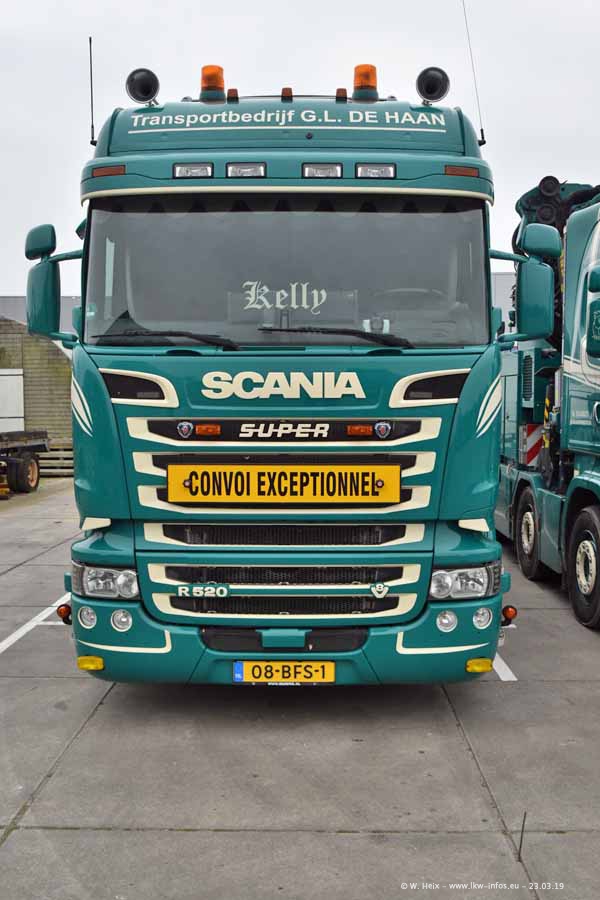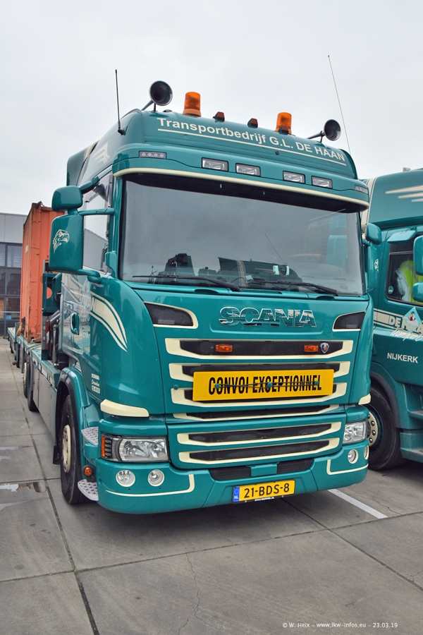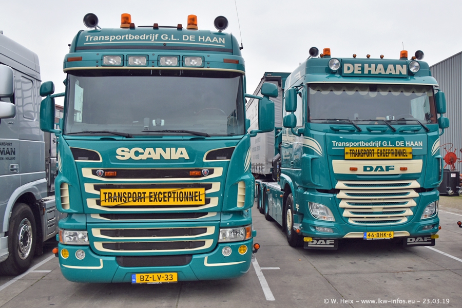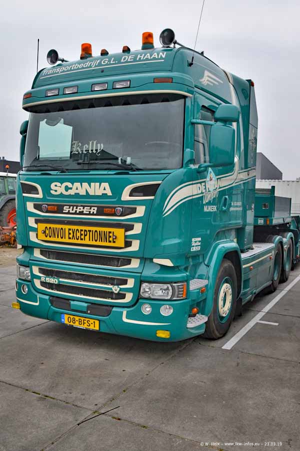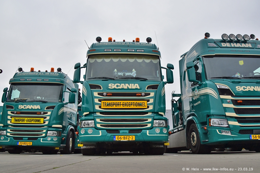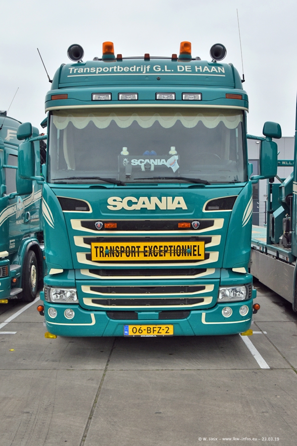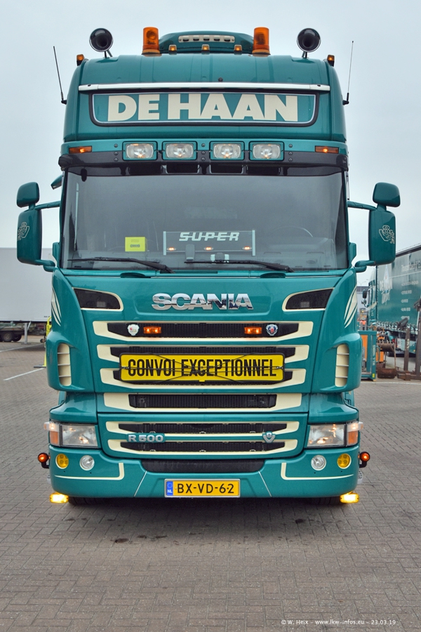 Mein erster Besuch bei der Firma de Haan war im Januar 2016. Inzwischen sind also über 3 Jahre vergangen und es hat sich viel verändert. Gab es 2013 noch einige Fahrzeuge im Design der Firma van Maanen, deren Spezialtansport-Bereich nach der Insolvenz von van Maanen übernommen wurde, sind diese weitgehend raus aus dem Fuhrpark. Einige wenige, wie z.B. der Scania R 500 V8 8x4 wurden damals unlackiert und sind noch vorhanden. Es gibt seit Mitte 2018 die ersten SCANIA R 410 NextGen und viele neue DAF XF Euro 6.