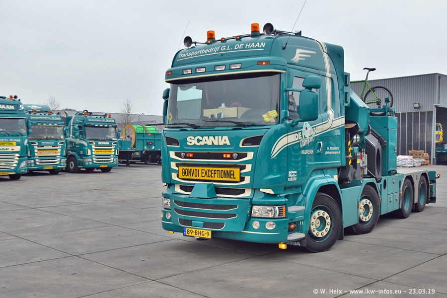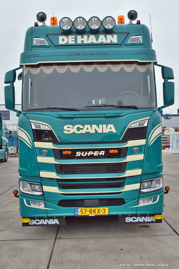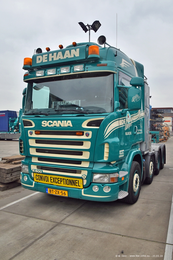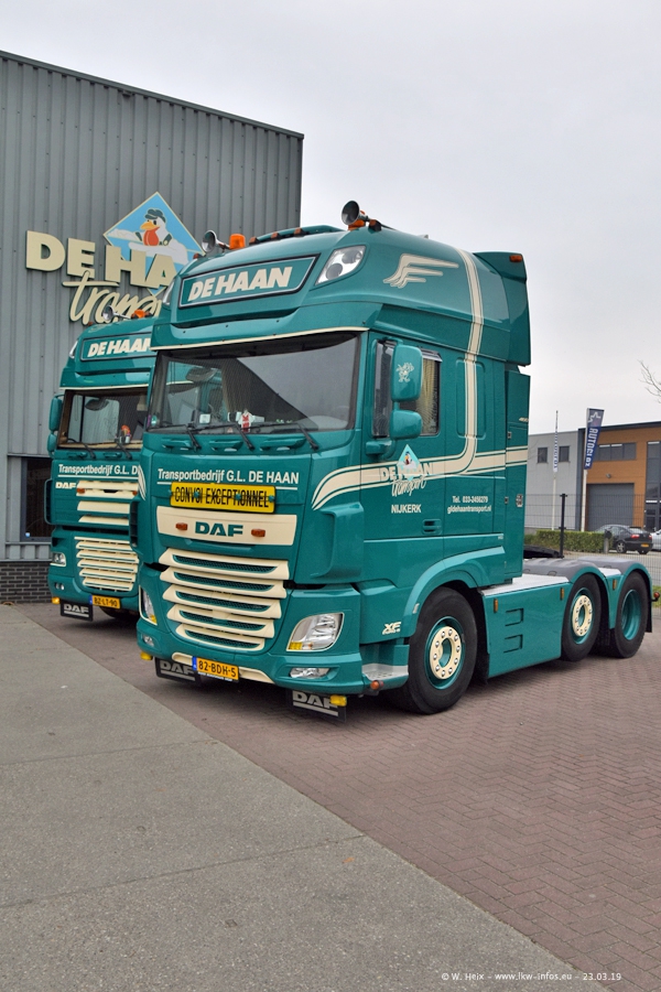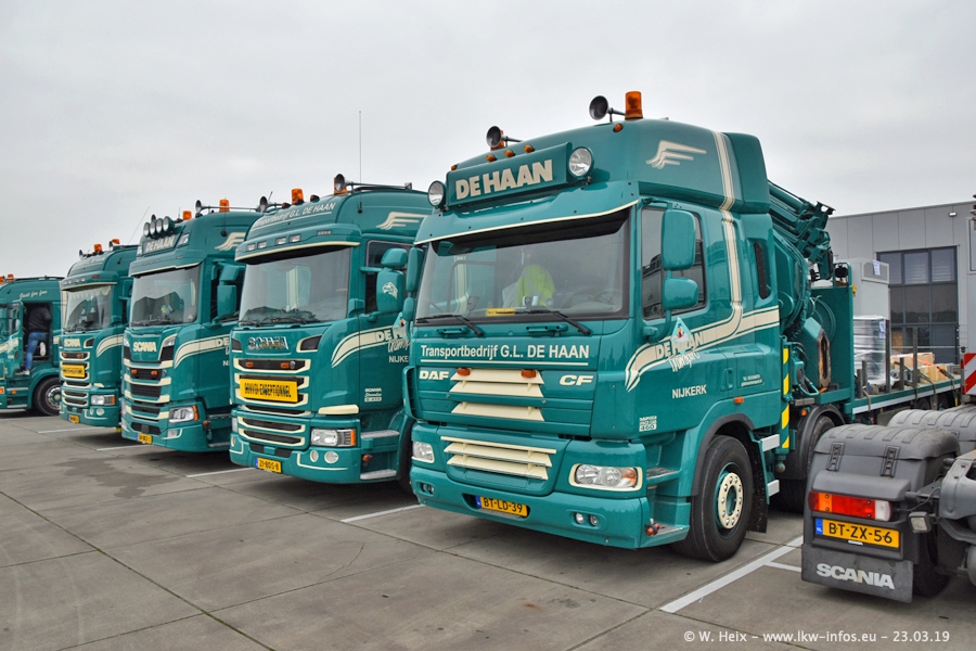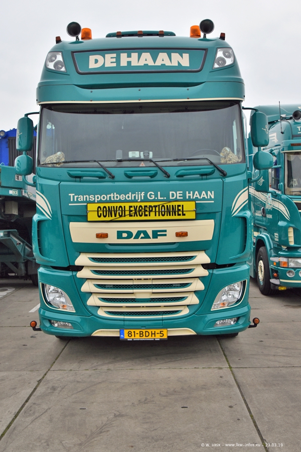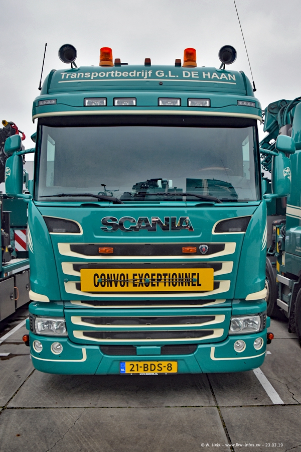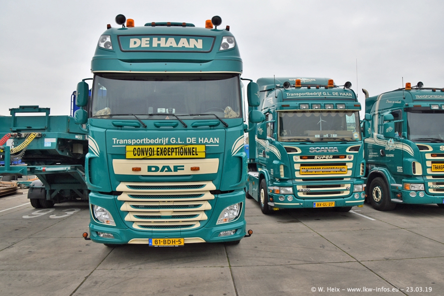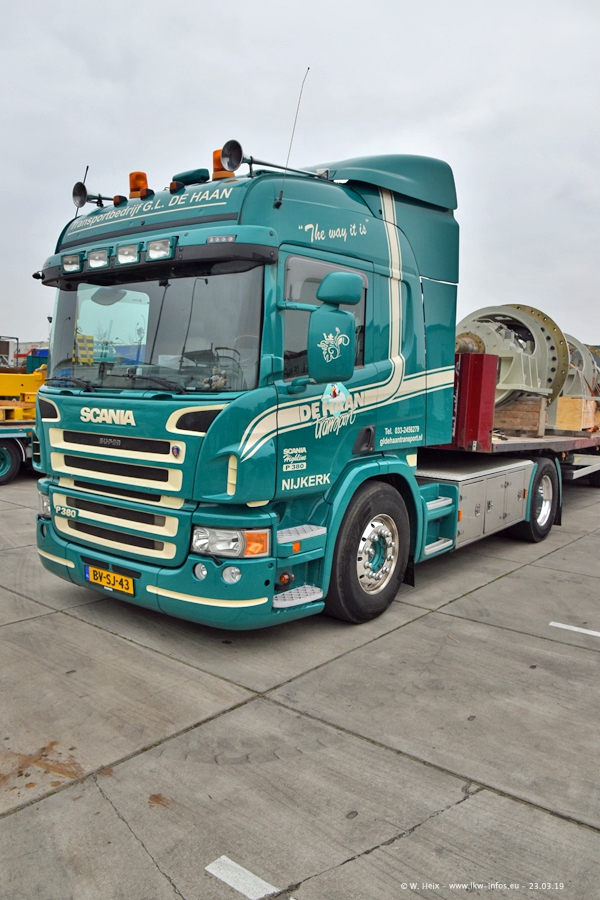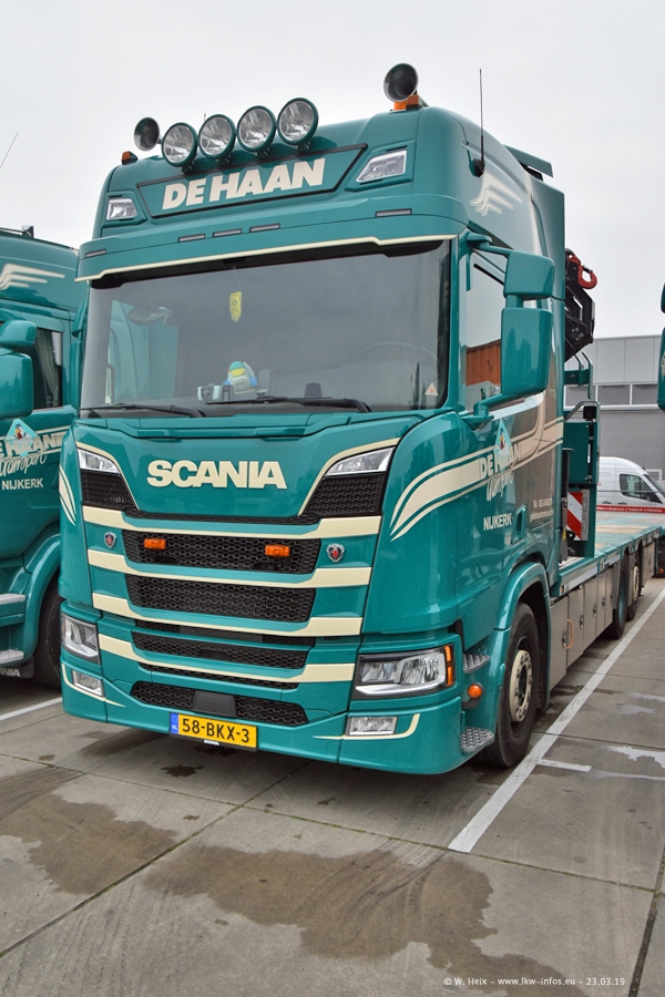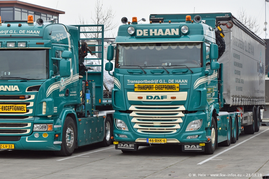 Mein erster Besuch bei der Firma de Haan war im Januar 2016. Inzwischen sind also über 3 Jahre vergangen und es hat sich viel verändert. Gab es 2013 noch einige Fahrzeuge im Design der Firma van Maanen, deren Spezialtansport-Bereich nach der Insolvenz von van Maanen übernommen wurde, sind diese weitgehend raus aus dem Fuhrpark. Einige wenige, wie z.B. der Scania R 500 V8 8x4 wurden damals unlackiert und sind noch vorhanden. Es gibt seit Mitte 2018 die ersten SCANIA R 410 NextGen und viele neue DAF XF Euro 6.