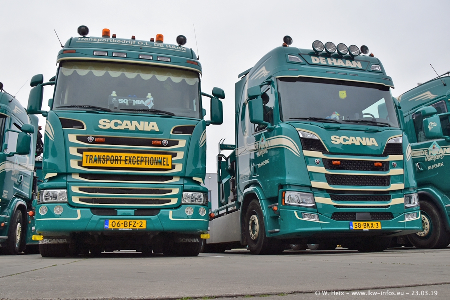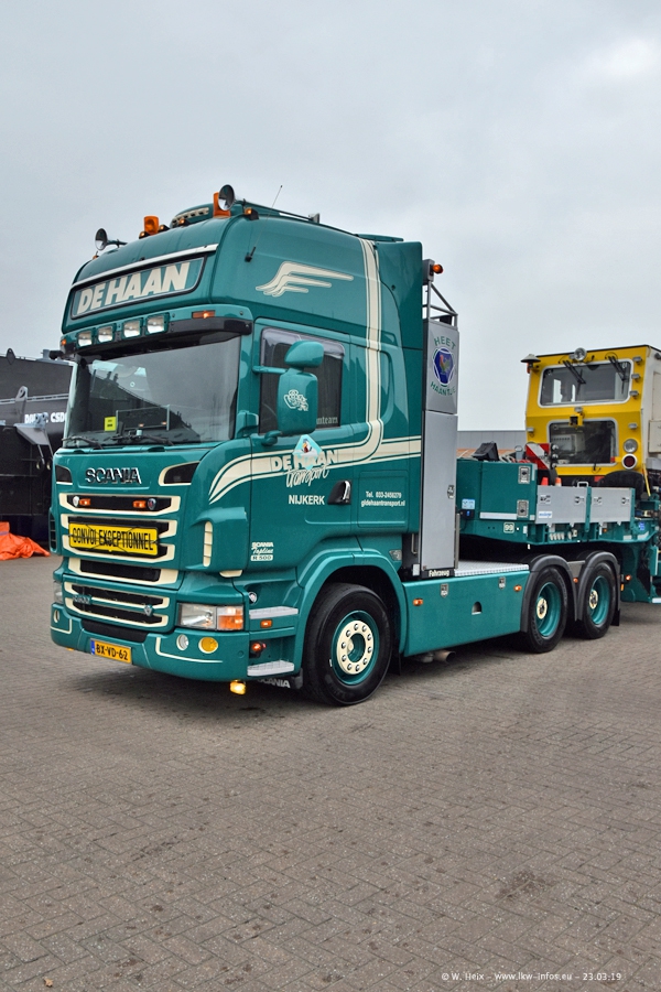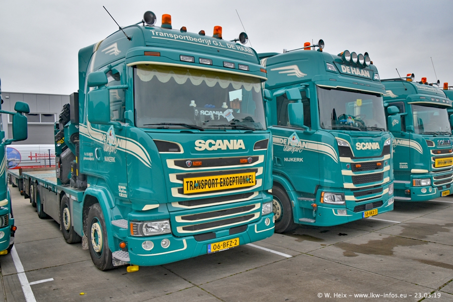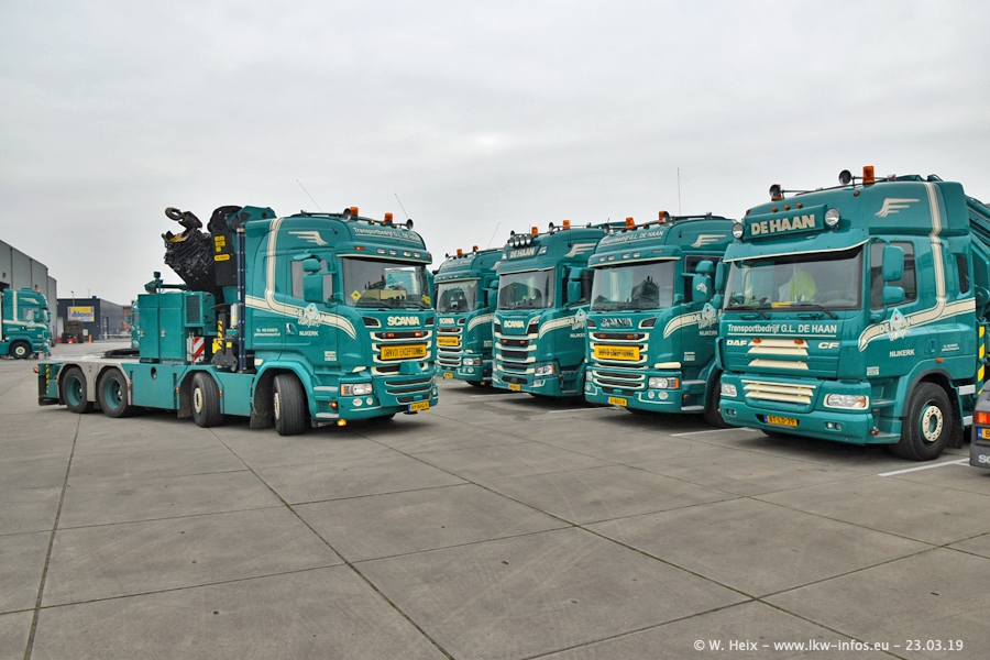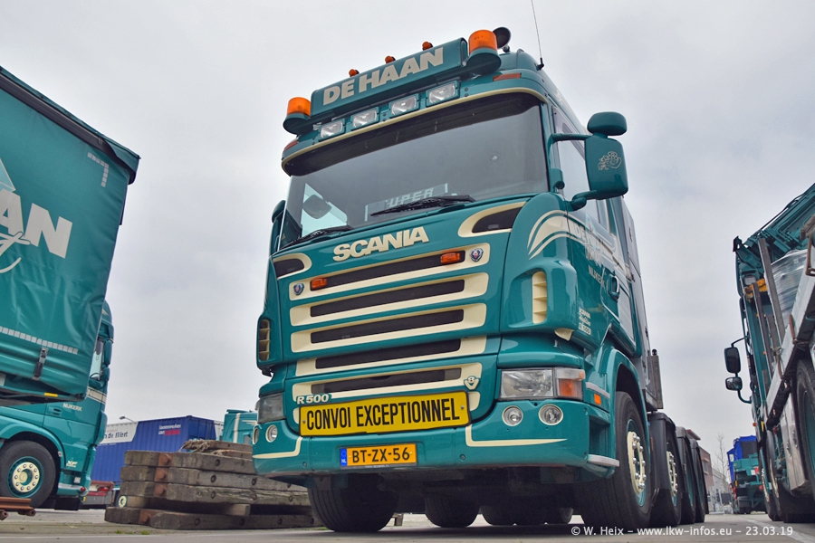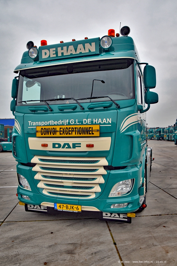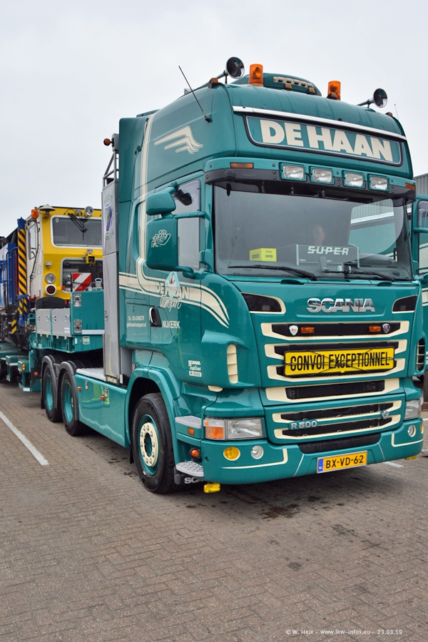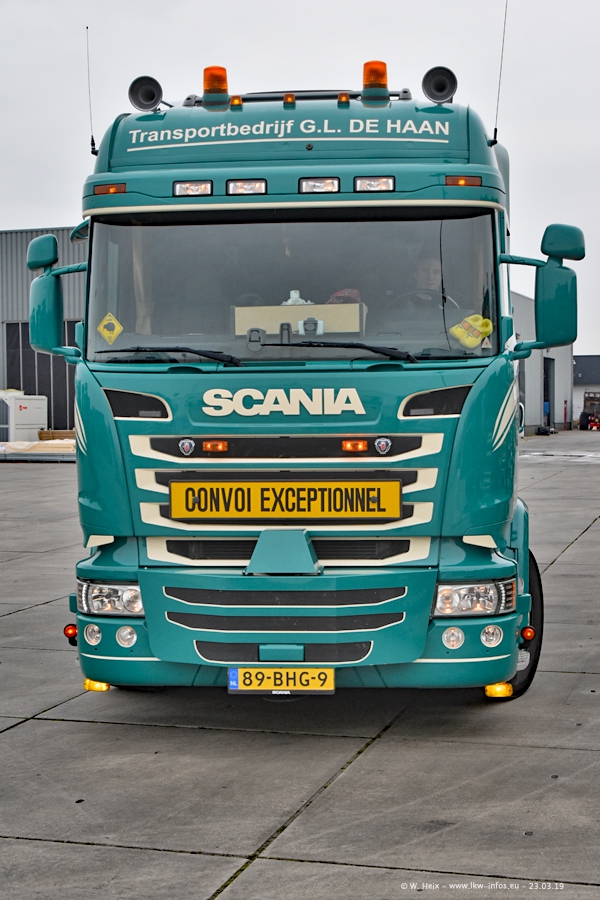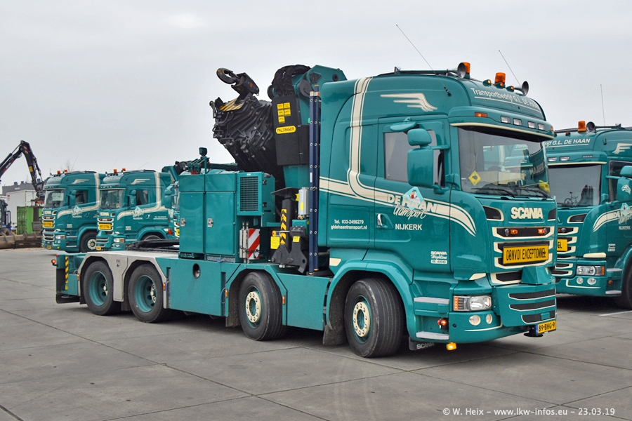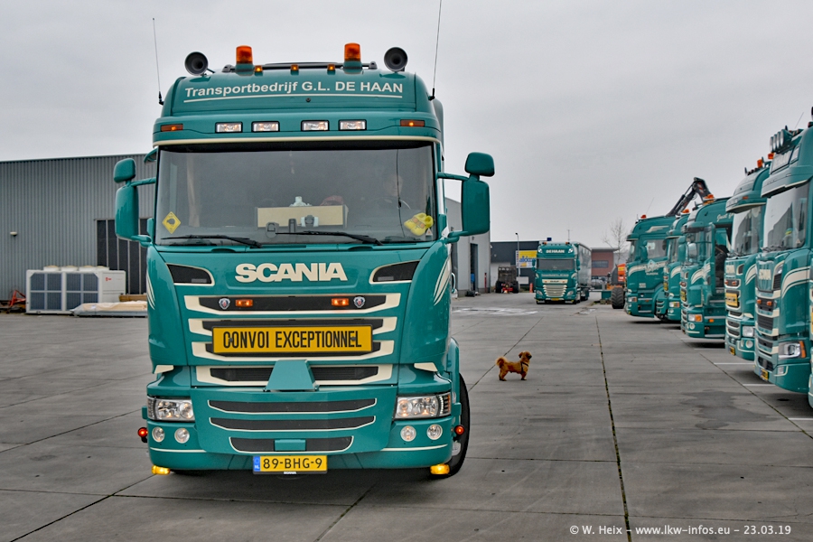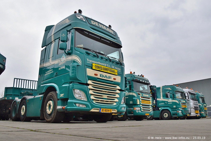 Mein erster Besuch bei der Firma de Haan war im Januar 2016. Inzwischen sind also über 3 Jahre vergangen und es hat sich viel verändert. Gab es 2013 noch einige Fahrzeuge im Design der Firma van Maanen, deren Spezialtansport-Bereich nach der Insolvenz von van Maanen übernommen wurde, sind diese weitgehend raus aus dem Fuhrpark. Einige wenige, wie z.B. der Scania R 500 V8 8x4 wurden damals unlackiert und sind noch vorhanden. Es gibt seit Mitte 2018 die ersten SCANIA R 410 NextGen und viele neue DAF XF Euro 6.