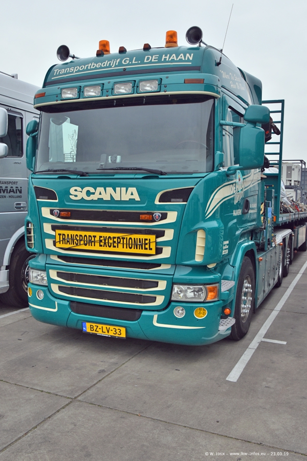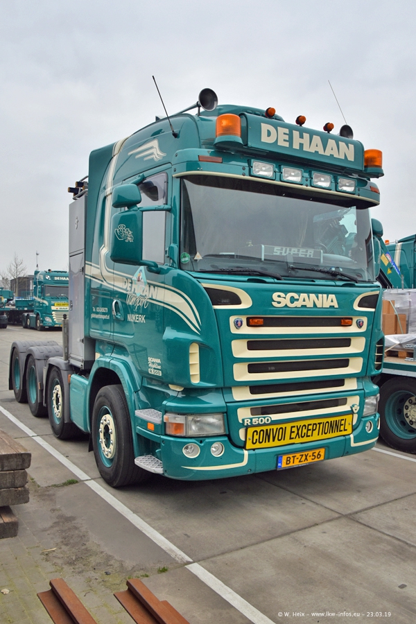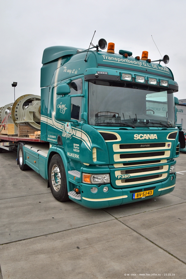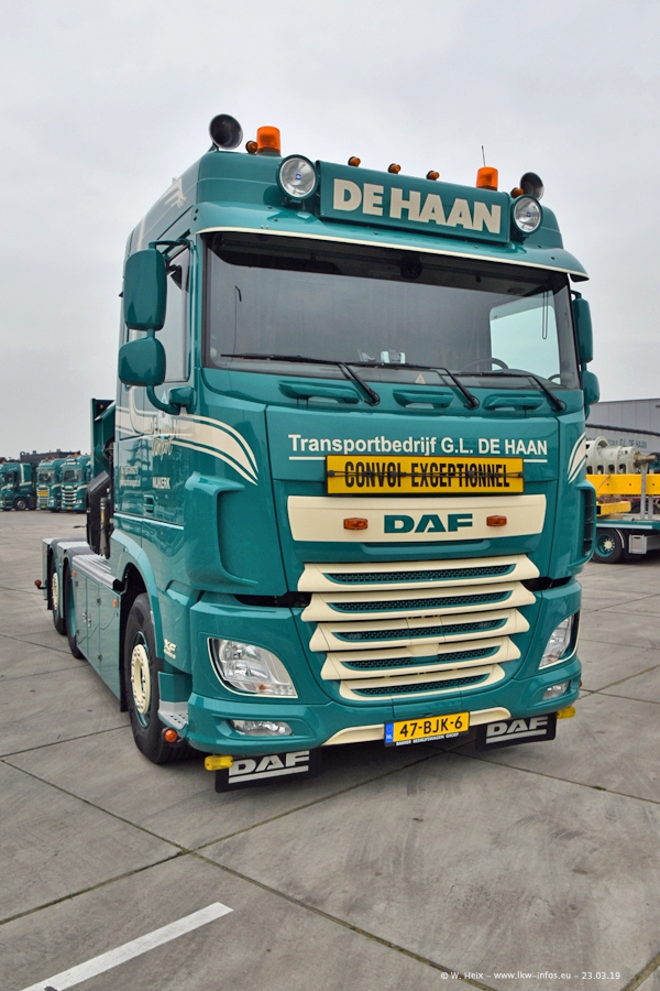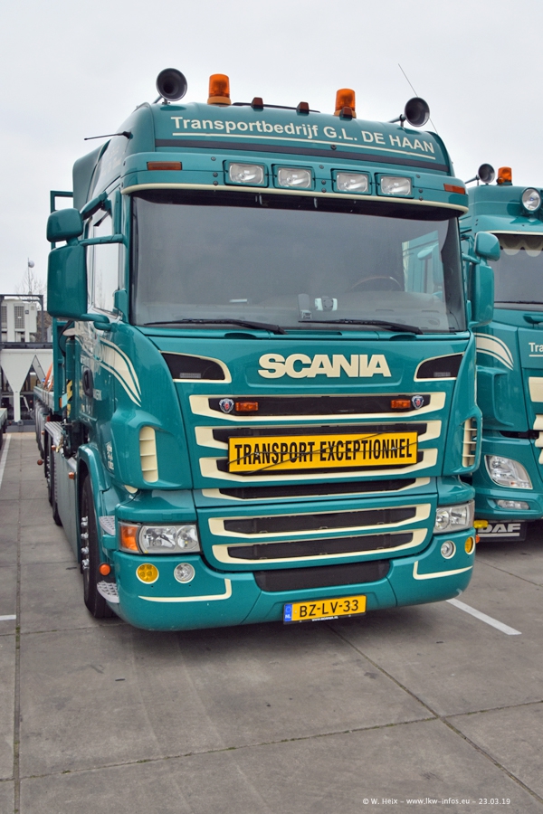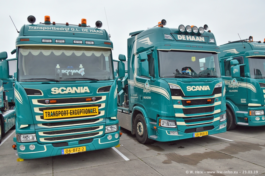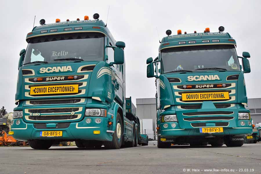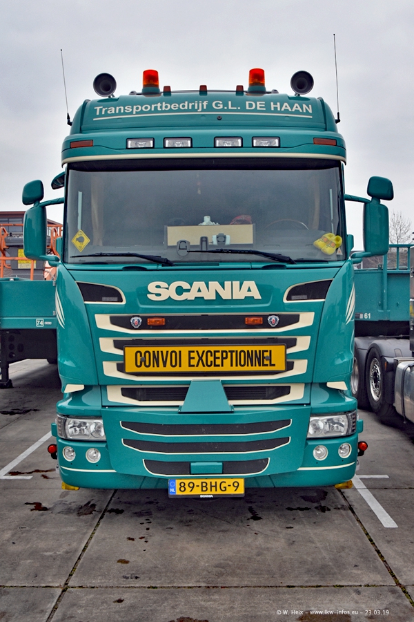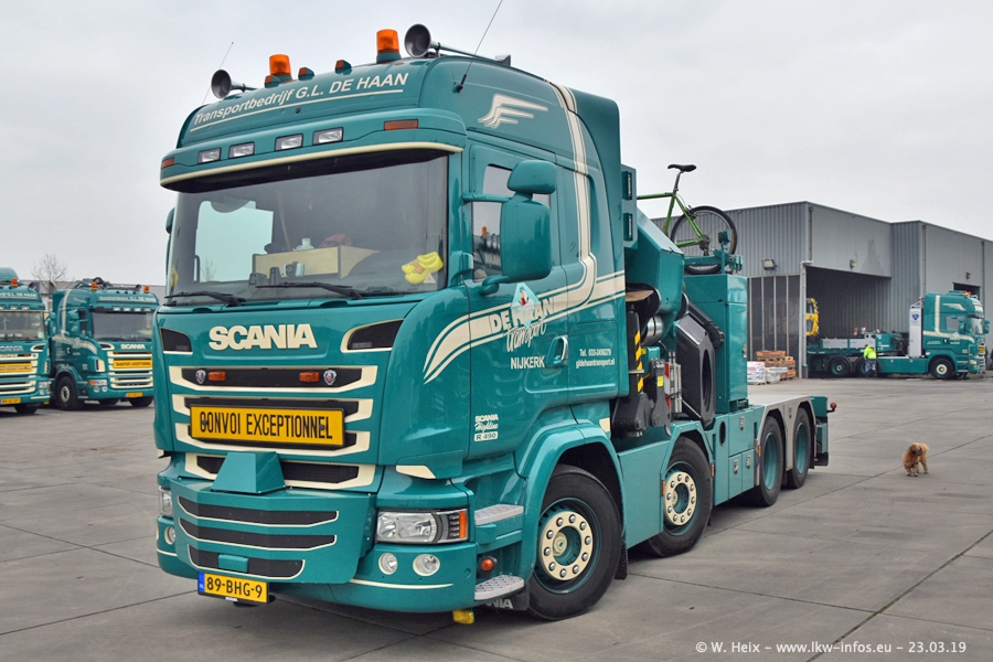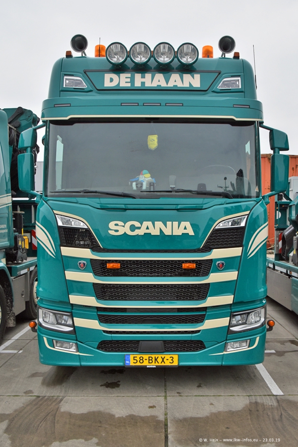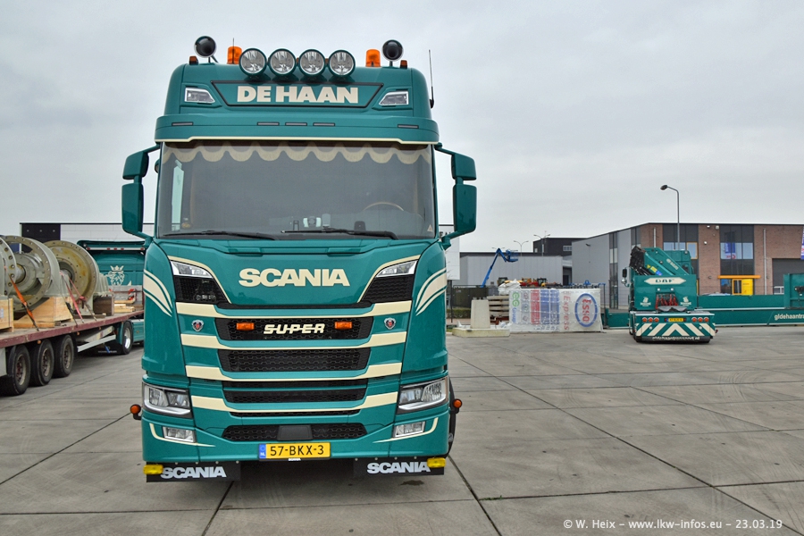 Mein erster Besuch bei der Firma de Haan war im Januar 2016. Inzwischen sind also über 3 Jahre vergangen und es hat sich viel verändert. Gab es 2013 noch einige Fahrzeuge im Design der Firma van Maanen, deren Spezialtansport-Bereich nach der Insolvenz von van Maanen übernommen wurde, sind diese weitgehend raus aus dem Fuhrpark. Einige wenige, wie z.B. der Scania R 500 V8 8x4 wurden damals unlackiert und sind noch vorhanden. Es gibt seit Mitte 2018 die ersten SCANIA R 410 NextGen und viele neue DAF XF Euro 6.