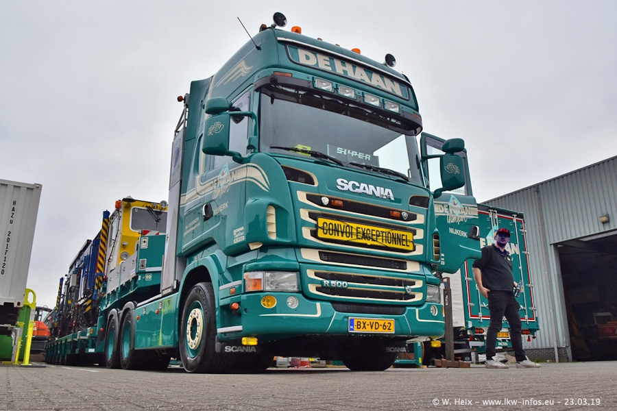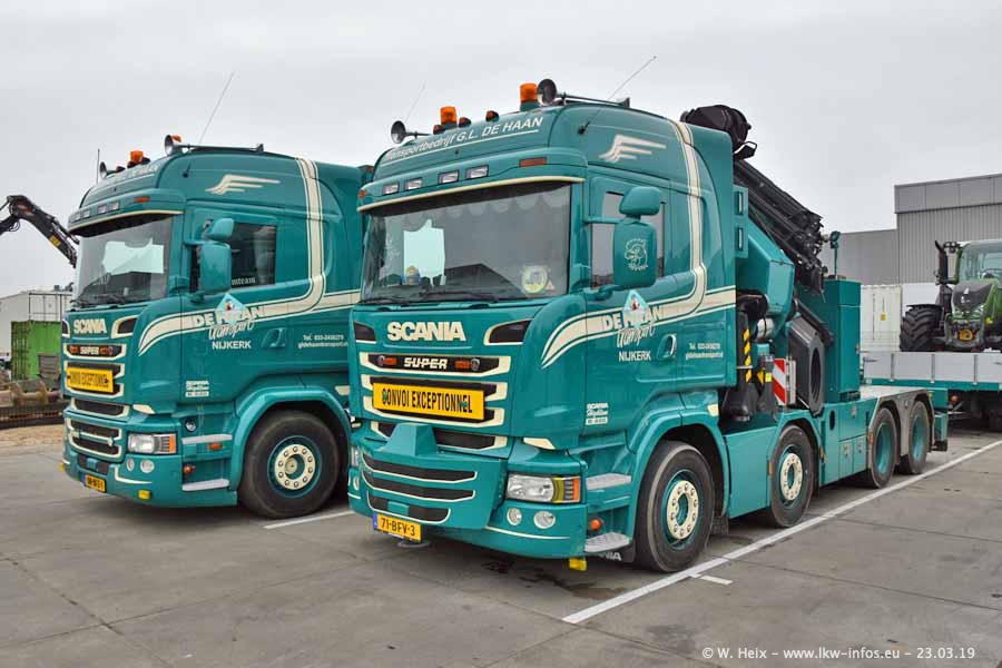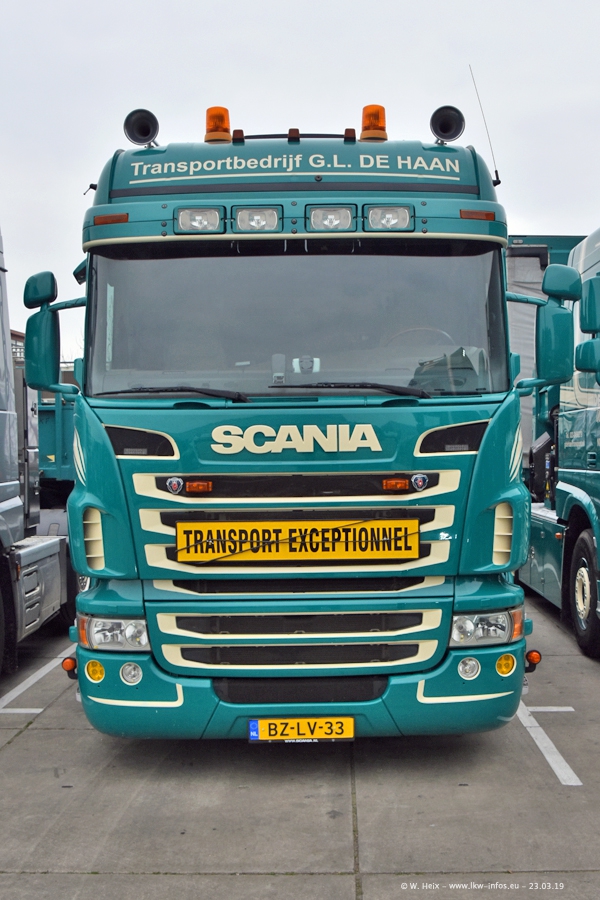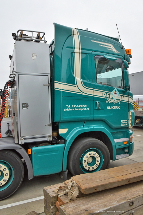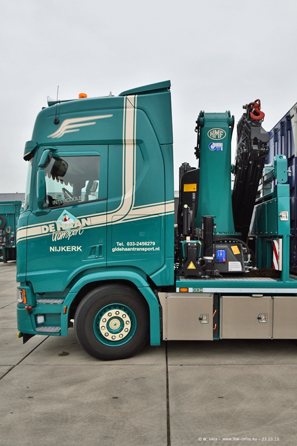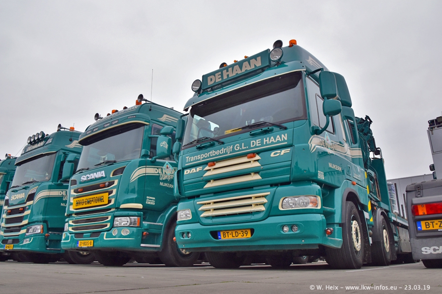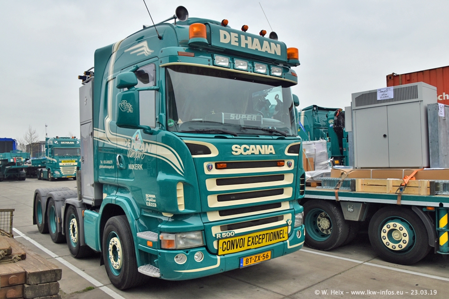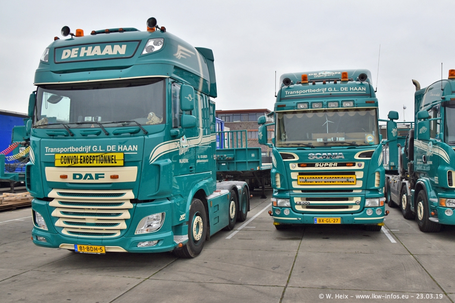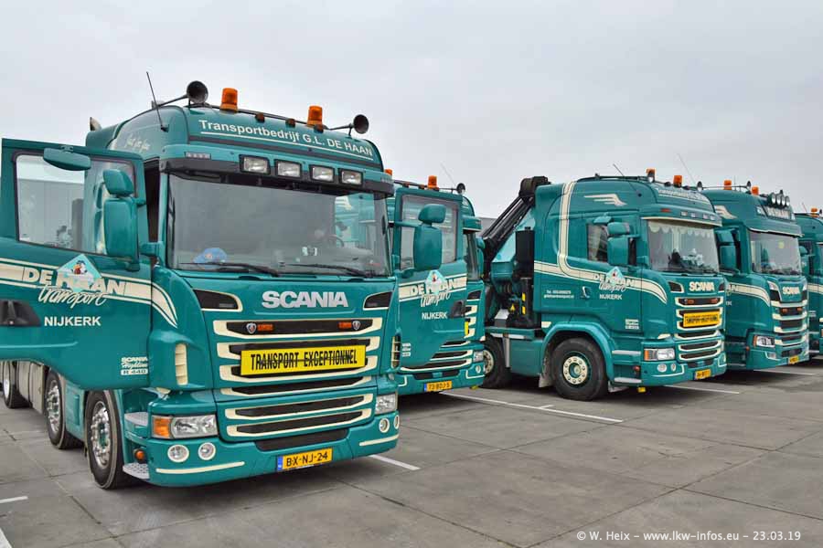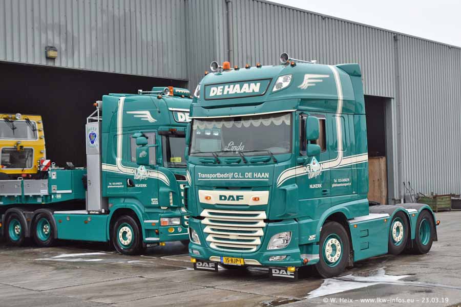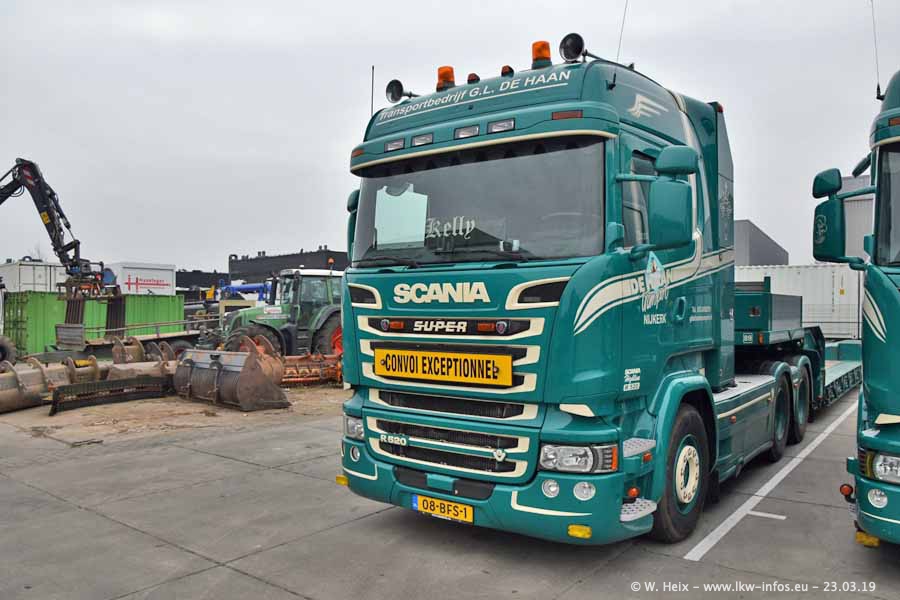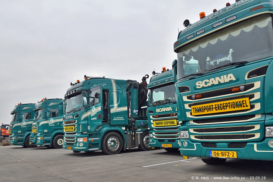 Mein erster Besuch bei der Firma de Haan war im Januar 2016. Inzwischen sind also über 3 Jahre vergangen und es hat sich viel verändert. Gab es 2013 noch einige Fahrzeuge im Design der Firma van Maanen, deren Spezialtansport-Bereich nach der Insolvenz von van Maanen übernommen wurde, sind diese weitgehend raus aus dem Fuhrpark. Einige wenige, wie z.B. der Scania R 500 V8 8x4 wurden damals unlackiert und sind noch vorhanden. Es gibt seit Mitte 2018 die ersten SCANIA R 410 NextGen und viele neue DAF XF Euro 6.