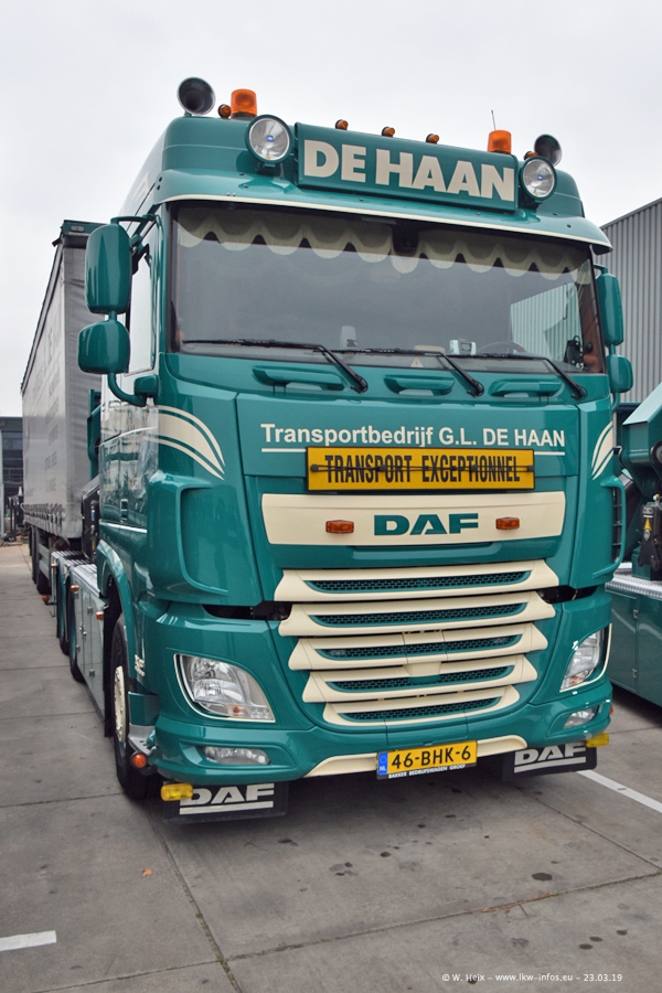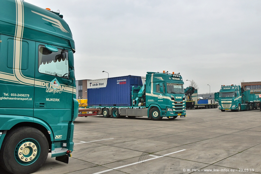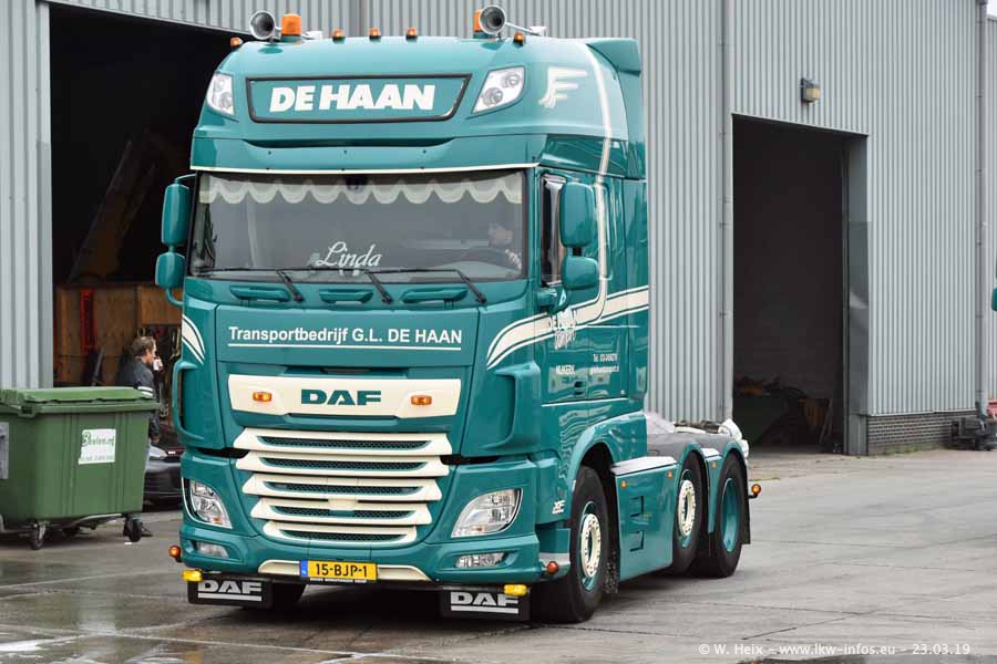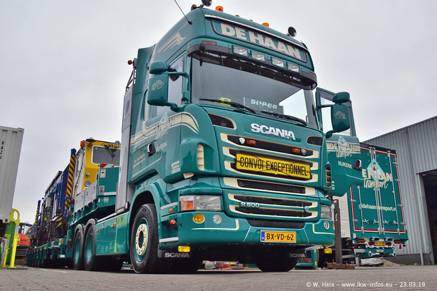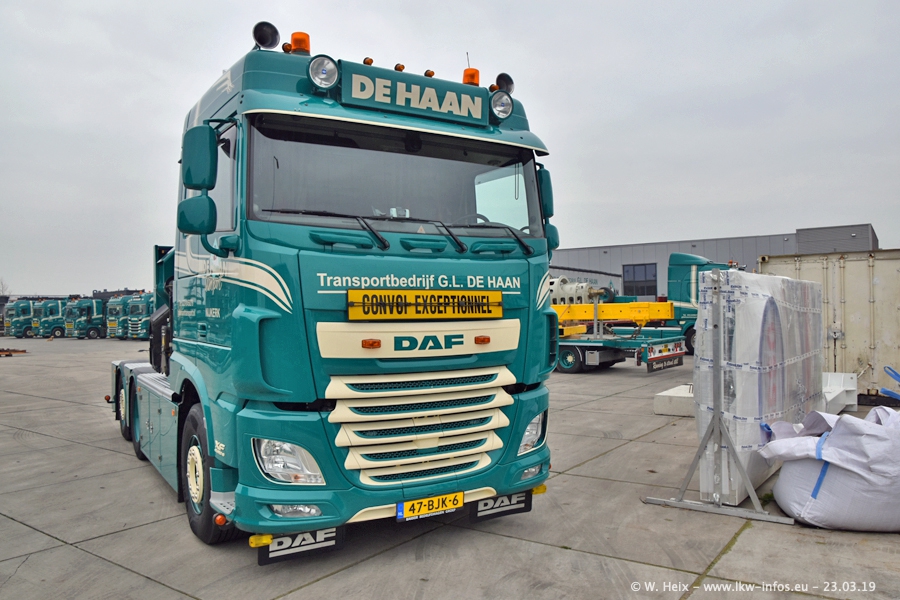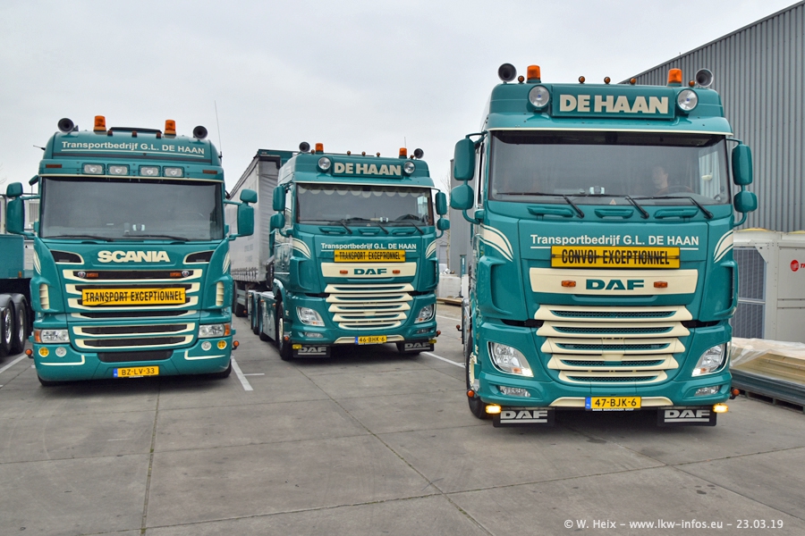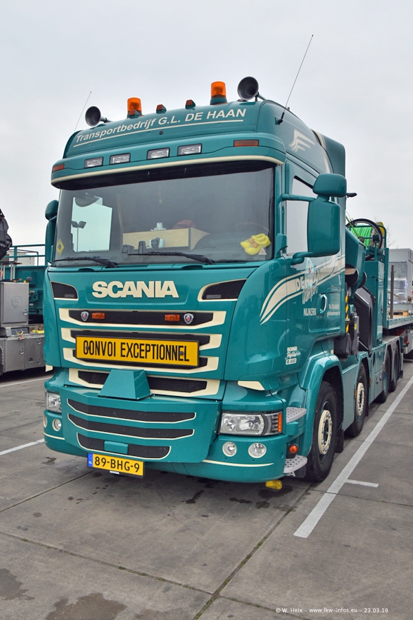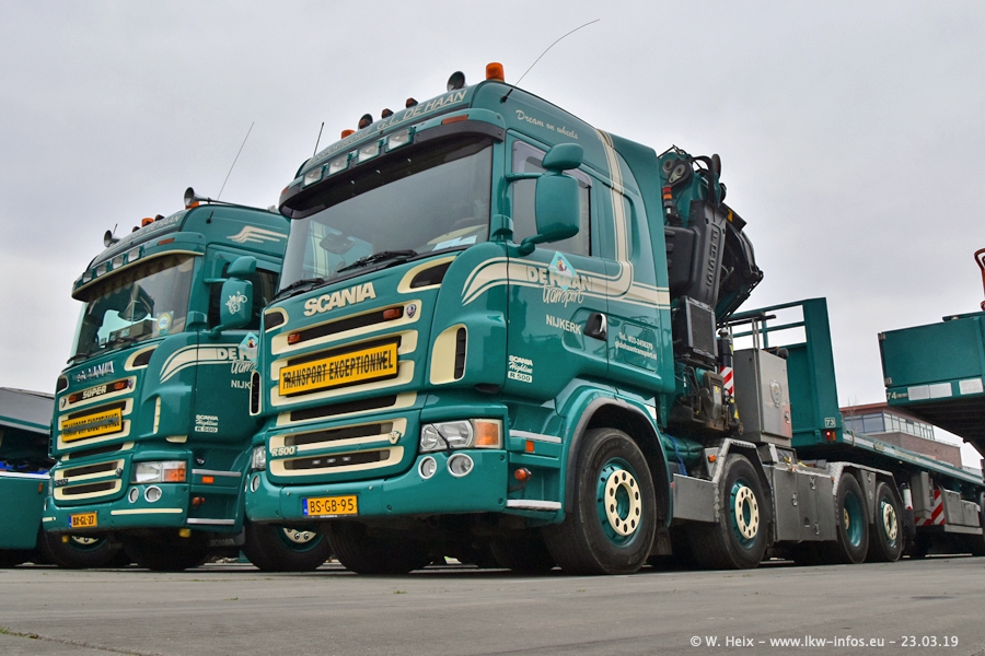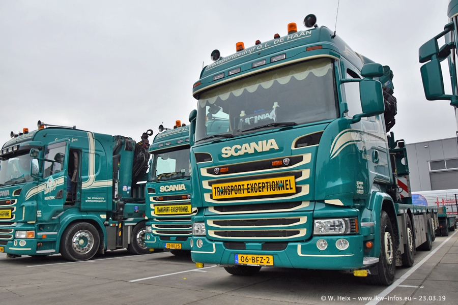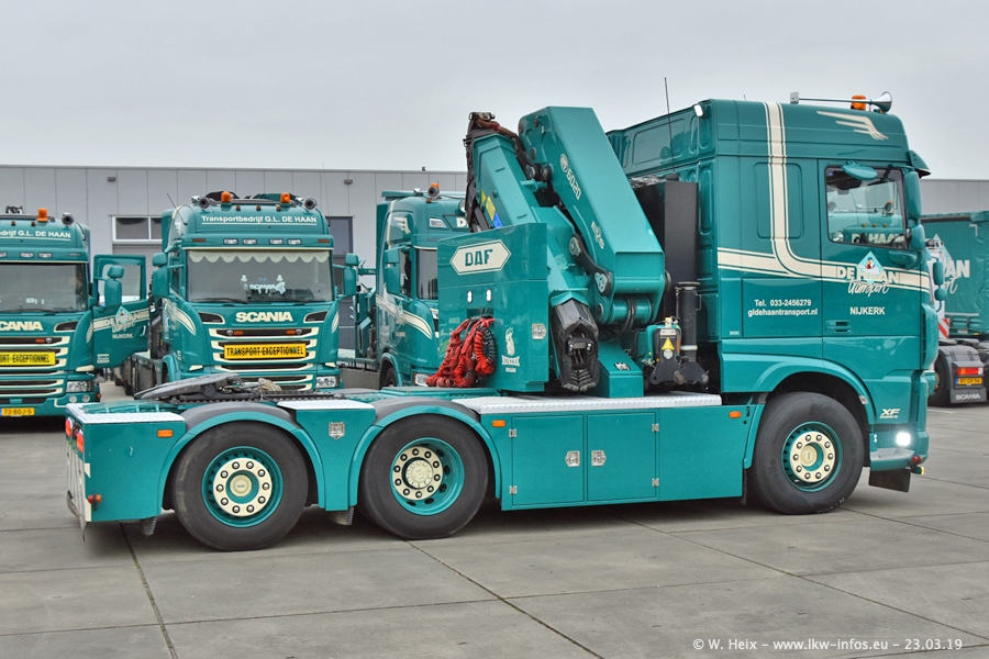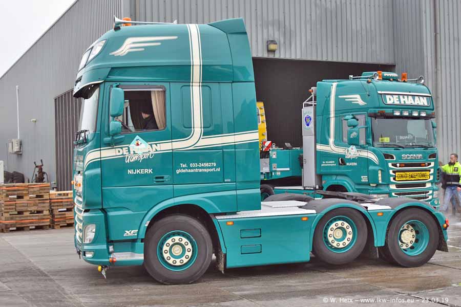 Mein erster Besuch bei der Firma de Haan war im Januar 2016. Inzwischen sind also über 3 Jahre vergangen und es hat sich viel verändert. Gab es 2013 noch einige Fahrzeuge im Design der Firma van Maanen, deren Spezialtansport-Bereich nach der Insolvenz von van Maanen übernommen wurde, sind diese weitgehend raus aus dem Fuhrpark. Einige wenige, wie z.B. der Scania R 500 V8 8x4 wurden damals unlackiert und sind noch vorhanden. Es gibt seit Mitte 2018 die ersten SCANIA R 410 NextGen und viele neue DAF XF Euro 6.