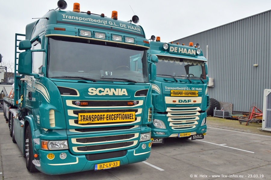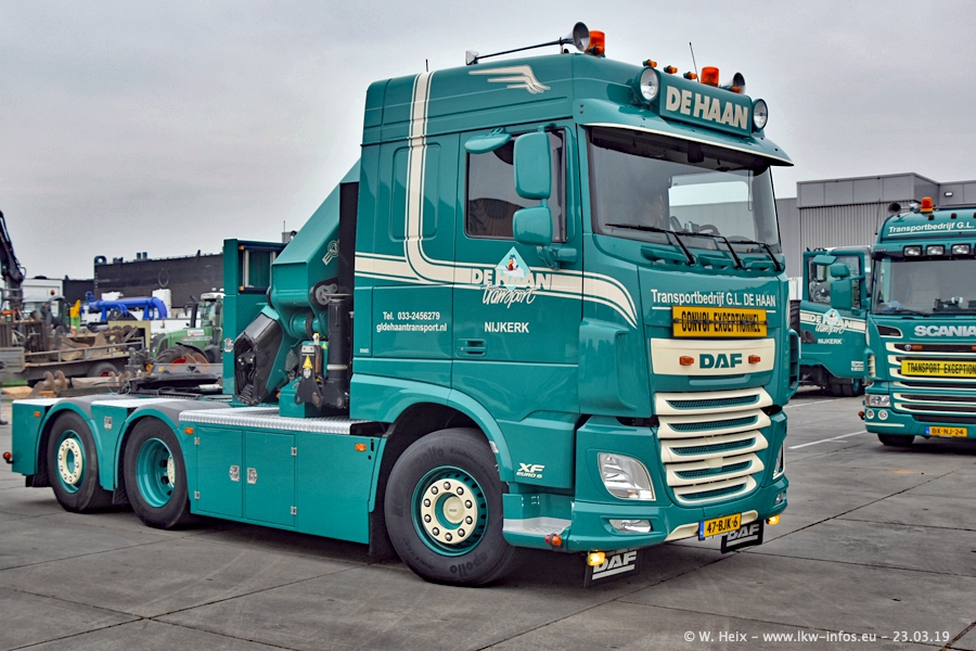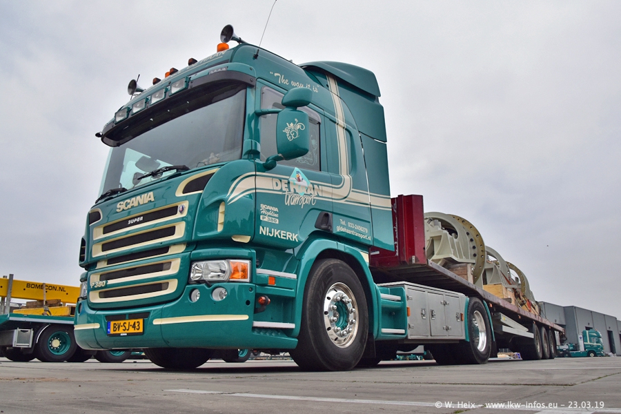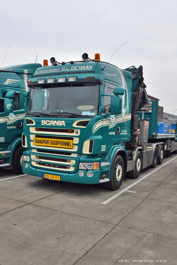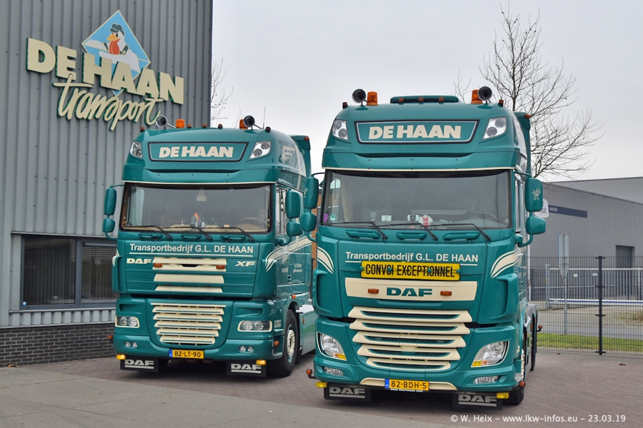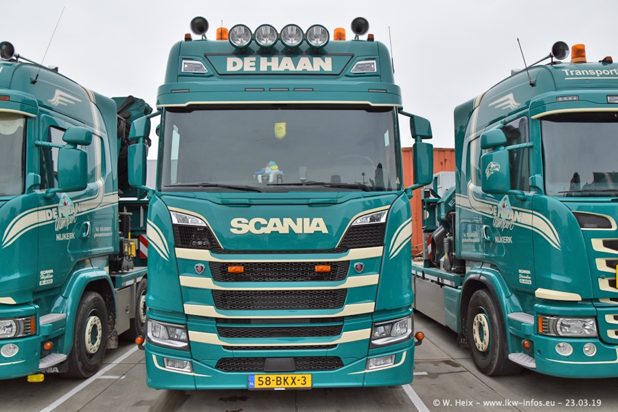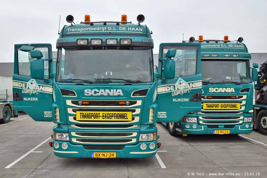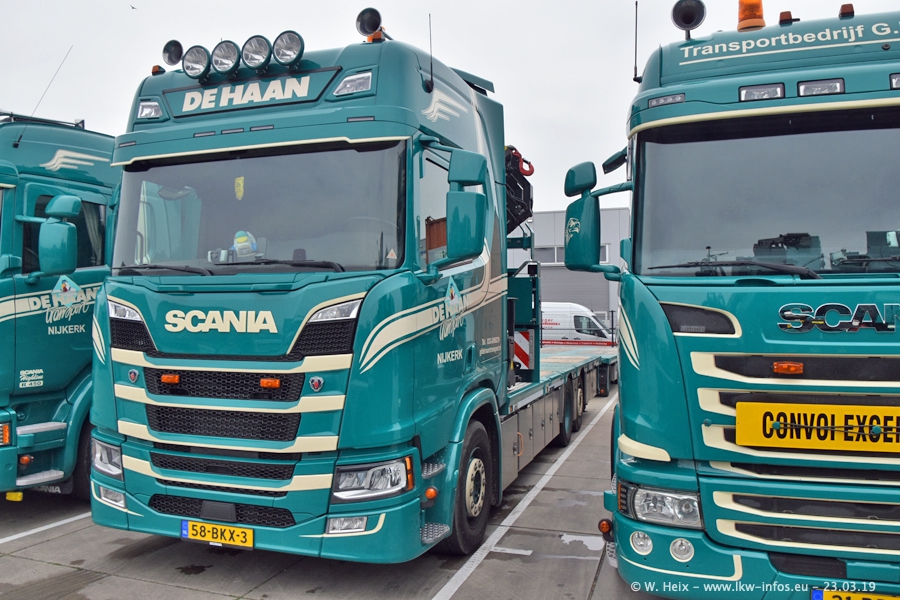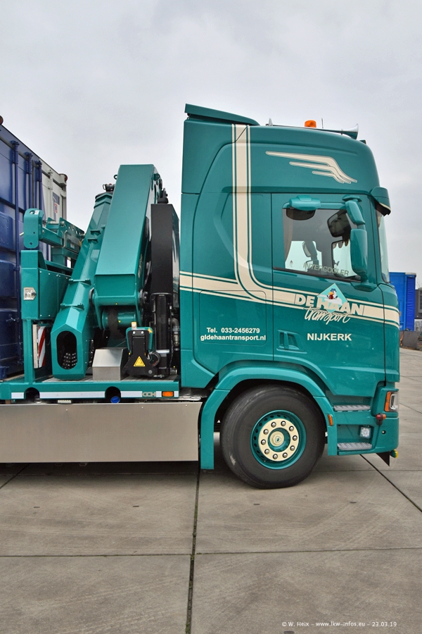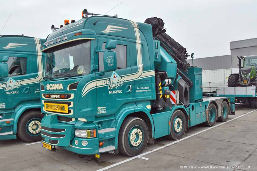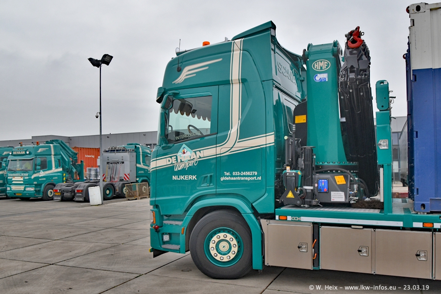 Mein erster Besuch bei der Firma de Haan war im Januar 2016. Inzwischen sind also über 3 Jahre vergangen und es hat sich viel verändert. Gab es 2013 noch einige Fahrzeuge im Design der Firma van Maanen, deren Spezialtansport-Bereich nach der Insolvenz von van Maanen übernommen wurde, sind diese weitgehend raus aus dem Fuhrpark. Einige wenige, wie z.B. der Scania R 500 V8 8x4 wurden damals unlackiert und sind noch vorhanden. Es gibt seit Mitte 2018 die ersten SCANIA R 410 NextGen und viele neue DAF XF Euro 6.