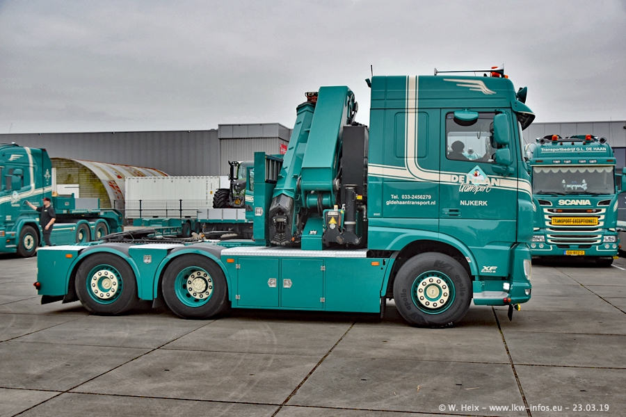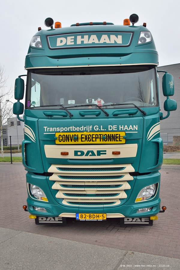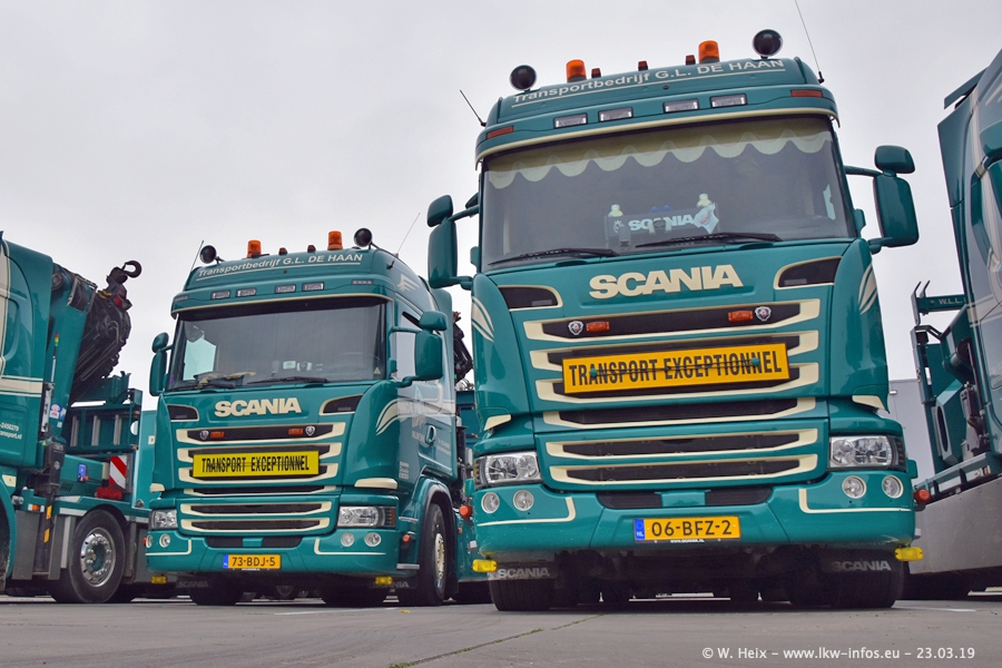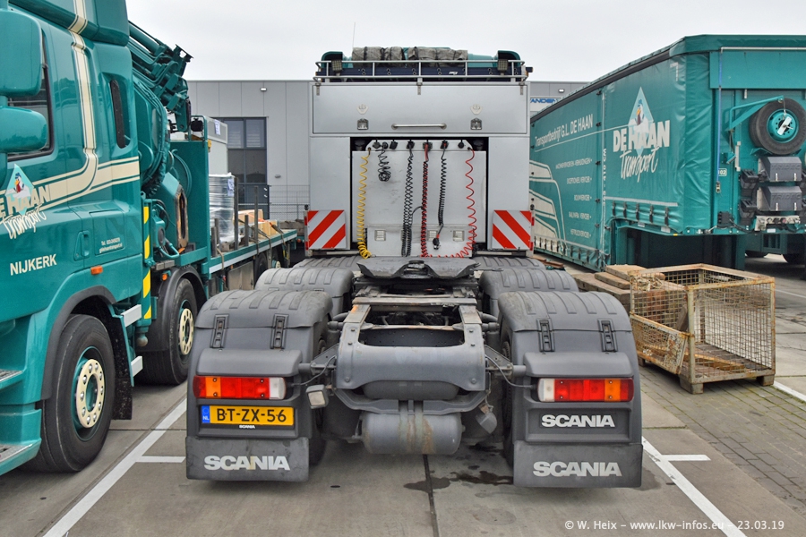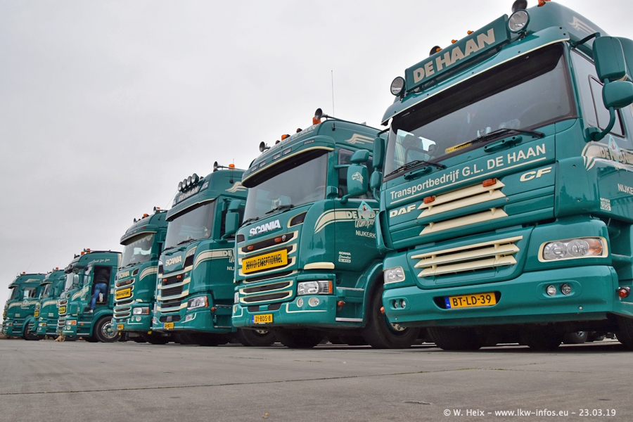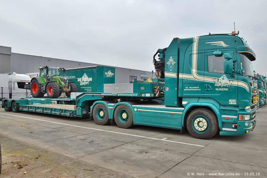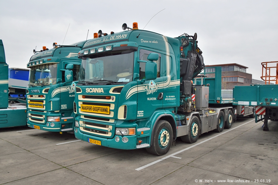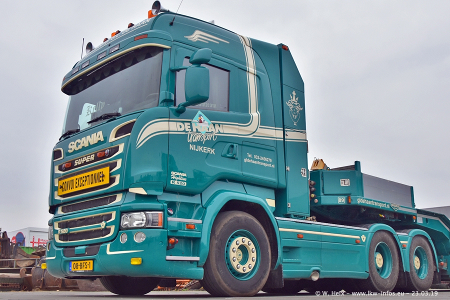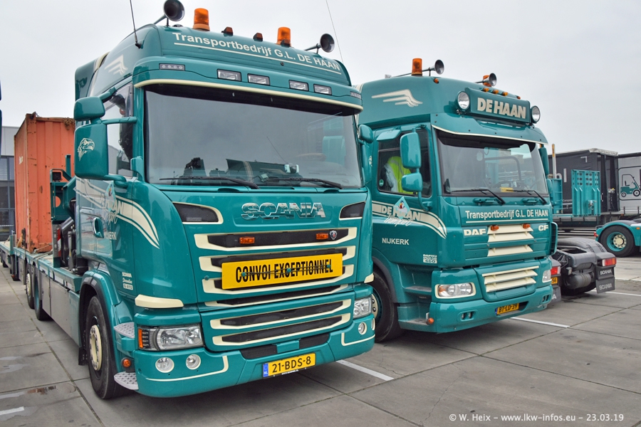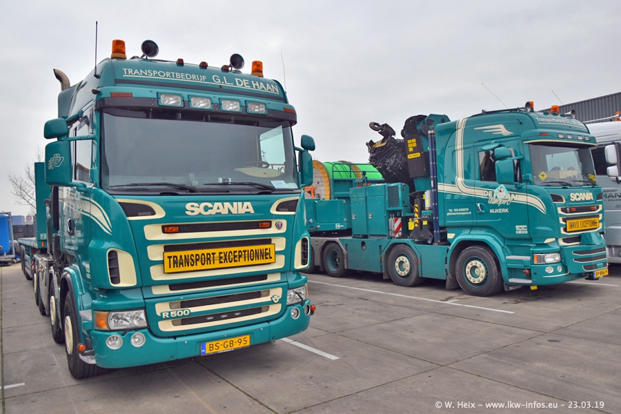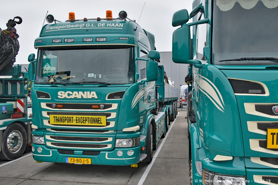 Mein erster Besuch bei der Firma de Haan war im Januar 2016. Inzwischen sind also über 3 Jahre vergangen und es hat sich viel verändert. Gab es 2013 noch einige Fahrzeuge im Design der Firma van Maanen, deren Spezialtansport-Bereich nach der Insolvenz von van Maanen übernommen wurde, sind diese weitgehend raus aus dem Fuhrpark. Einige wenige, wie z.B. der Scania R 500 V8 8x4 wurden damals unlackiert und sind noch vorhanden. Es gibt seit Mitte 2018 die ersten SCANIA R 410 NextGen und viele neue DAF XF Euro 6.