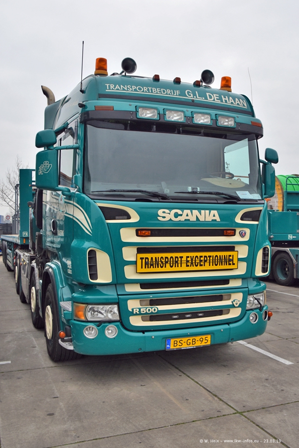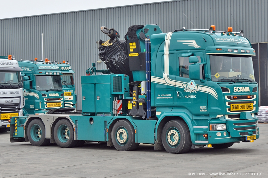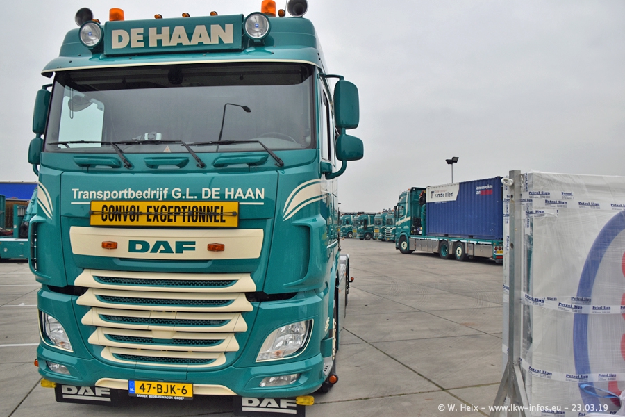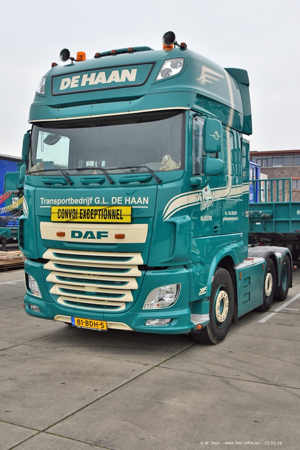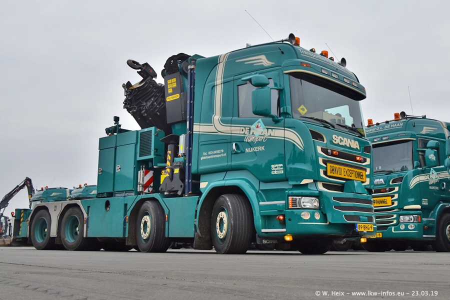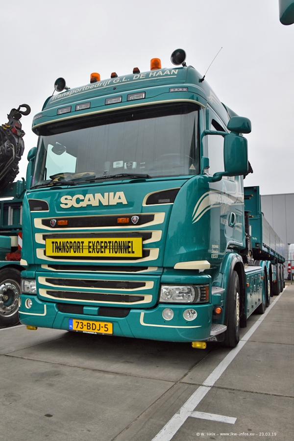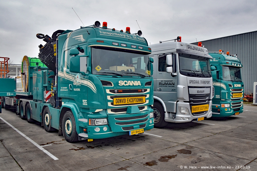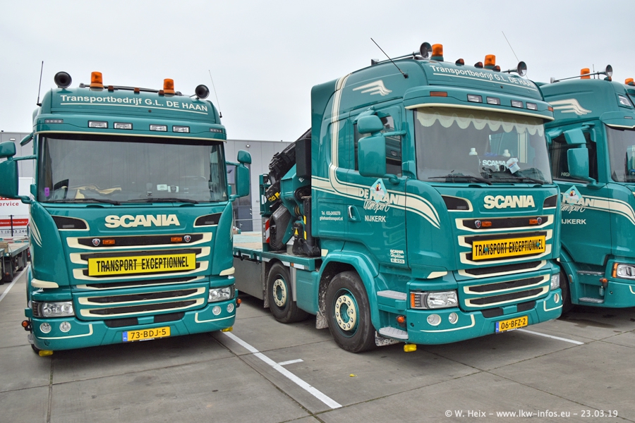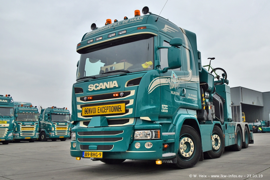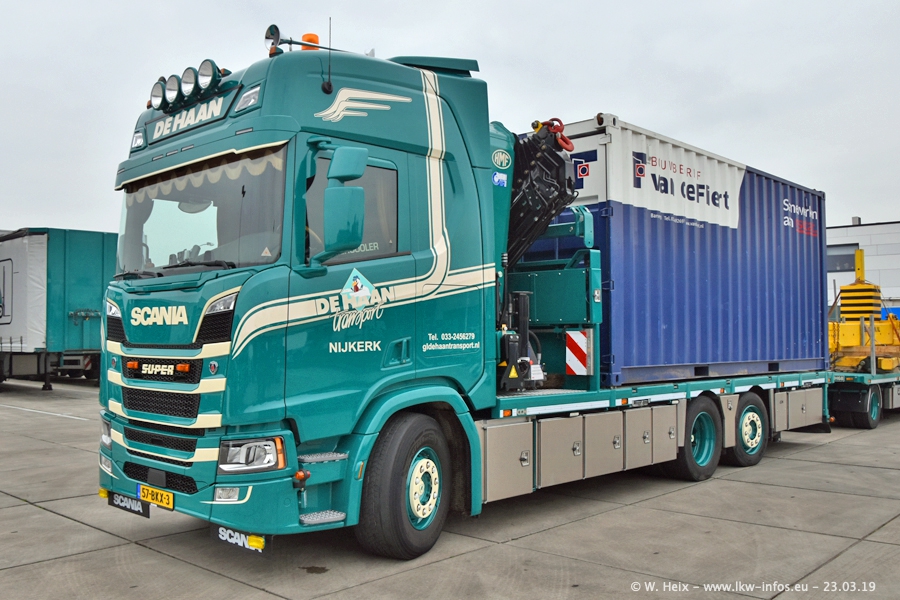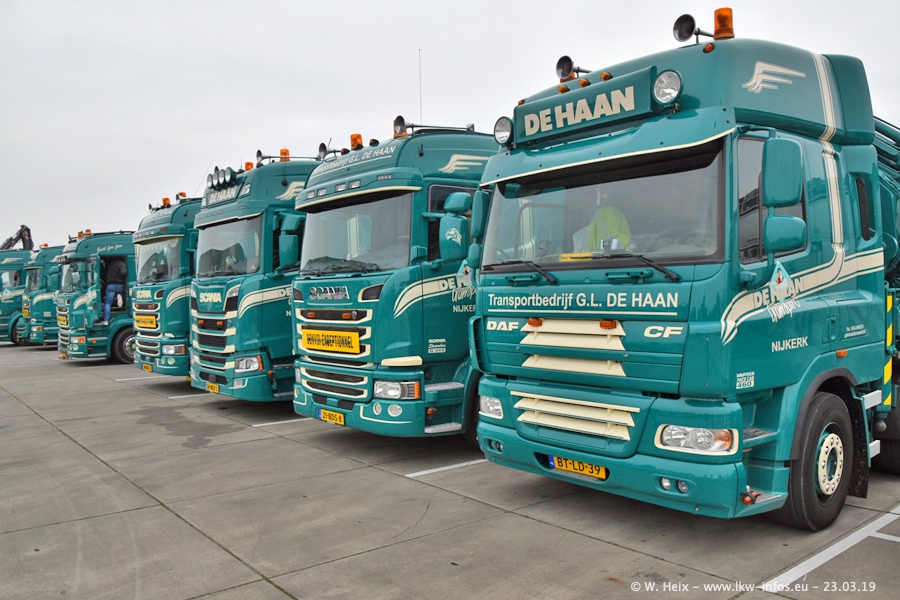 Mein erster Besuch bei der Firma de Haan war im Januar 2016. Inzwischen sind also über 3 Jahre vergangen und es hat sich viel verändert. Gab es 2013 noch einige Fahrzeuge im Design der Firma van Maanen, deren Spezialtansport-Bereich nach der Insolvenz von van Maanen übernommen wurde, sind diese weitgehend raus aus dem Fuhrpark. Einige wenige, wie z.B. der Scania R 500 V8 8x4 wurden damals unlackiert und sind noch vorhanden. Es gibt seit Mitte 2018 die ersten SCANIA R 410 NextGen und viele neue DAF XF Euro 6.