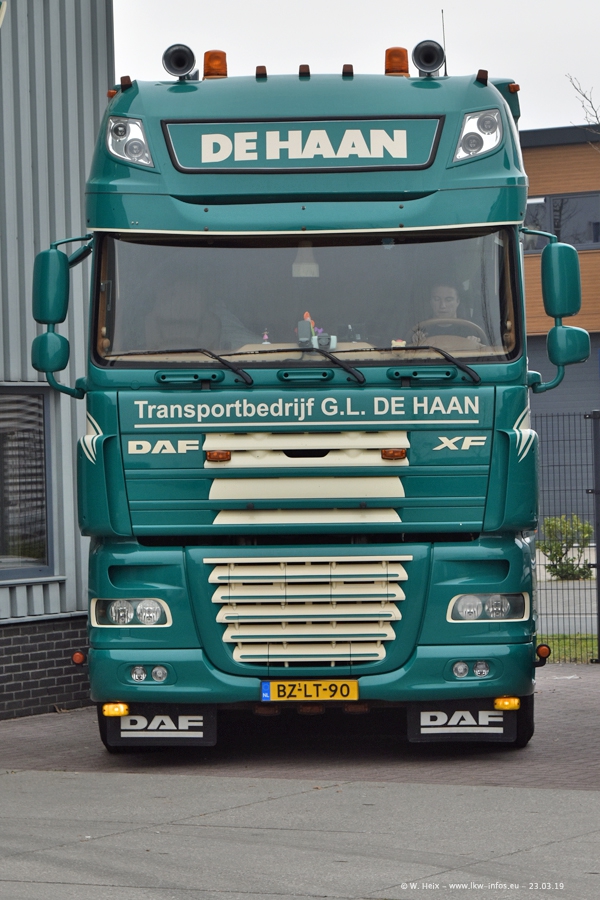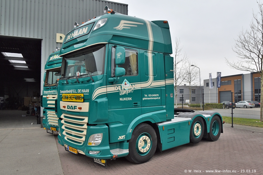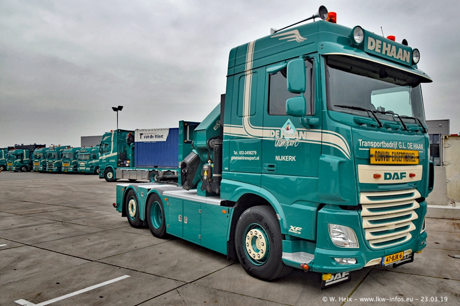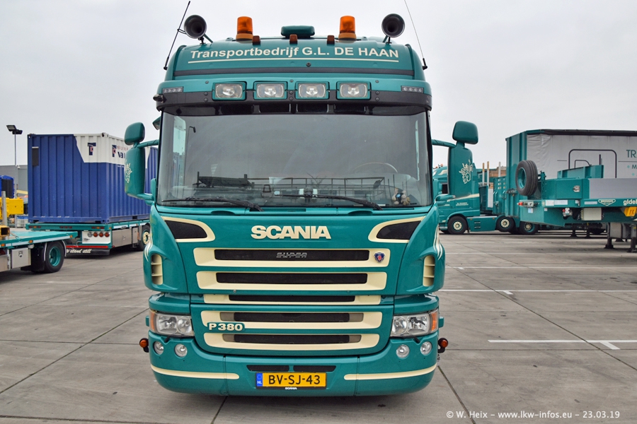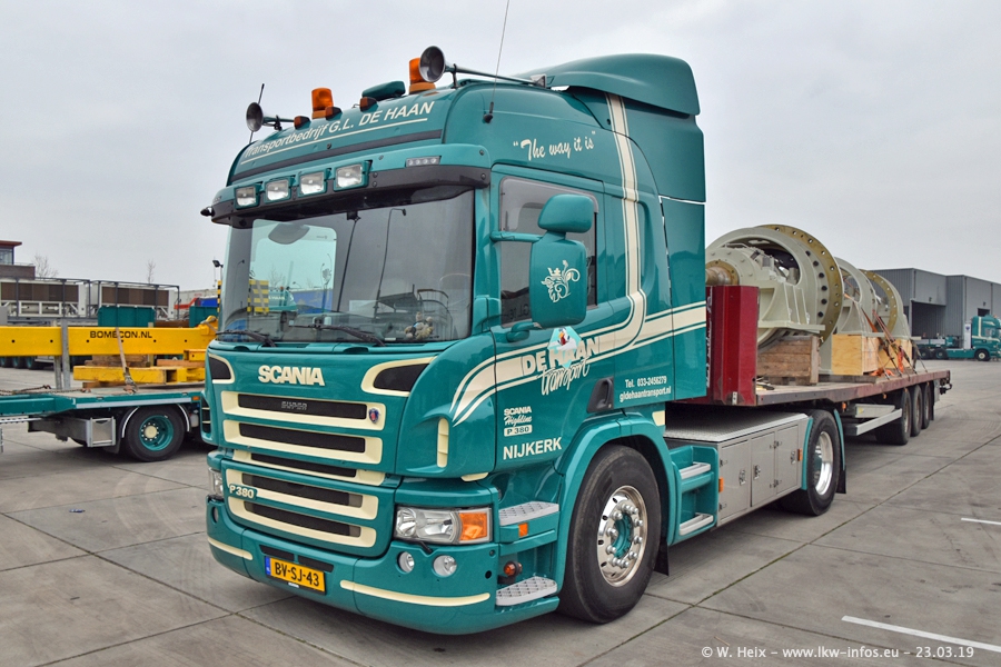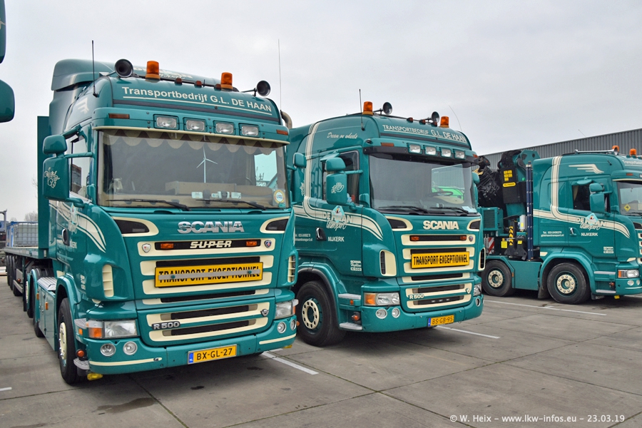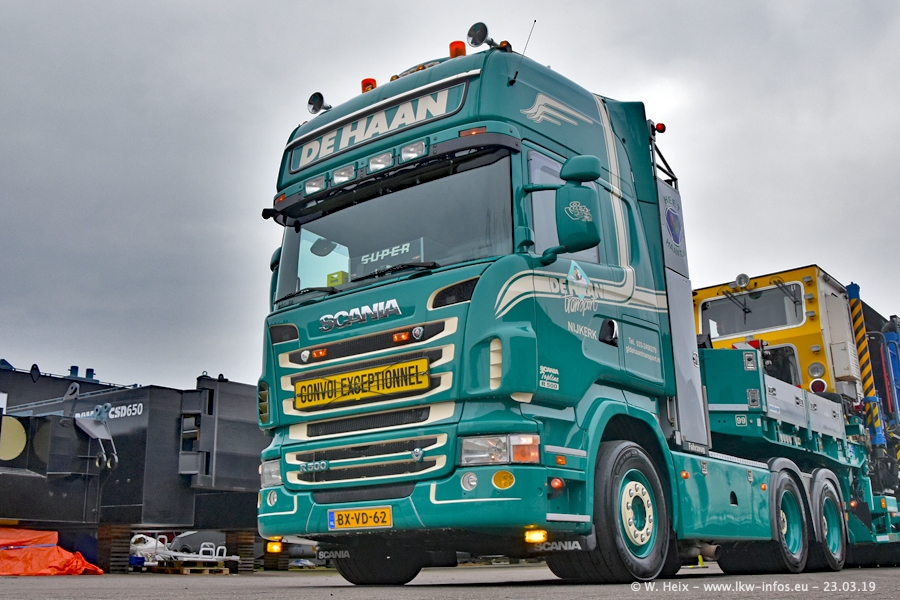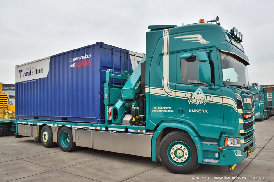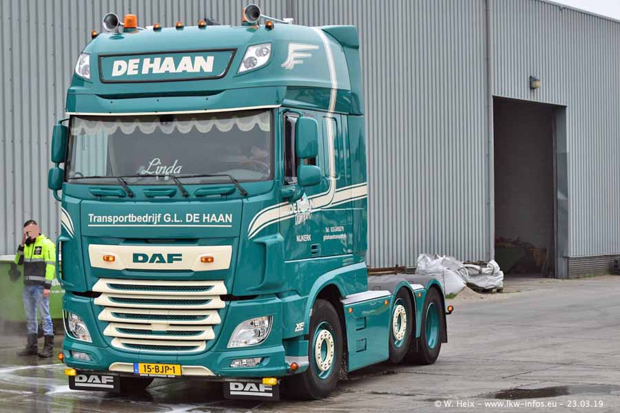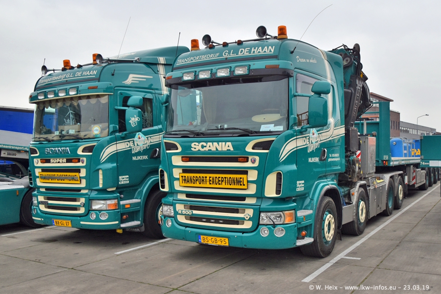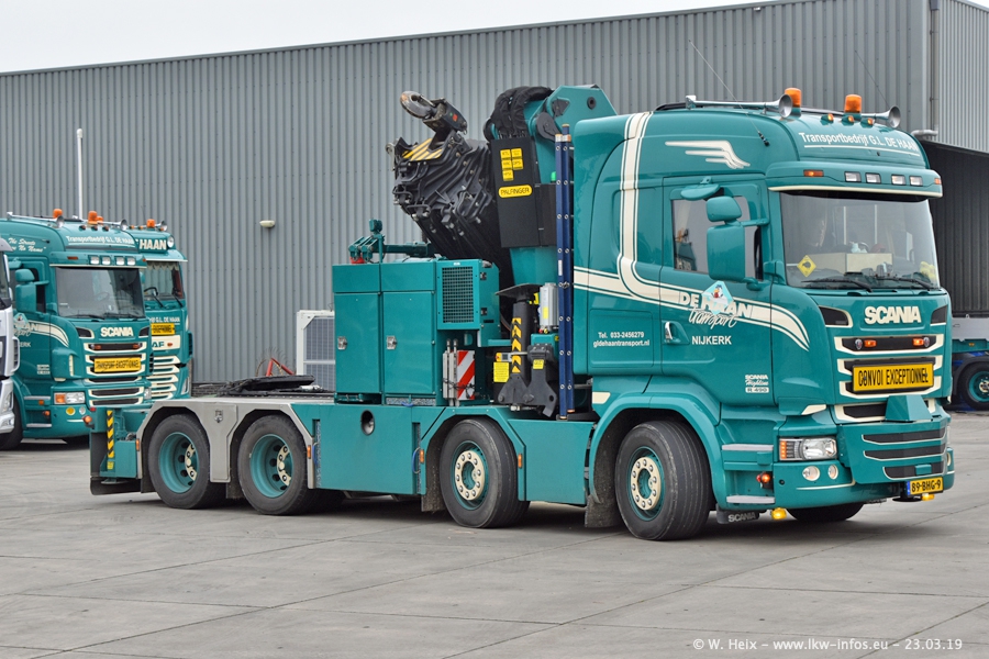 Mein erster Besuch bei der Firma de Haan war im Januar 2016. Inzwischen sind also über 3 Jahre vergangen und es hat sich viel verändert. Gab es 2013 noch einige Fahrzeuge im Design der Firma van Maanen, deren Spezialtansport-Bereich nach der Insolvenz von van Maanen übernommen wurde, sind diese weitgehend raus aus dem Fuhrpark. Einige wenige, wie z.B. der Scania R 500 V8 8x4 wurden damals unlackiert und sind noch vorhanden. Es gibt seit Mitte 2018 die ersten SCANIA R 410 NextGen und viele neue DAF XF Euro 6.