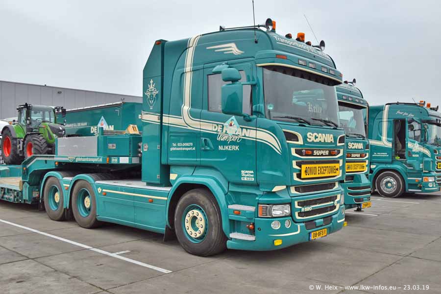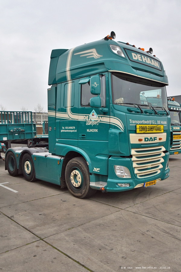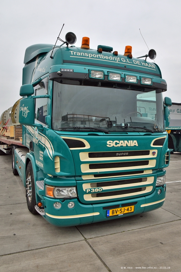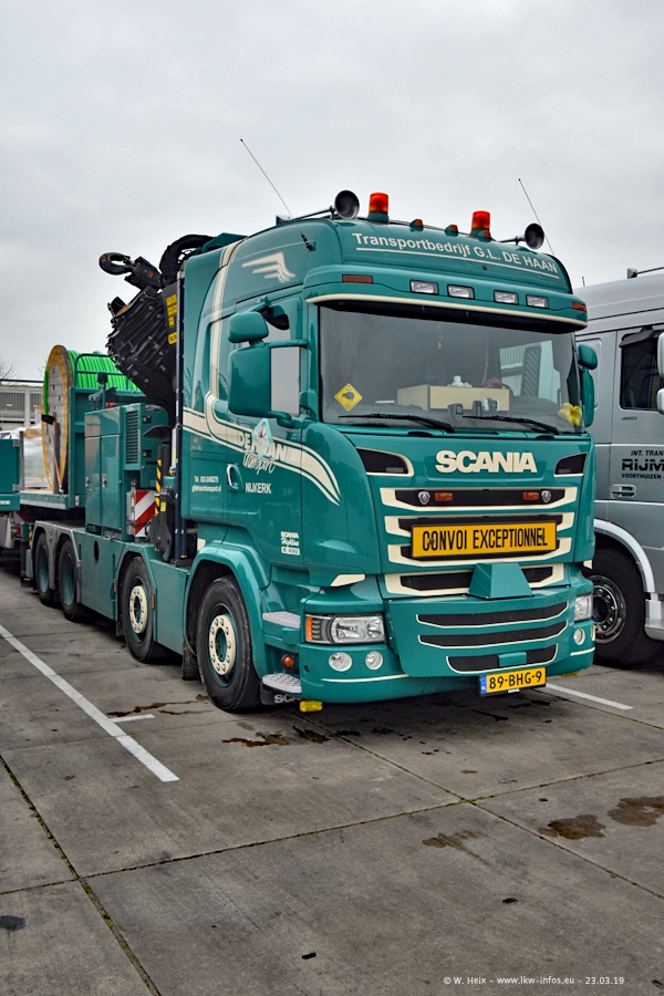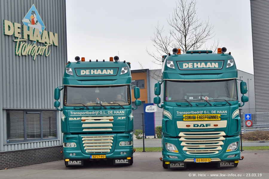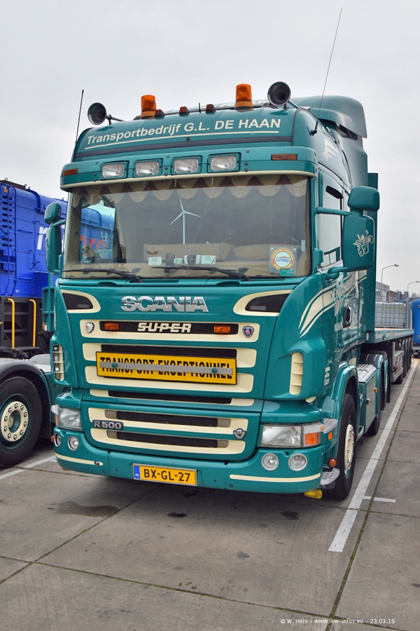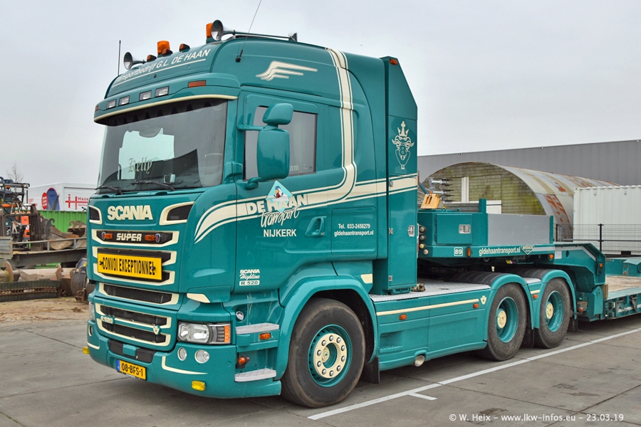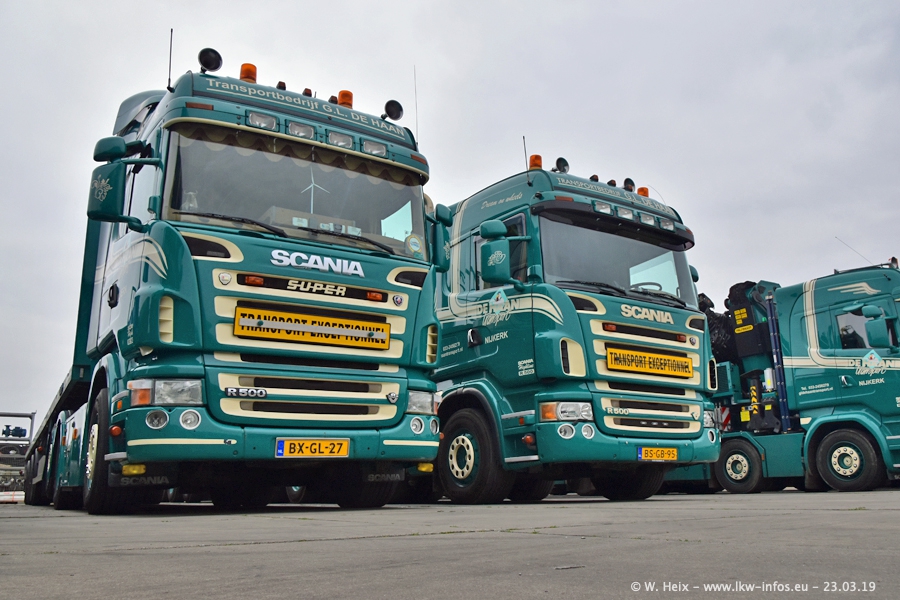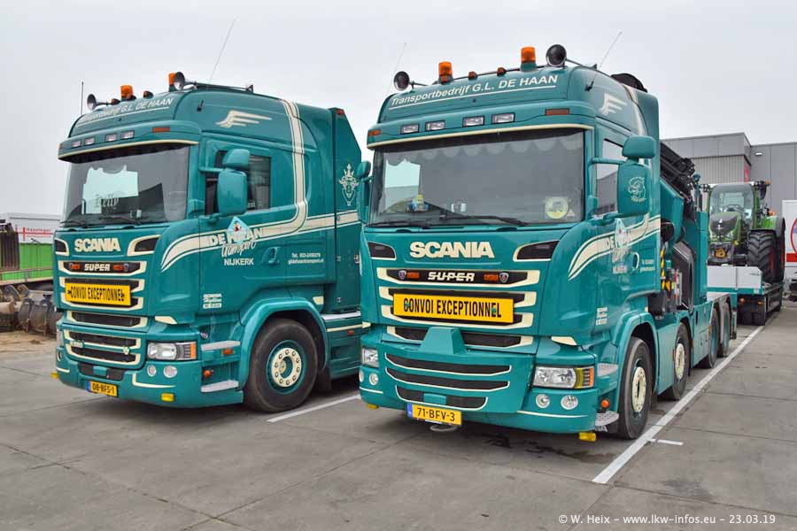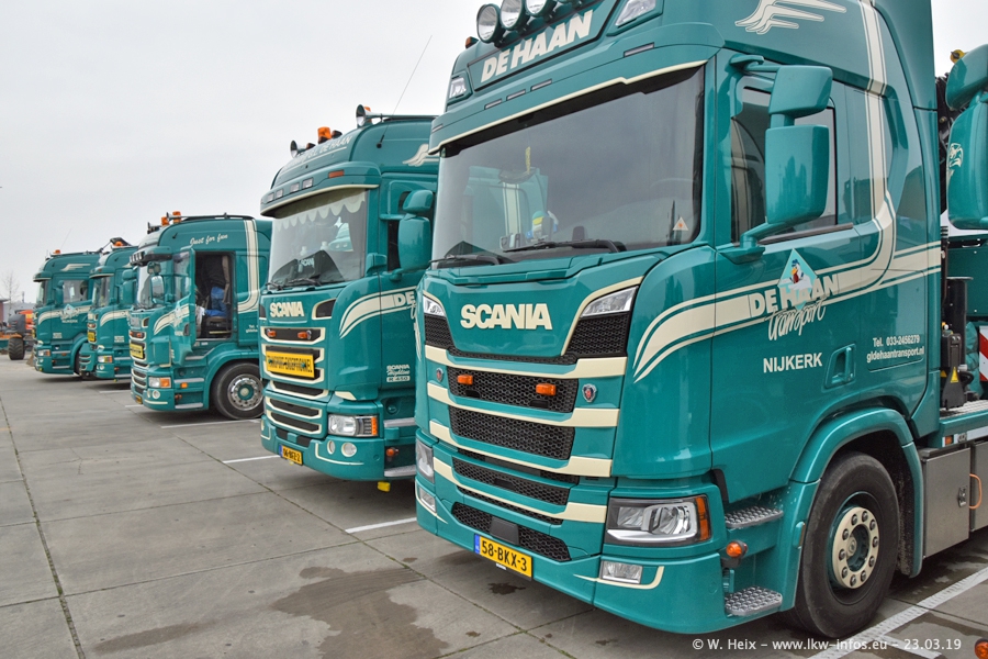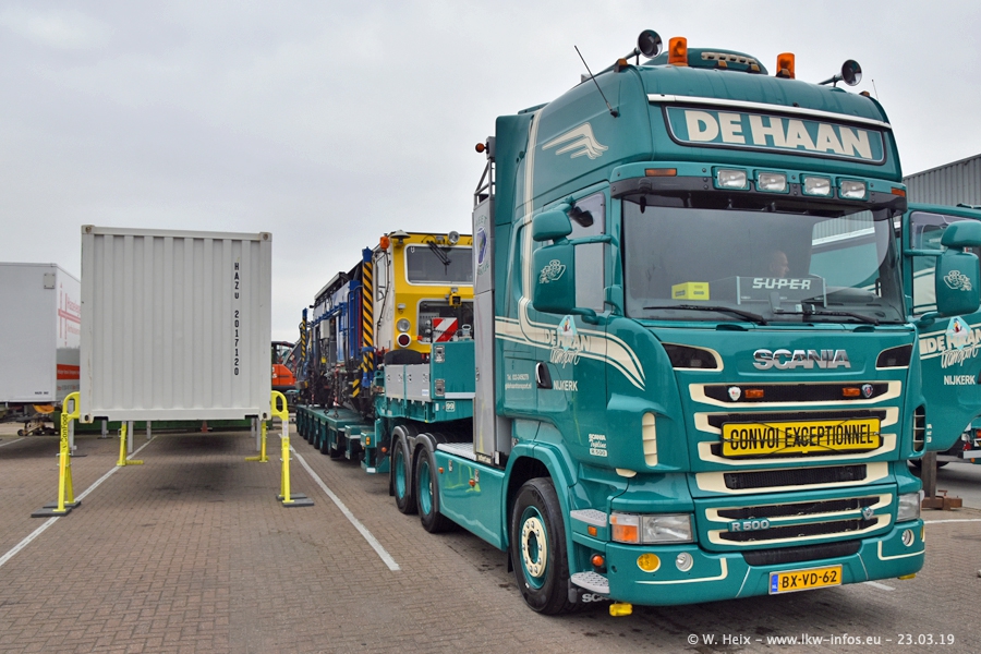 Mein erster Besuch bei der Firma de Haan war im Januar 2016. Inzwischen sind also über 3 Jahre vergangen und es hat sich viel verändert. Gab es 2013 noch einige Fahrzeuge im Design der Firma van Maanen, deren Spezialtansport-Bereich nach der Insolvenz von van Maanen übernommen wurde, sind diese weitgehend raus aus dem Fuhrpark. Einige wenige, wie z.B. der Scania R 500 V8 8x4 wurden damals unlackiert und sind noch vorhanden. Es gibt seit Mitte 2018 die ersten SCANIA R 410 NextGen und viele neue DAF XF Euro 6.