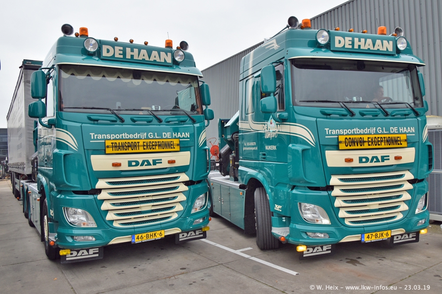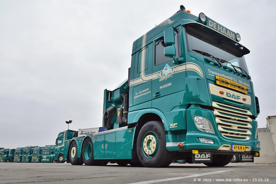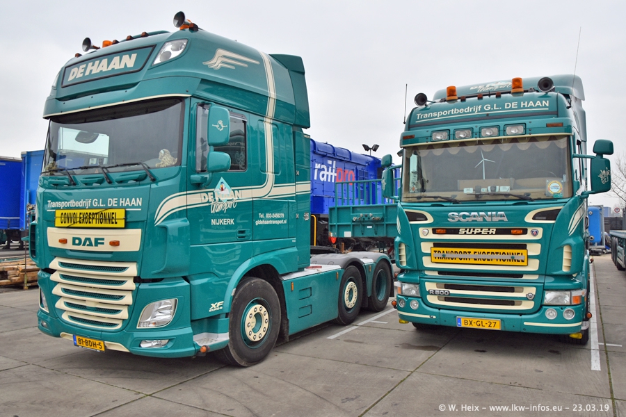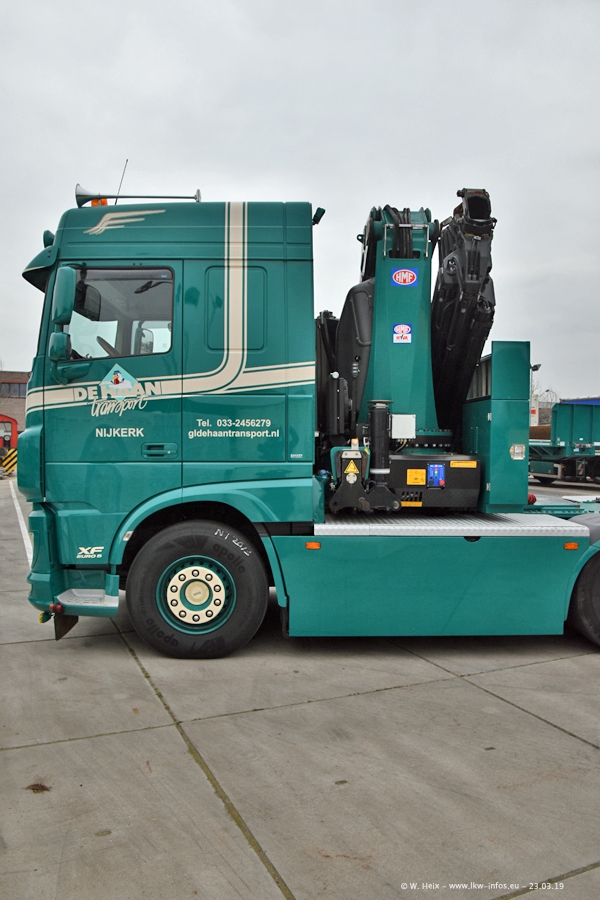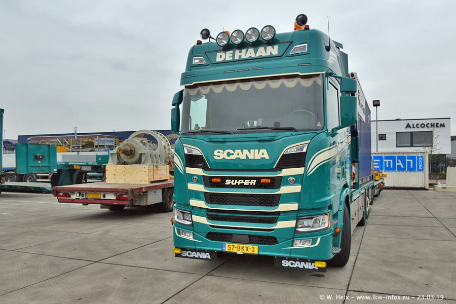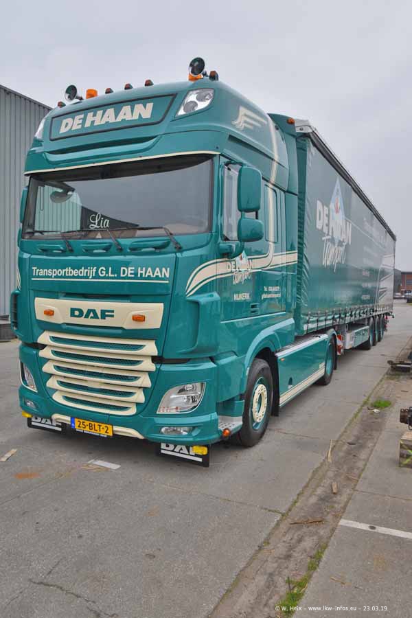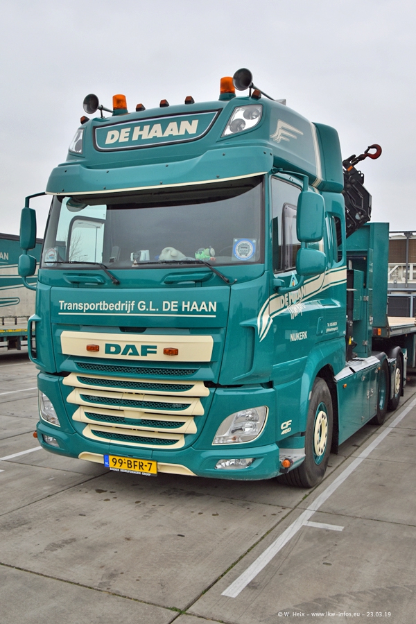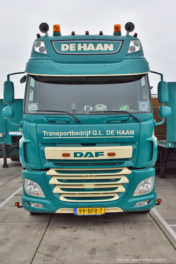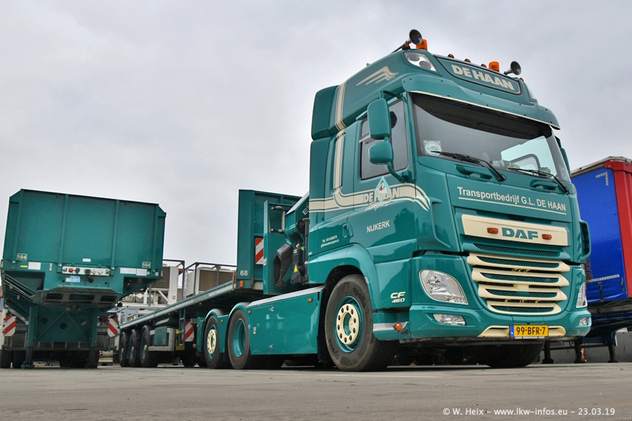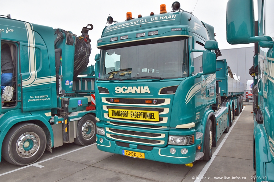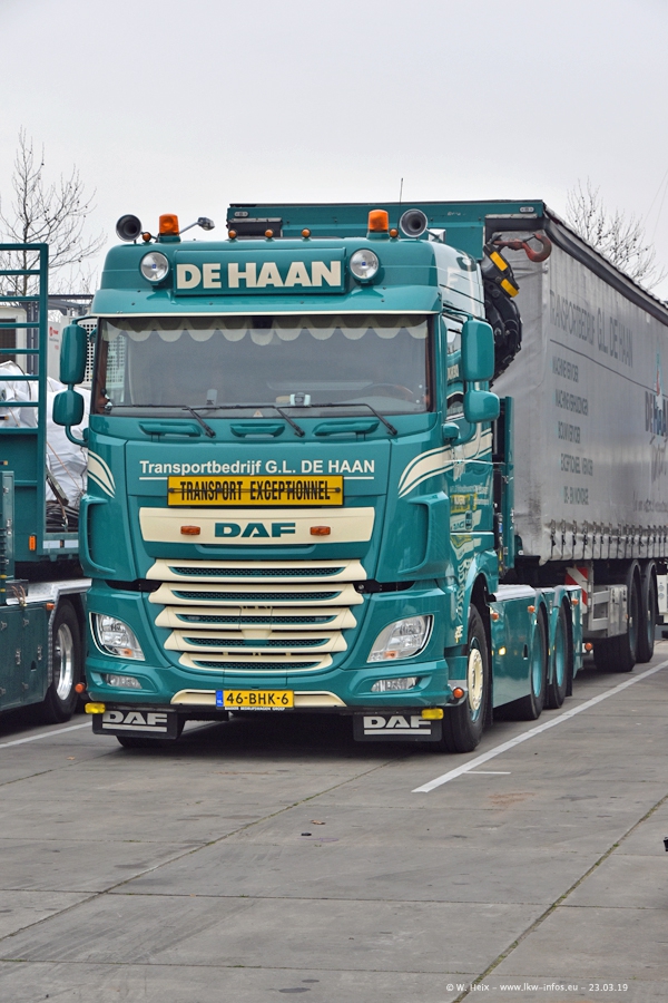 Mein erster Besuch bei der Firma de Haan war im Januar 2016. Inzwischen sind also über 3 Jahre vergangen und es hat sich viel verändert. Gab es 2013 noch einige Fahrzeuge im Design der Firma van Maanen, deren Spezialtansport-Bereich nach der Insolvenz von van Maanen übernommen wurde, sind diese weitgehend raus aus dem Fuhrpark. Einige wenige, wie z.B. der Scania R 500 V8 8x4 wurden damals unlackiert und sind noch vorhanden. Es gibt seit Mitte 2018 die ersten SCANIA R 410 NextGen und viele neue DAF XF Euro 6.