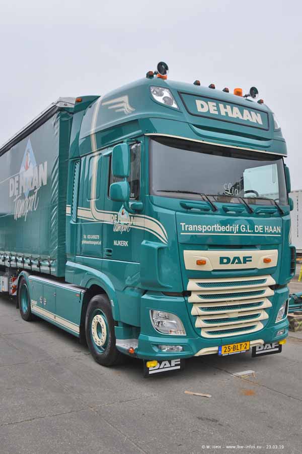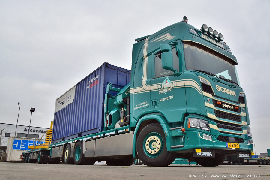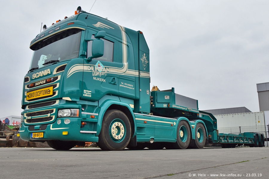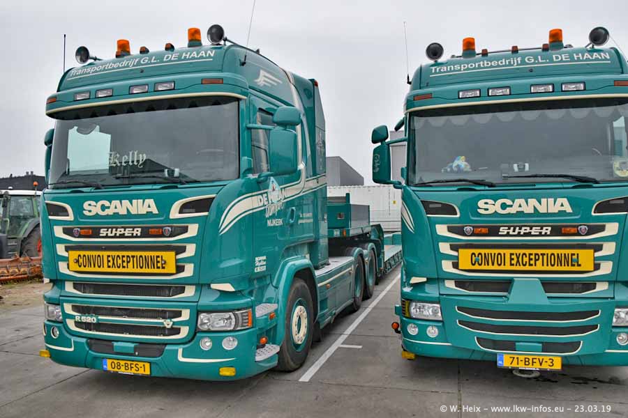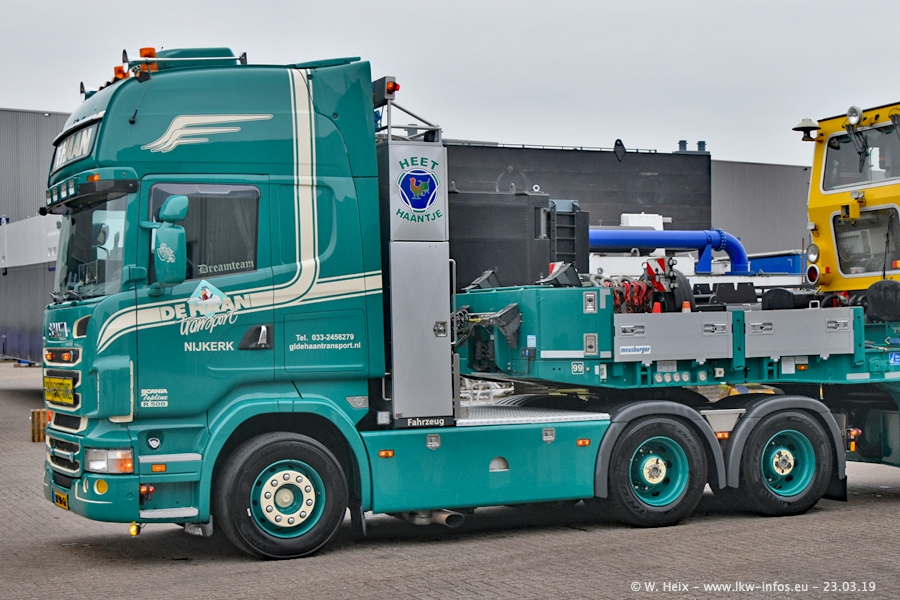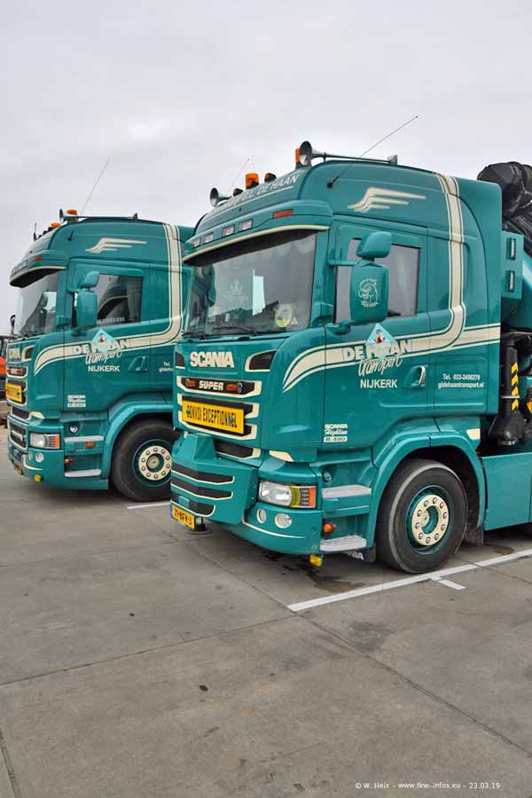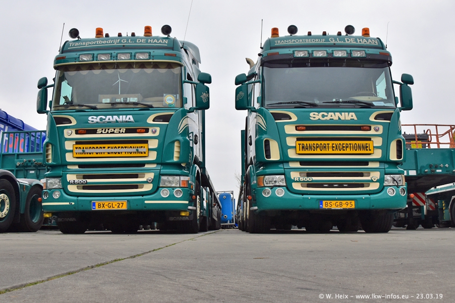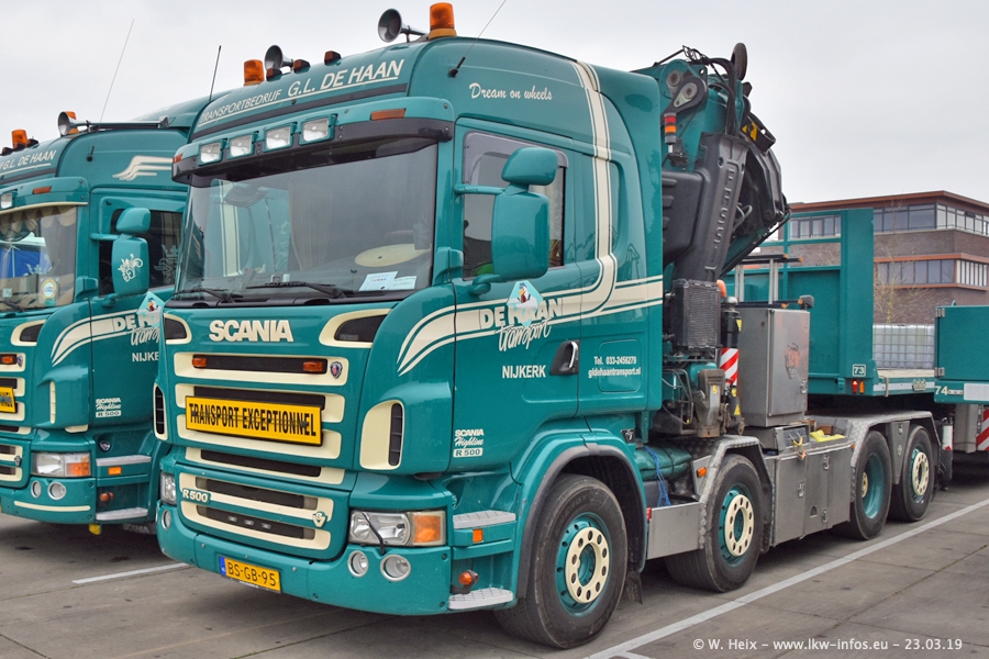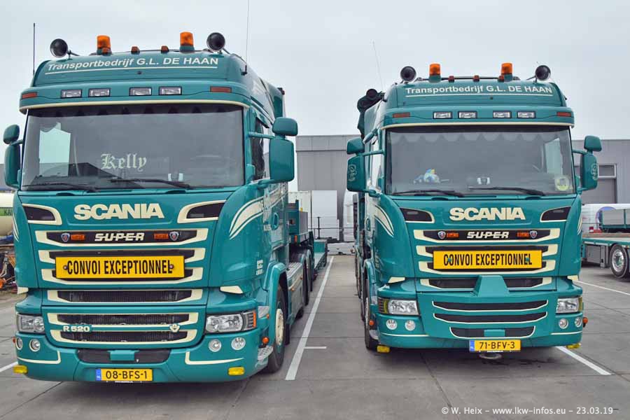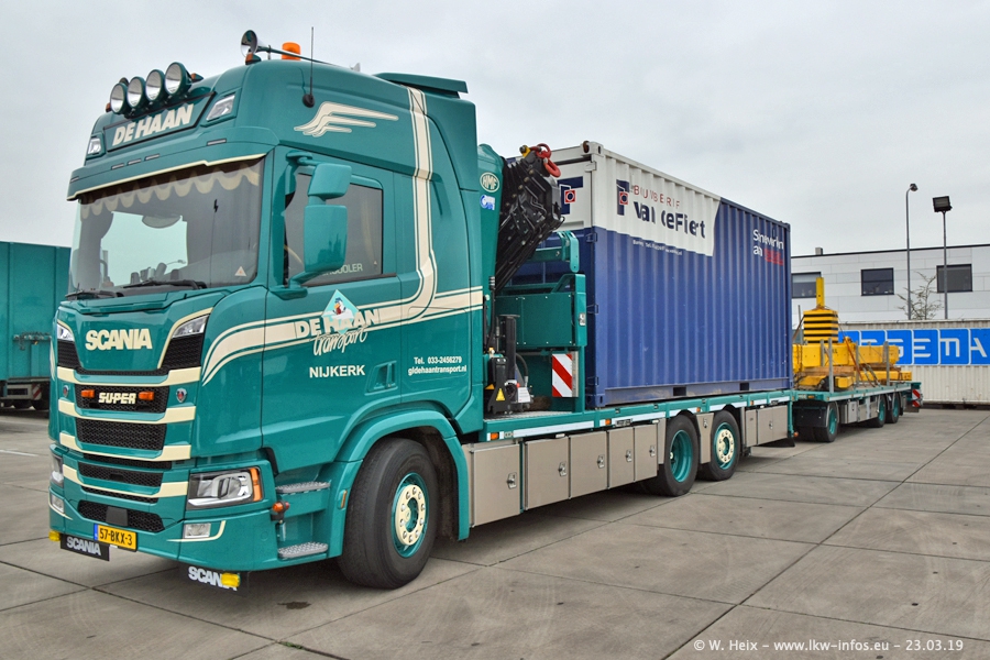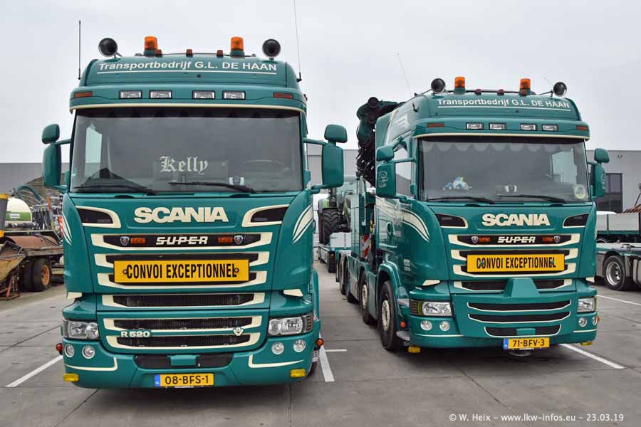 Mein erster Besuch bei der Firma de Haan war im Januar 2016. Inzwischen sind also über 3 Jahre vergangen und es hat sich viel verändert. Gab es 2013 noch einige Fahrzeuge im Design der Firma van Maanen, deren Spezialtansport-Bereich nach der Insolvenz von van Maanen übernommen wurde, sind diese weitgehend raus aus dem Fuhrpark. Einige wenige, wie z.B. der Scania R 500 V8 8x4 wurden damals unlackiert und sind noch vorhanden. Es gibt seit Mitte 2018 die ersten SCANIA R 410 NextGen und viele neue DAF XF Euro 6.