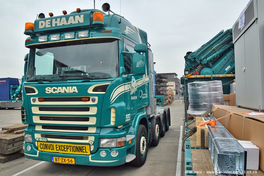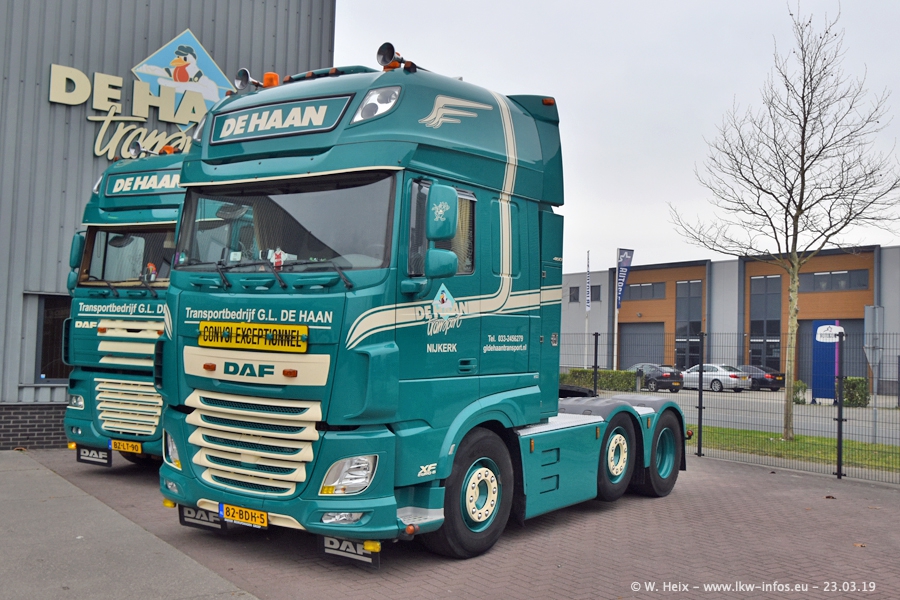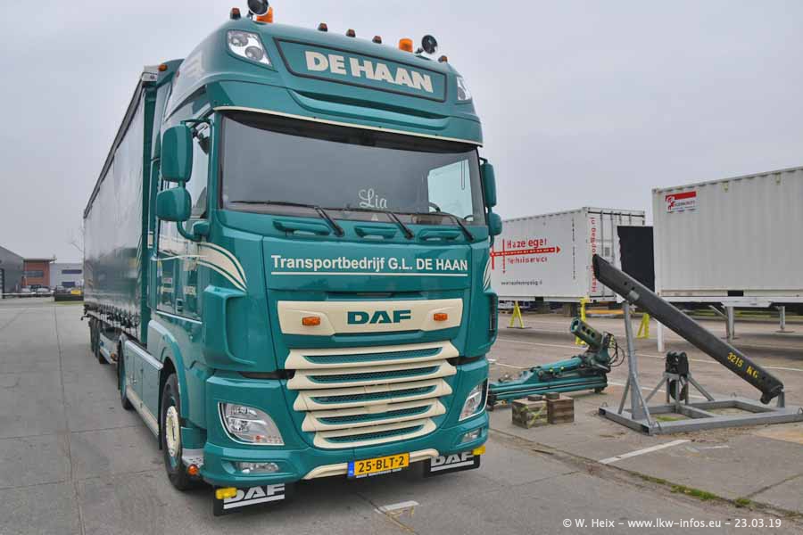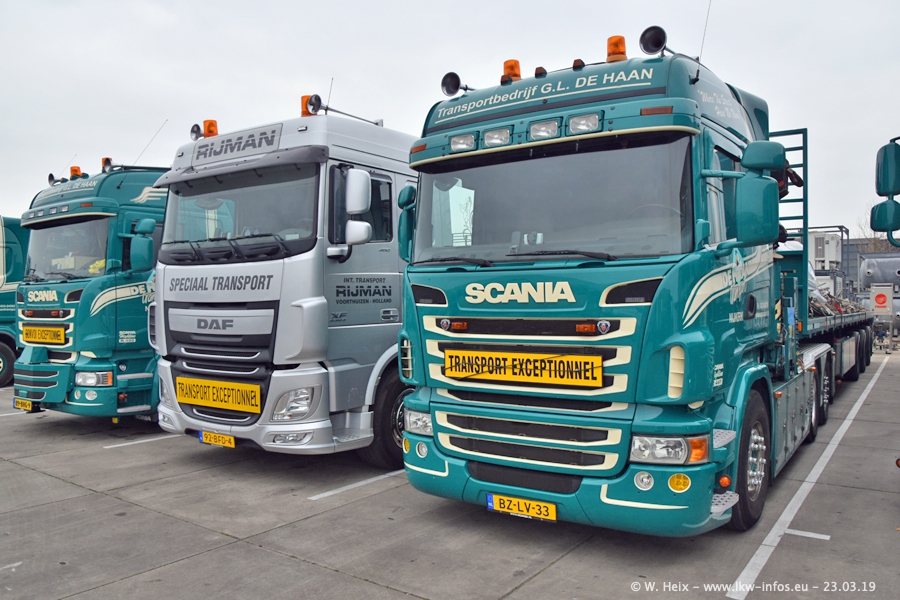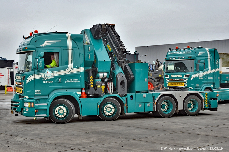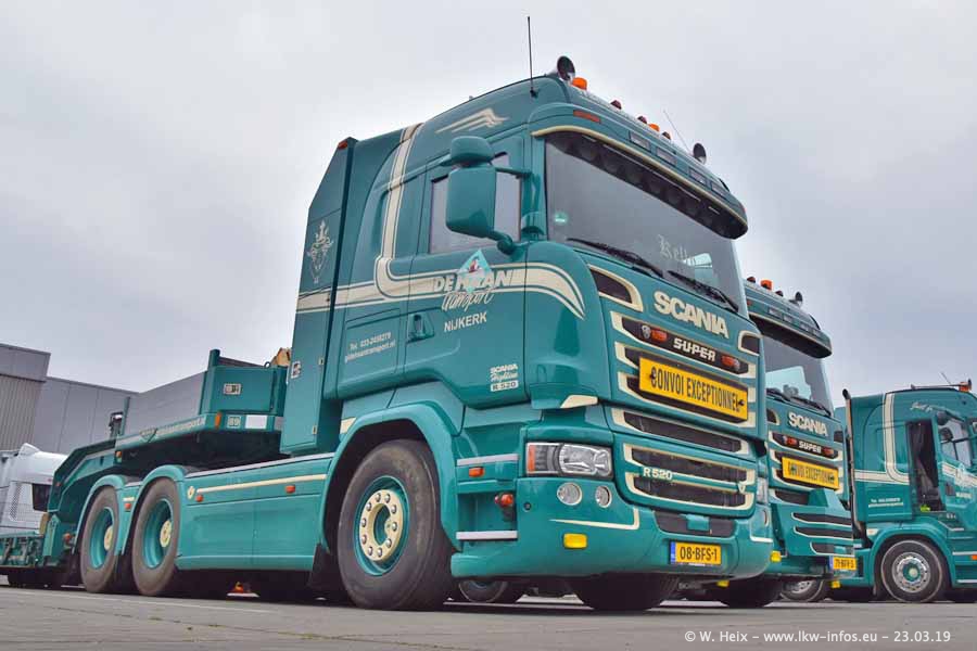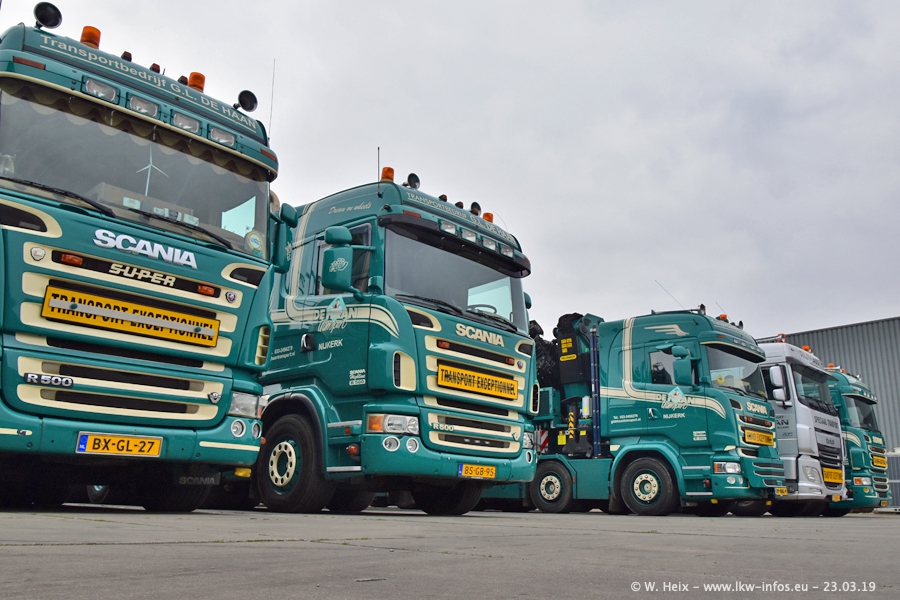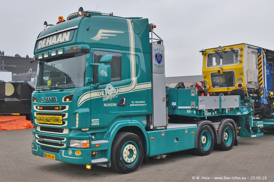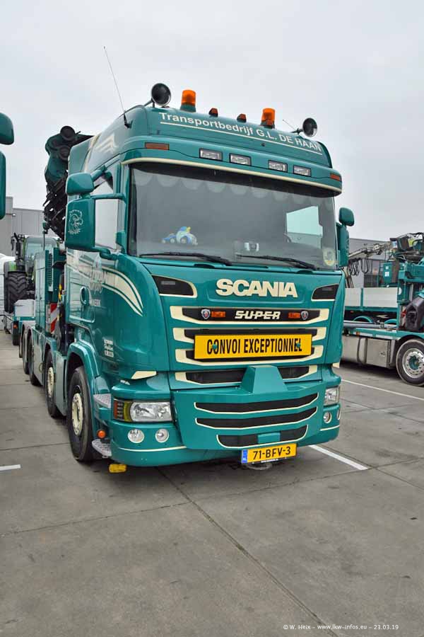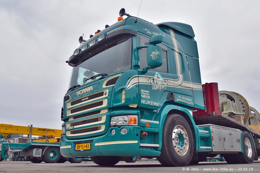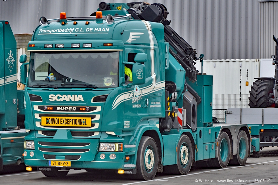 Mein erster Besuch bei der Firma de Haan war im Januar 2016. Inzwischen sind also über 3 Jahre vergangen und es hat sich viel verändert. Gab es 2013 noch einige Fahrzeuge im Design der Firma van Maanen, deren Spezialtansport-Bereich nach der Insolvenz von van Maanen übernommen wurde, sind diese weitgehend raus aus dem Fuhrpark. Einige wenige, wie z.B. der Scania R 500 V8 8x4 wurden damals unlackiert und sind noch vorhanden. Es gibt seit Mitte 2018 die ersten SCANIA R 410 NextGen und viele neue DAF XF Euro 6.