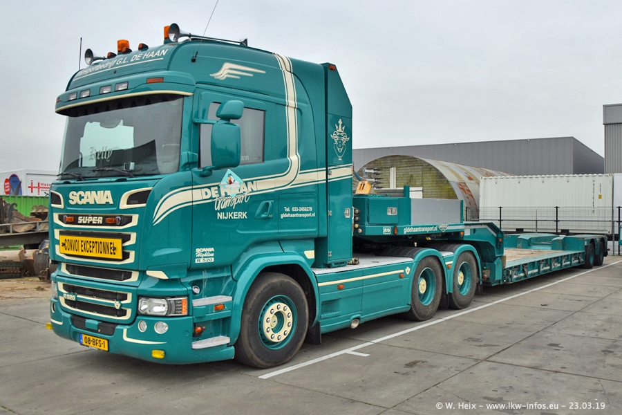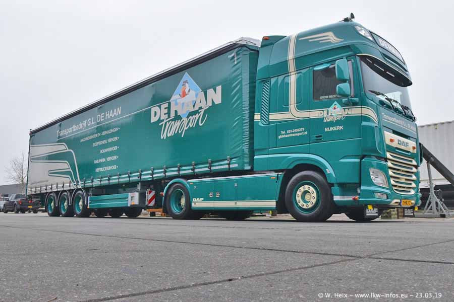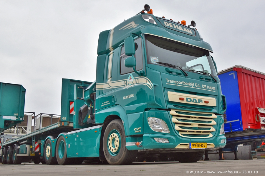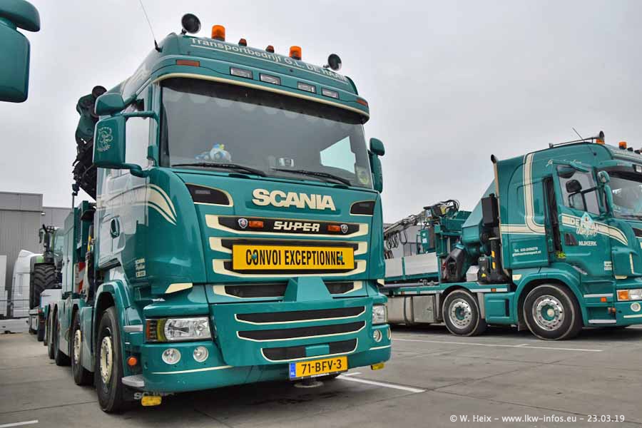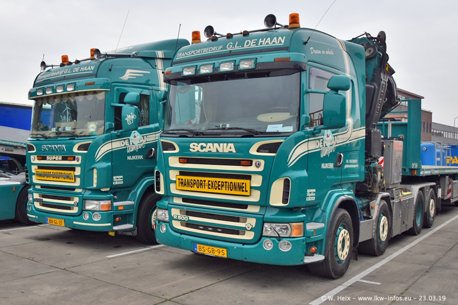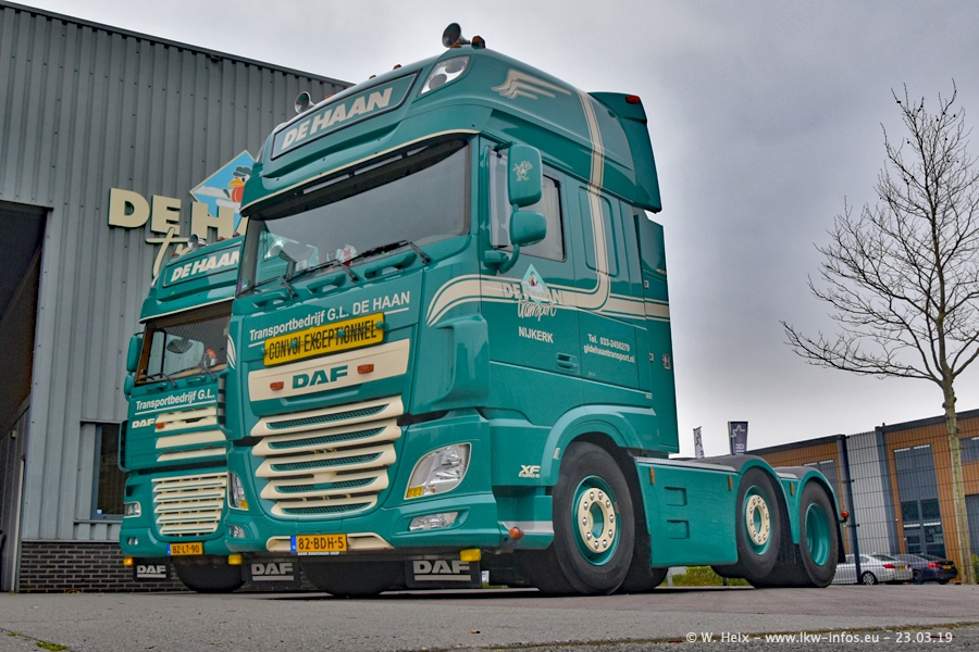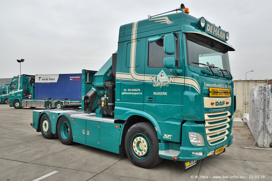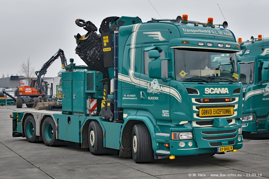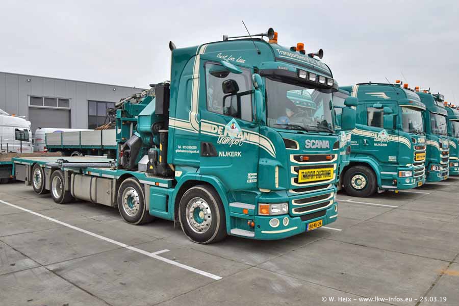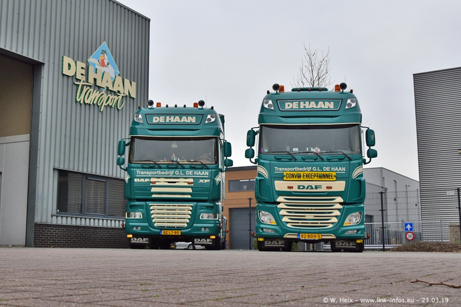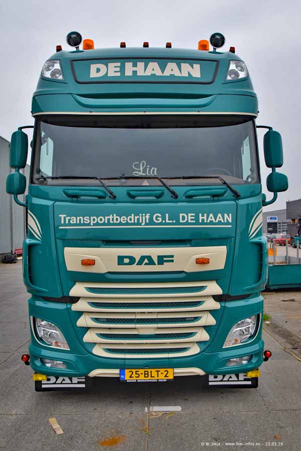 Mein erster Besuch bei der Firma de Haan war im Januar 2016. Inzwischen sind also über 3 Jahre vergangen und es hat sich viel verändert. Gab es 2013 noch einige Fahrzeuge im Design der Firma van Maanen, deren Spezialtansport-Bereich nach der Insolvenz von van Maanen übernommen wurde, sind diese weitgehend raus aus dem Fuhrpark. Einige wenige, wie z.B. der Scania R 500 V8 8x4 wurden damals unlackiert und sind noch vorhanden. Es gibt seit Mitte 2018 die ersten SCANIA R 410 NextGen und viele neue DAF XF Euro 6.