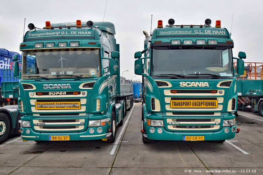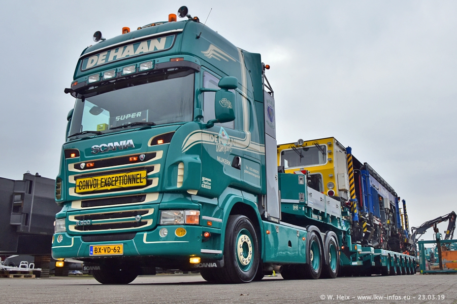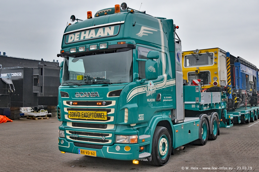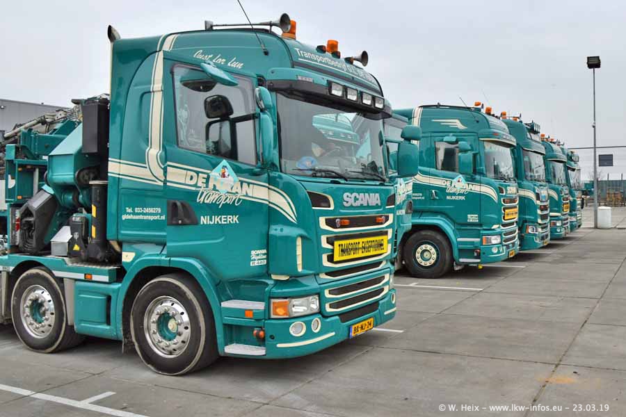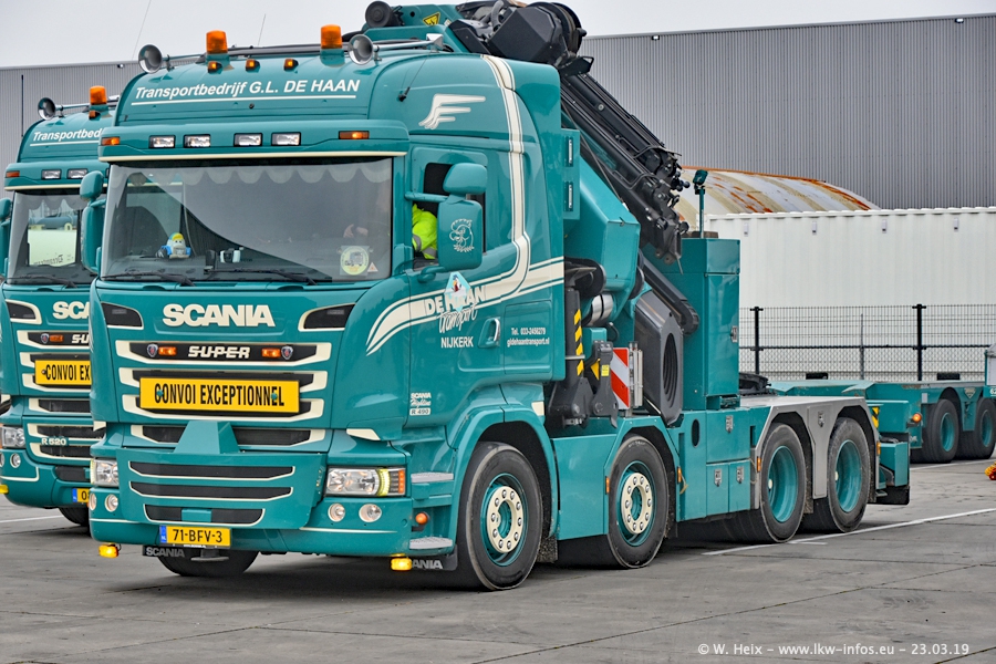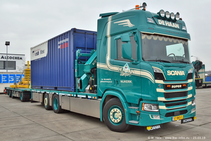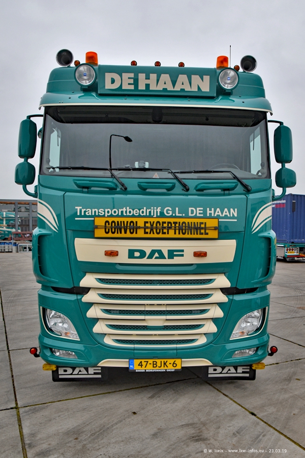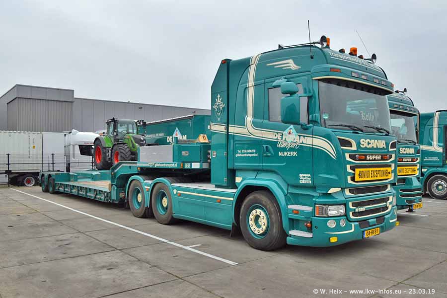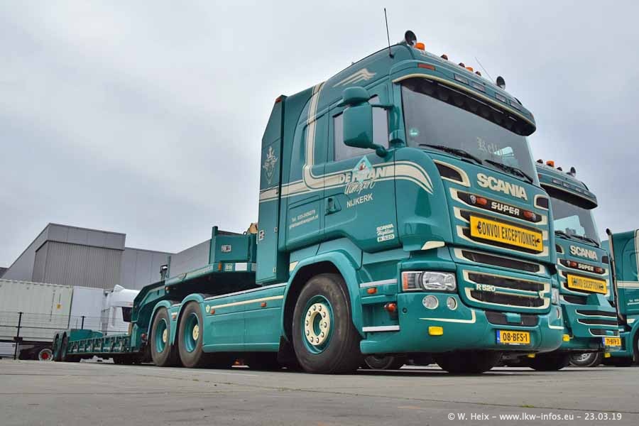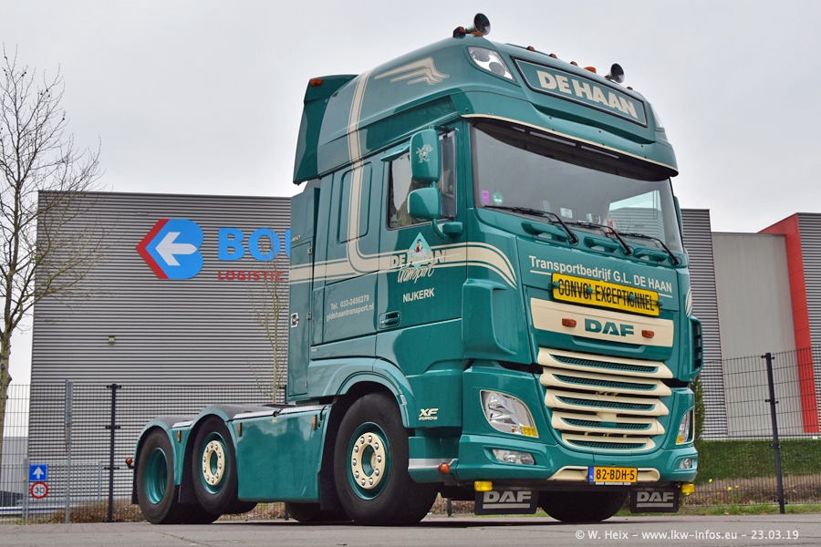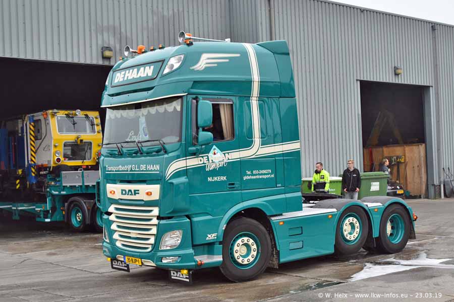 Mein erster Besuch bei der Firma de Haan war im Januar 2016. Inzwischen sind also über 3 Jahre vergangen und es hat sich viel verändert. Gab es 2013 noch einige Fahrzeuge im Design der Firma van Maanen, deren Spezialtansport-Bereich nach der Insolvenz von van Maanen übernommen wurde, sind diese weitgehend raus aus dem Fuhrpark. Einige wenige, wie z.B. der Scania R 500 V8 8x4 wurden damals unlackiert und sind noch vorhanden. Es gibt seit Mitte 2018 die ersten SCANIA R 410 NextGen und viele neue DAF XF Euro 6.