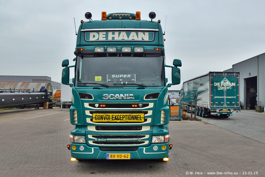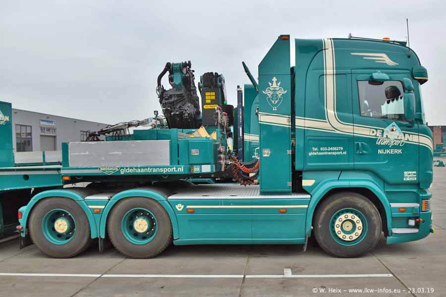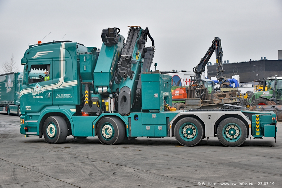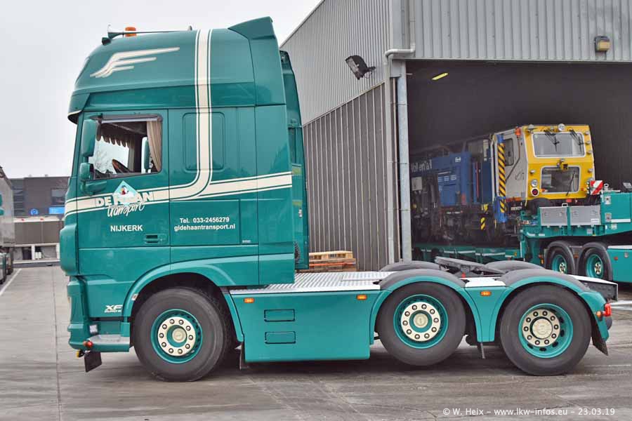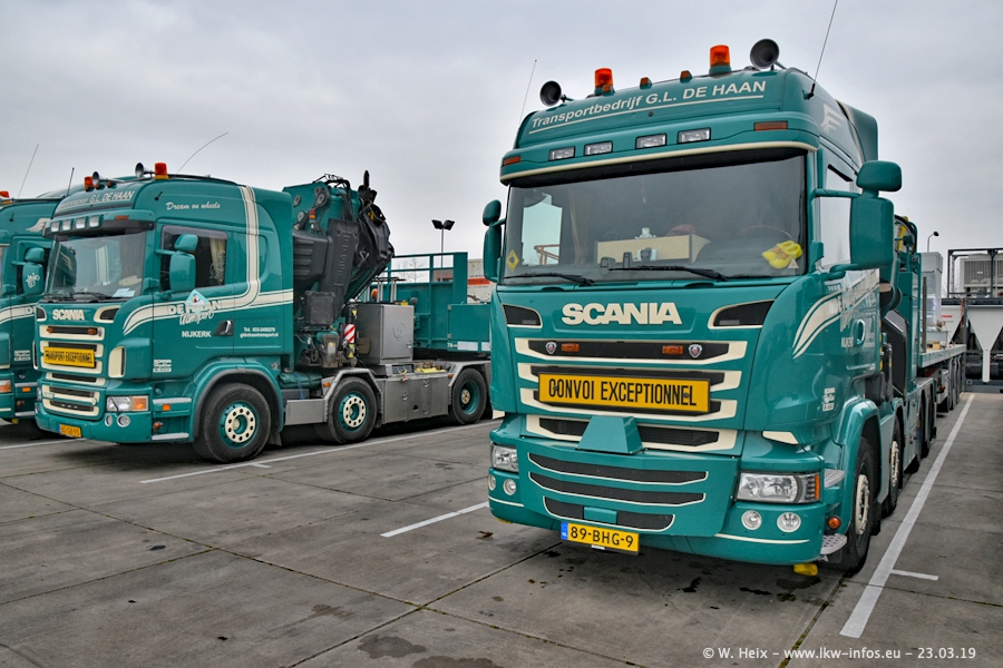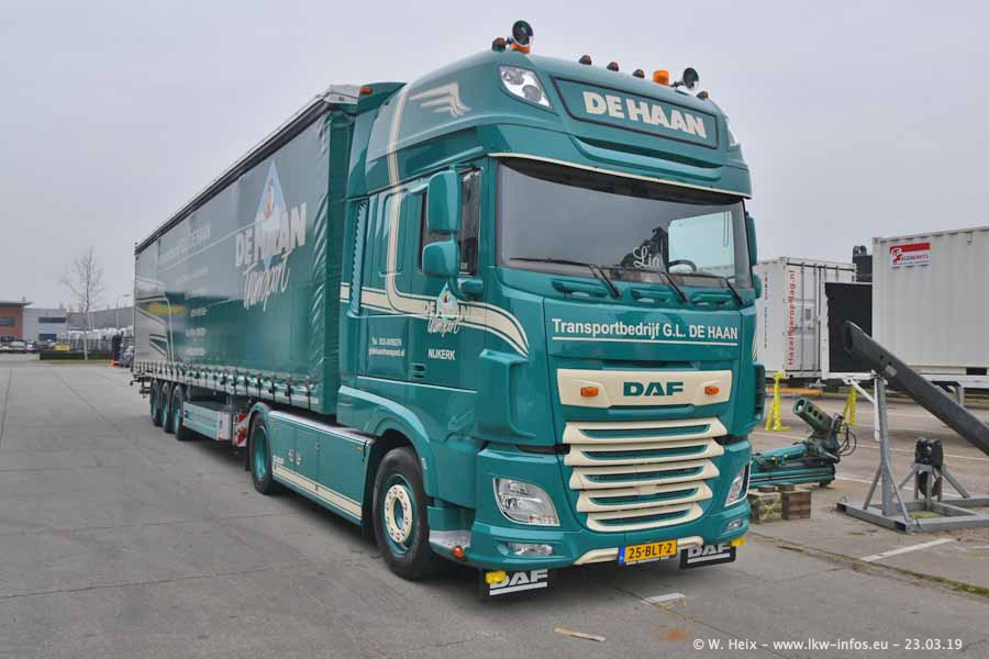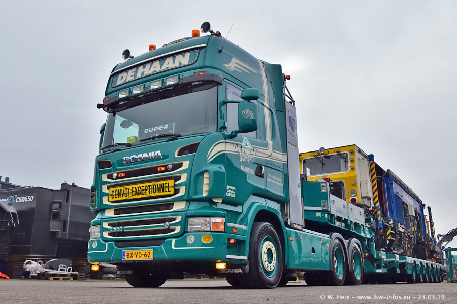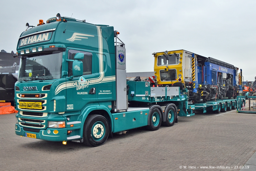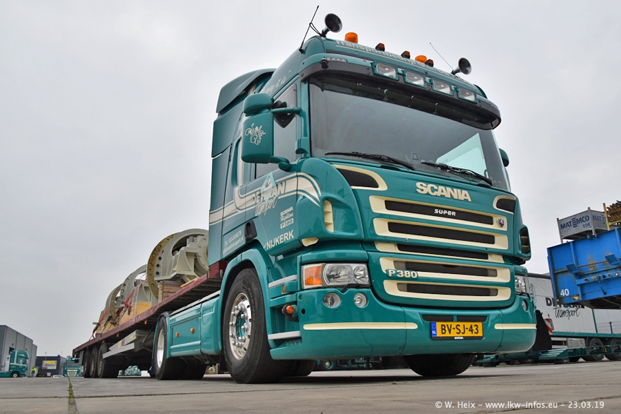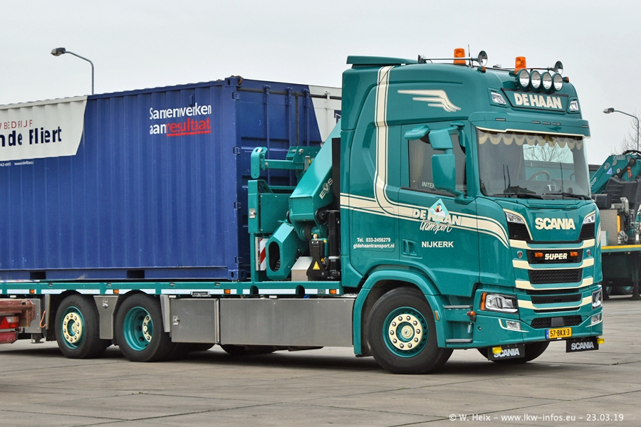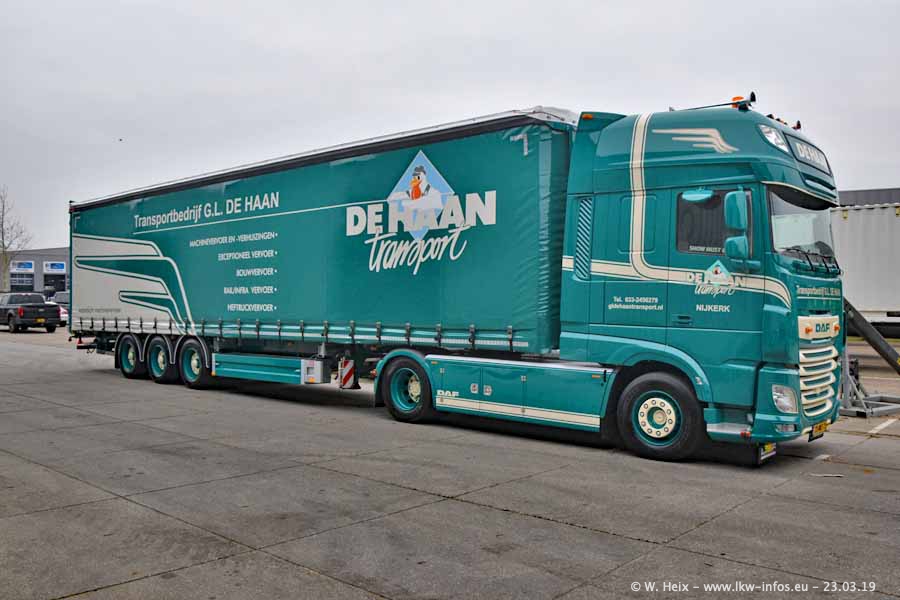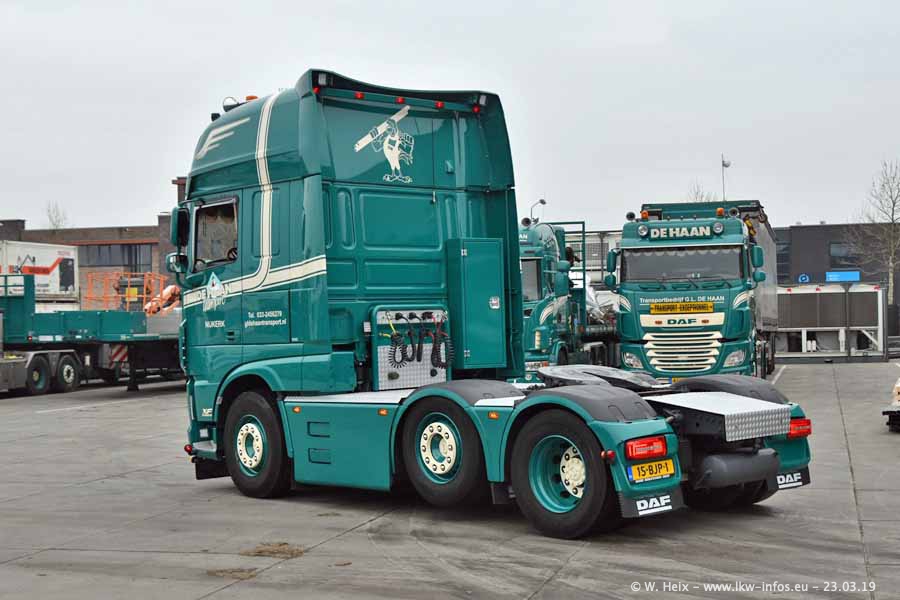 Mein erster Besuch bei der Firma de Haan war im Januar 2016. Inzwischen sind also über 3 Jahre vergangen und es hat sich viel verändert. Gab es 2013 noch einige Fahrzeuge im Design der Firma van Maanen, deren Spezialtansport-Bereich nach der Insolvenz von van Maanen übernommen wurde, sind diese weitgehend raus aus dem Fuhrpark. Einige wenige, wie z.B. der Scania R 500 V8 8x4 wurden damals unlackiert und sind noch vorhanden. Es gibt seit Mitte 2018 die ersten SCANIA R 410 NextGen und viele neue DAF XF Euro 6.