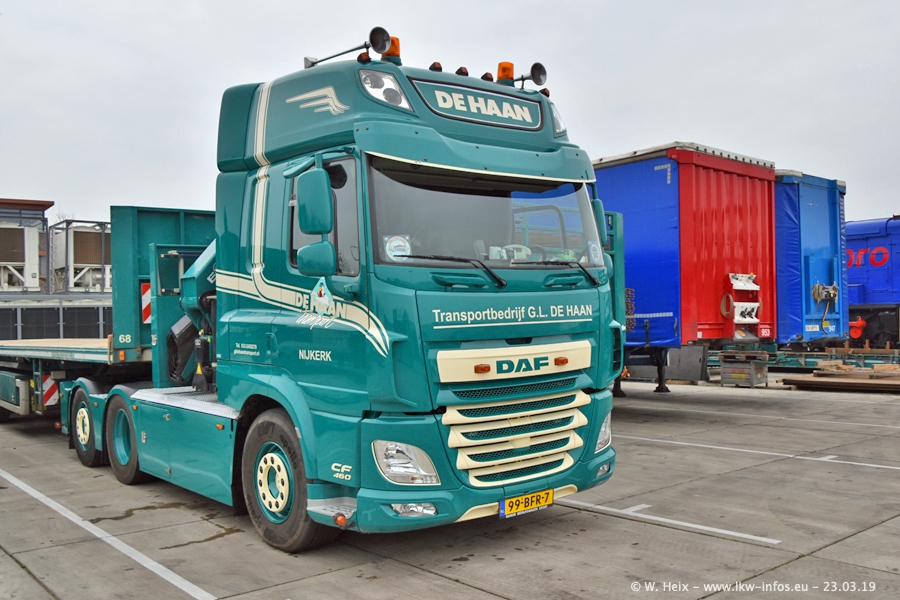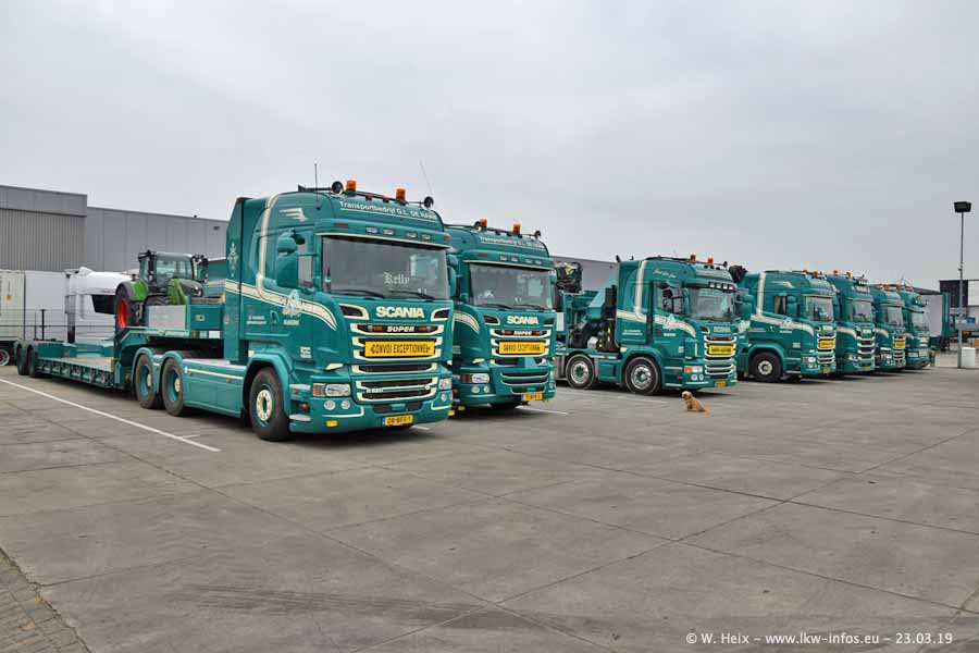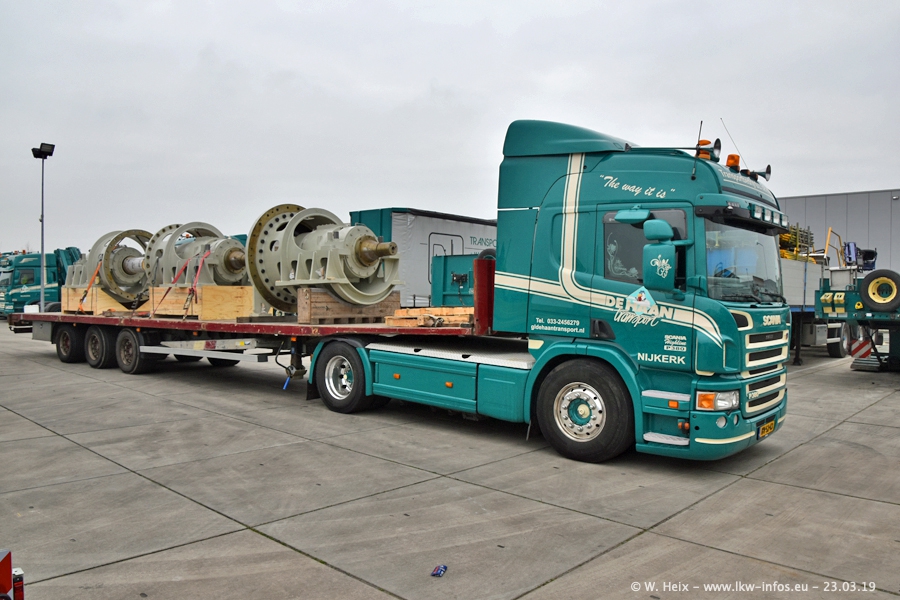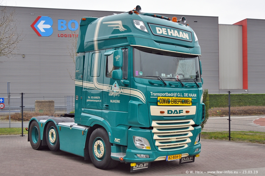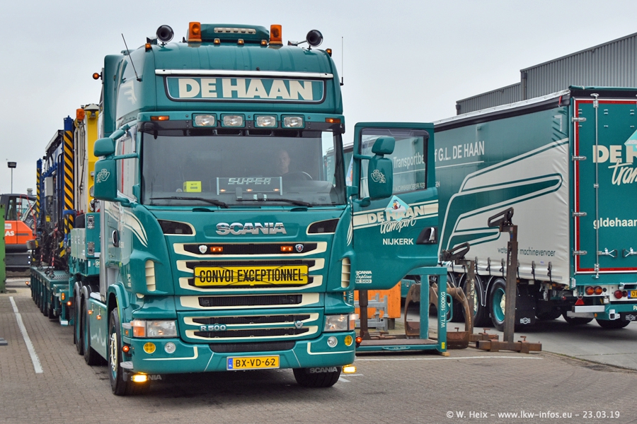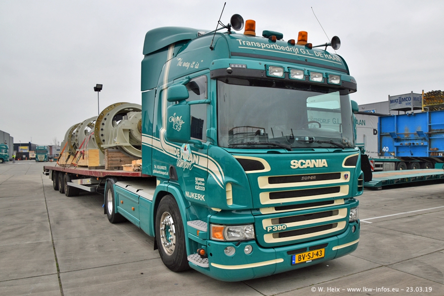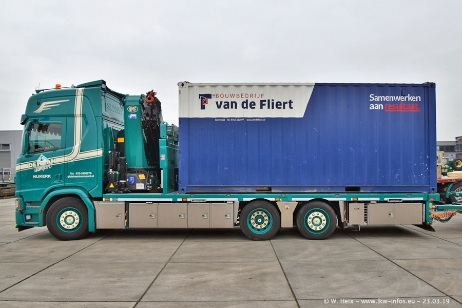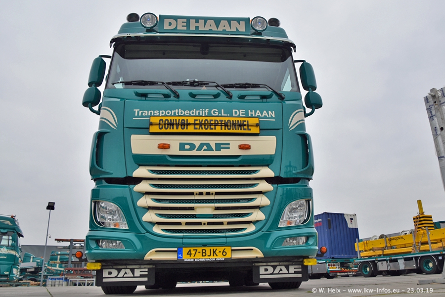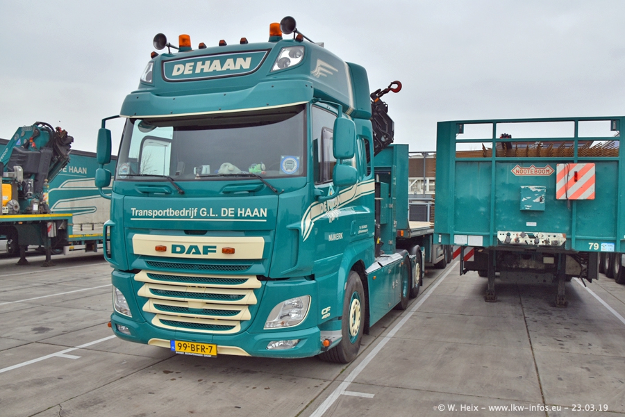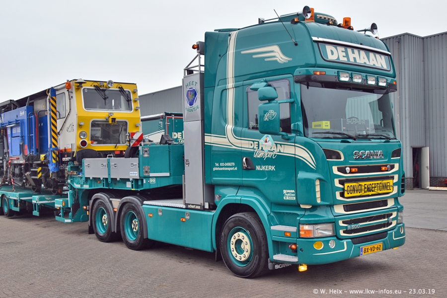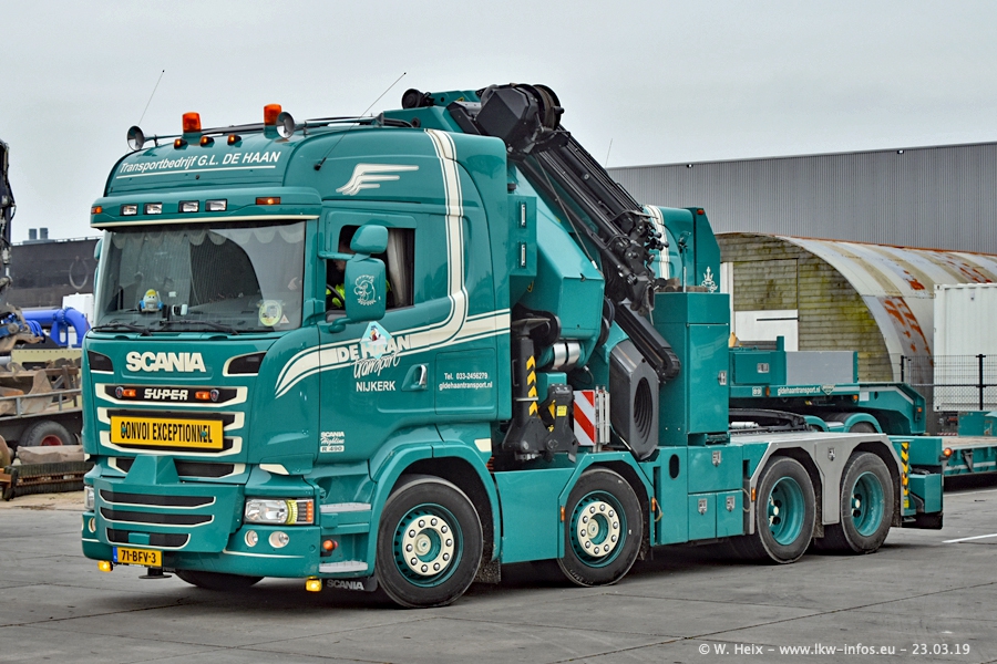 Mein erster Besuch bei der Firma de Haan war im Januar 2016. Inzwischen sind also über 3 Jahre vergangen und es hat sich viel verändert. Gab es 2013 noch einige Fahrzeuge im Design der Firma van Maanen, deren Spezialtansport-Bereich nach der Insolvenz von van Maanen übernommen wurde, sind diese weitgehend raus aus dem Fuhrpark. Einige wenige, wie z.B. der Scania R 500 V8 8x4 wurden damals unlackiert und sind noch vorhanden. Es gibt seit Mitte 2018 die ersten SCANIA R 410 NextGen und viele neue DAF XF Euro 6.