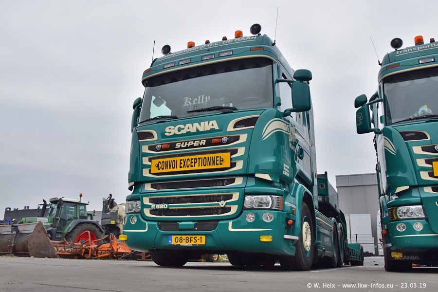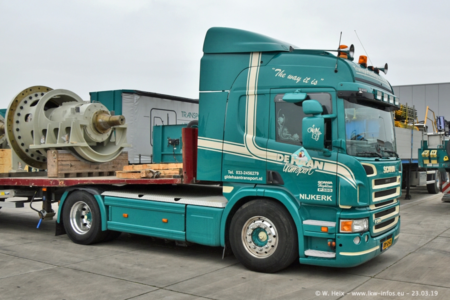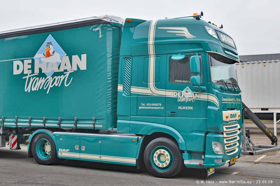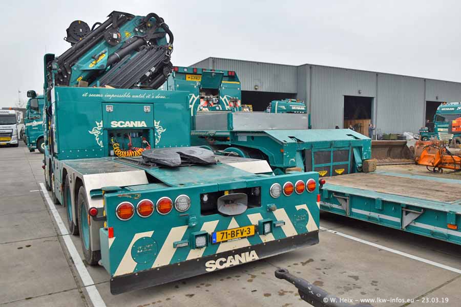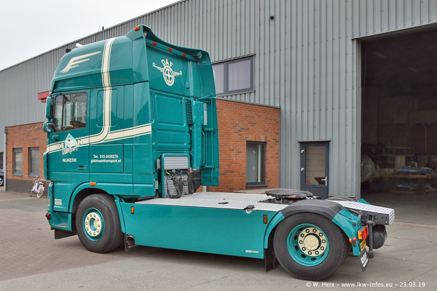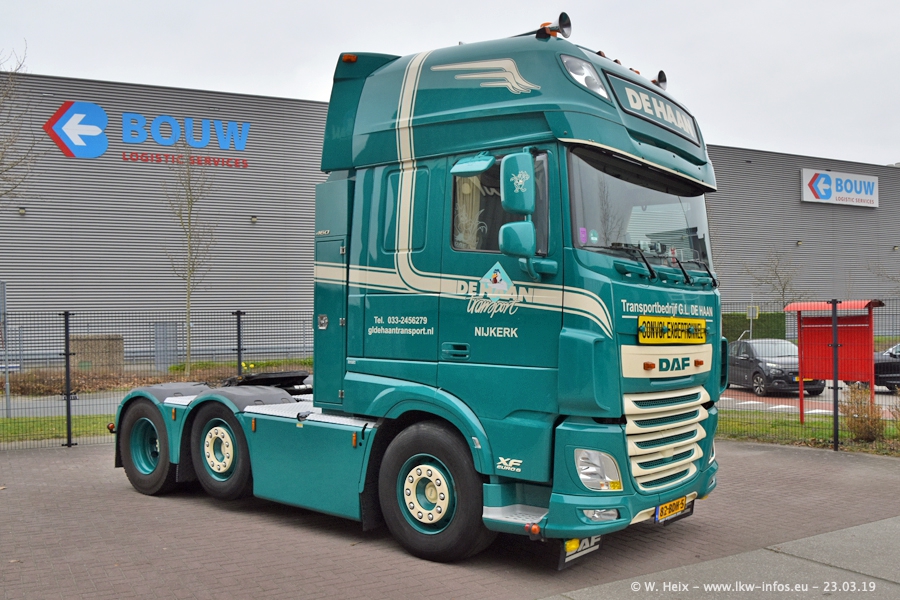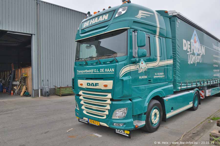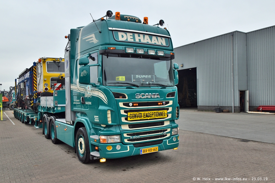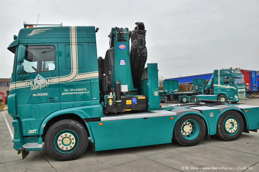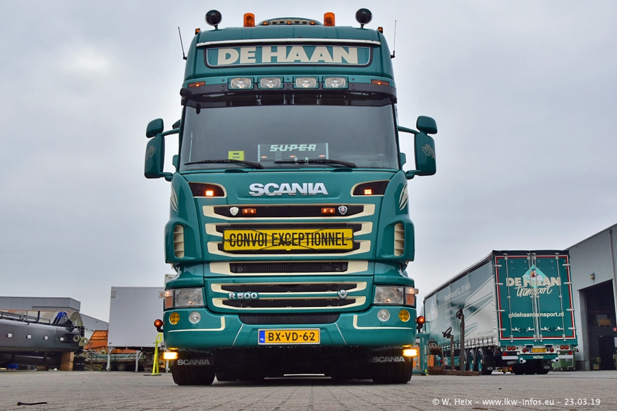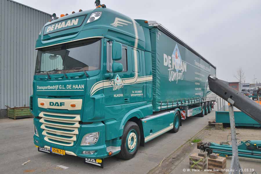 Mein erster Besuch bei der Firma de Haan war im Januar 2016. Inzwischen sind also über 3 Jahre vergangen und es hat sich viel verändert. Gab es 2013 noch einige Fahrzeuge im Design der Firma van Maanen, deren Spezialtansport-Bereich nach der Insolvenz von van Maanen übernommen wurde, sind diese weitgehend raus aus dem Fuhrpark. Einige wenige, wie z.B. der Scania R 500 V8 8x4 wurden damals unlackiert und sind noch vorhanden. Es gibt seit Mitte 2018 die ersten SCANIA R 410 NextGen und viele neue DAF XF Euro 6.