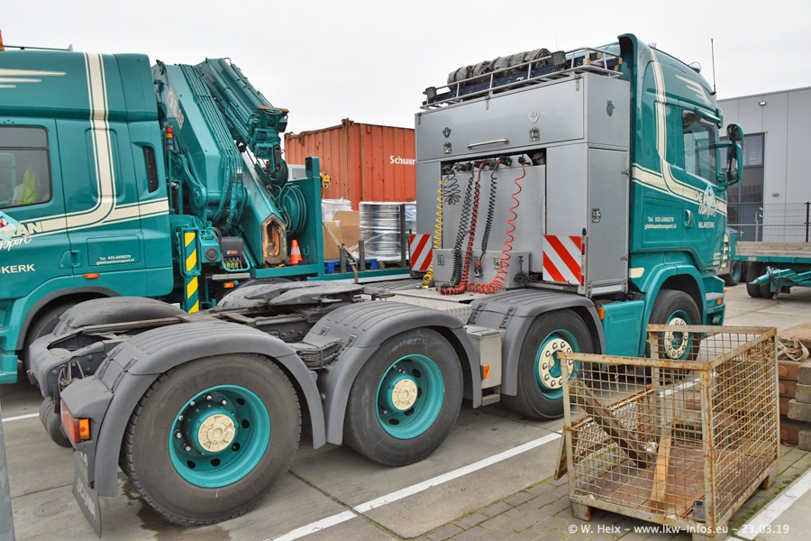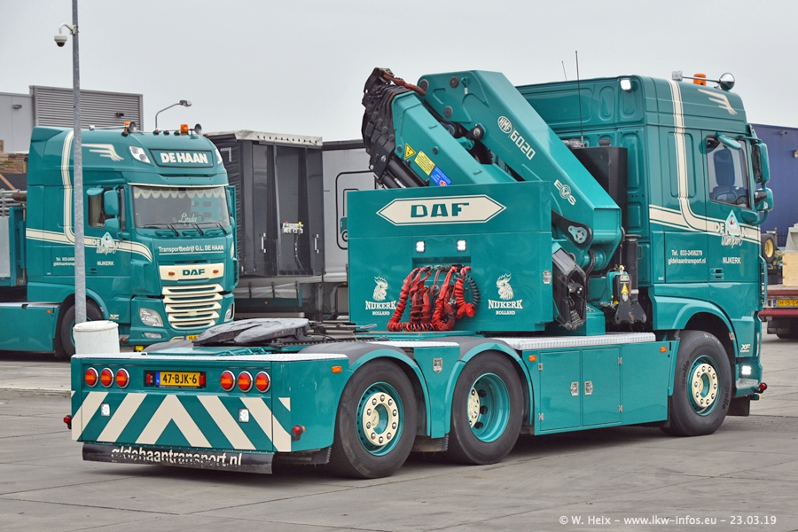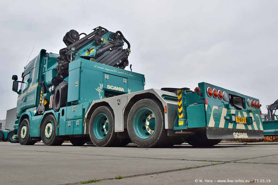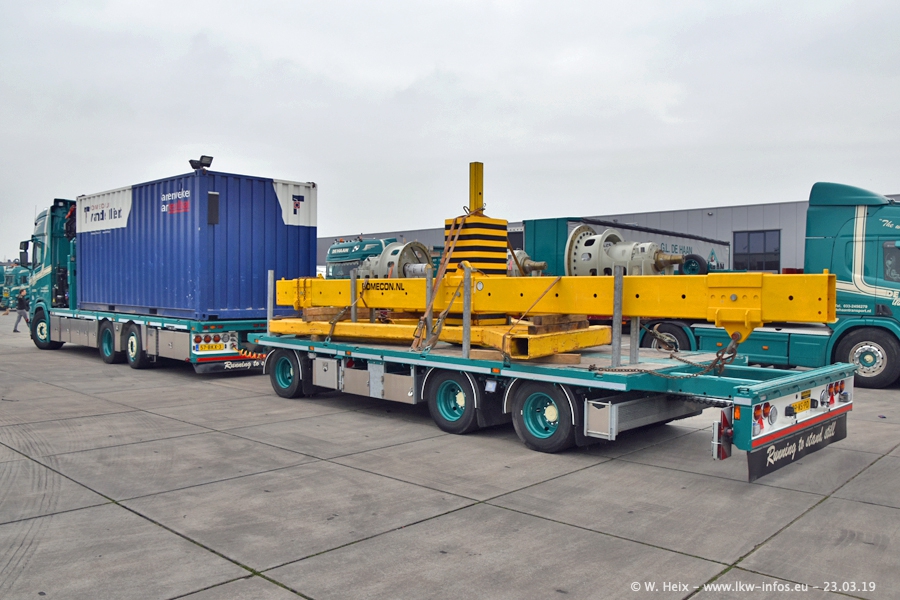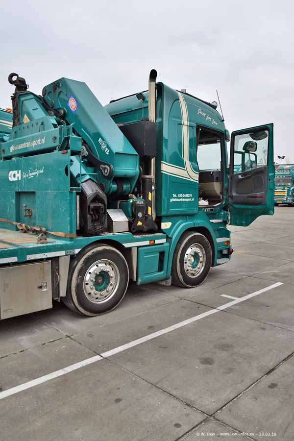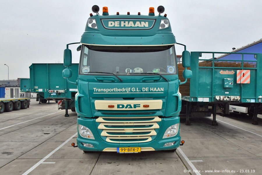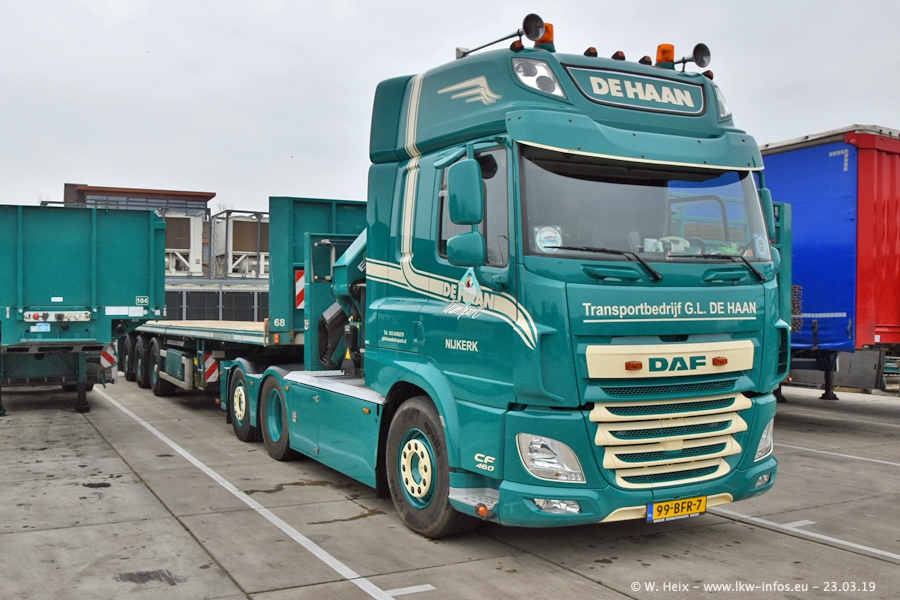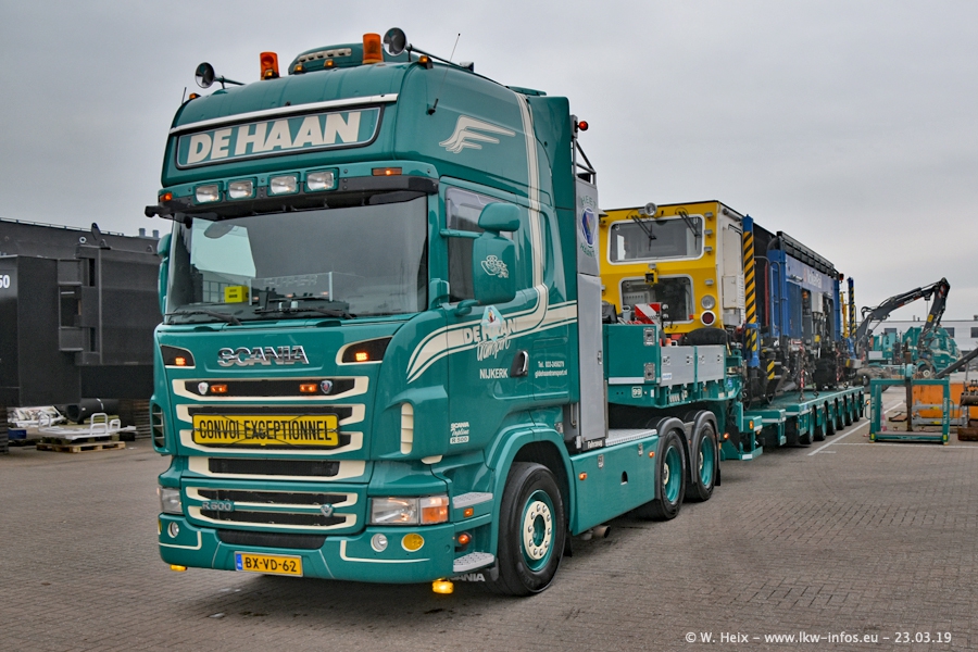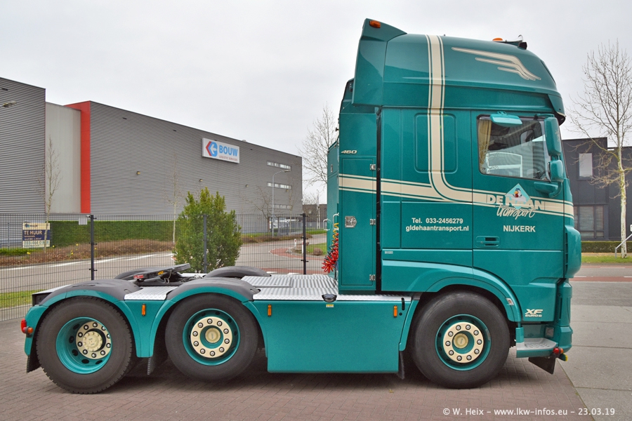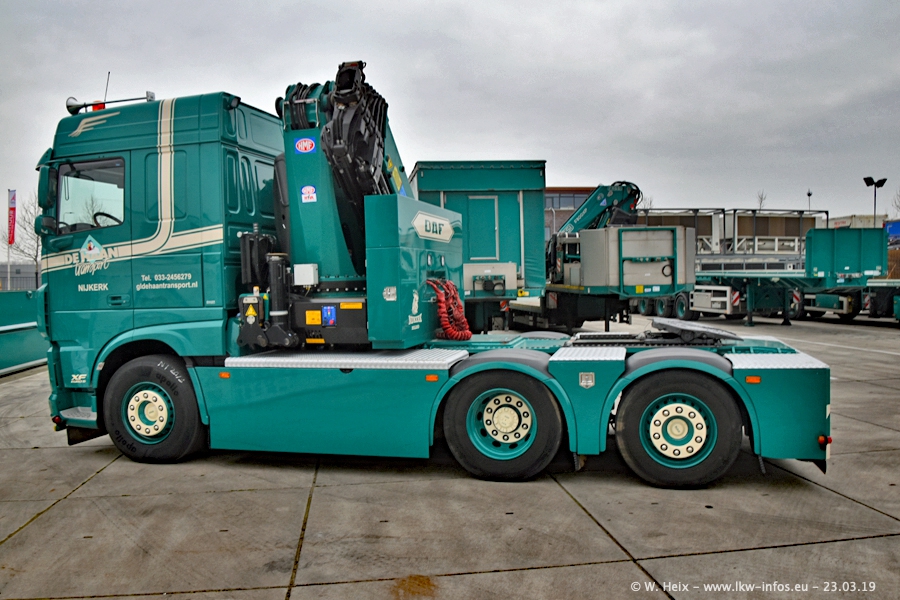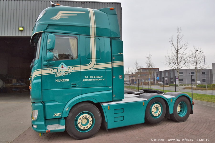 Mein erster Besuch bei der Firma de Haan war im Januar 2016. Inzwischen sind also über 3 Jahre vergangen und es hat sich viel verändert. Gab es 2013 noch einige Fahrzeuge im Design der Firma van Maanen, deren Spezialtansport-Bereich nach der Insolvenz von van Maanen übernommen wurde, sind diese weitgehend raus aus dem Fuhrpark. Einige wenige, wie z.B. der Scania R 500 V8 8x4 wurden damals unlackiert und sind noch vorhanden. Es gibt seit Mitte 2018 die ersten SCANIA R 410 NextGen und viele neue DAF XF Euro 6.
