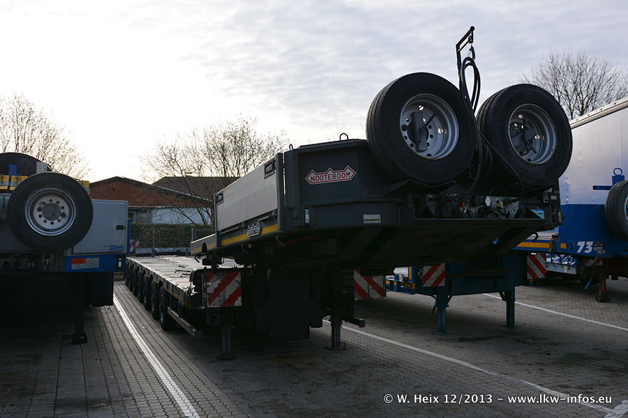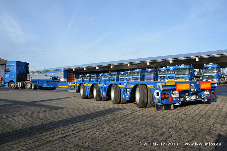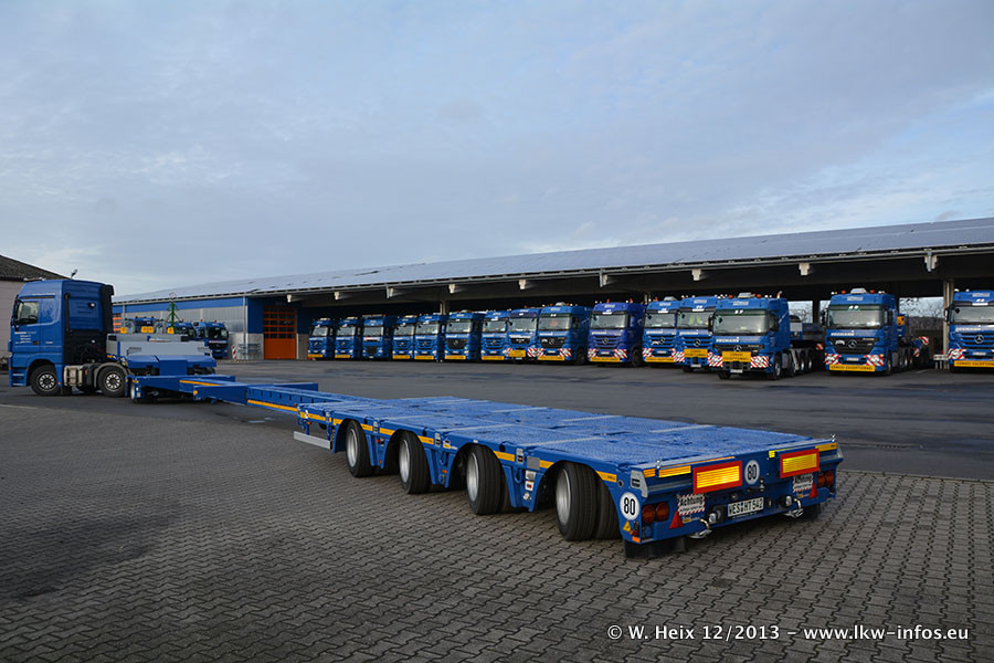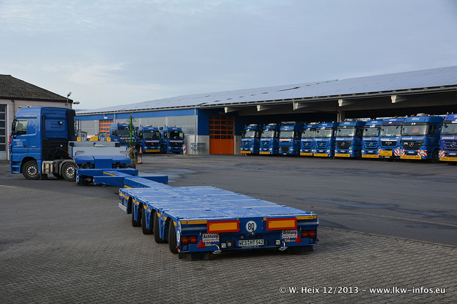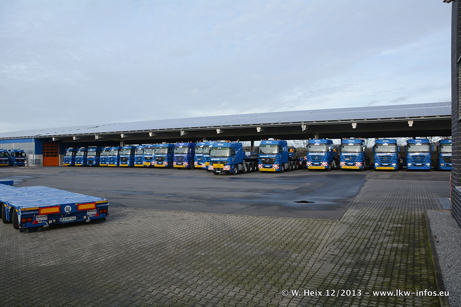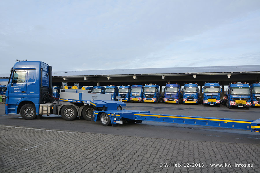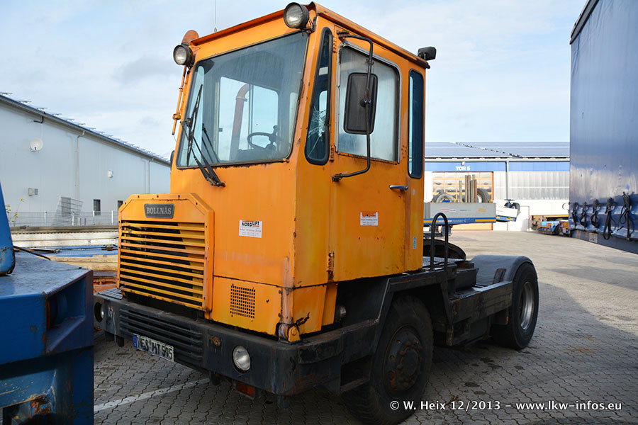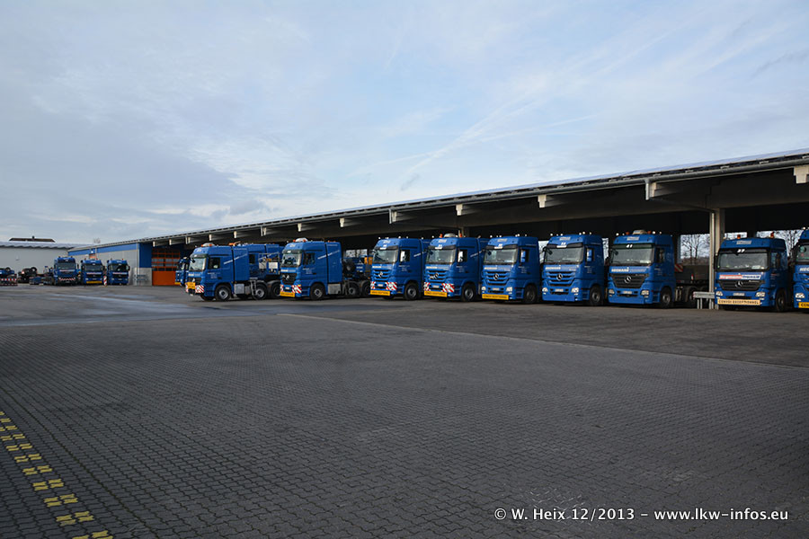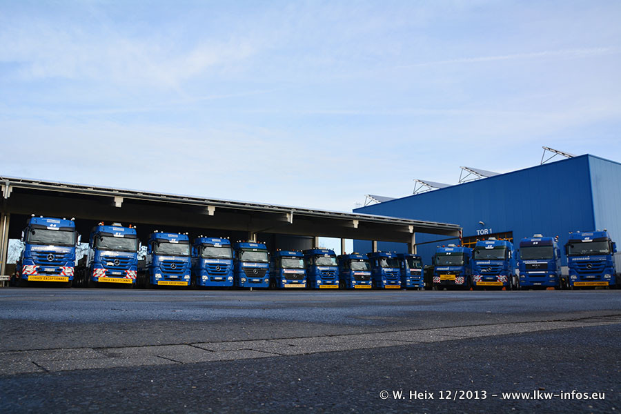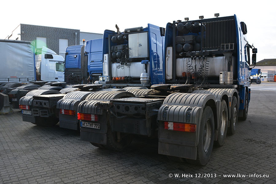 Am 20.12. sind noch zwei neue Auflieger von Doll aus der Panther-Baureihe gekommen. Allerdings konnte ich nur einen davon fotografieren, da der andere in einer der Hallen stand. Die Bilder zeigen den fast kompletten Fuhrpark, der inzwischen aus 34 Zugmaschinen besteht. Lediglich ein LKW war in der Werkstatt und nicht auf dem Hof. Neu ist auch die gebraucht gekaufte Zugmaschine von Bollnäs inkl. einiger Schwerlastanhänger. Das Fahrzeug, das sonst nur in Häfen oder großen Industriebetrieben zu finden ist, wird für interne Transporte auf dem Firmenhof gebraucht. Der weiße MB Actros MP2 1941 wird auch erstmals gezeigt. Diese gebraucht gekaufte Zugmaschine ist seit über einem Jahr im Fuhrpark aber normalerweise eben nie auf dem Hof. Der zuletzt gekaufte MB Actros 3 4160 SLT ist inzwischen angemeldet und trägt jetzt die Nr. 44. Der MAN TGA 41.530 mit der Nr. 35 bleibt im Fuhrpark. Dieser sollte eigentlich durch den neuen Actros SLT ersetzt werden.