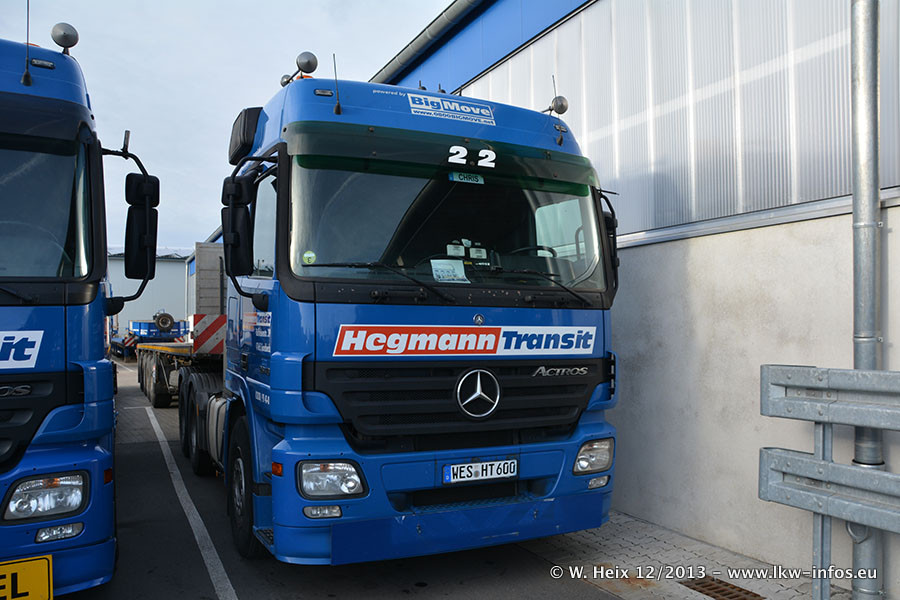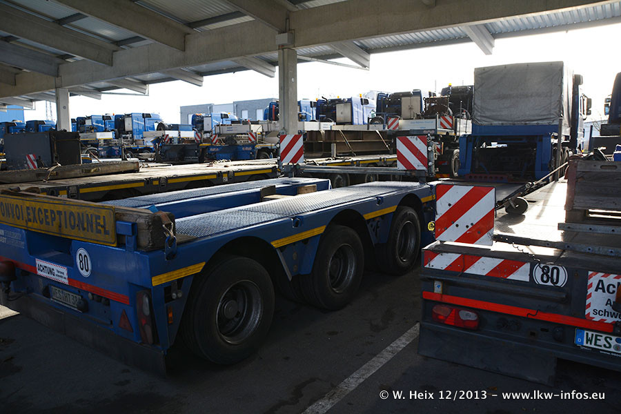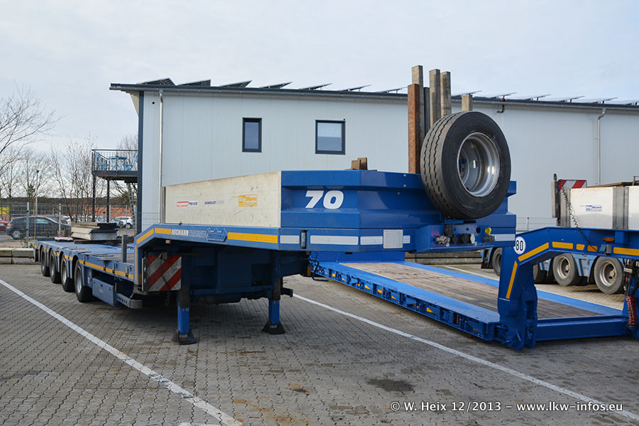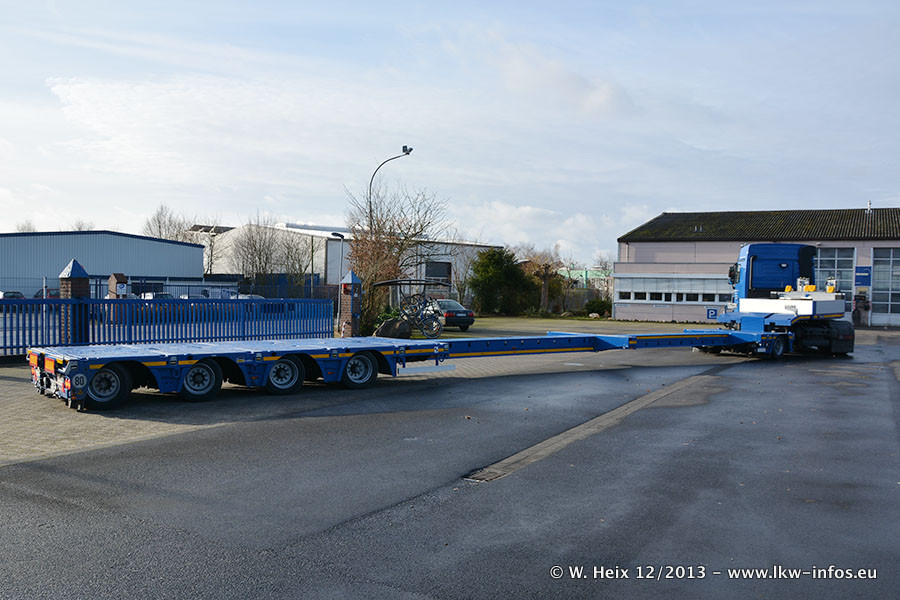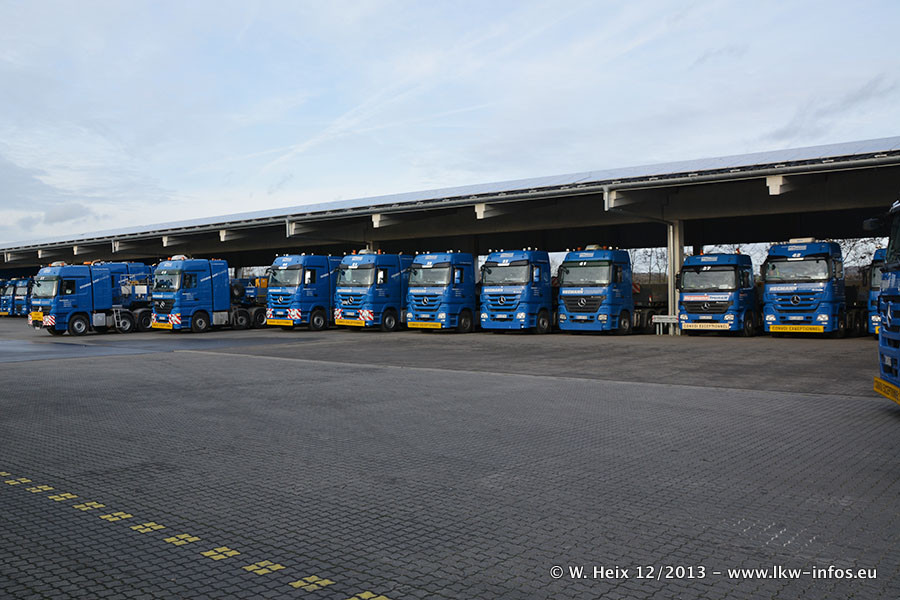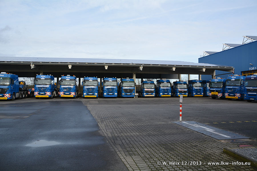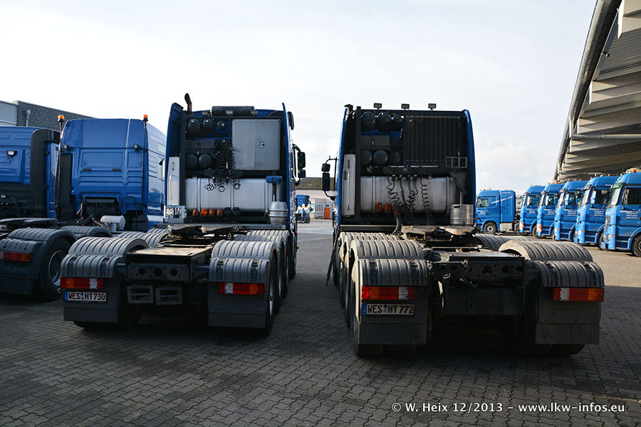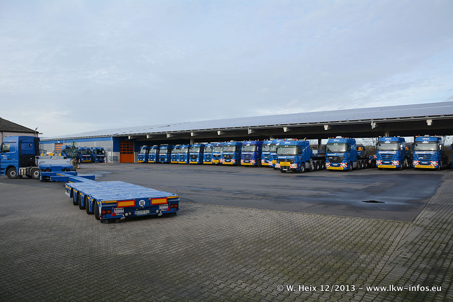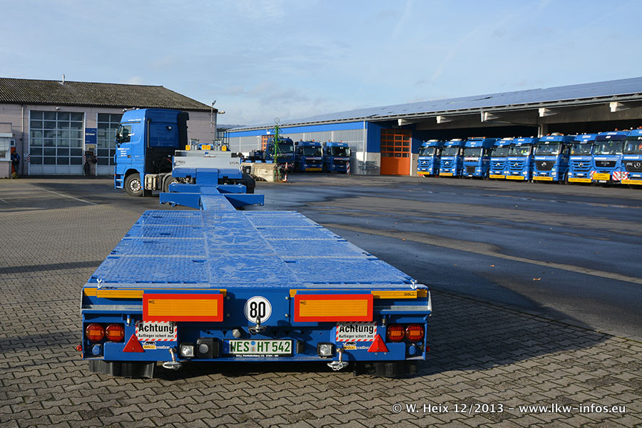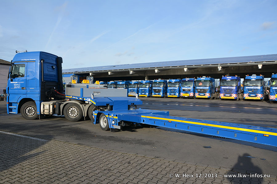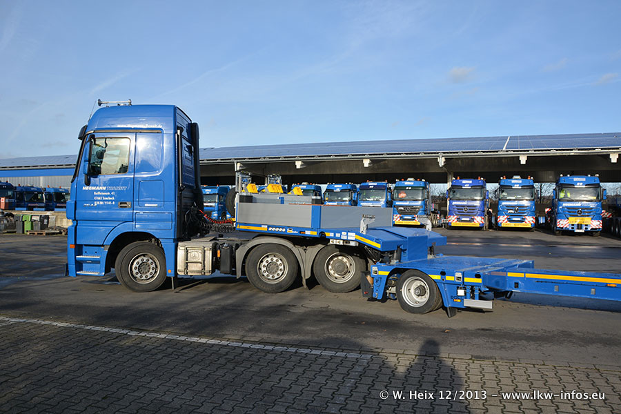 Am 20.12. sind noch zwei neue Auflieger von Doll aus der Panther-Baureihe gekommen. Allerdings konnte ich nur einen davon fotografieren, da der andere in einer der Hallen stand. Die Bilder zeigen den fast kompletten Fuhrpark, der inzwischen aus 34 Zugmaschinen besteht. Lediglich ein LKW war in der Werkstatt und nicht auf dem Hof. Neu ist auch die gebraucht gekaufte Zugmaschine von Bollnäs inkl. einiger Schwerlastanhänger. Das Fahrzeug, das sonst nur in Häfen oder großen Industriebetrieben zu finden ist, wird für interne Transporte auf dem Firmenhof gebraucht. Der weiße MB Actros MP2 1941 wird auch erstmals gezeigt. Diese gebraucht gekaufte Zugmaschine ist seit über einem Jahr im Fuhrpark aber normalerweise eben nie auf dem Hof. Der zuletzt gekaufte MB Actros 3 4160 SLT ist inzwischen angemeldet und trägt jetzt die Nr. 44. Der MAN TGA 41.530 mit der Nr. 35 bleibt im Fuhrpark. Dieser sollte eigentlich durch den neuen Actros SLT ersetzt werden.
