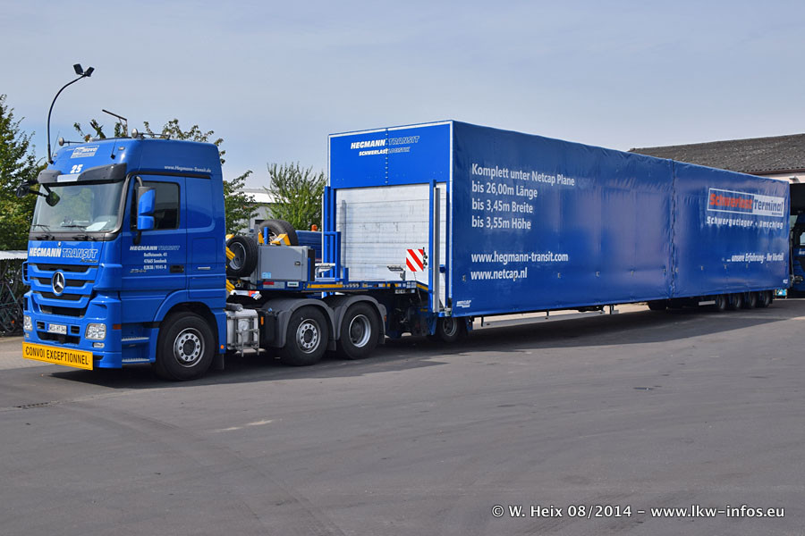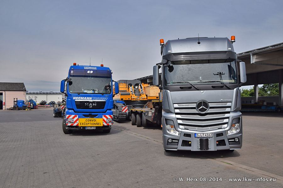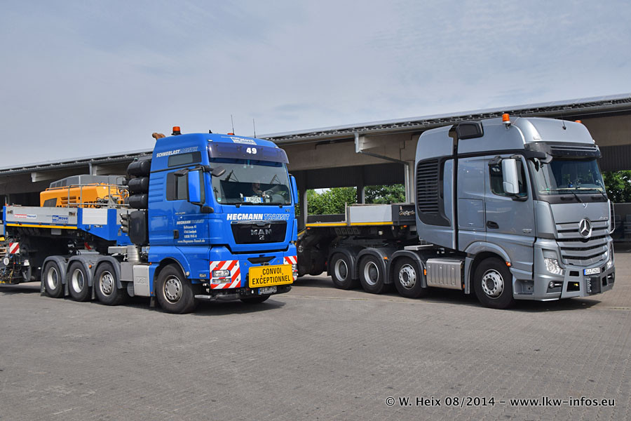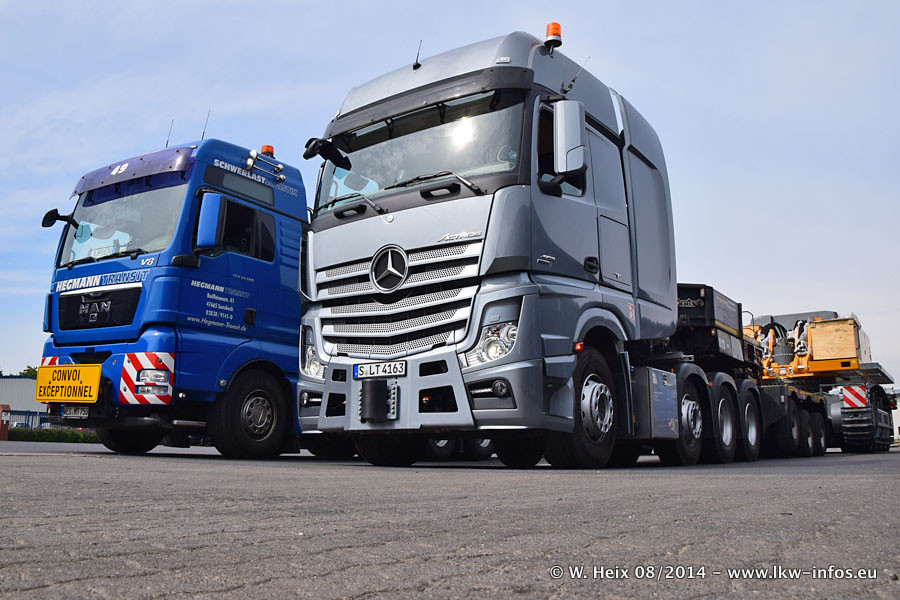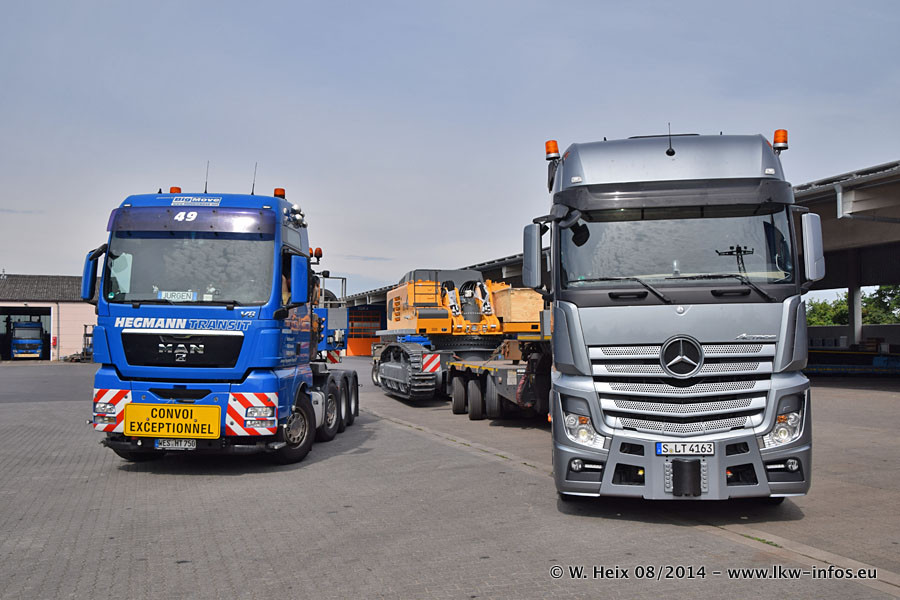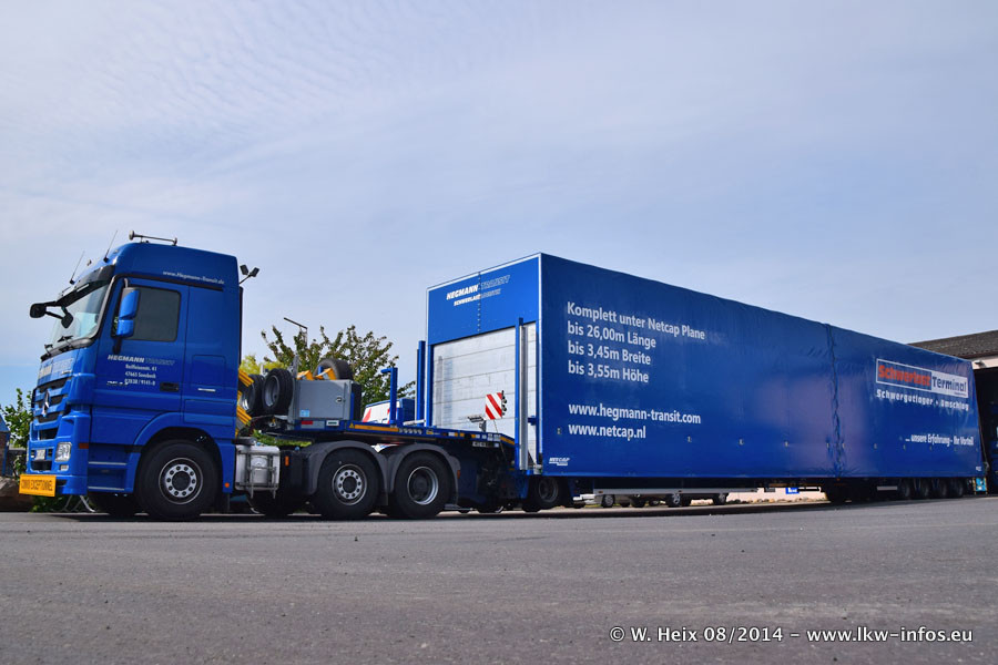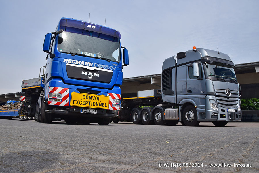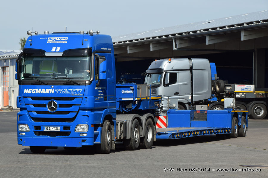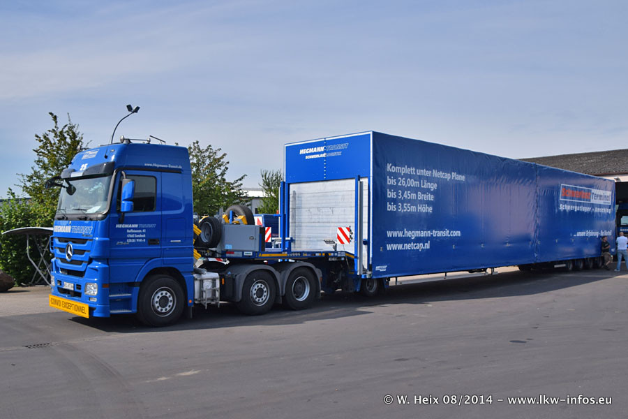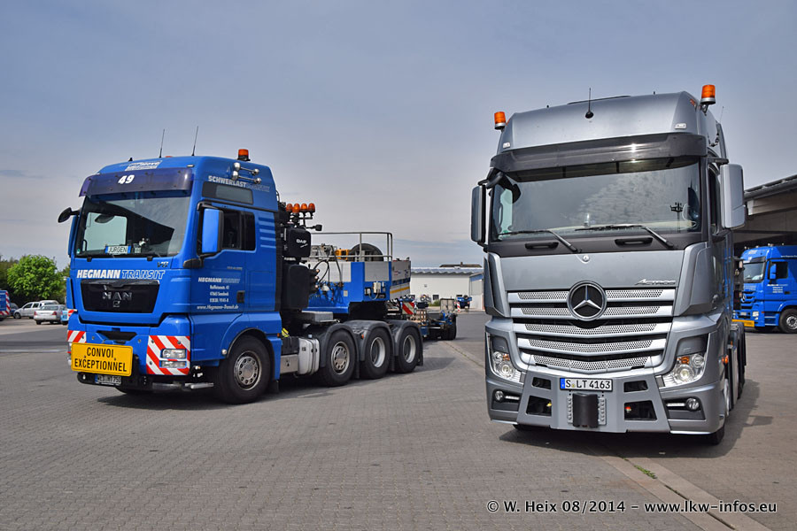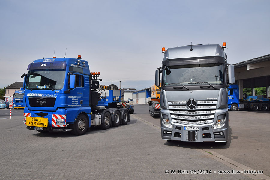 Da Hegmann Transit den neuen Mercedes-Benz Actros 4163 SLT zum Testen auf dem Hof stehen hatte, ergab sich spontan während der Woche ein kleines Fotoshooting. Zum Vergleich hatten wir auch mal den MAN TGX 41.680 von Hegmann Transit daneben gestellt. Bisher gibt es nur diesen einen 4163 SLT, der zur Zeit den interessierten Schwerlastfirmen nach und nach zum Testen zur Verfügung gestellt wird. Entsprechend umfangreich ist auch meine Bilderserie. Neu im Fuhrpark ist auch ein Planenauflieger auf Basis eines Semi-Tiefladers von Doll (Panther-Baureihe), mit dem Waggons unter Plane transportiert werden sollen. Der Auflieger war gerade fertig beschriftet und wird erst noch eine Testfahrt machen, bevor der zum Einsatz kommt.