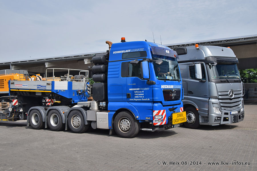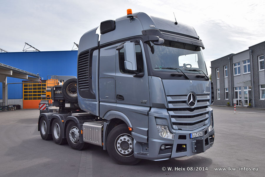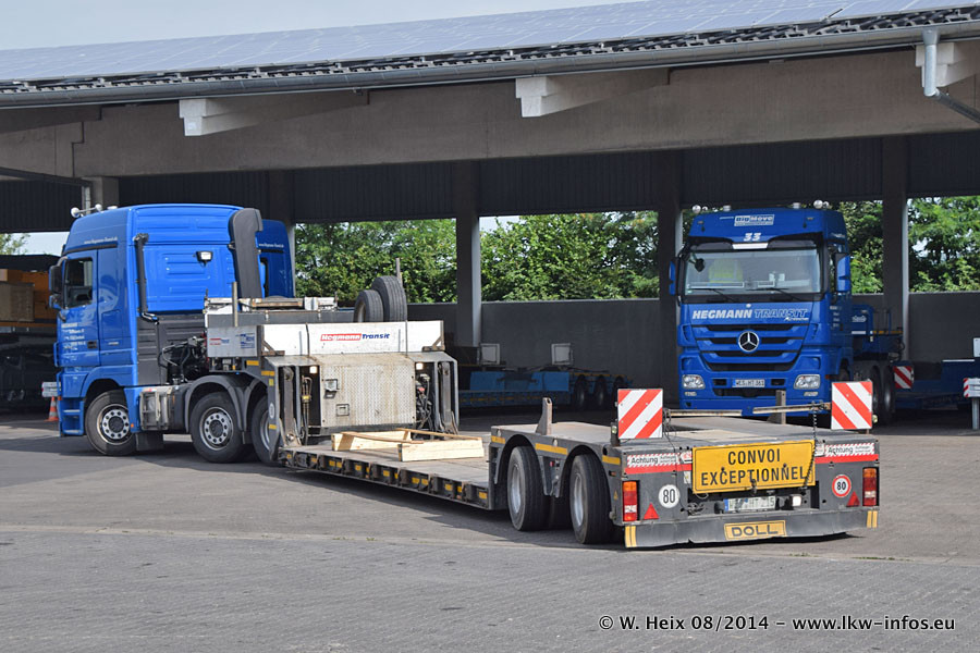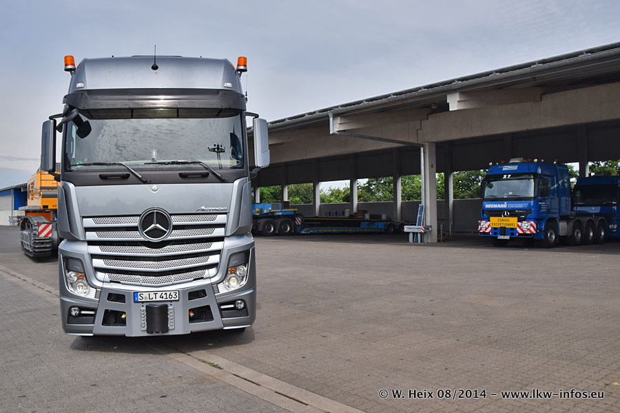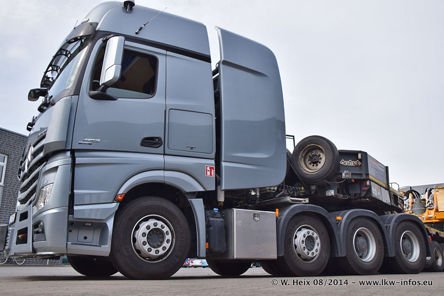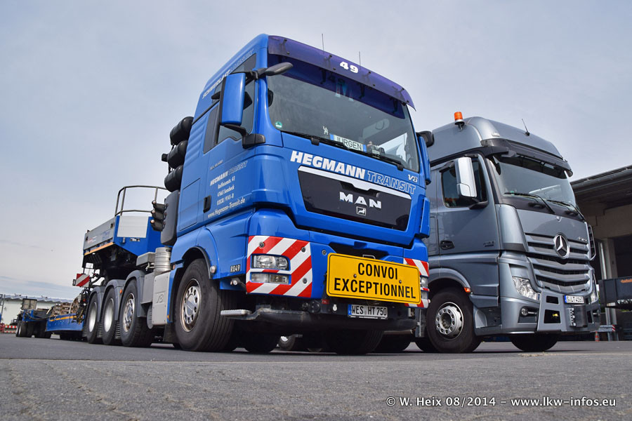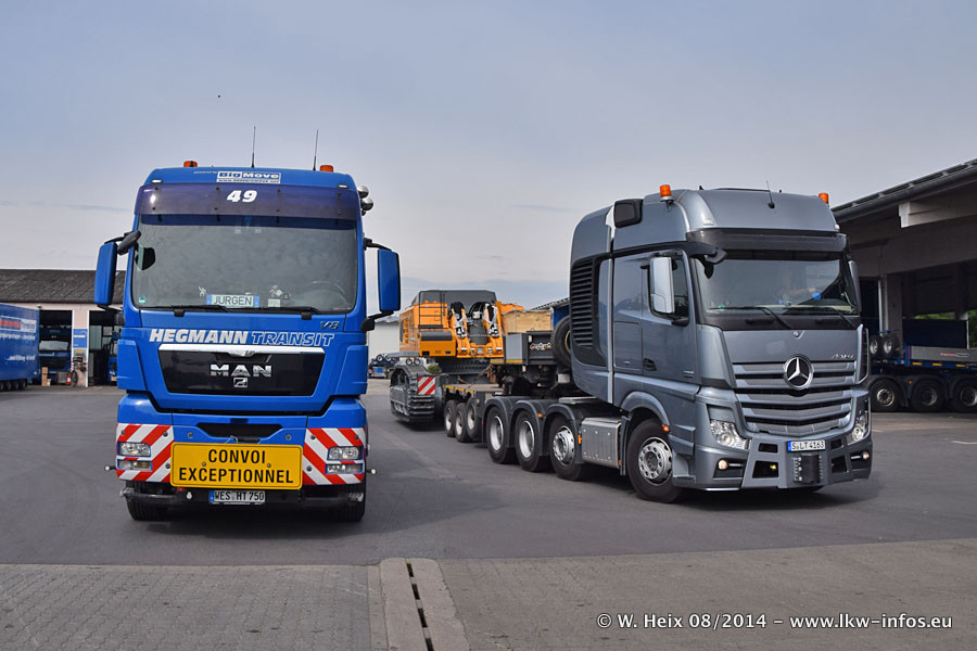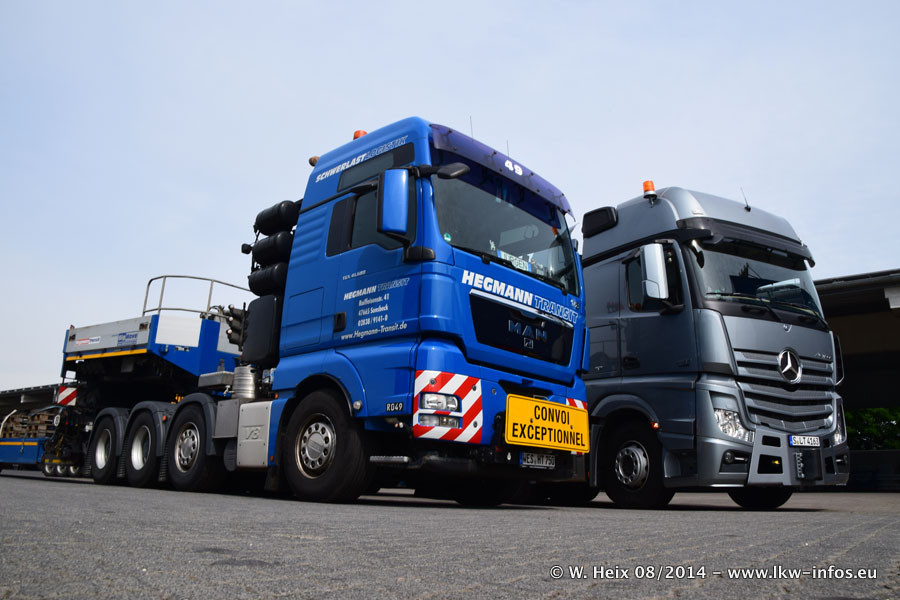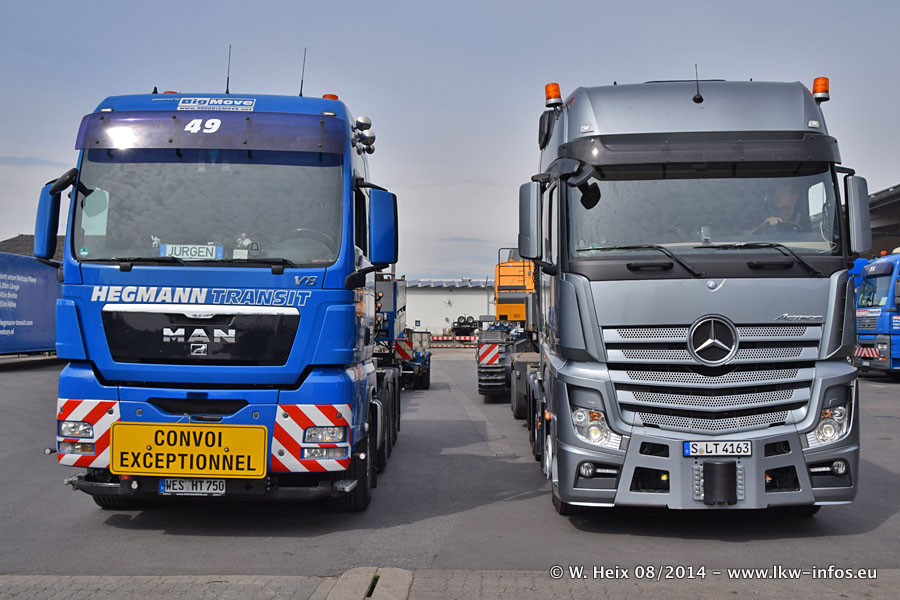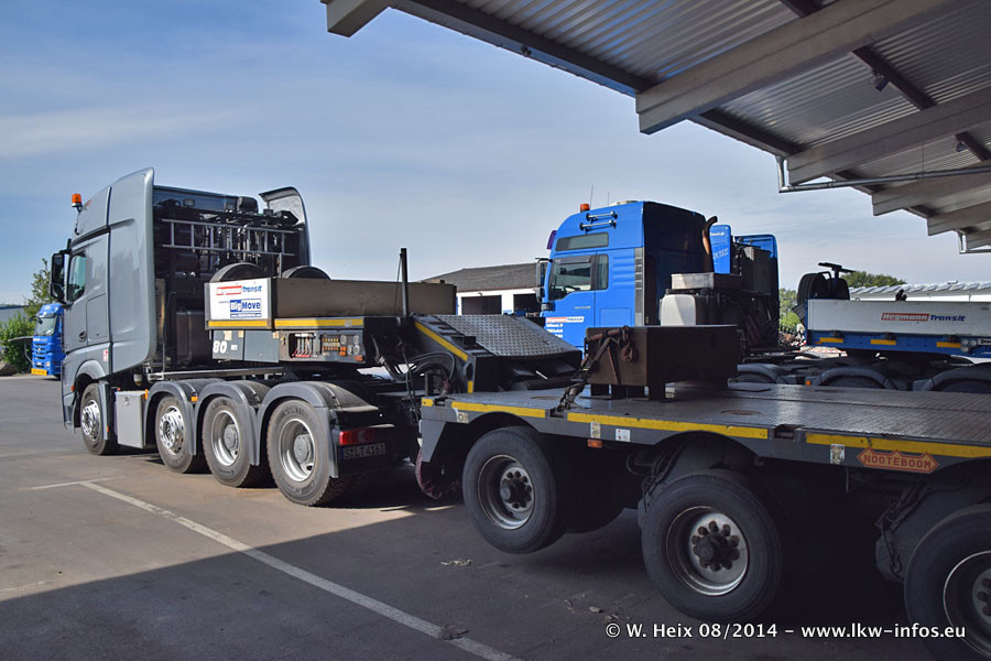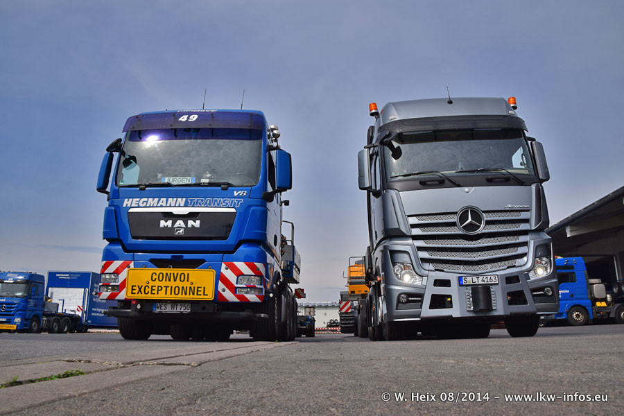 Da Hegmann Transit den neuen Mercedes-Benz Actros 4163 SLT zum Testen auf dem Hof stehen hatte, ergab sich spontan während der Woche ein kleines Fotoshooting. Zum Vergleich hatten wir auch mal den MAN TGX 41.680 von Hegmann Transit daneben gestellt. Bisher gibt es nur diesen einen 4163 SLT, der zur Zeit den interessierten Schwerlastfirmen nach und nach zum Testen zur Verfügung gestellt wird. Entsprechend umfangreich ist auch meine Bilderserie. Neu im Fuhrpark ist auch ein Planenauflieger auf Basis eines Semi-Tiefladers von Doll (Panther-Baureihe), mit dem Waggons unter Plane transportiert werden sollen. Der Auflieger war gerade fertig beschriftet und wird erst noch eine Testfahrt machen, bevor der zum Einsatz kommt.