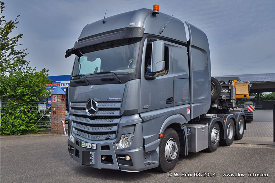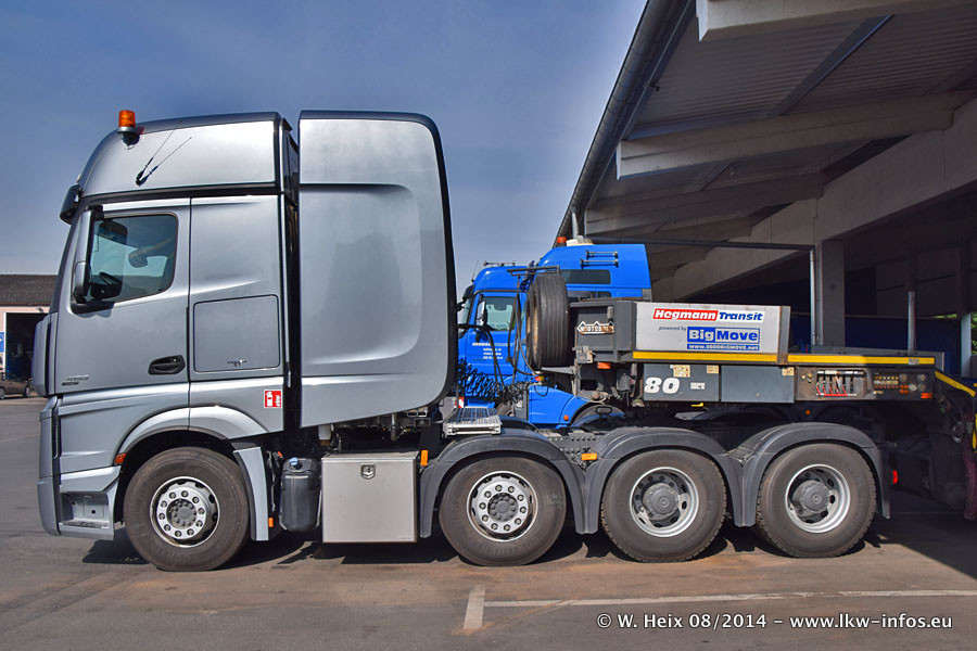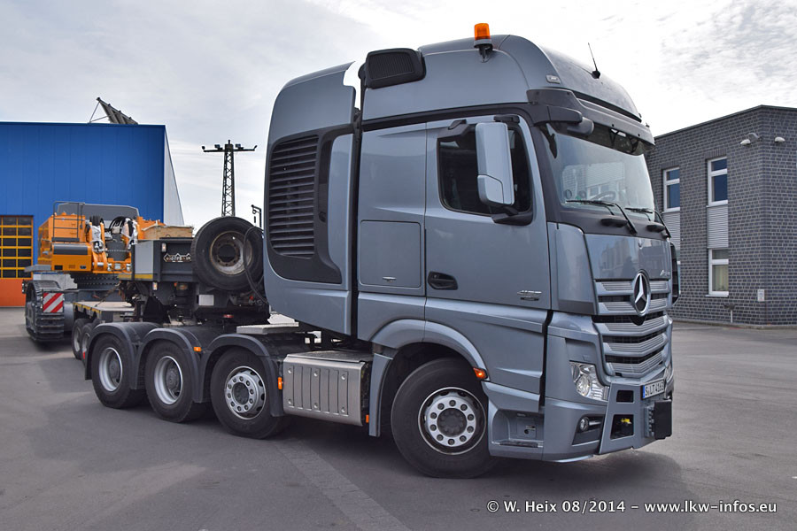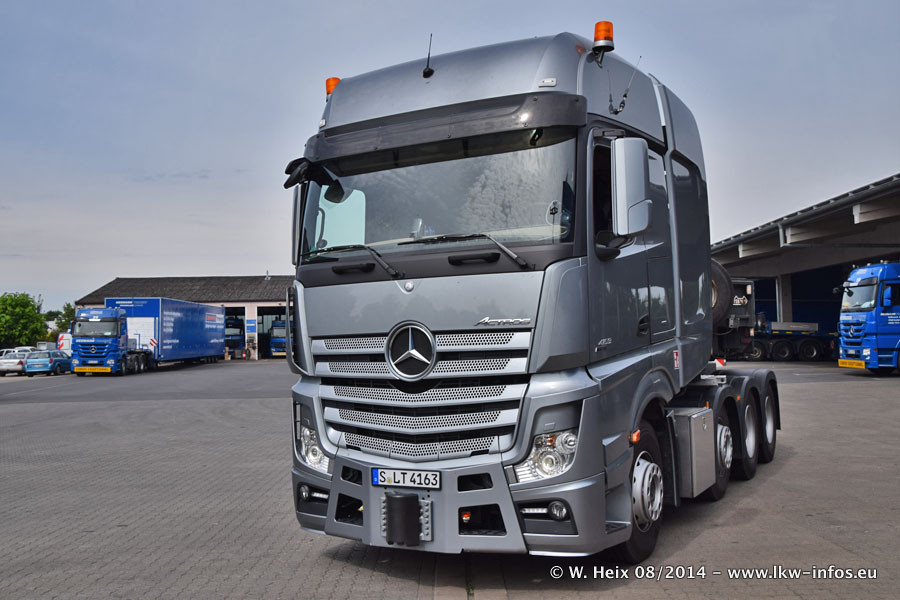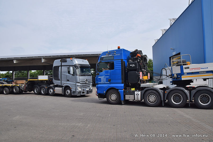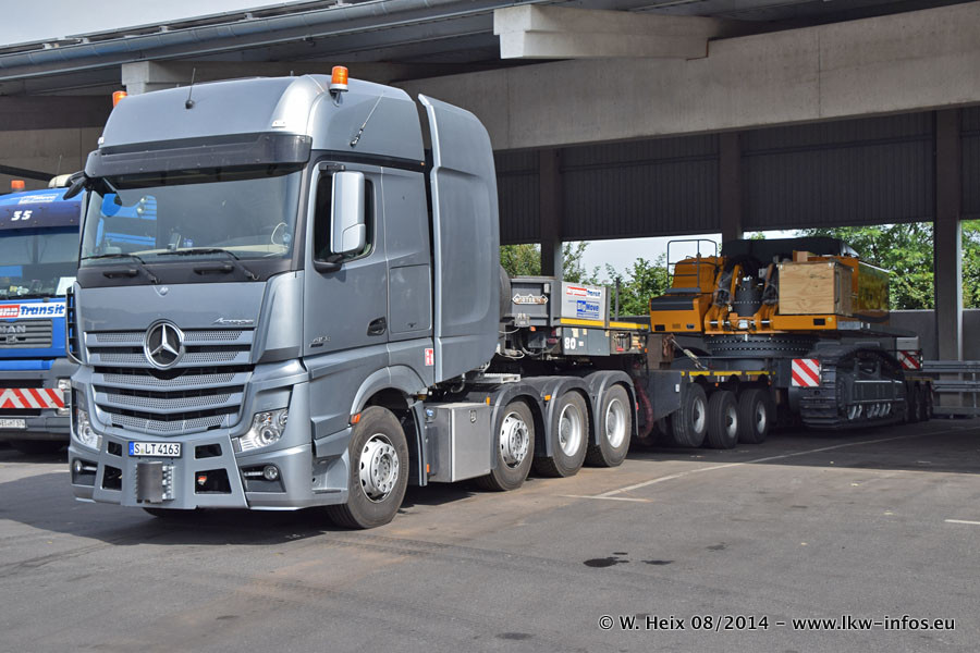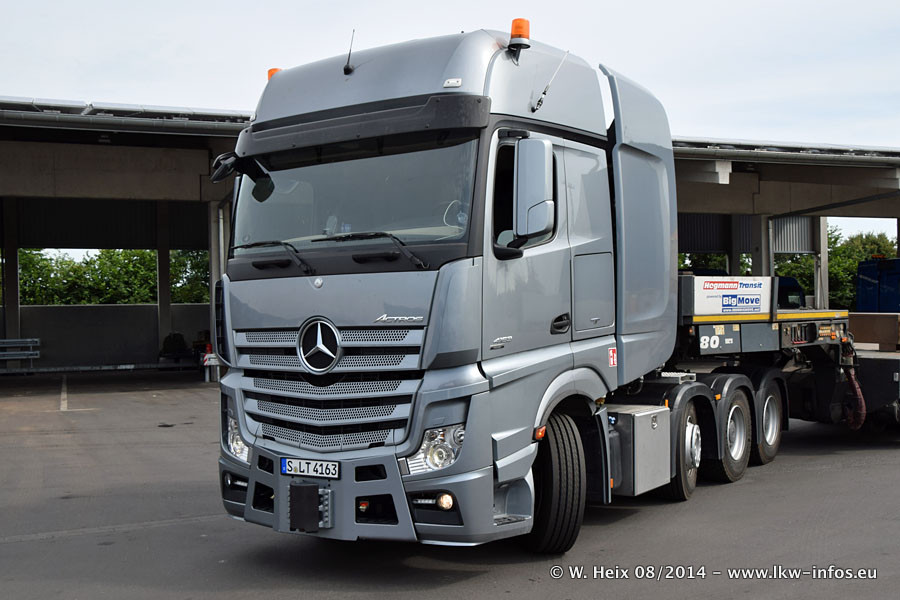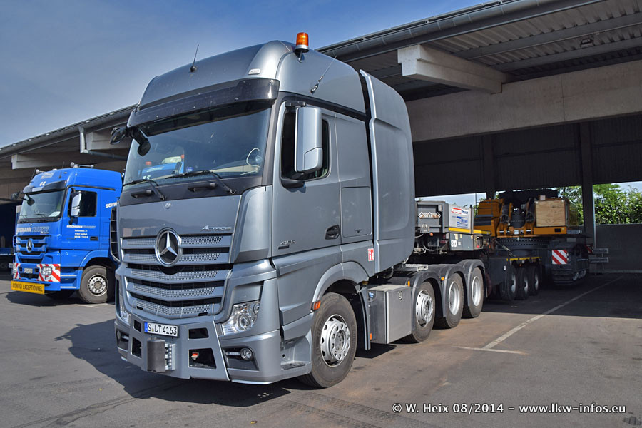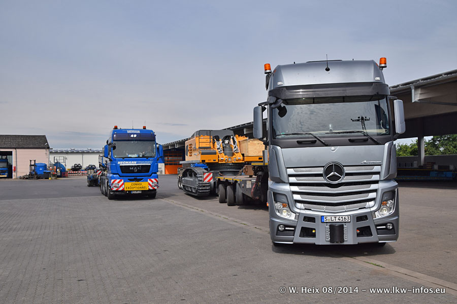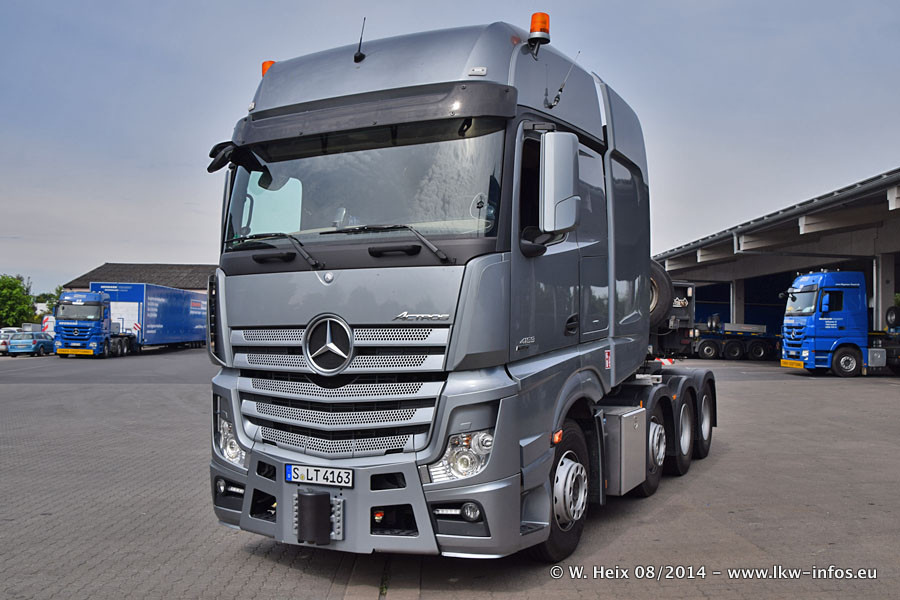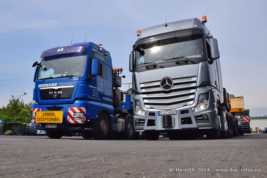 Da Hegmann Transit den neuen Mercedes-Benz Actros 4163 SLT zum Testen auf dem Hof stehen hatte, ergab sich spontan während der Woche ein kleines Fotoshooting. Zum Vergleich hatten wir auch mal den MAN TGX 41.680 von Hegmann Transit daneben gestellt. Bisher gibt es nur diesen einen 4163 SLT, der zur Zeit den interessierten Schwerlastfirmen nach und nach zum Testen zur Verfügung gestellt wird. Entsprechend umfangreich ist auch meine Bilderserie. Neu im Fuhrpark ist auch ein Planenauflieger auf Basis eines Semi-Tiefladers von Doll (Panther-Baureihe), mit dem Waggons unter Plane transportiert werden sollen. Der Auflieger war gerade fertig beschriftet und wird erst noch eine Testfahrt machen, bevor der zum Einsatz kommt.