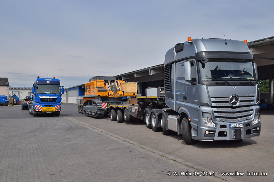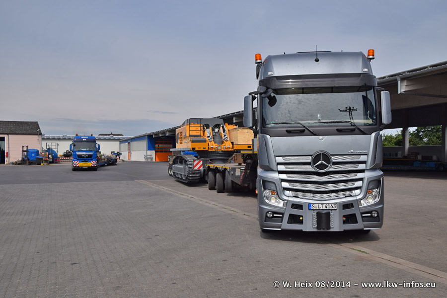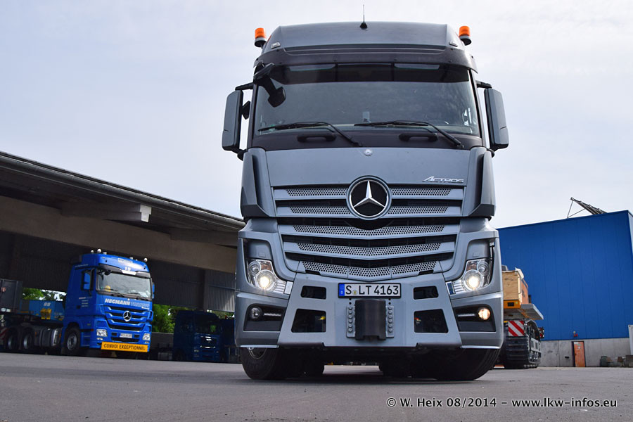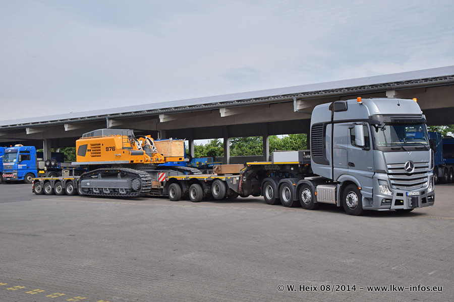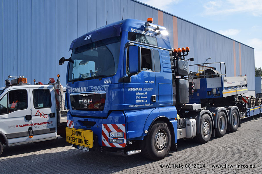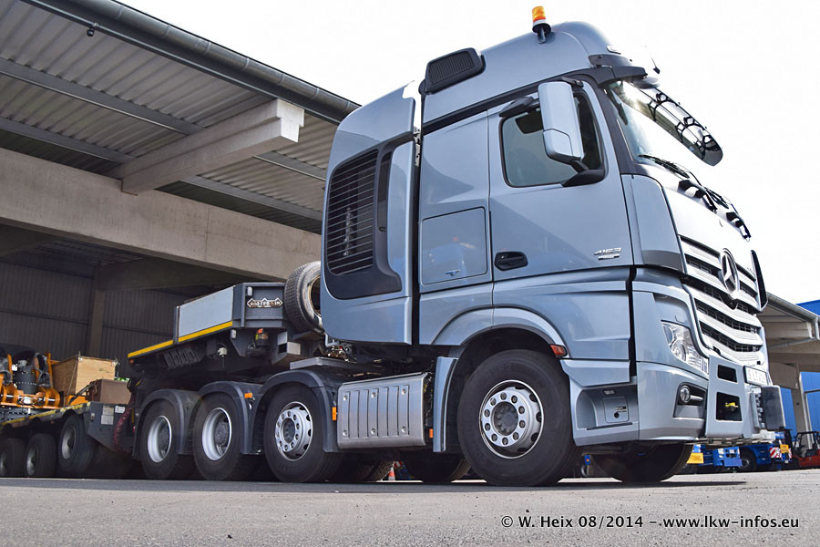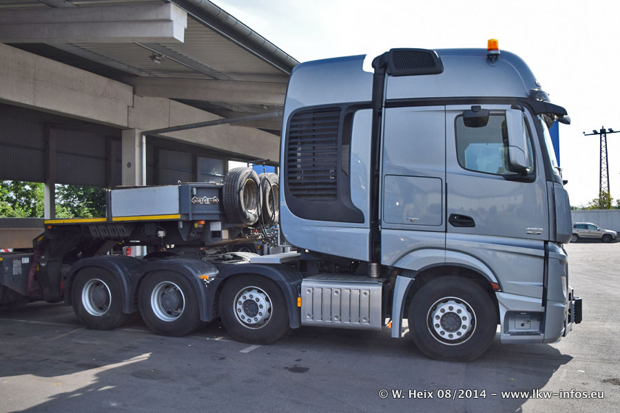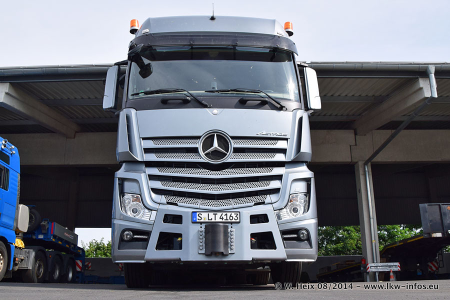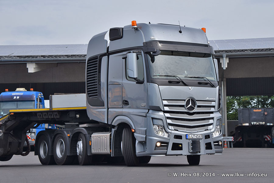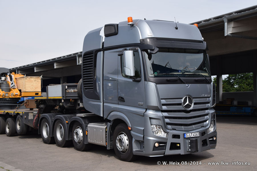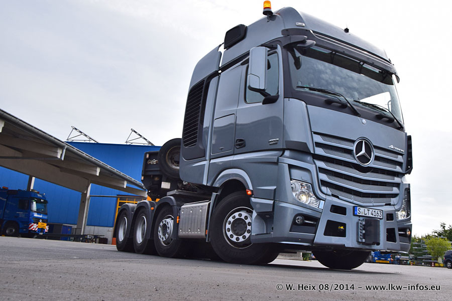 Da Hegmann Transit den neuen Mercedes-Benz Actros 4163 SLT zum Testen auf dem Hof stehen hatte, ergab sich spontan während der Woche ein kleines Fotoshooting. Zum Vergleich hatten wir auch mal den MAN TGX 41.680 von Hegmann Transit daneben gestellt. Bisher gibt es nur diesen einen 4163 SLT, der zur Zeit den interessierten Schwerlastfirmen nach und nach zum Testen zur Verfügung gestellt wird. Entsprechend umfangreich ist auch meine Bilderserie. Neu im Fuhrpark ist auch ein Planenauflieger auf Basis eines Semi-Tiefladers von Doll (Panther-Baureihe), mit dem Waggons unter Plane transportiert werden sollen. Der Auflieger war gerade fertig beschriftet und wird erst noch eine Testfahrt machen, bevor der zum Einsatz kommt.