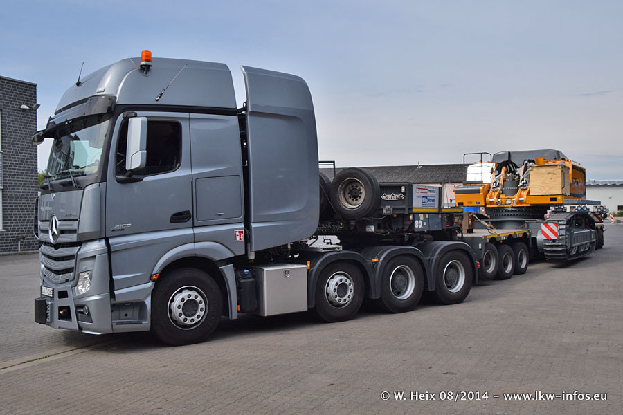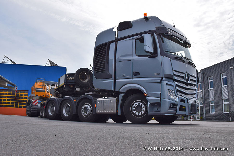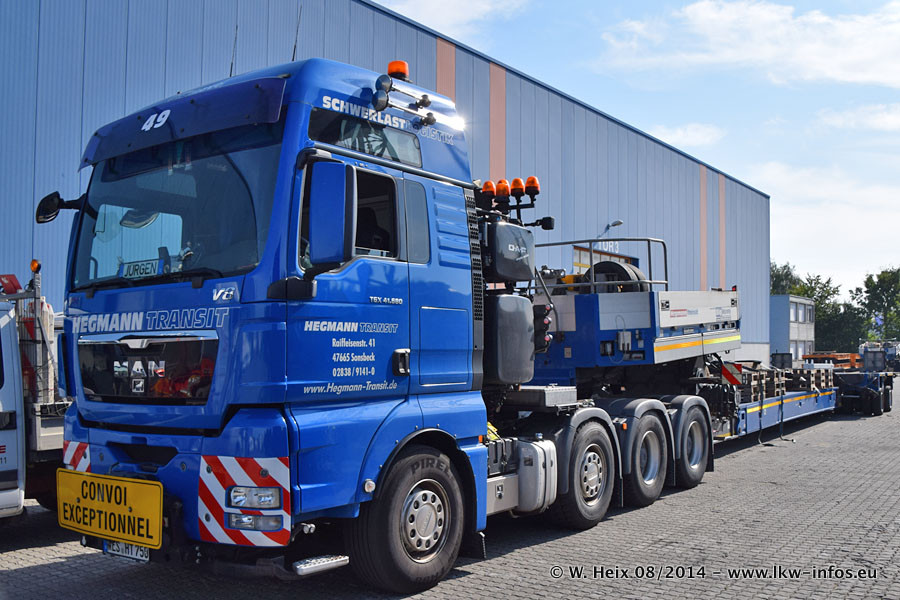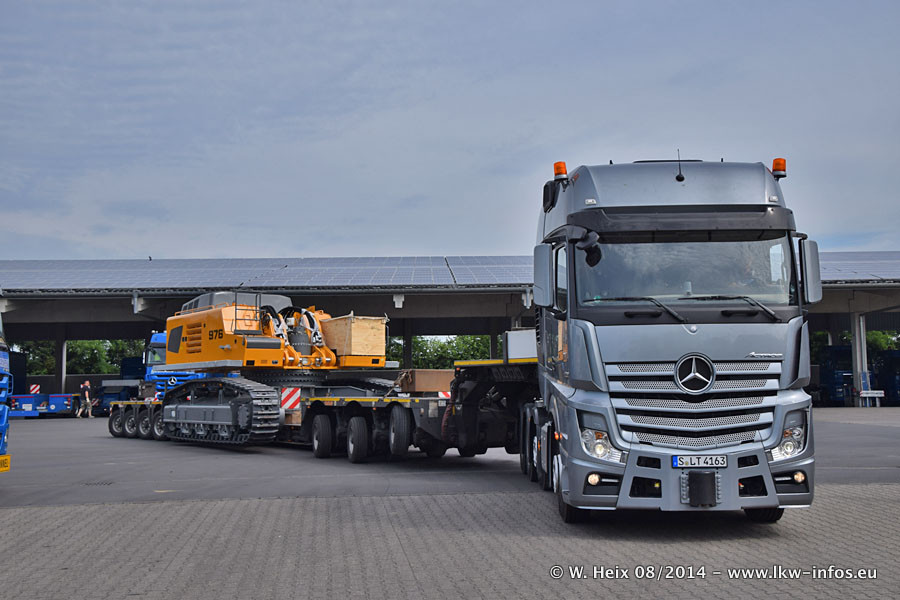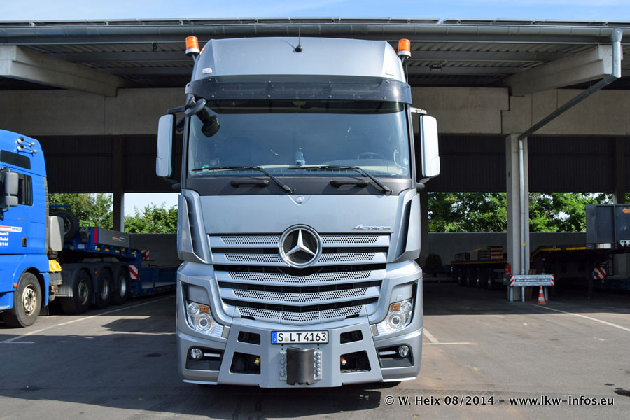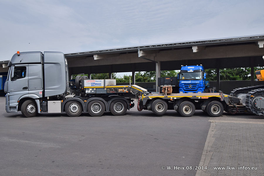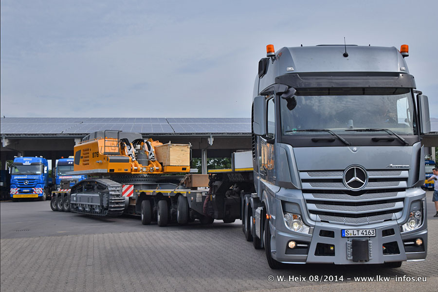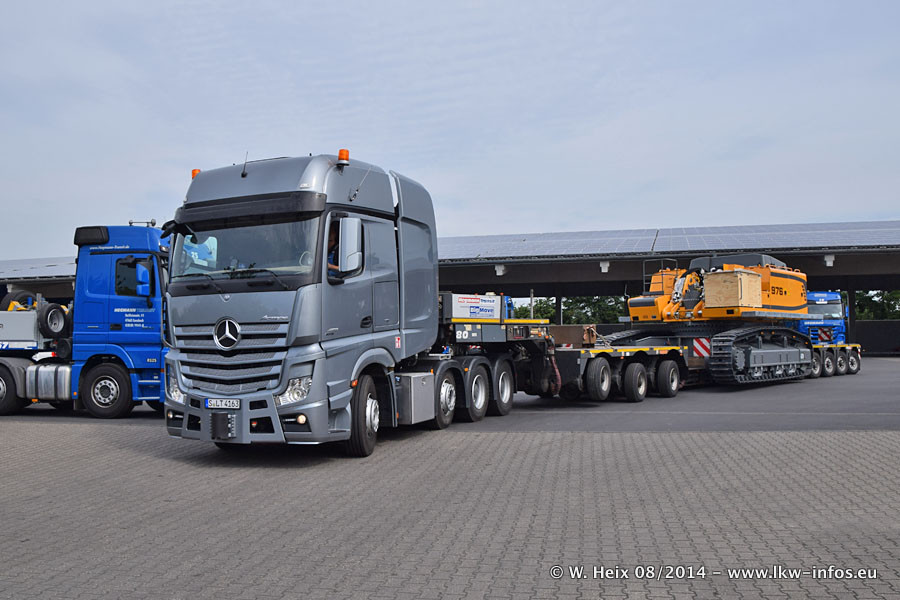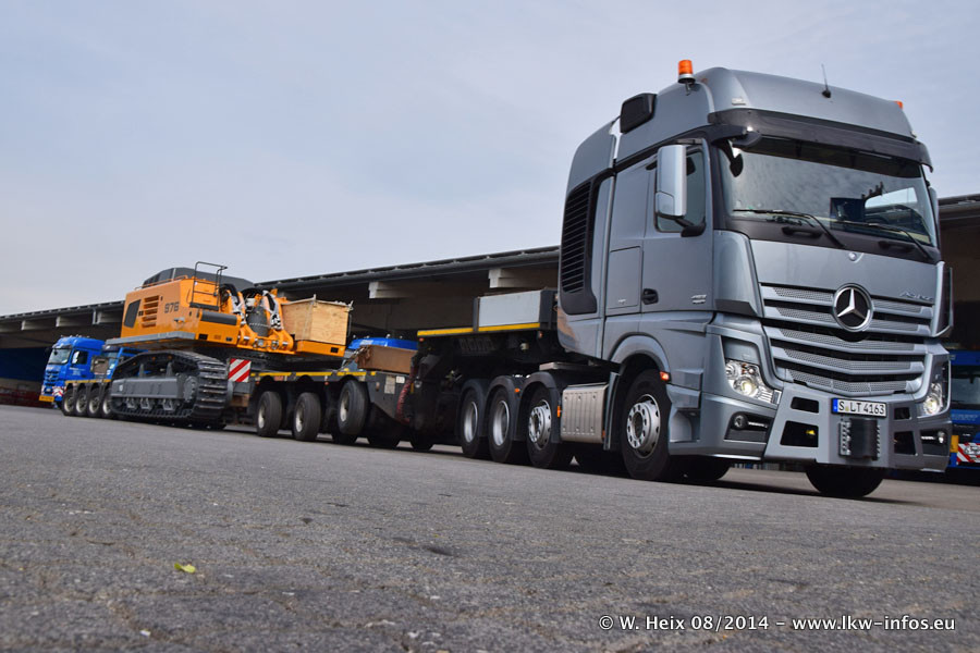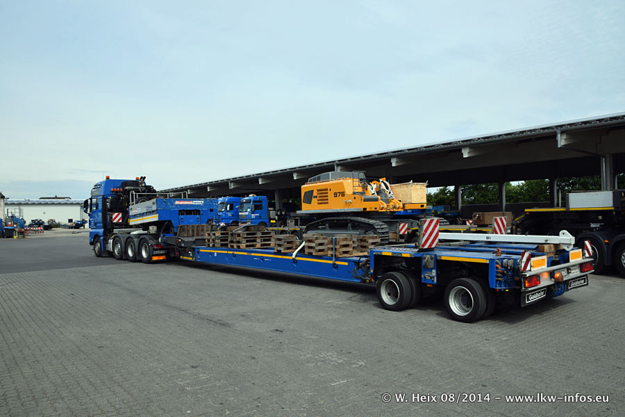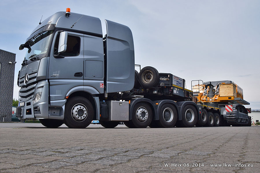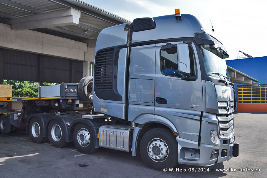Da Hegmann Transit den neuen Mercedes-Benz Actros 4163 SLT zum Testen auf dem Hof stehen hatte, ergab sich spontan während der Woche ein kleines Fotoshooting. Zum Vergleich hatten wir auch mal den MAN TGX 41.680 von Hegmann Transit daneben gestellt. Bisher gibt es nur diesen einen 4163 SLT, der zur Zeit den interessierten Schwerlastfirmen nach und nach zum Testen zur Verfügung gestellt wird. Entsprechend umfangreich ist auch meine Bilderserie. Neu im Fuhrpark ist auch ein Planenauflieger auf Basis eines Semi-Tiefladers von Doll (Panther-Baureihe), mit dem Waggons unter Plane transportiert werden sollen. Der Auflieger war gerade fertig beschriftet und wird erst noch eine Testfahrt machen, bevor der zum Einsatz kommt.