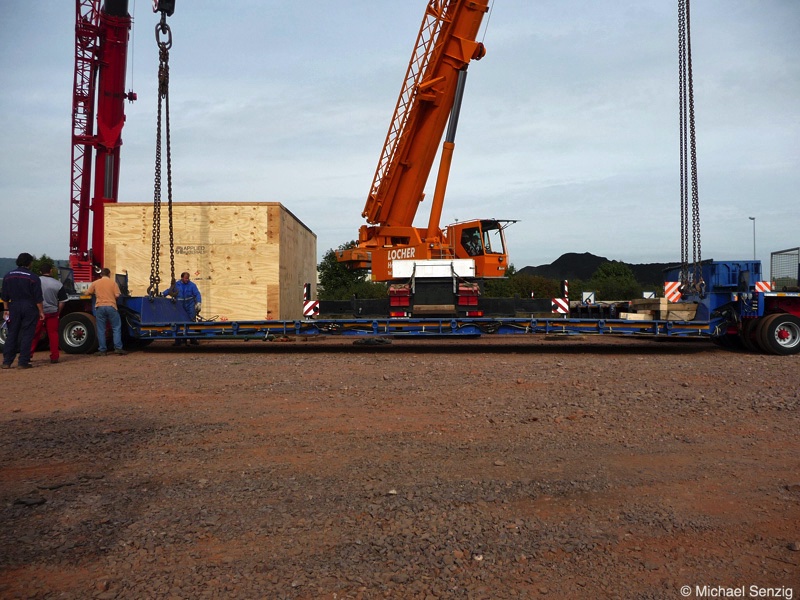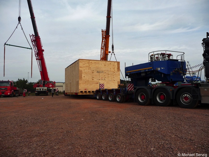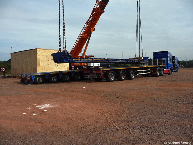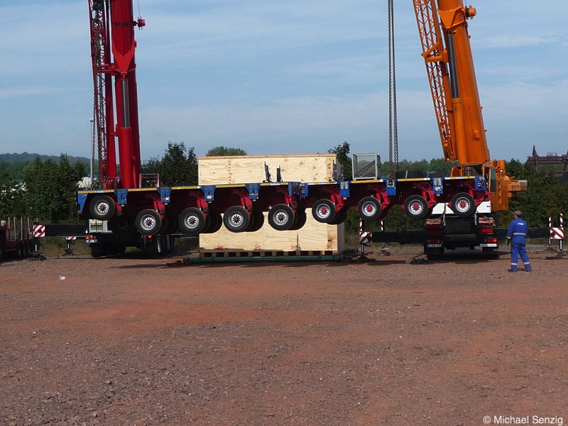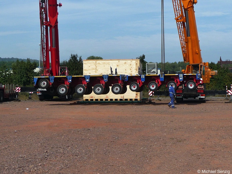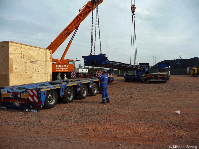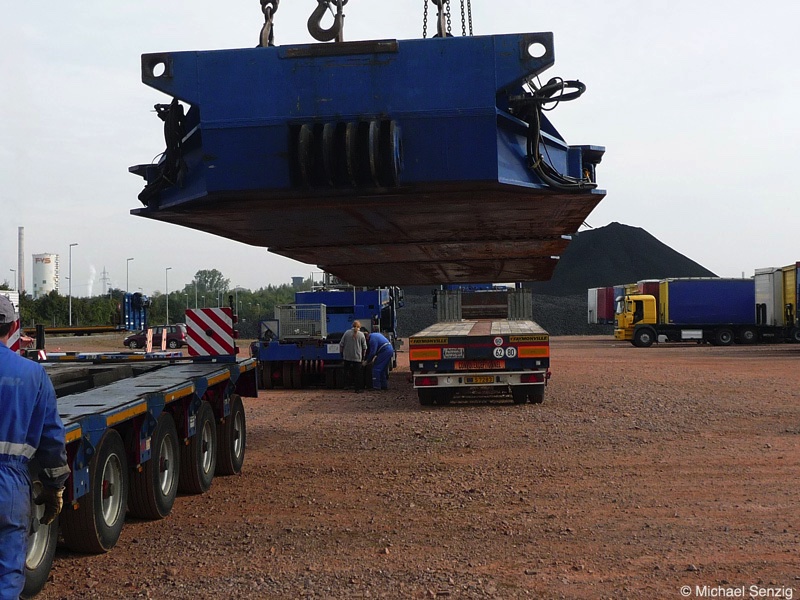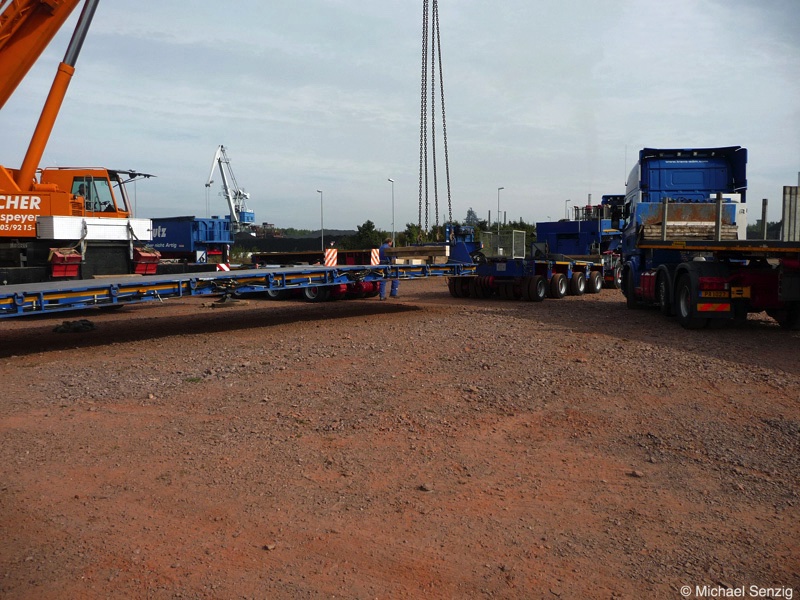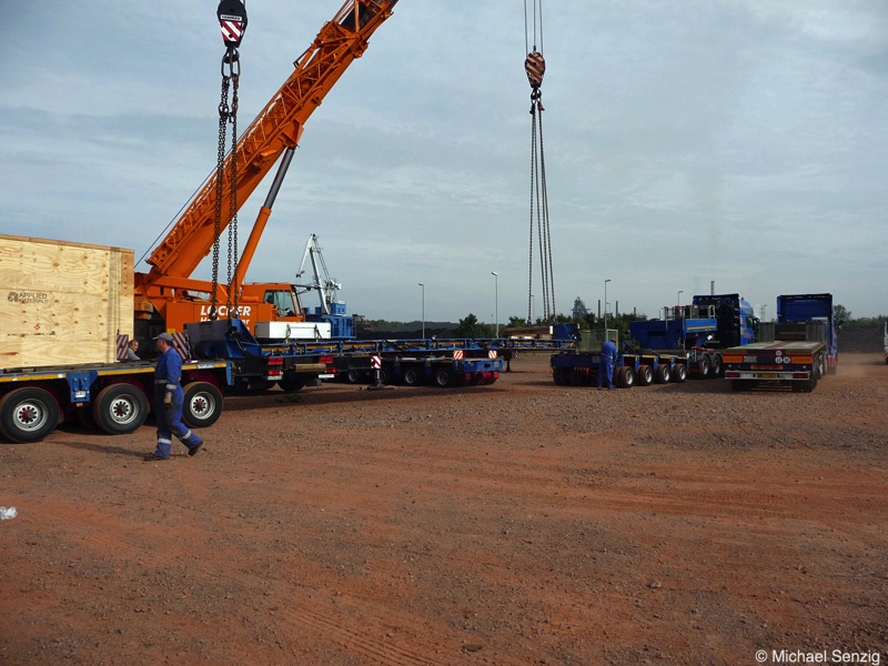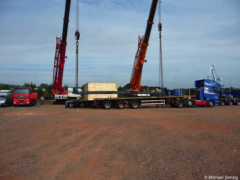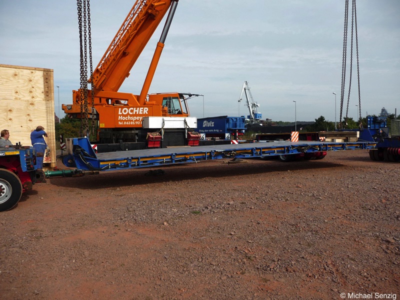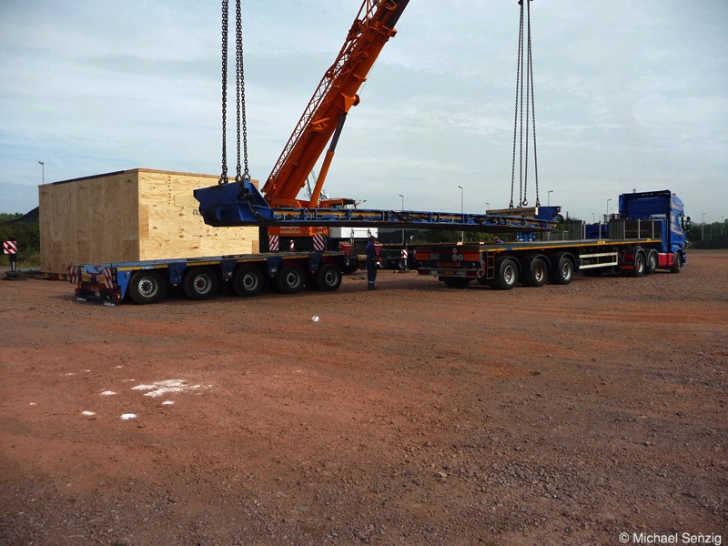 Am 24.09.2009 wurden im Dillinger Hafen zwei zwischengelagerte große Kisten auf zwei Schwertransport-Einheiten von P. Adams verladen. Michael Senzig war dabei und hat einen Teil davon fotografiert.