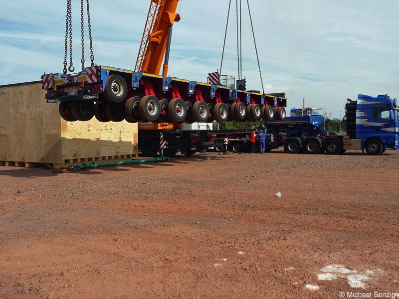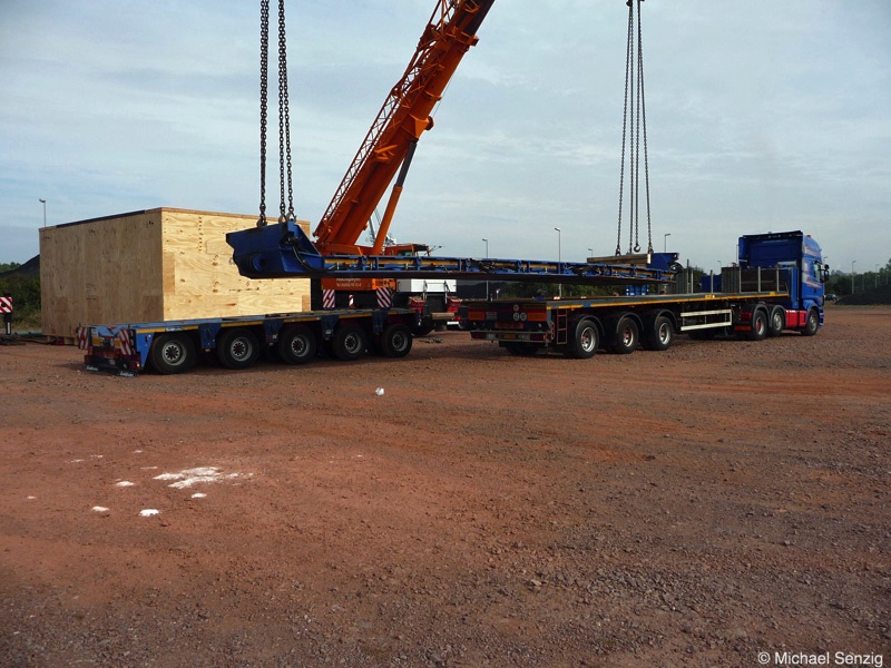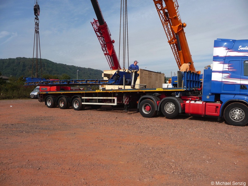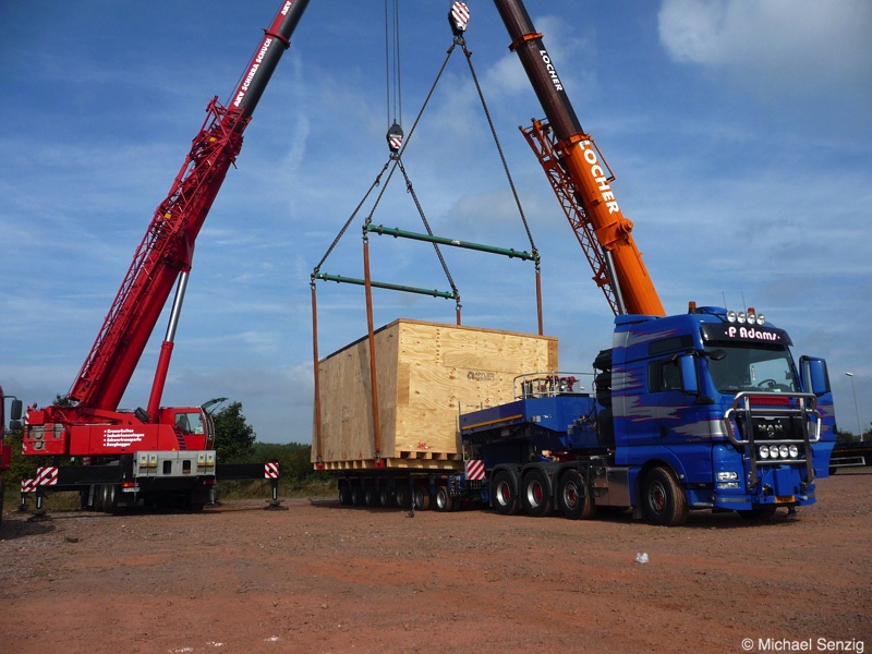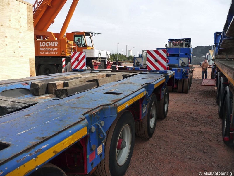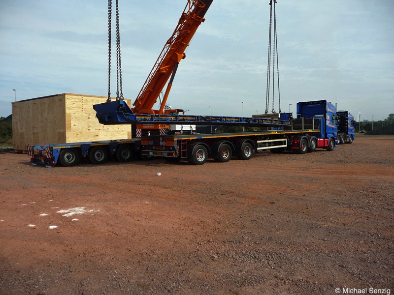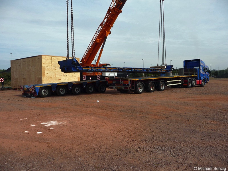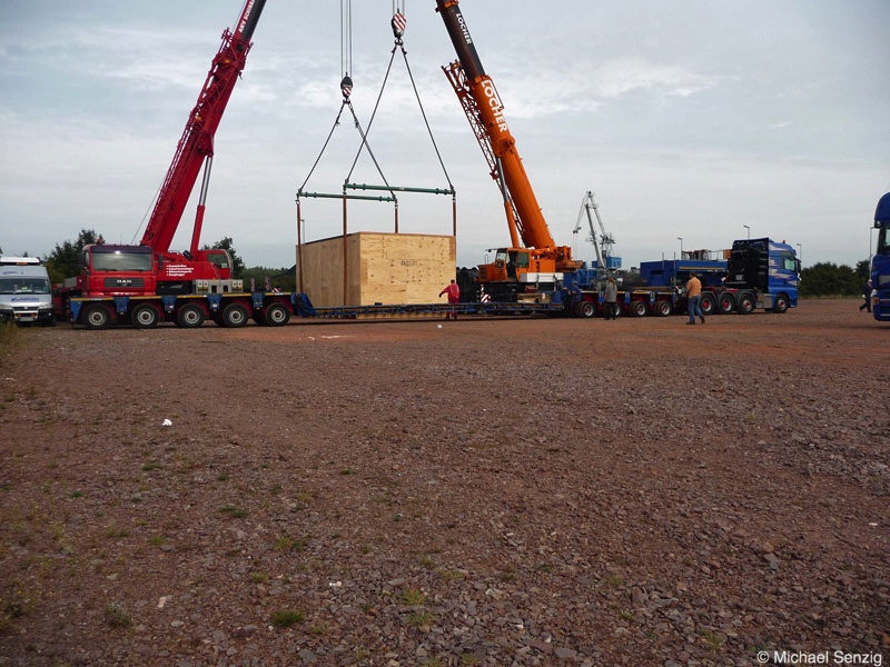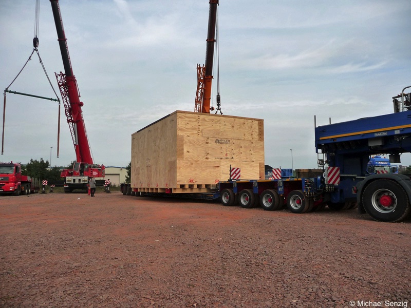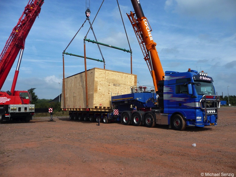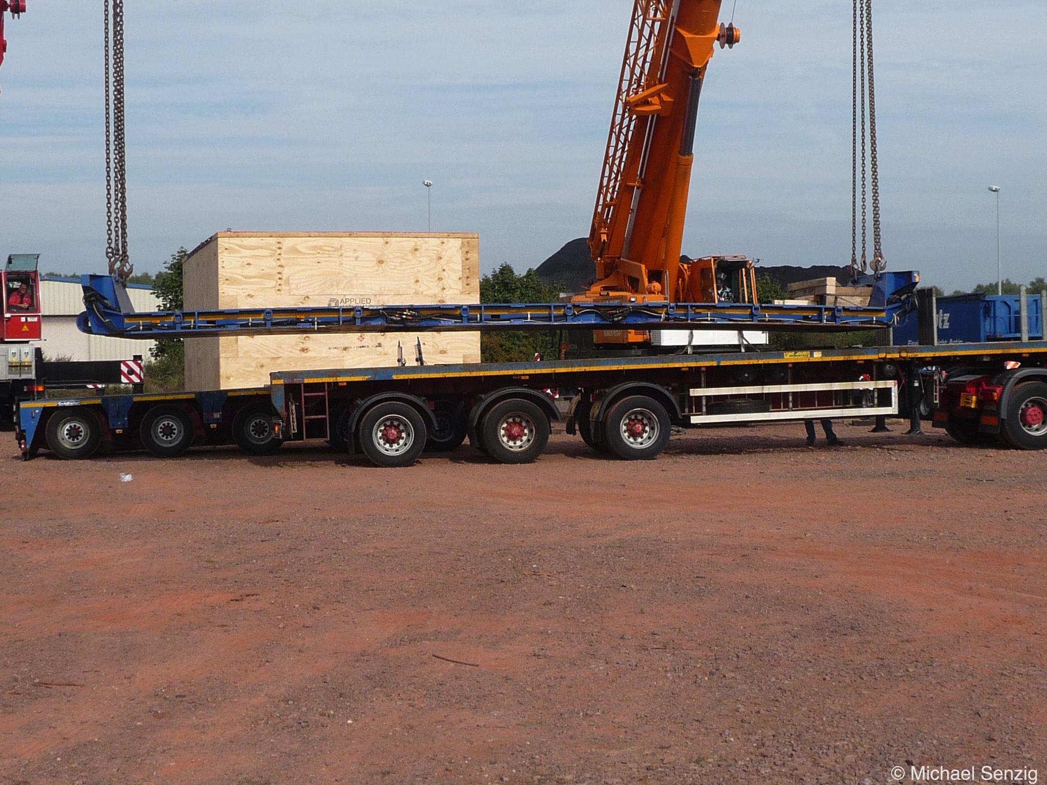 Am 24.09.2009 wurden im Dillinger Hafen zwei zwischengelagerte große Kisten auf zwei Schwertransport-Einheiten von P. Adams verladen. Michael Senzig war dabei und hat einen Teil davon fotografiert.