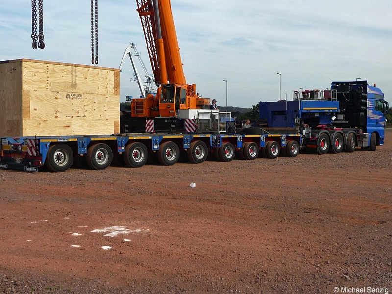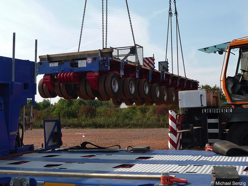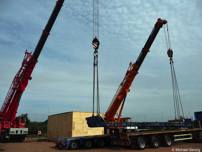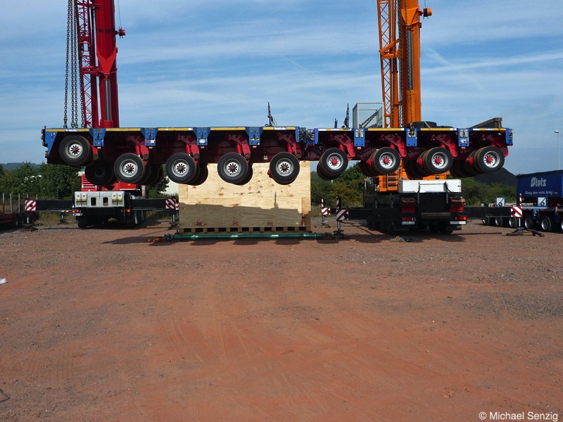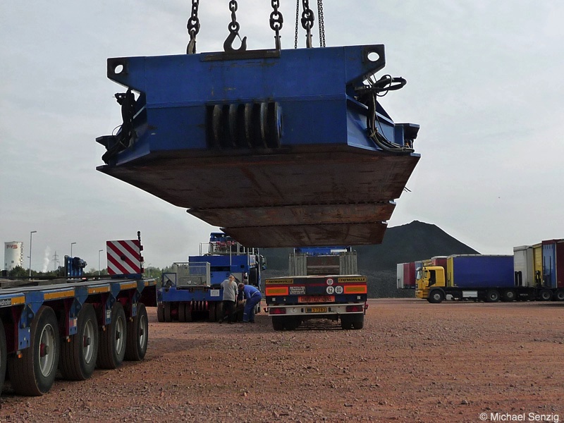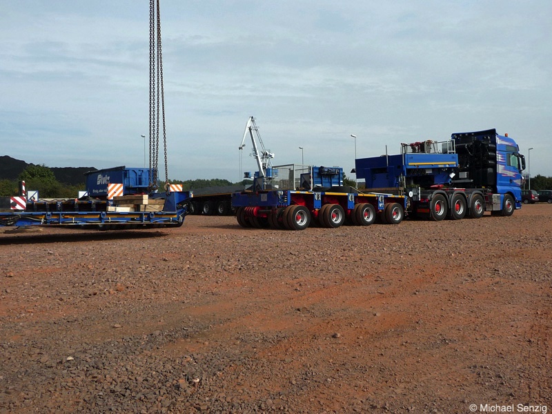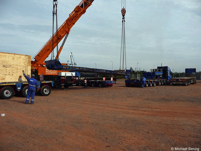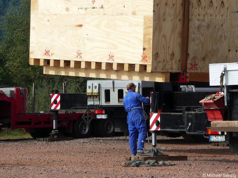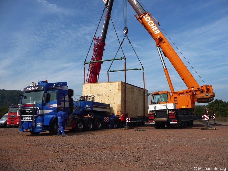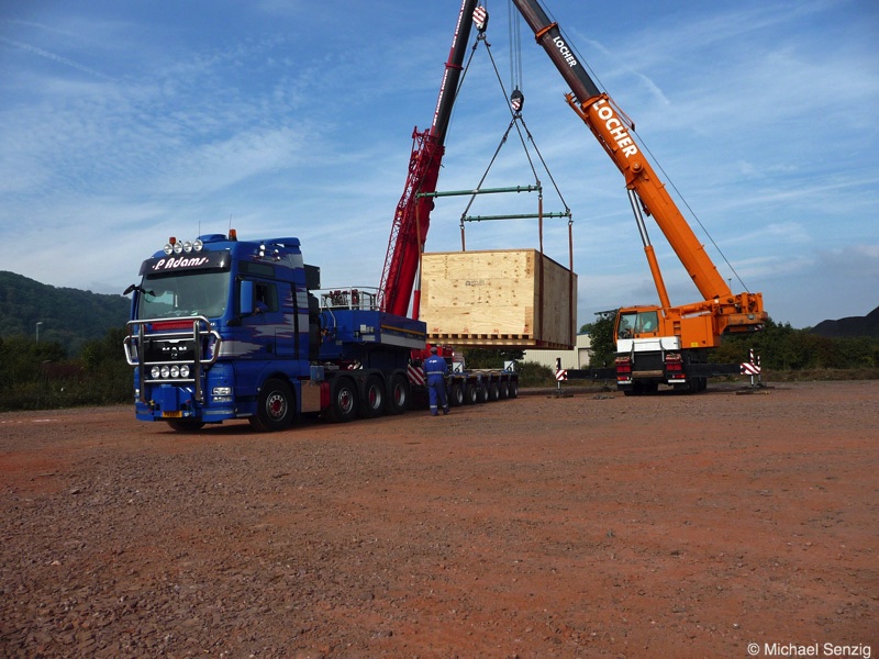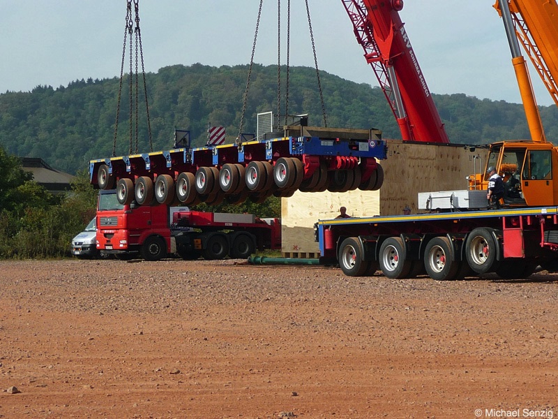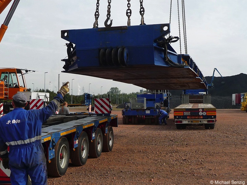 Am 24.09.2009 wurden im Dillinger Hafen zwei zwischengelagerte große Kisten auf zwei Schwertransport-Einheiten von P. Adams verladen. Michael Senzig war dabei und hat einen Teil davon fotografiert.