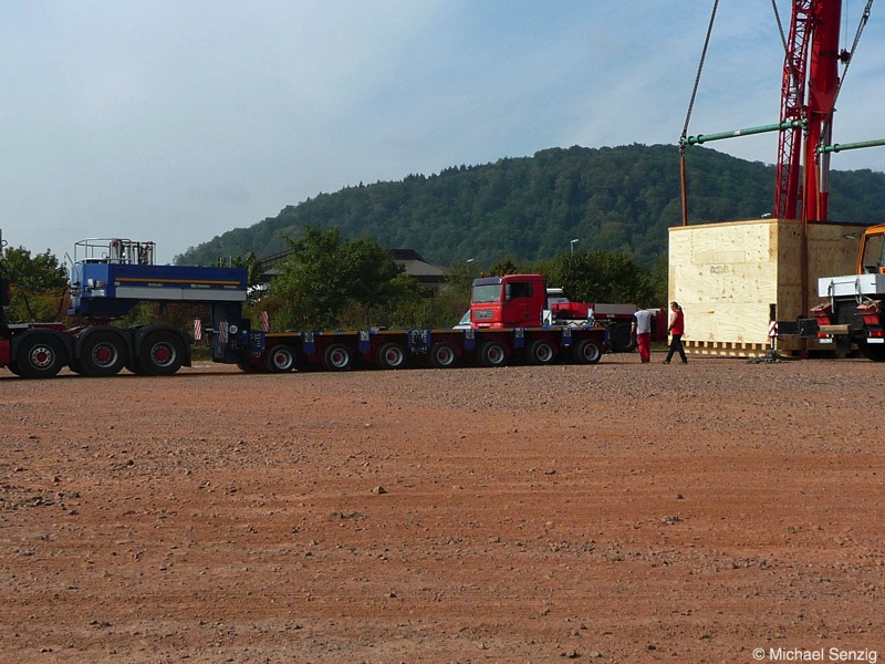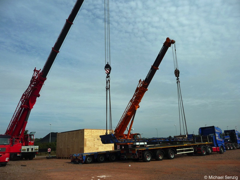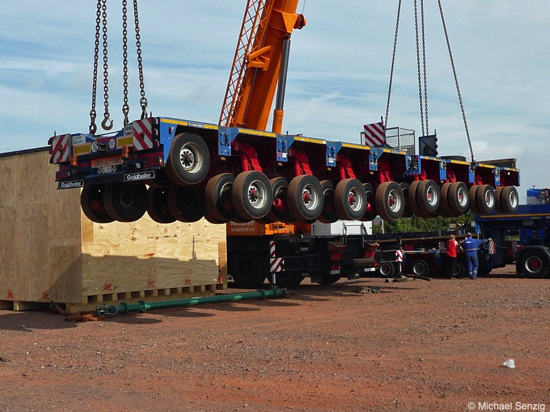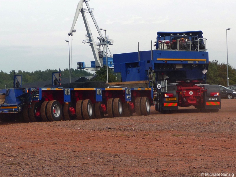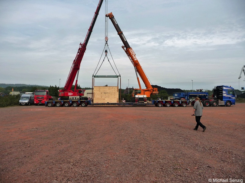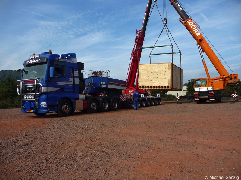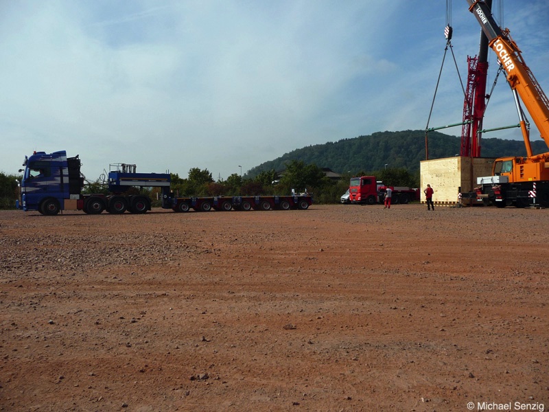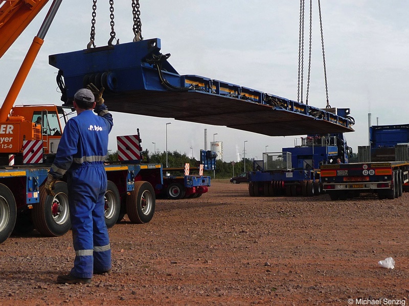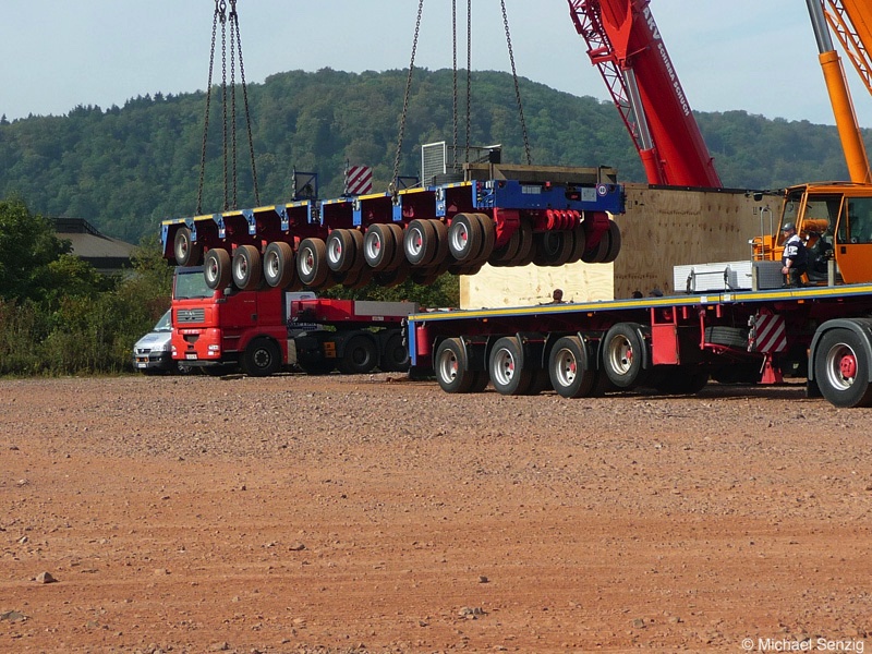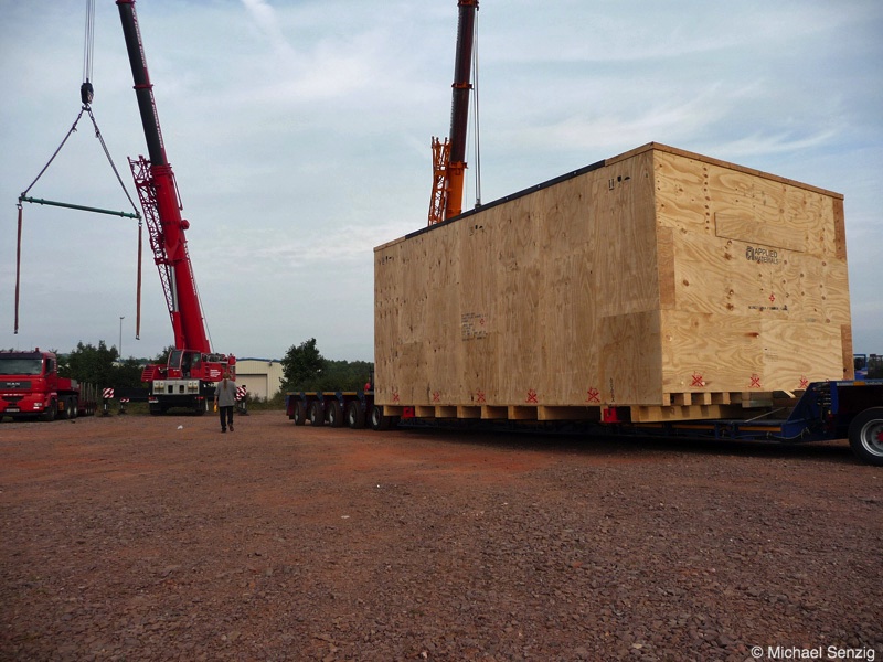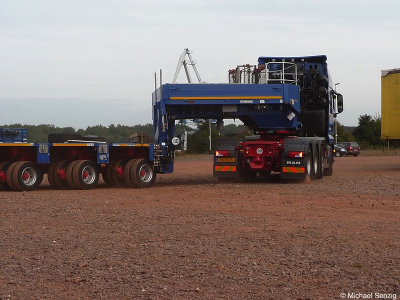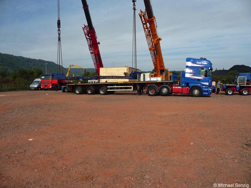Am 24.09.2009 wurden im Dillinger Hafen zwei zwischengelagerte große Kisten auf zwei Schwertransport-Einheiten von P. Adams verladen. Michael Senzig war dabei und hat einen Teil davon fotografiert.