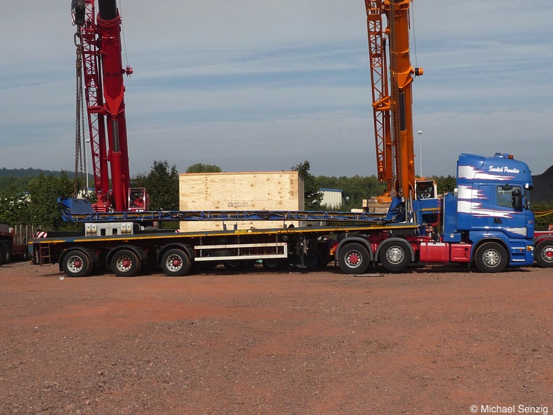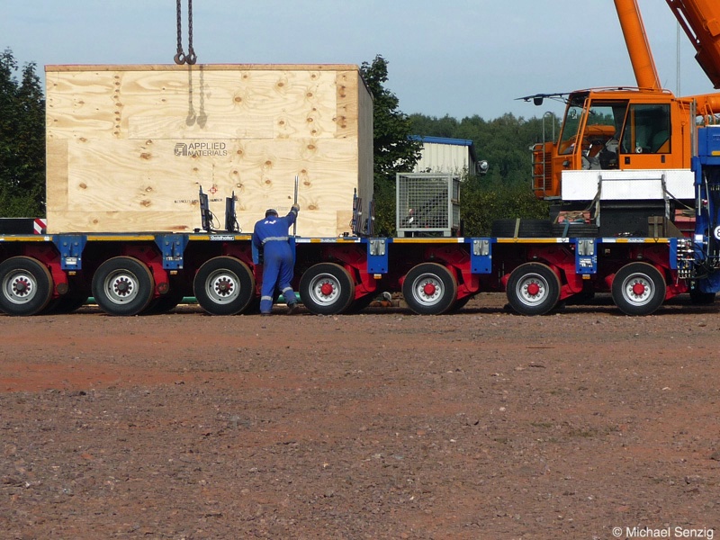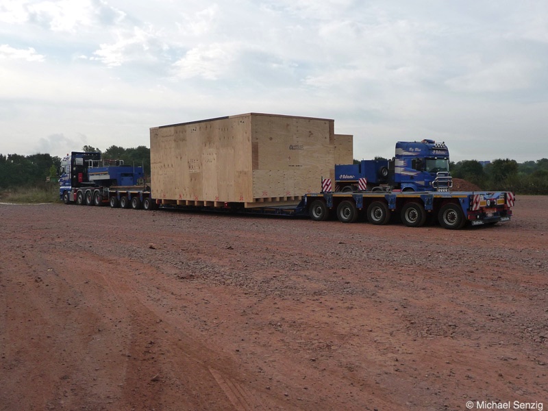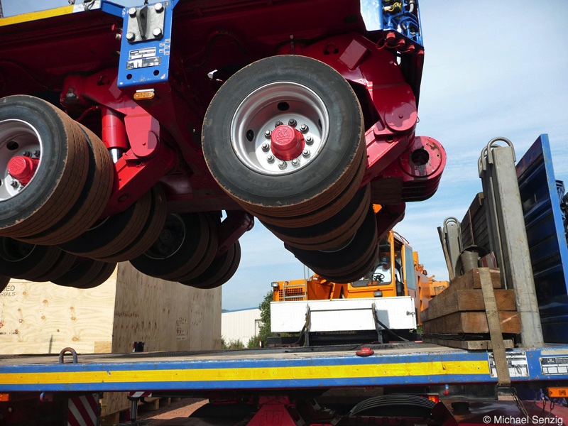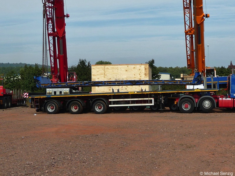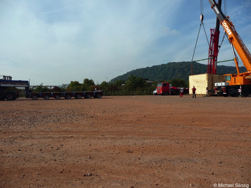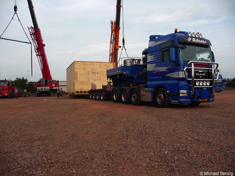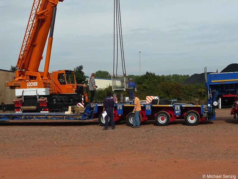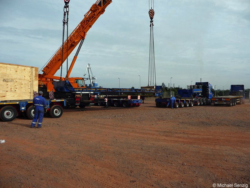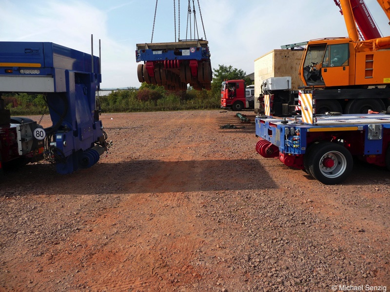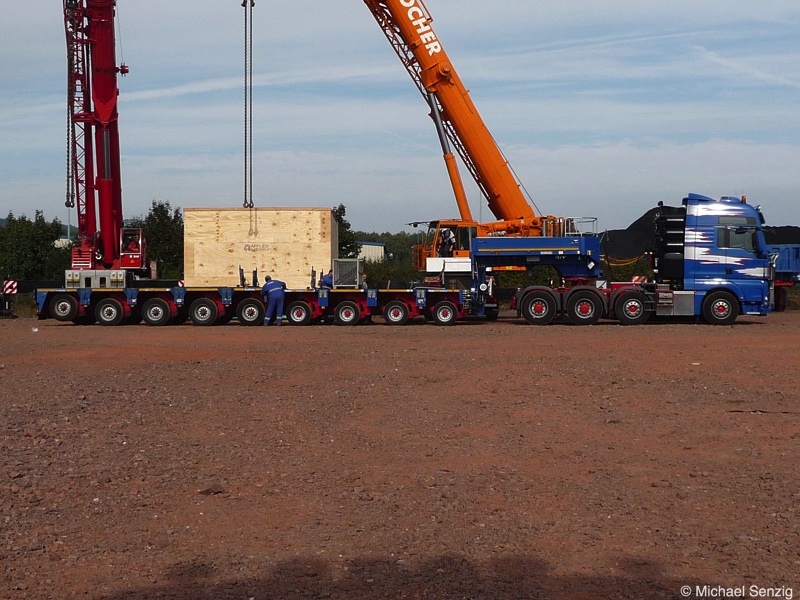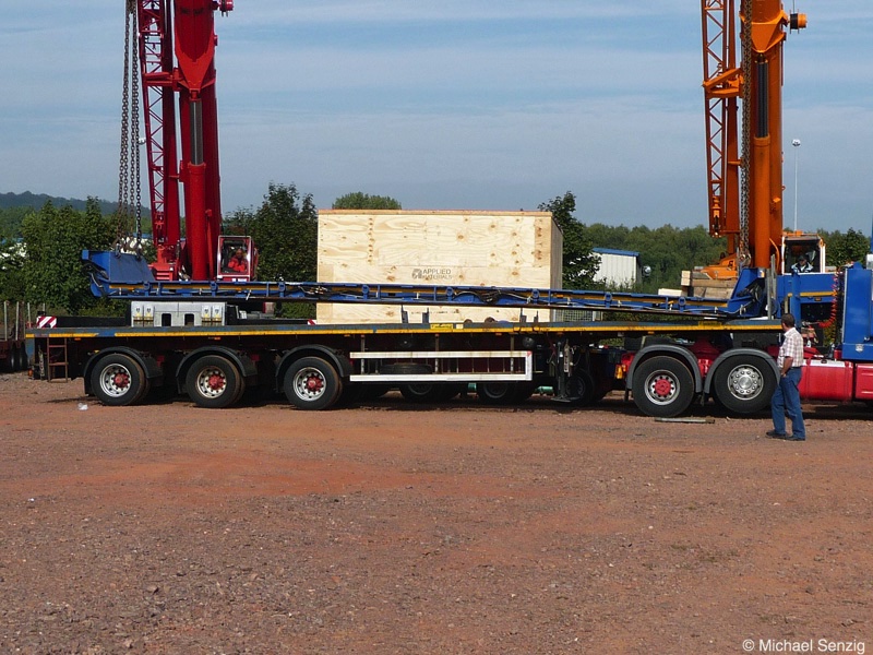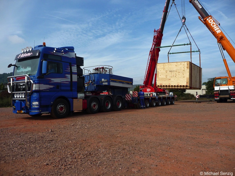 Am 24.09.2009 wurden im Dillinger Hafen zwei zwischengelagerte große Kisten auf zwei Schwertransport-Einheiten von P. Adams verladen. Michael Senzig war dabei und hat einen Teil davon fotografiert.