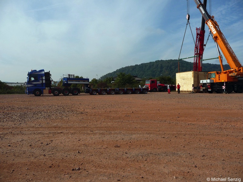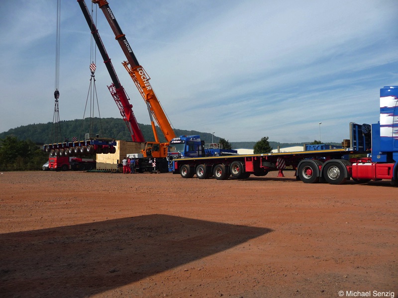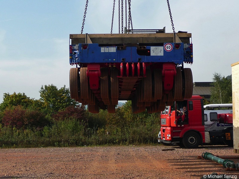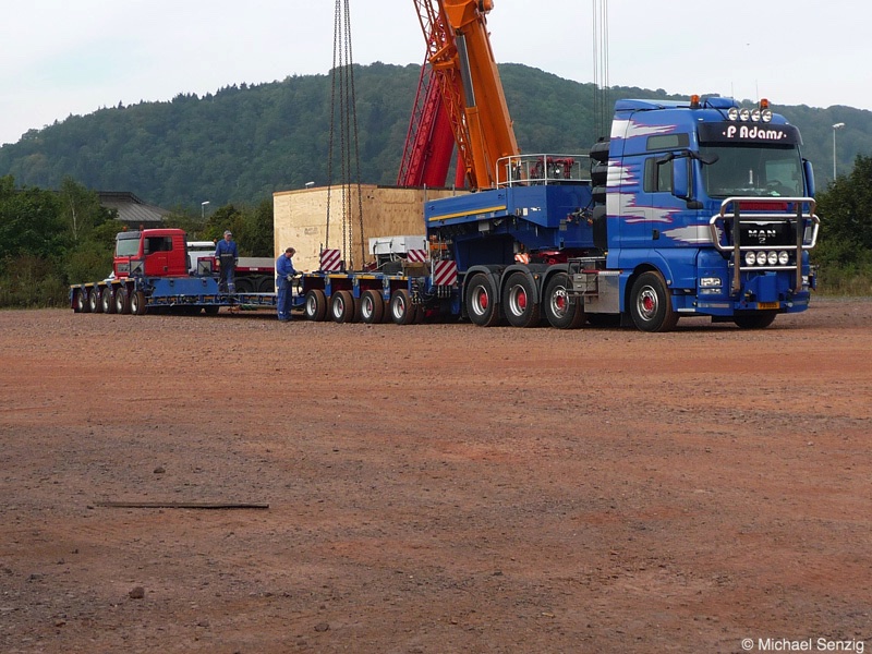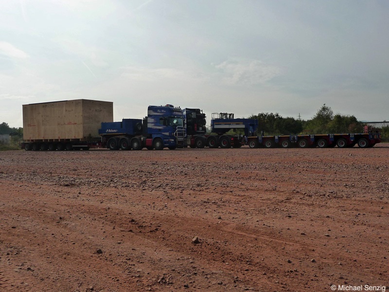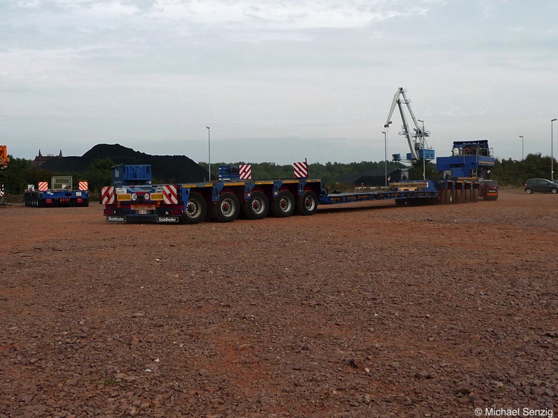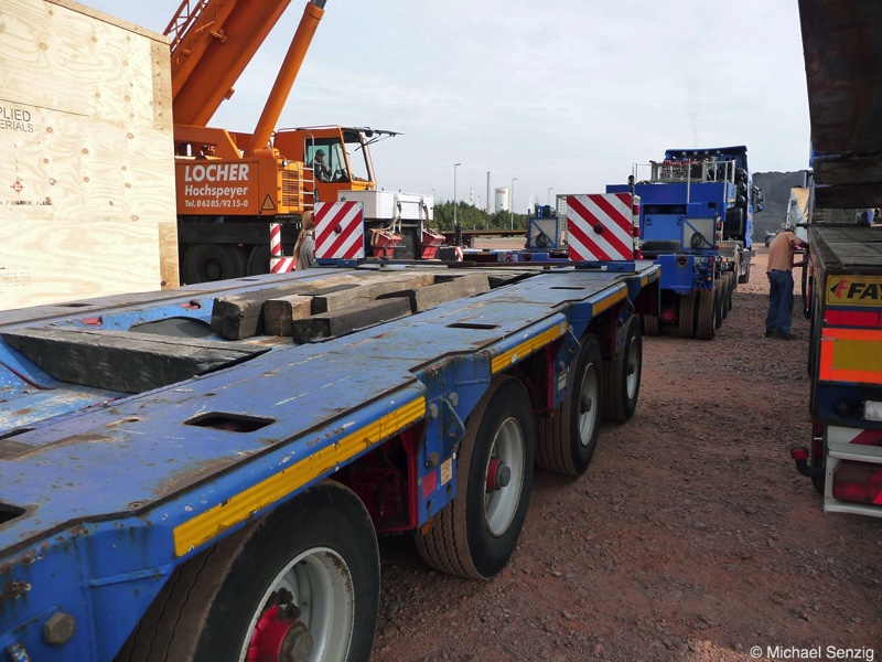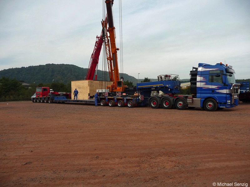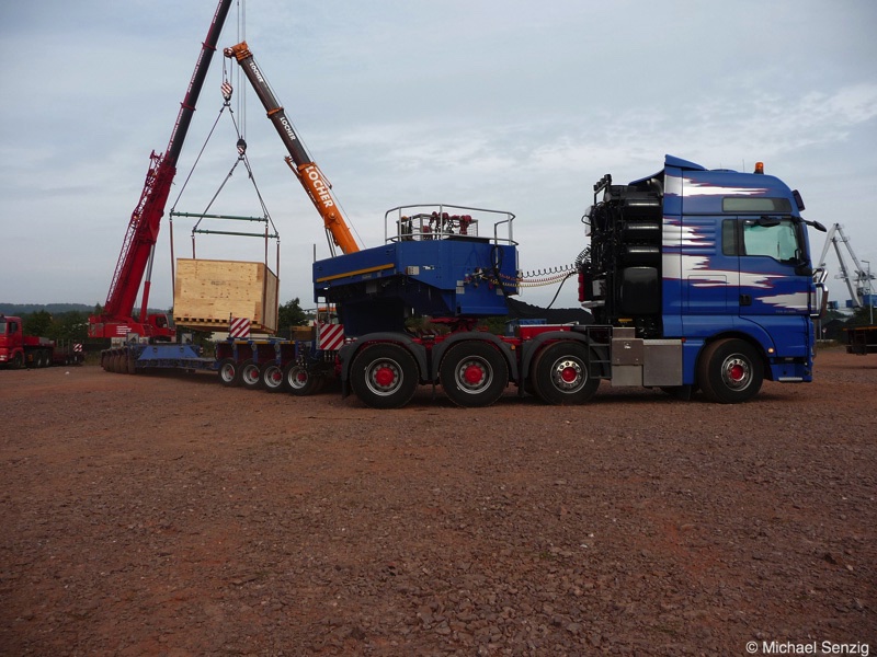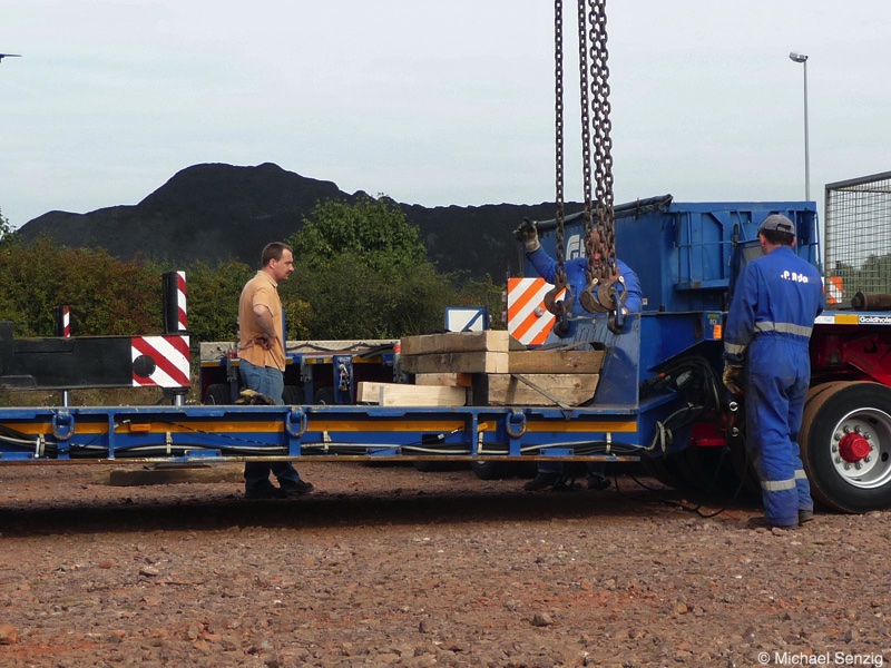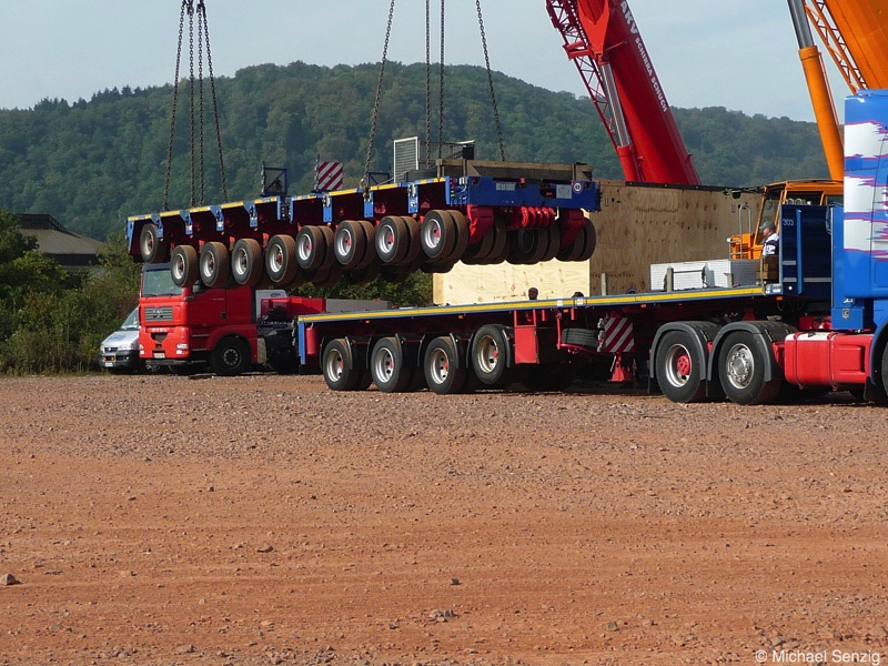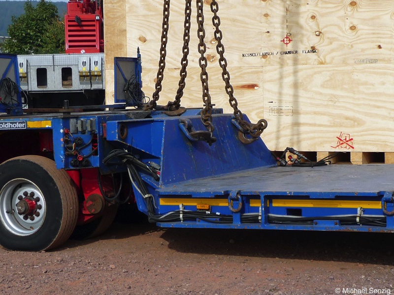 Am 24.09.2009 wurden im Dillinger Hafen zwei zwischengelagerte große Kisten auf zwei Schwertransport-Einheiten von P. Adams verladen. Michael Senzig war dabei und hat einen Teil davon fotografiert.