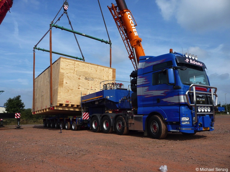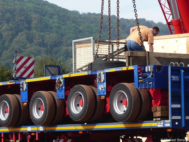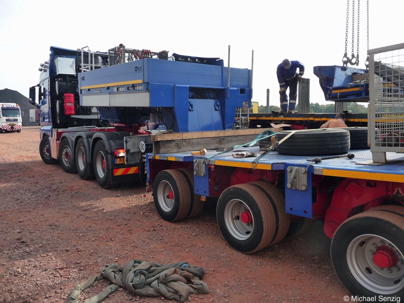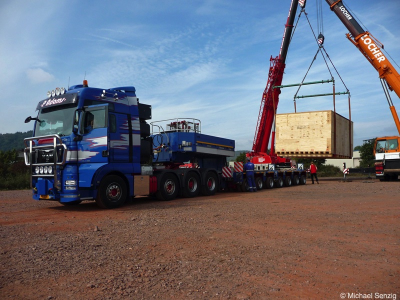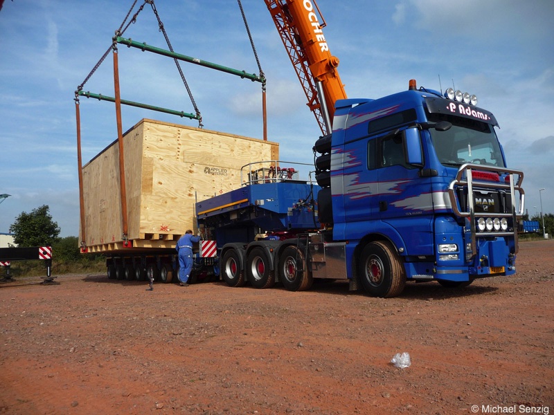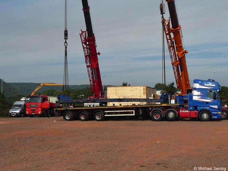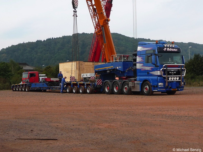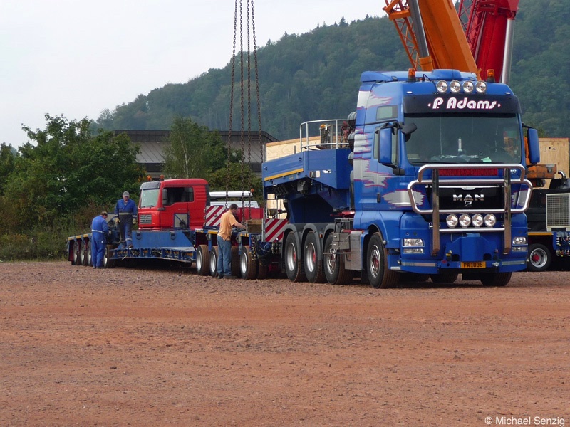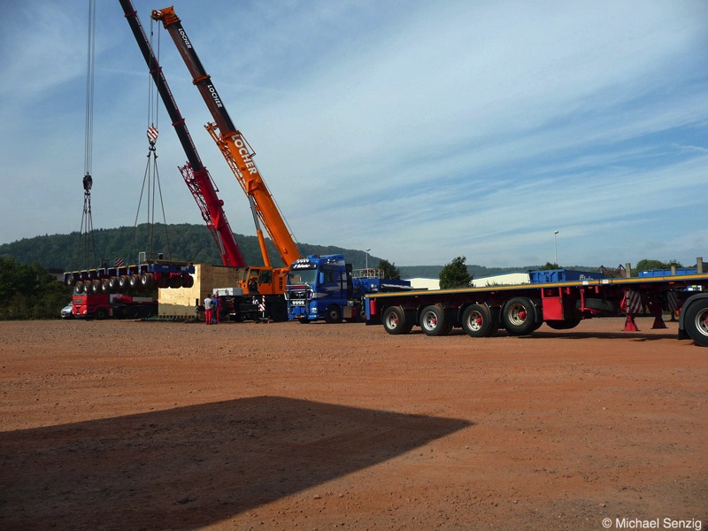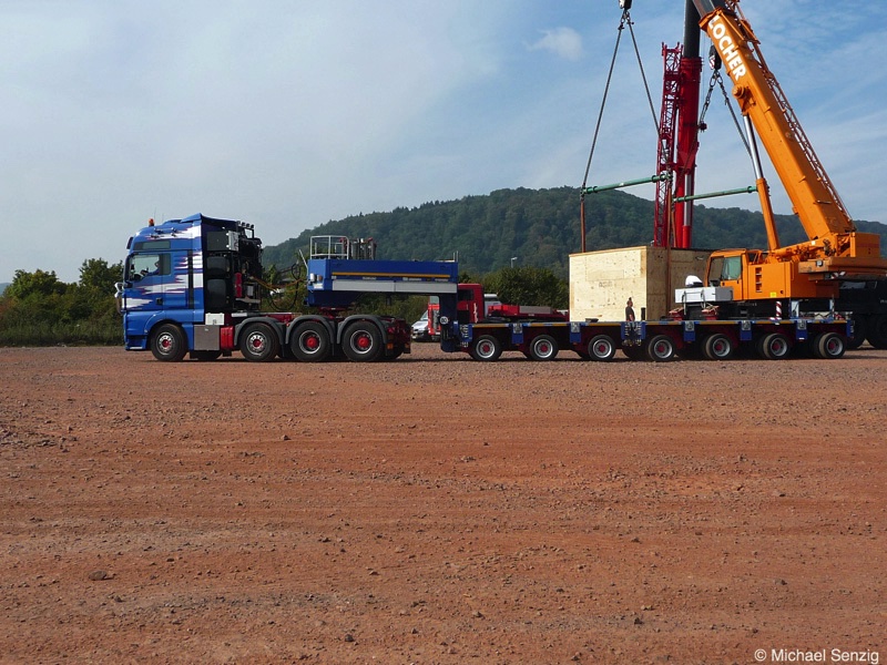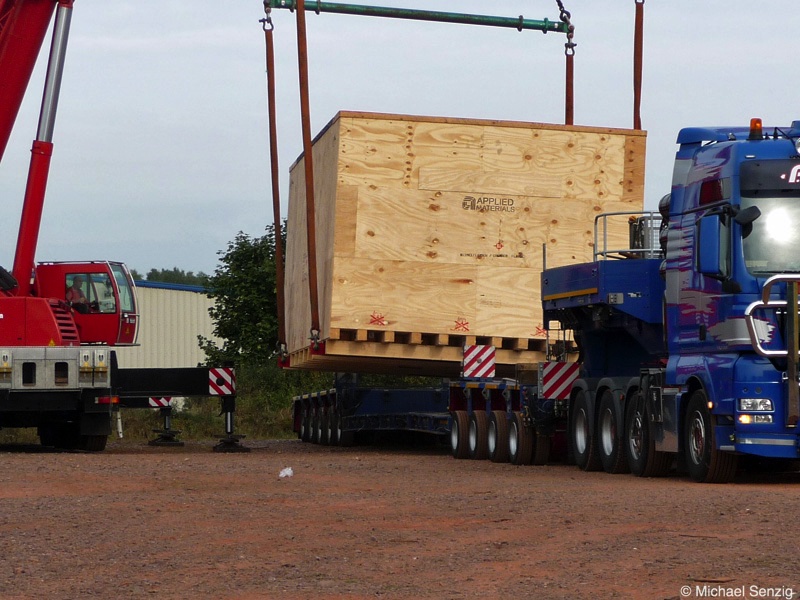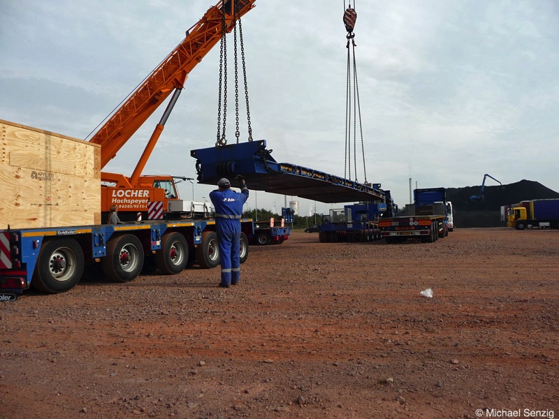 Am 24.09.2009 wurden im Dillinger Hafen zwei zwischengelagerte große Kisten auf zwei Schwertransport-Einheiten von P. Adams verladen. Michael Senzig war dabei und hat einen Teil davon fotografiert.