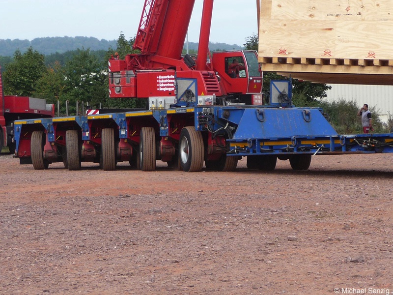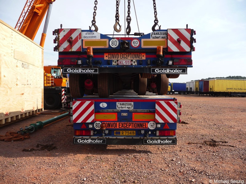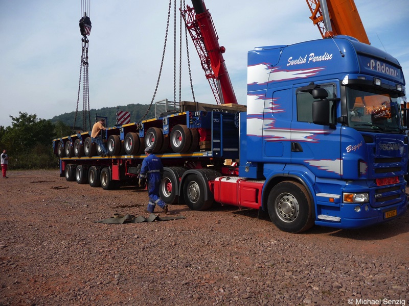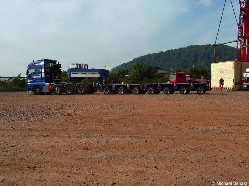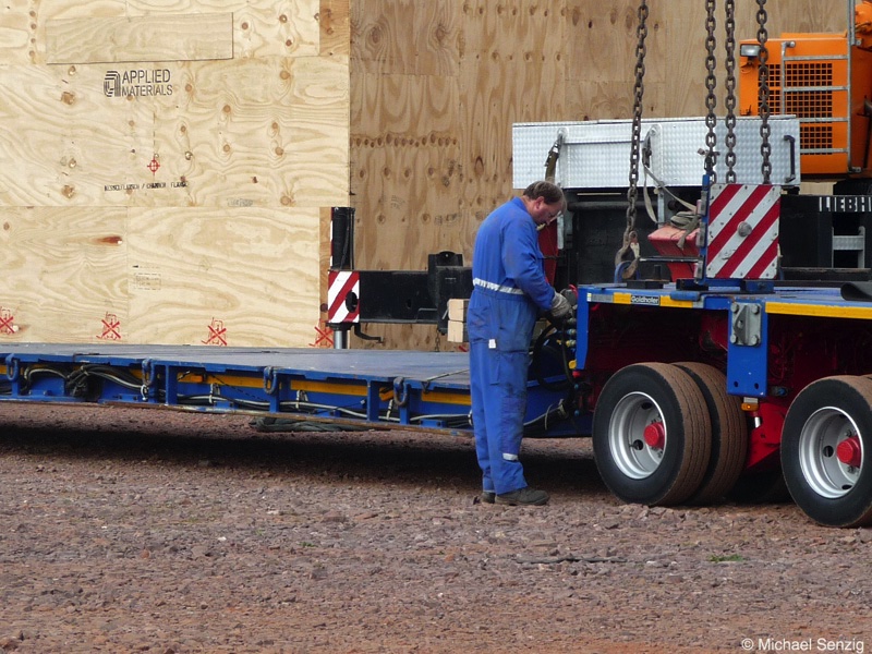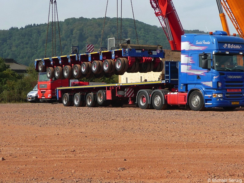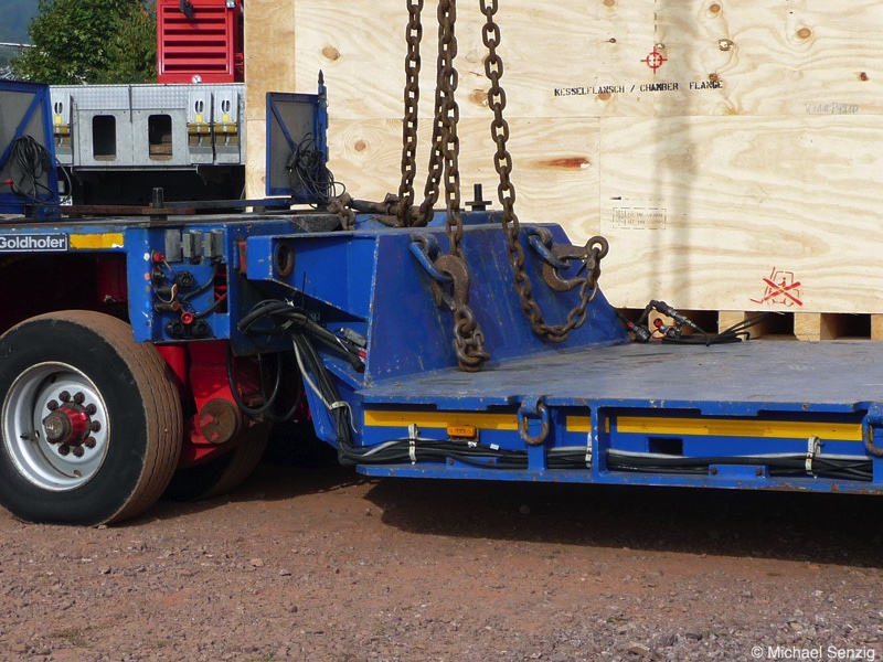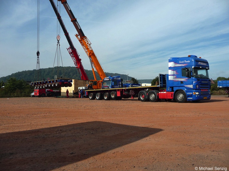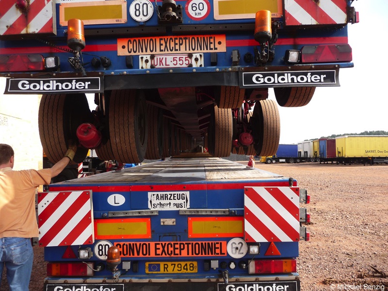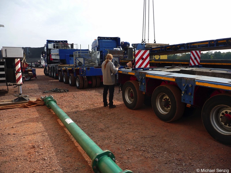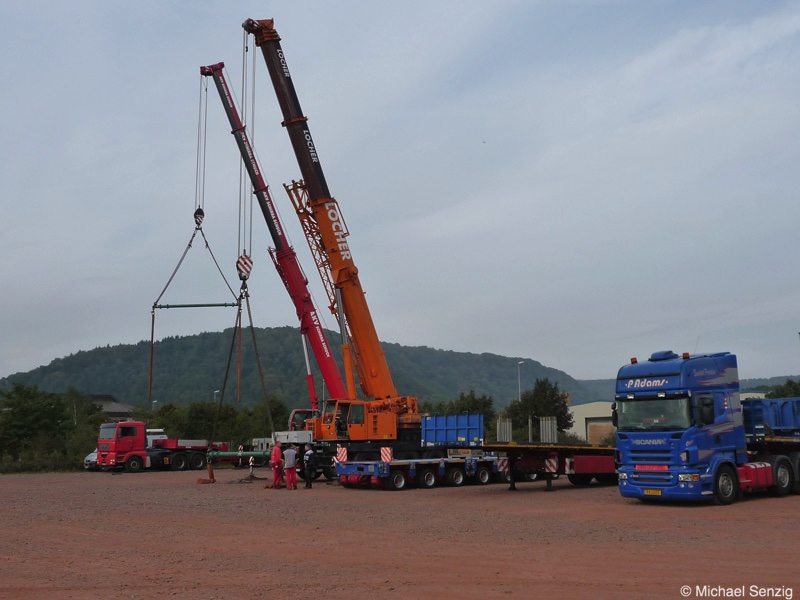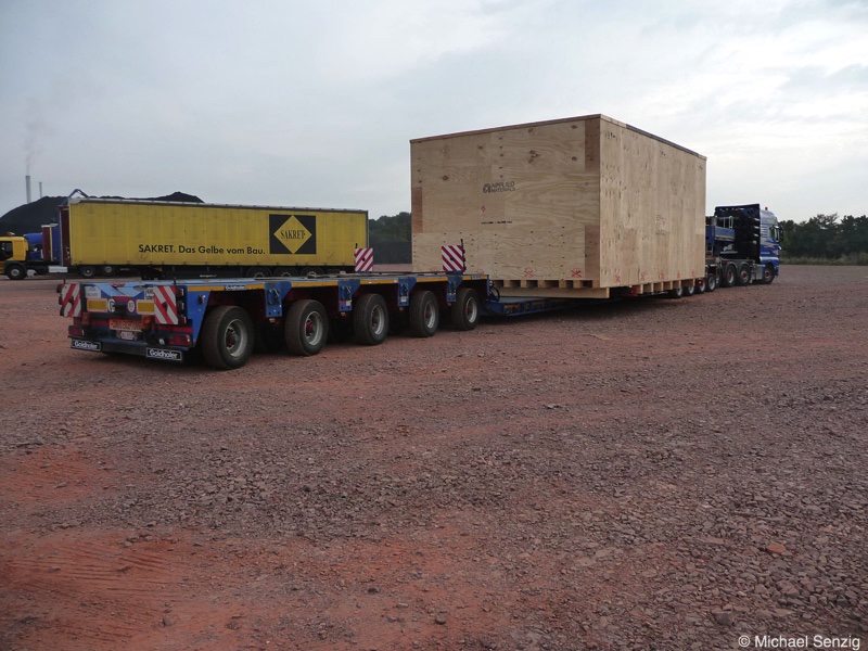 Am 24.09.2009 wurden im Dillinger Hafen zwei zwischengelagerte große Kisten auf zwei Schwertransport-Einheiten von P. Adams verladen. Michael Senzig war dabei und hat einen Teil davon fotografiert.