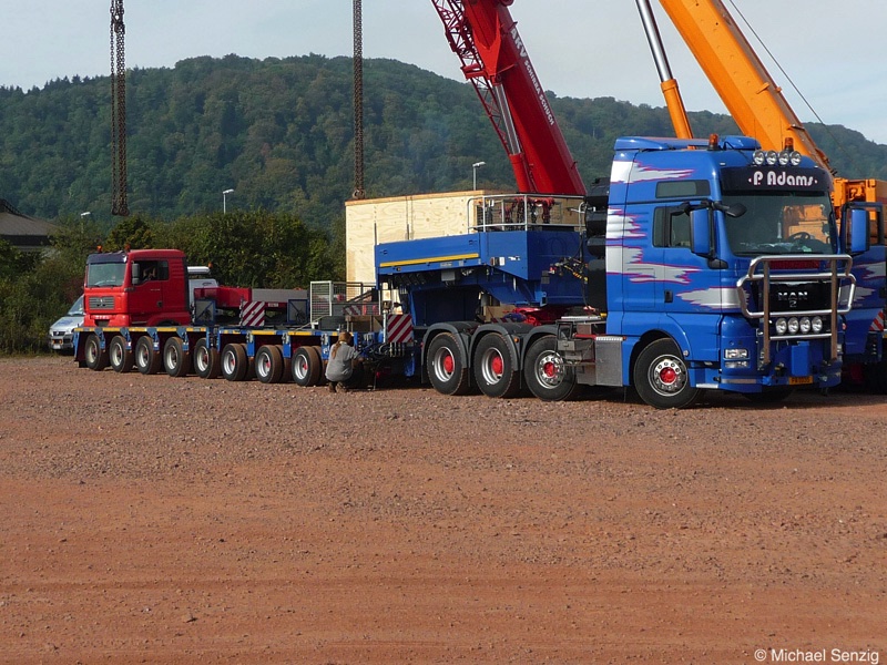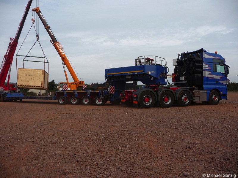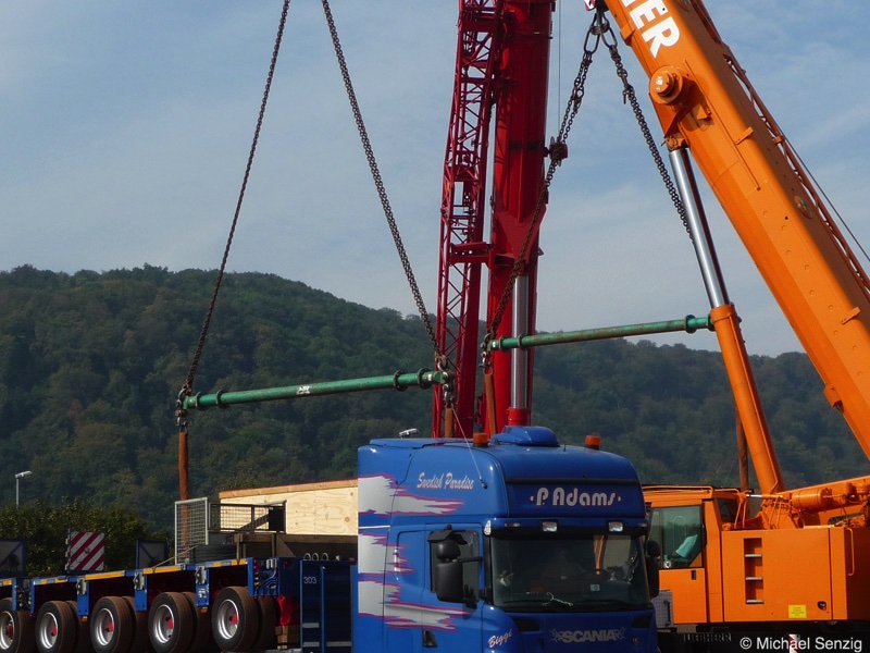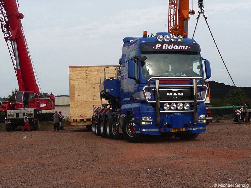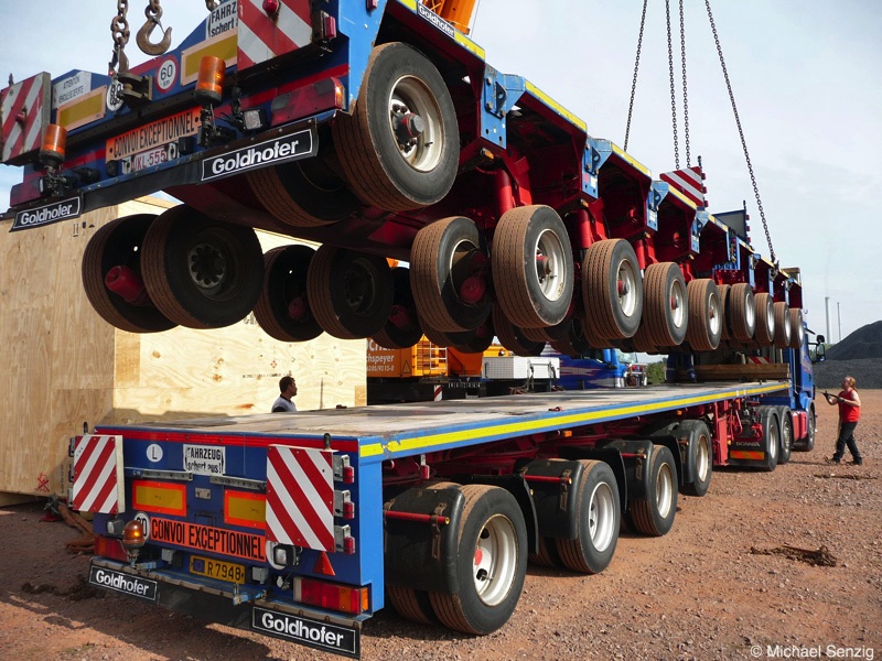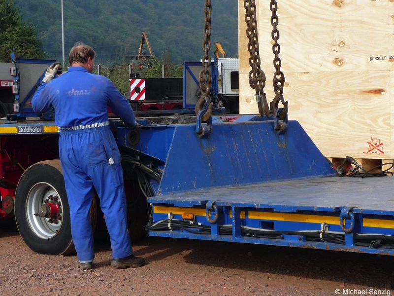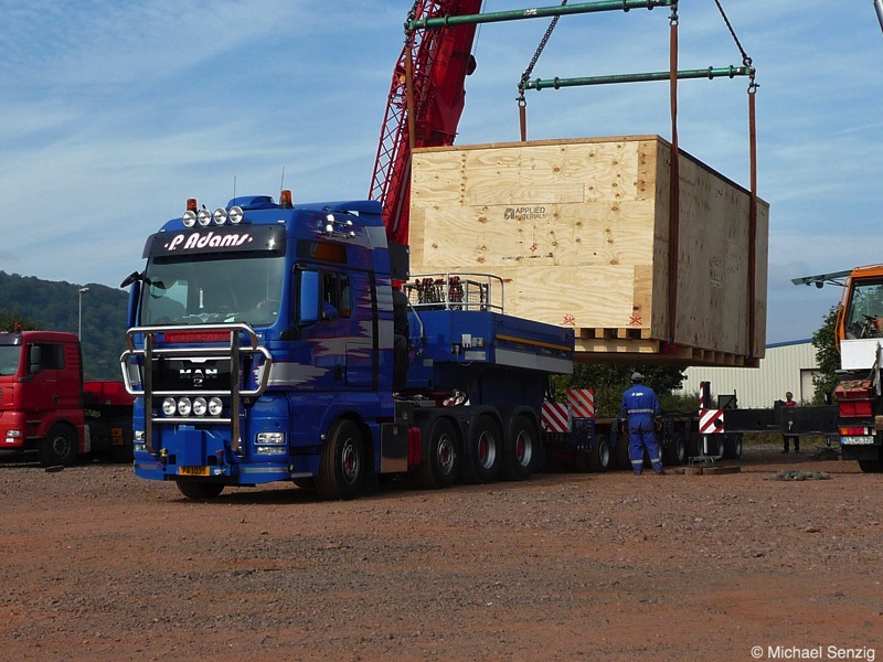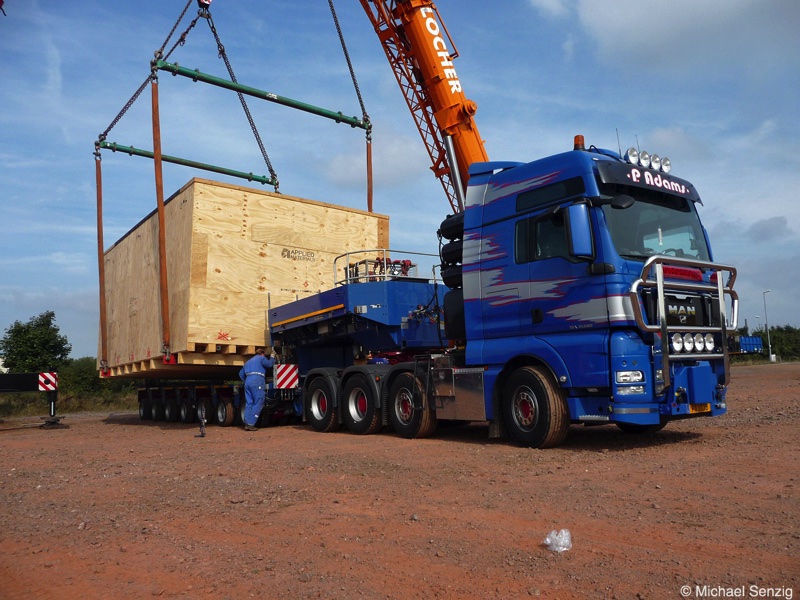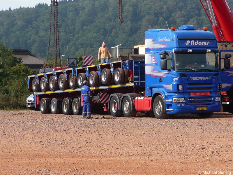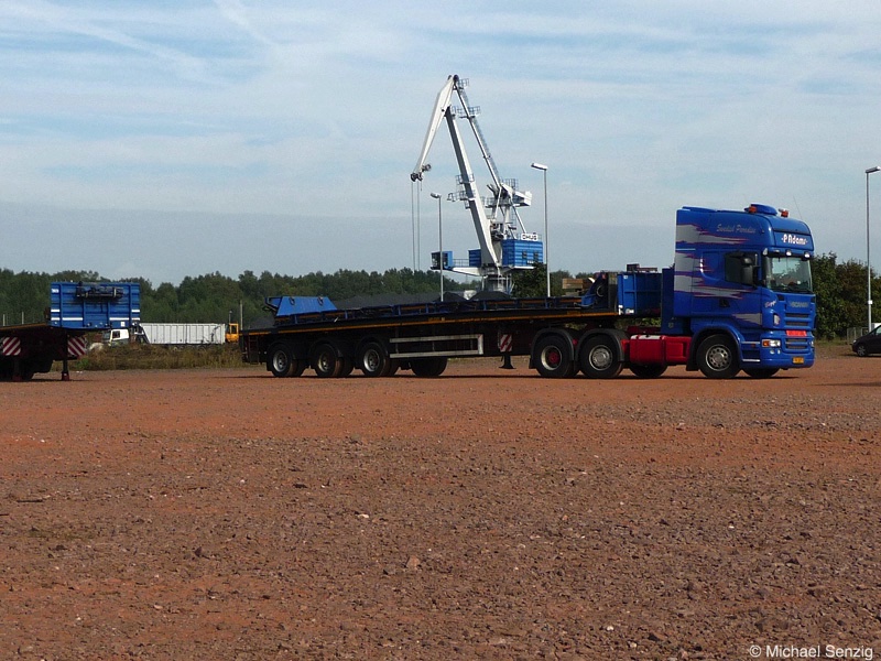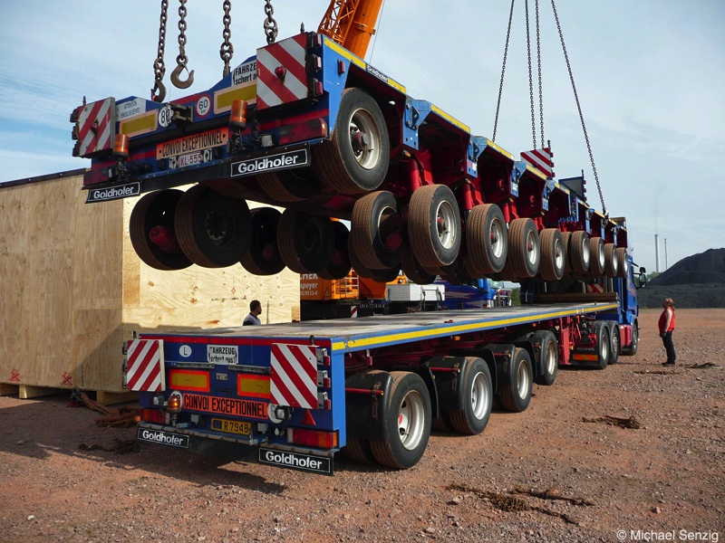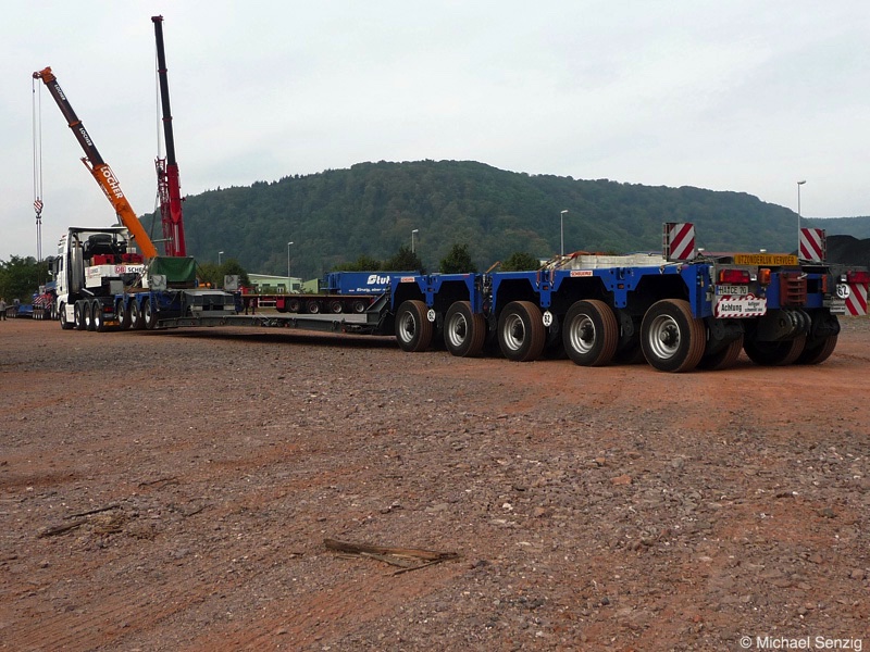 Am 24.09.2009 wurden im Dillinger Hafen zwei zwischengelagerte große Kisten auf zwei Schwertransport-Einheiten von P. Adams verladen. Michael Senzig war dabei und hat einen Teil davon fotografiert.