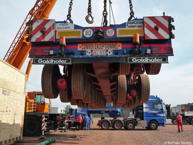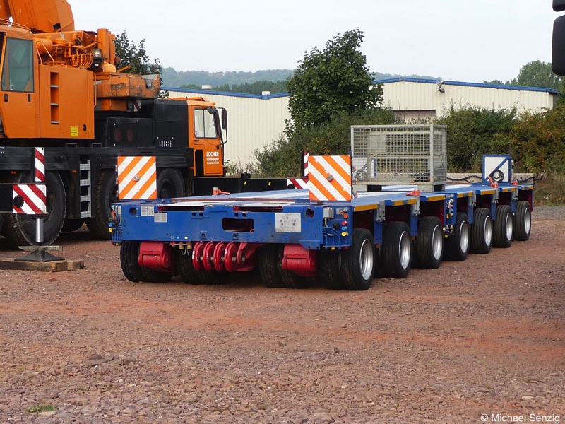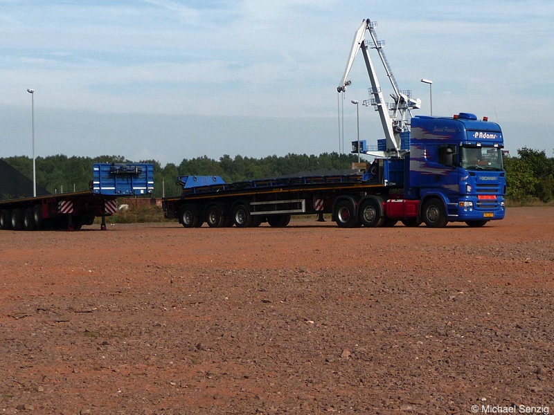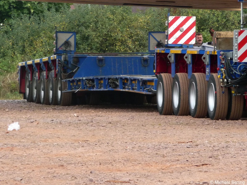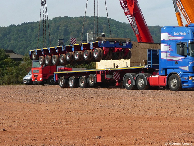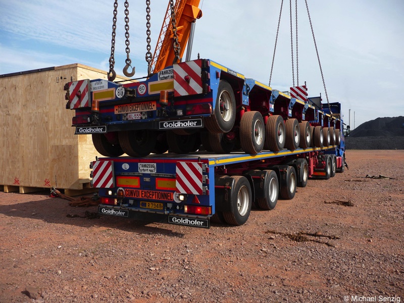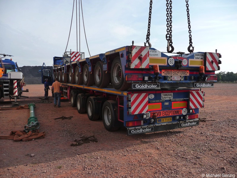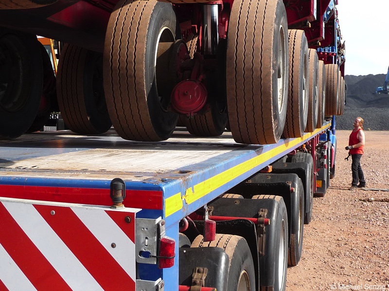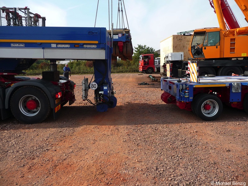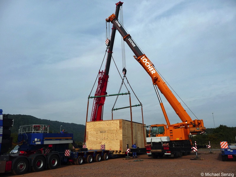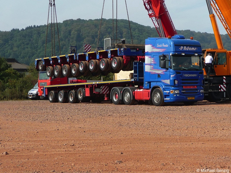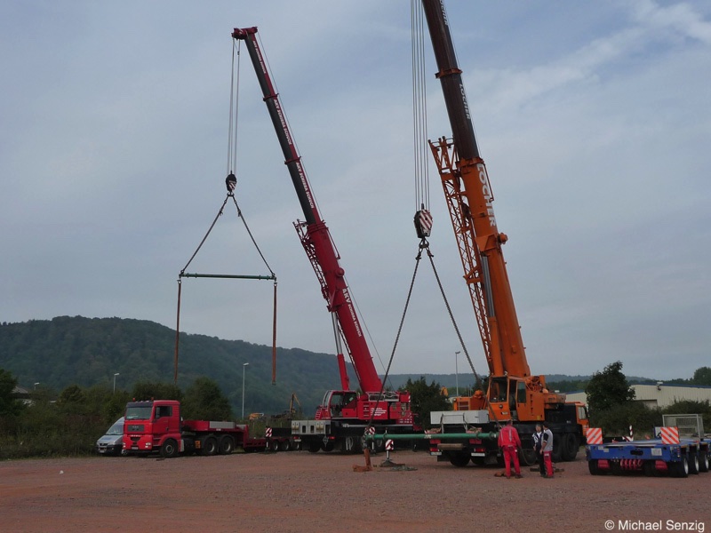Am 24.09.2009 wurden im Dillinger Hafen zwei zwischengelagerte große Kisten auf zwei Schwertransport-Einheiten von P. Adams verladen. Michael Senzig war dabei und hat einen Teil davon fotografiert.