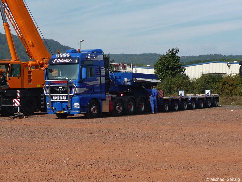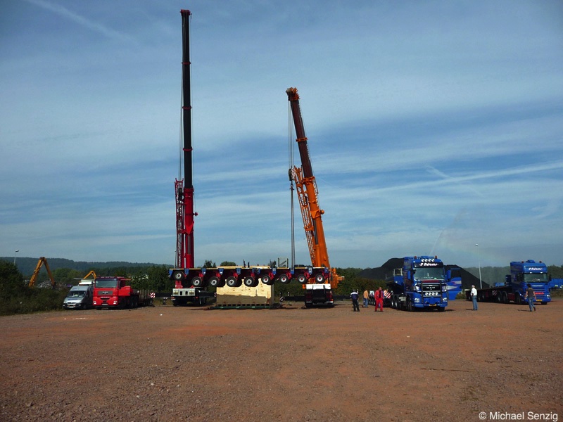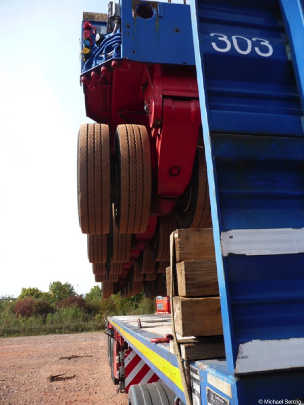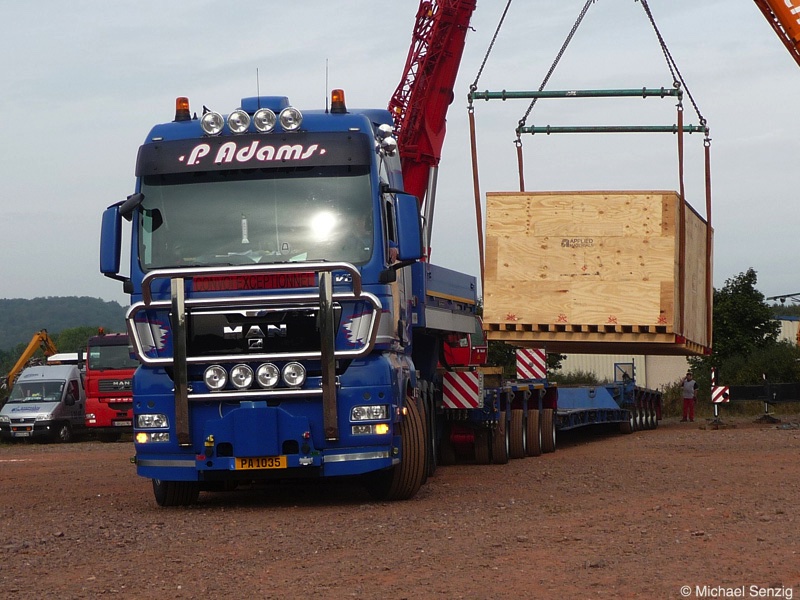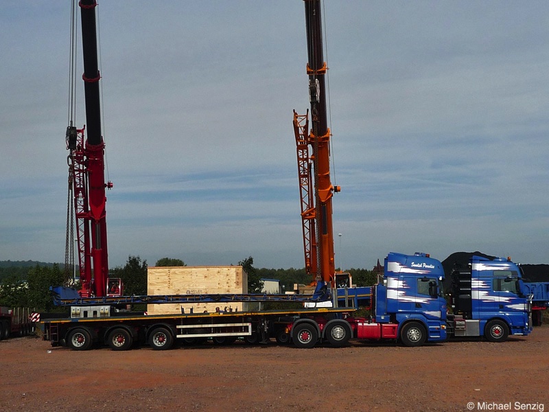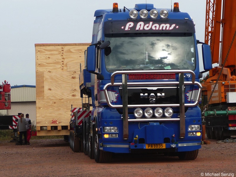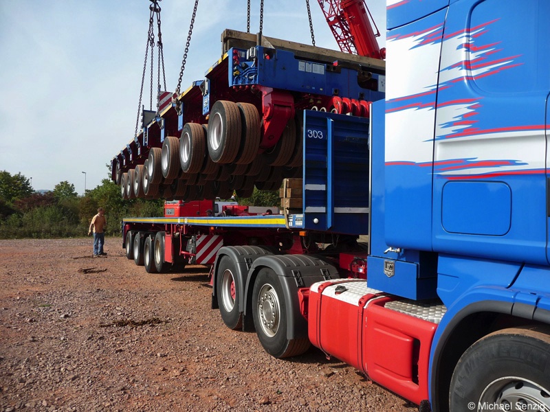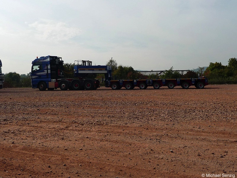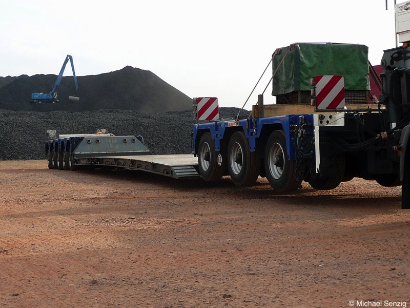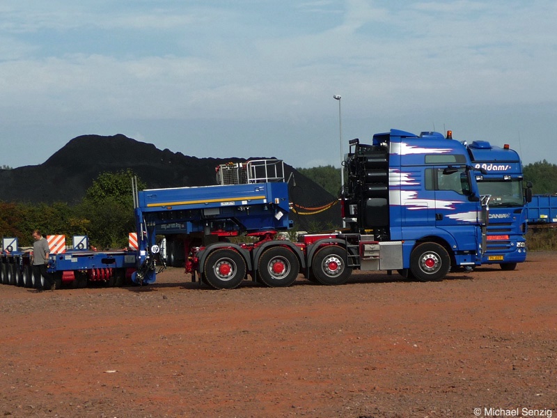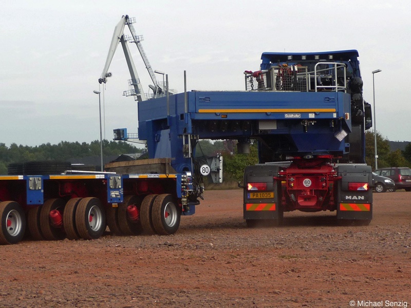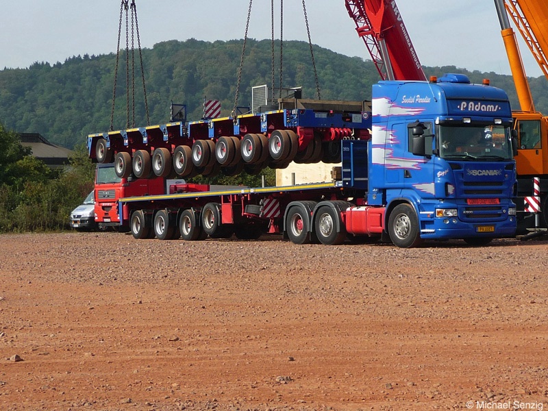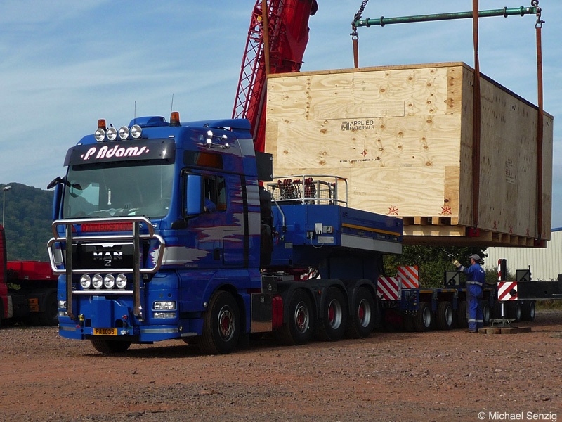 Am 24.09.2009 wurden im Dillinger Hafen zwei zwischengelagerte große Kisten auf zwei Schwertransport-Einheiten von P. Adams verladen. Michael Senzig war dabei und hat einen Teil davon fotografiert.