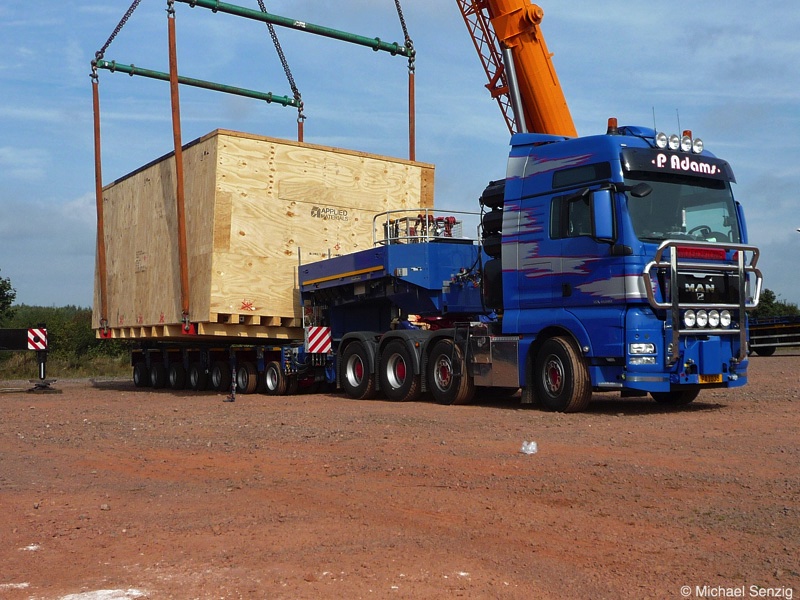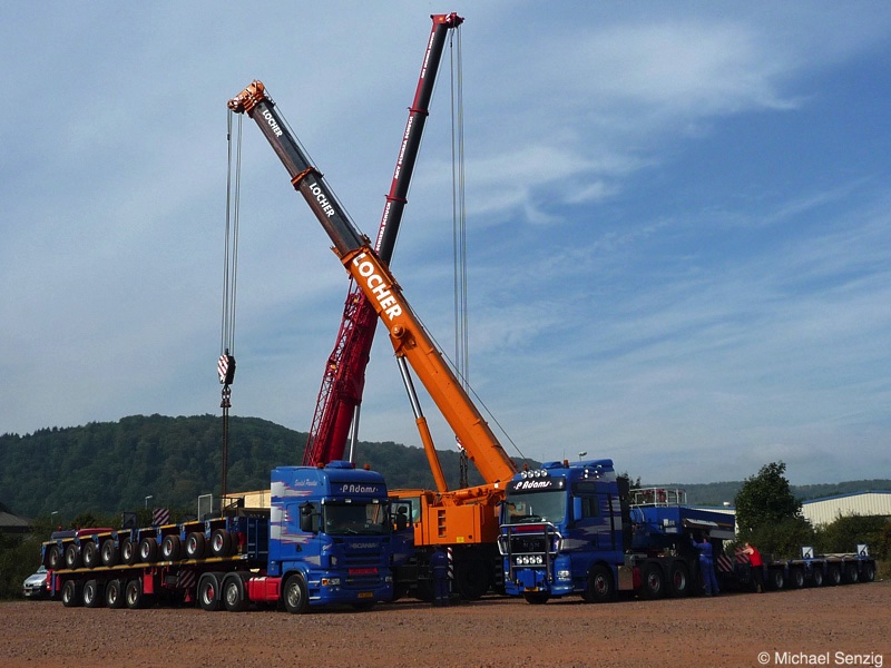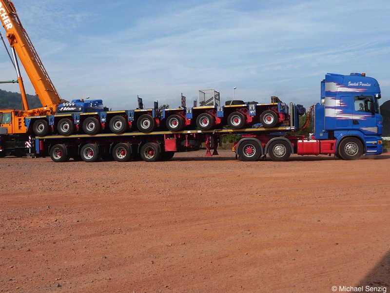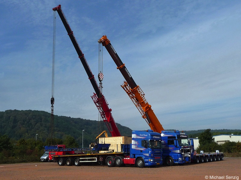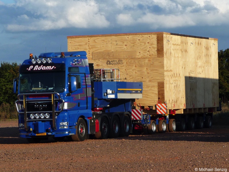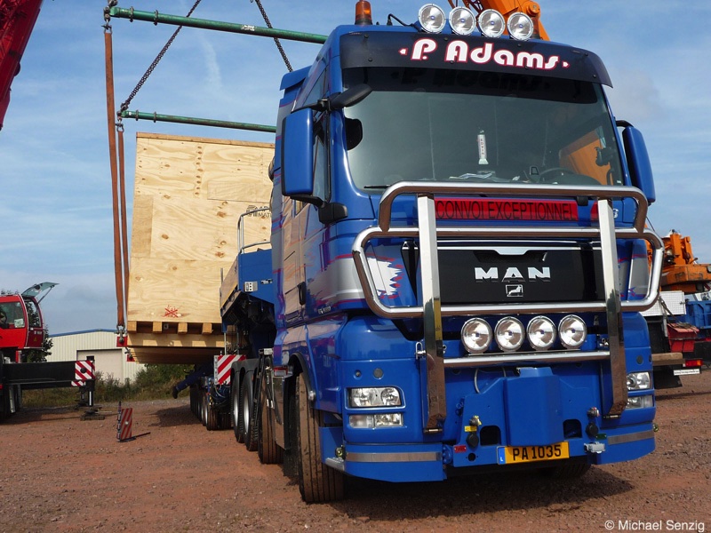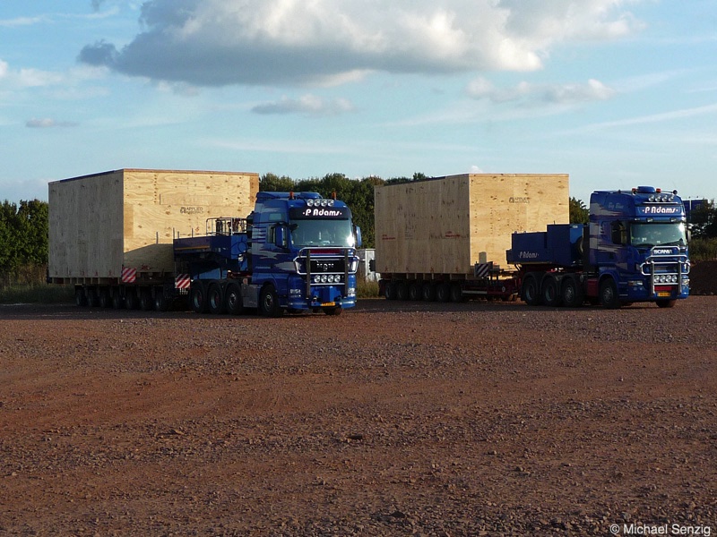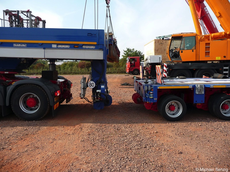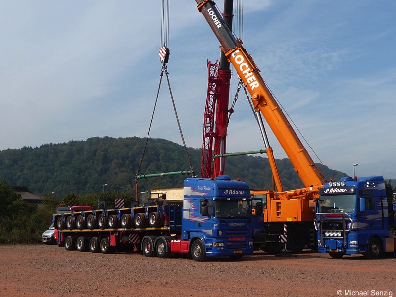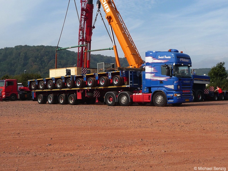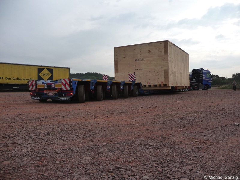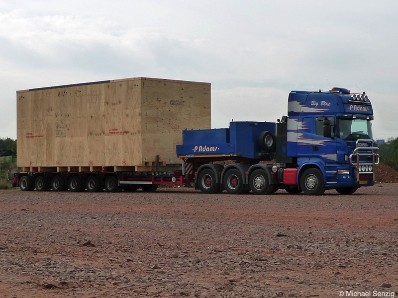 Am 24.09.2009 wurden im Dillinger Hafen zwei zwischengelagerte große Kisten auf zwei Schwertransport-Einheiten von P. Adams verladen. Michael Senzig war dabei und hat einen Teil davon fotografiert.