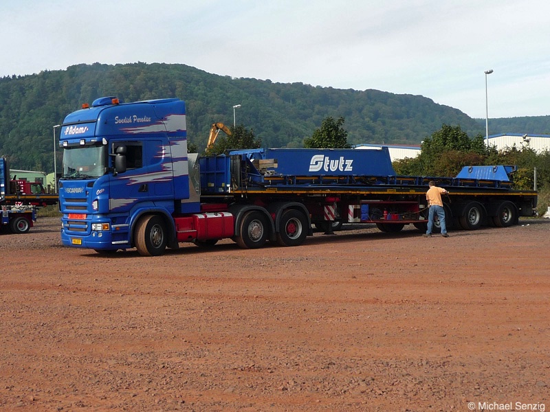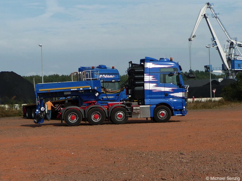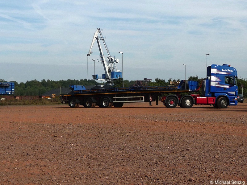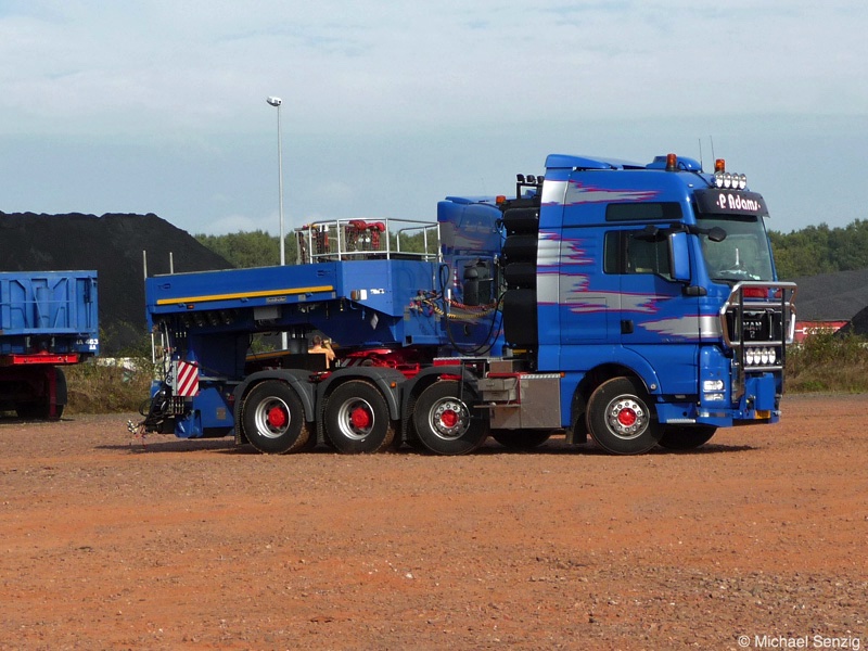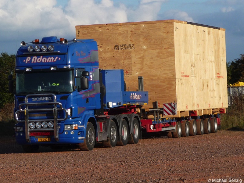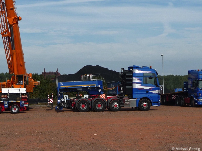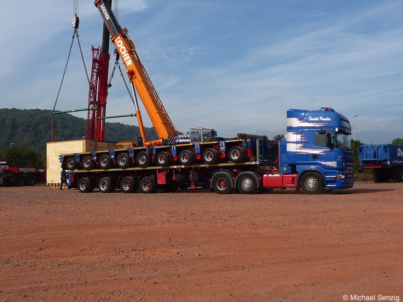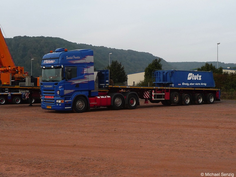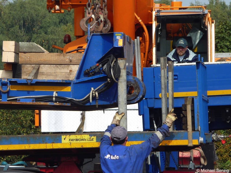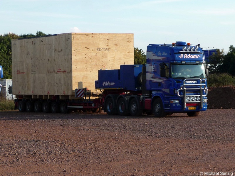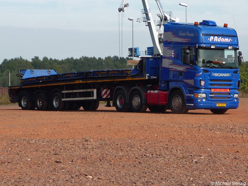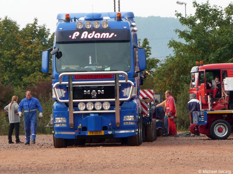 Am 24.09.2009 wurden im Dillinger Hafen zwei zwischengelagerte große Kisten auf zwei Schwertransport-Einheiten von P. Adams verladen. Michael Senzig war dabei und hat einen Teil davon fotografiert.