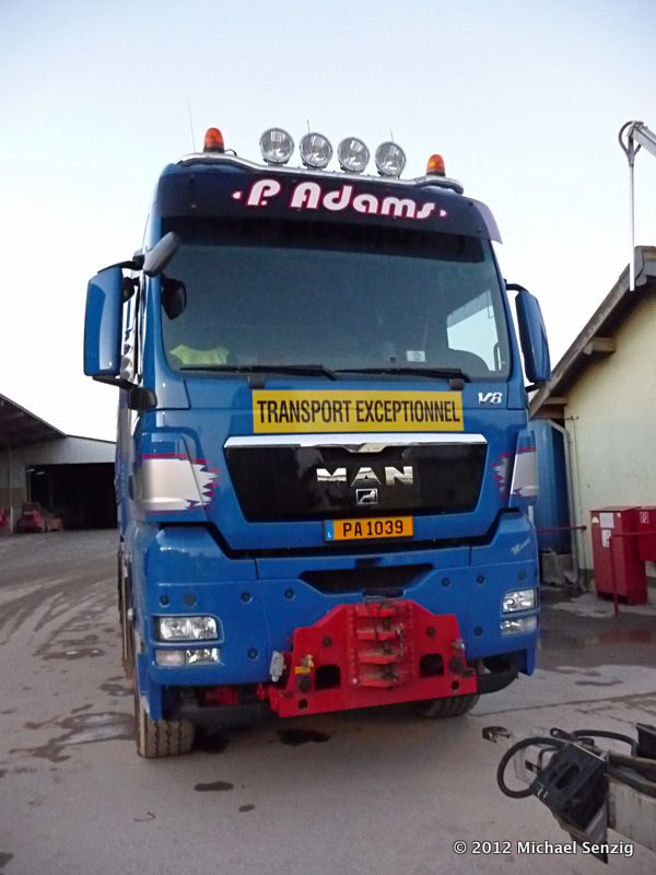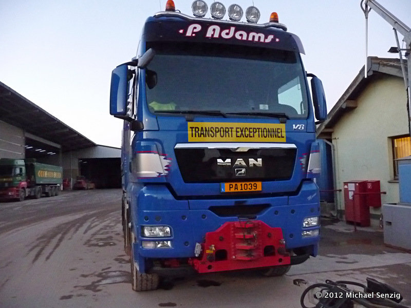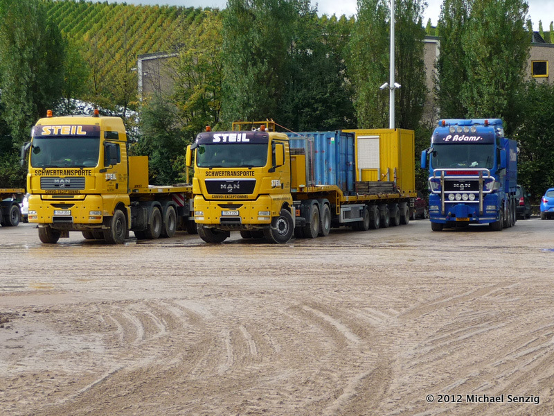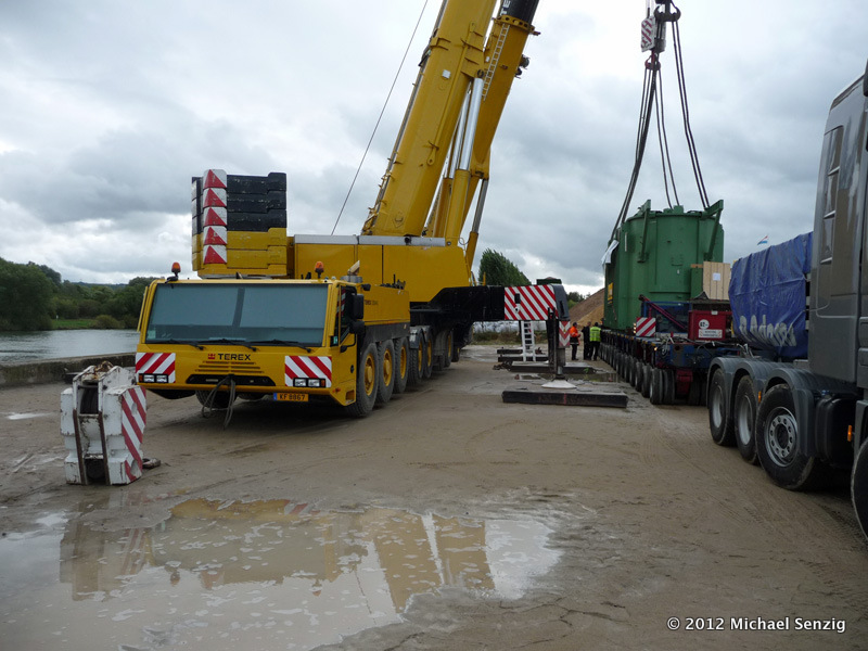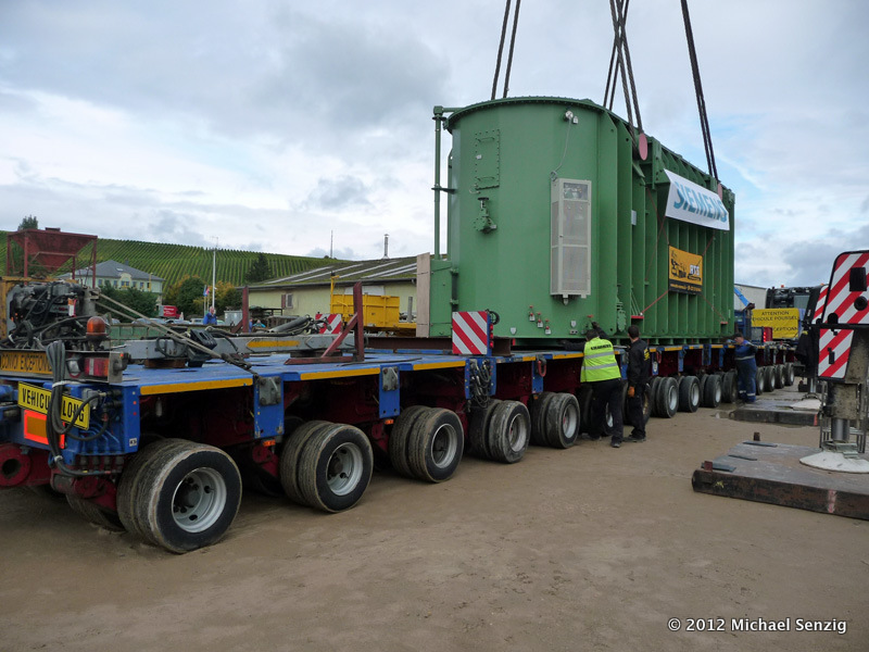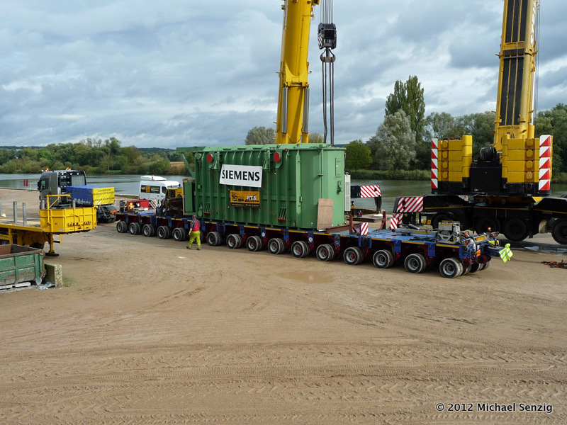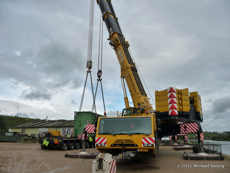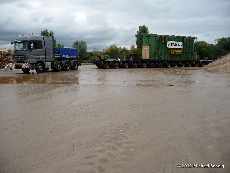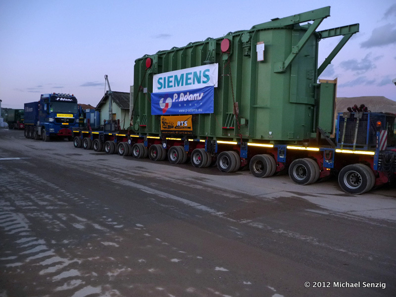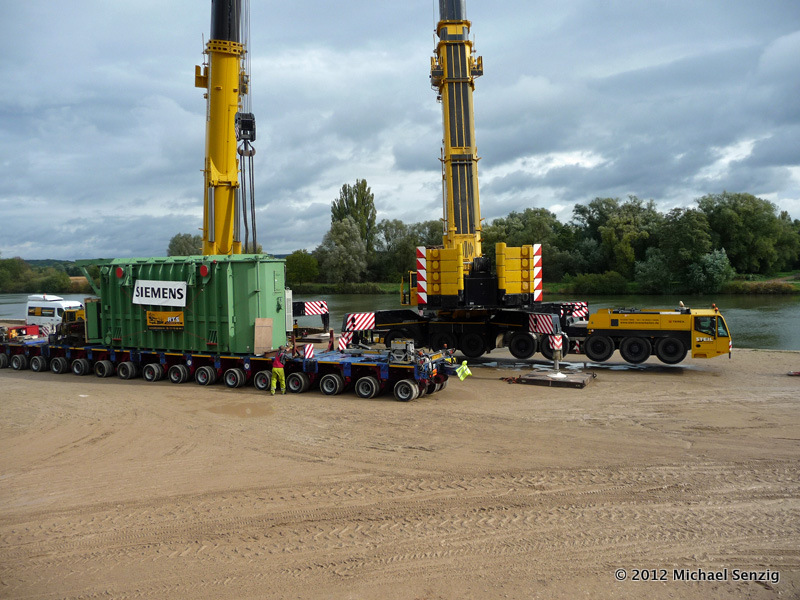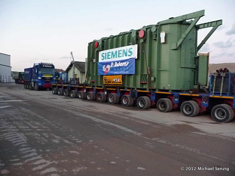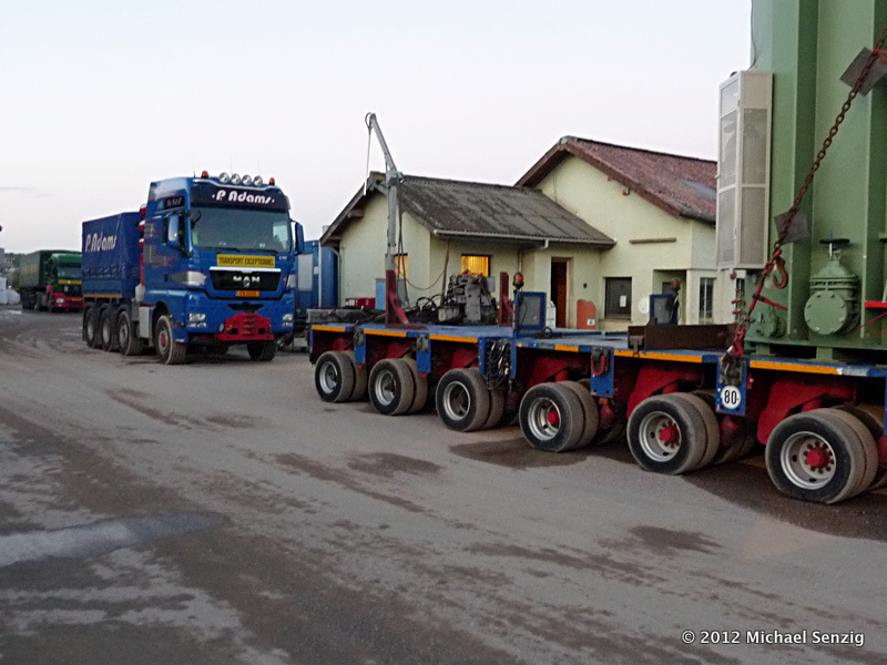 Am 12.10.2012 fand der Umschlag eines Trafos vom Binnenschiff auf einen Schwertransport von P. Adams statt. Der Trafo kam per Binnenschiff über die Mosel nach Bech-Maacher (Luxemburg) zum Gelände der Firma Groupe Hein. Hier gab es genug Platz, um den Trafo auf den Schwertransport umzuschlagen. Steil und ATS (= Steil Luxemburg) war mit zwei Kranen vor Ort, um den Tandemhub durchzuführen. Michael Senzig hat die Verladung beobachtet und auf Fotos dokumentiert. Es ist noch anzumerken, dass P. Adams für den Transport zum Testen einen Mercedes-Benz Actros 4165 verwendet hat. Zusätzlich waren die bieden MAN TGX 41.680 (8x4 und 8x6) dabei.