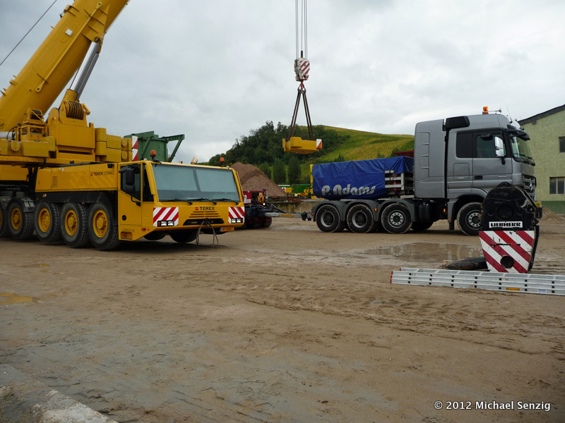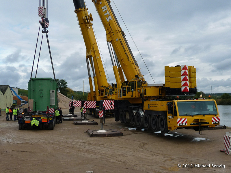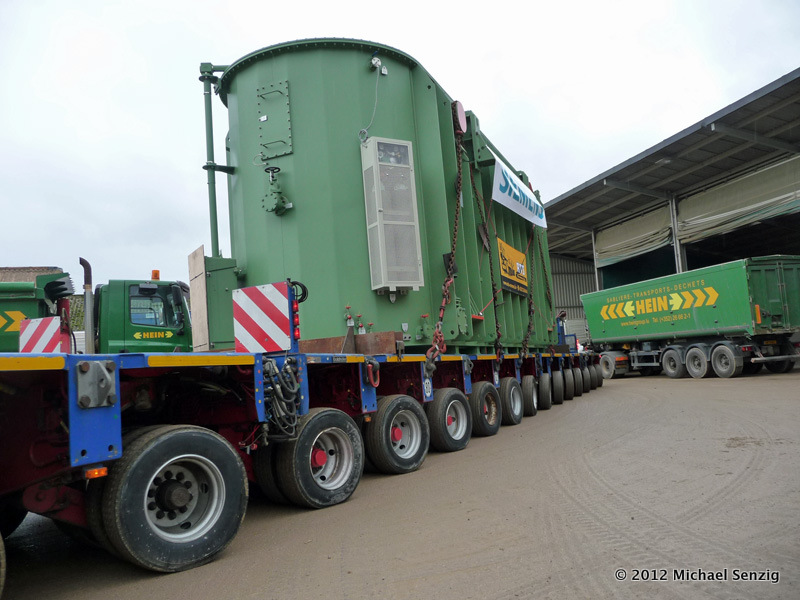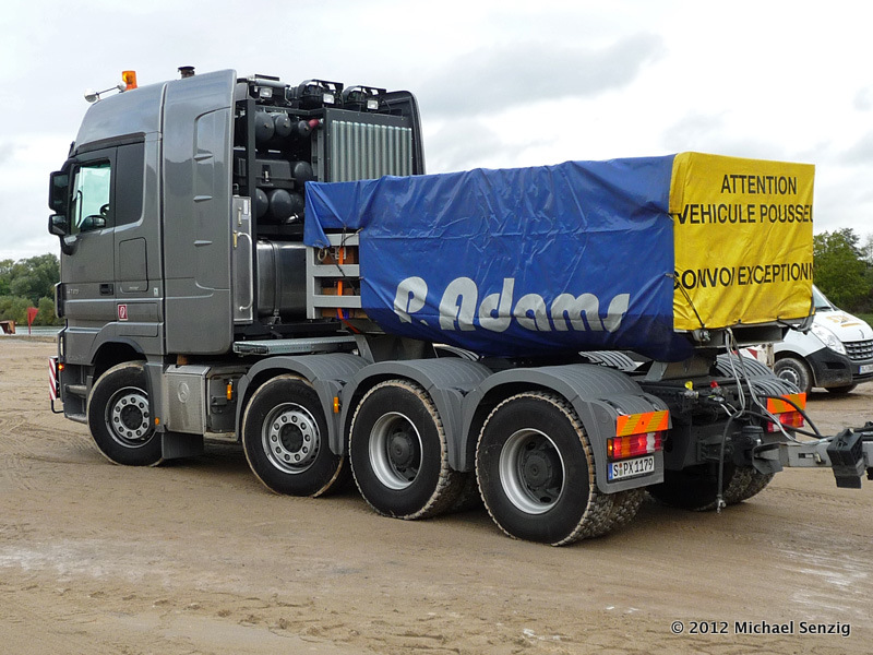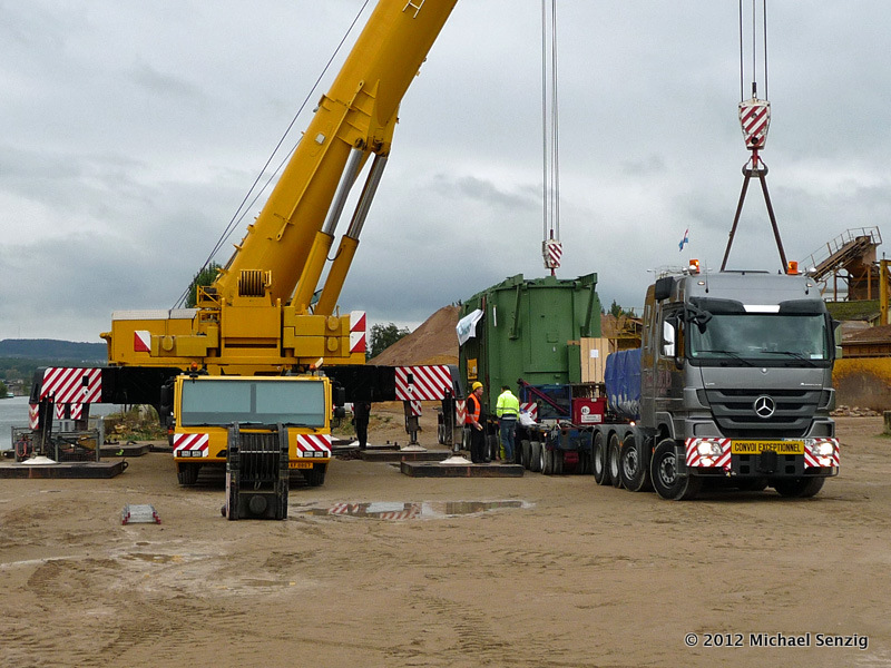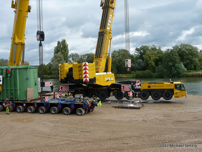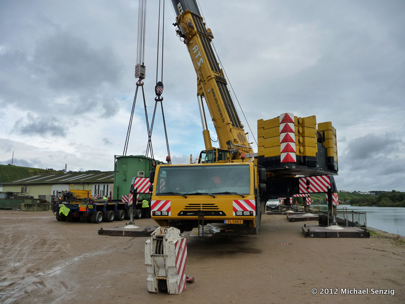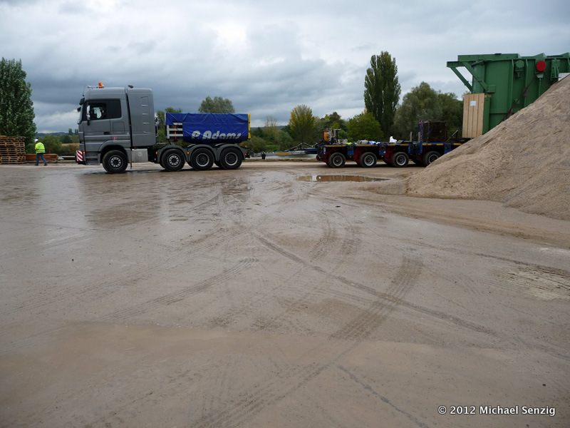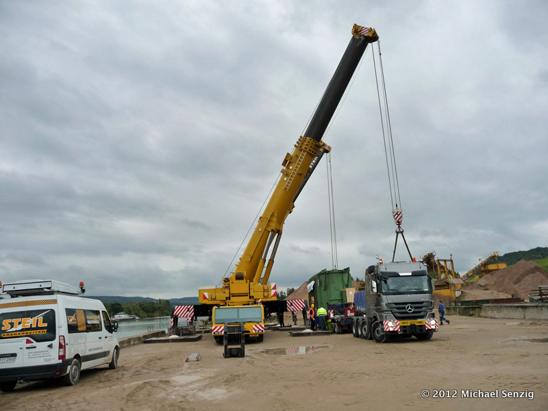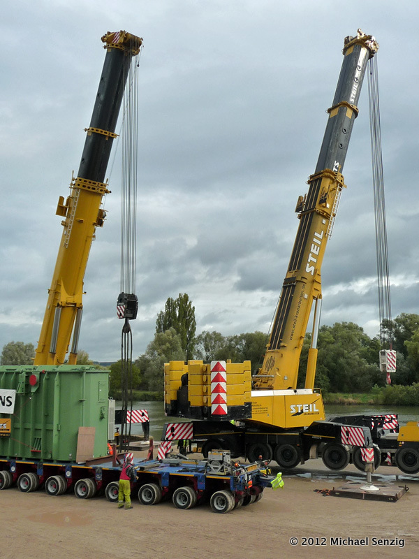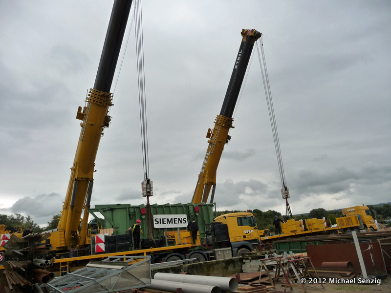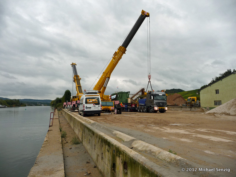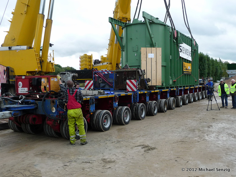 Am 12.10.2012 fand der Umschlag eines Trafos vom Binnenschiff auf einen Schwertransport von P. Adams statt. Der Trafo kam per Binnenschiff über die Mosel nach Bech-Maacher (Luxemburg) zum Gelände der Firma Groupe Hein. Hier gab es genug Platz, um den Trafo auf den Schwertransport umzuschlagen. Steil und ATS (= Steil Luxemburg) war mit zwei Kranen vor Ort, um den Tandemhub durchzuführen. Michael Senzig hat die Verladung beobachtet und auf Fotos dokumentiert. Es ist noch anzumerken, dass P. Adams für den Transport zum Testen einen Mercedes-Benz Actros 4165 verwendet hat. Zusätzlich waren die bieden MAN TGX 41.680 (8x4 und 8x6) dabei.