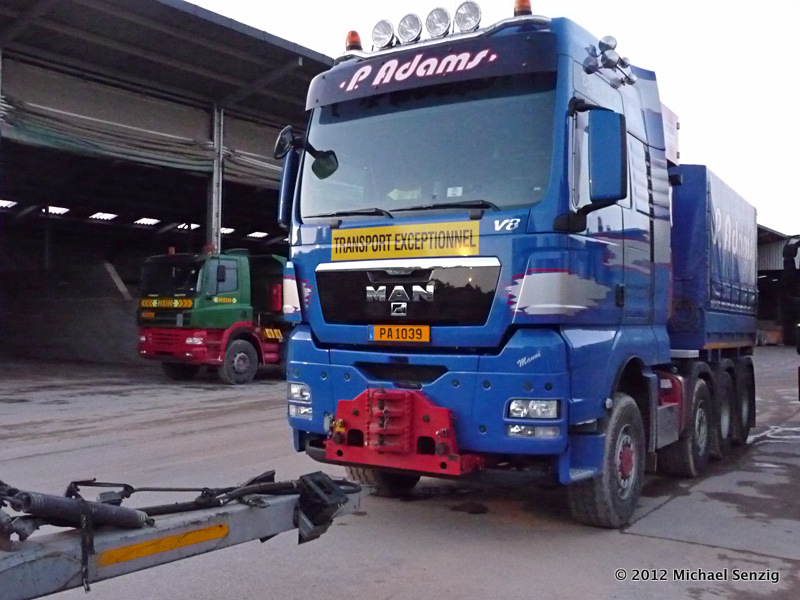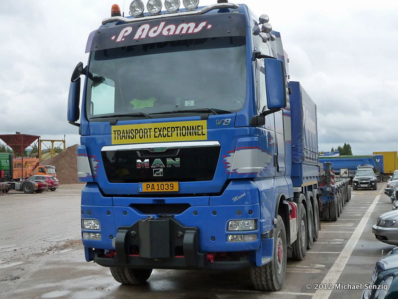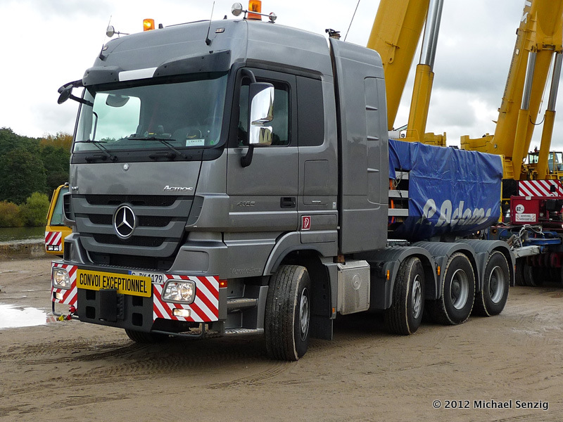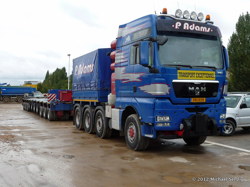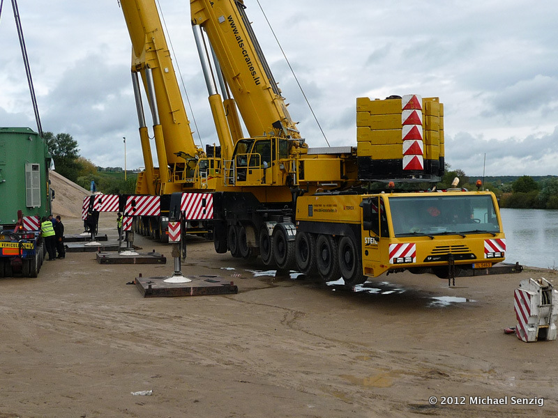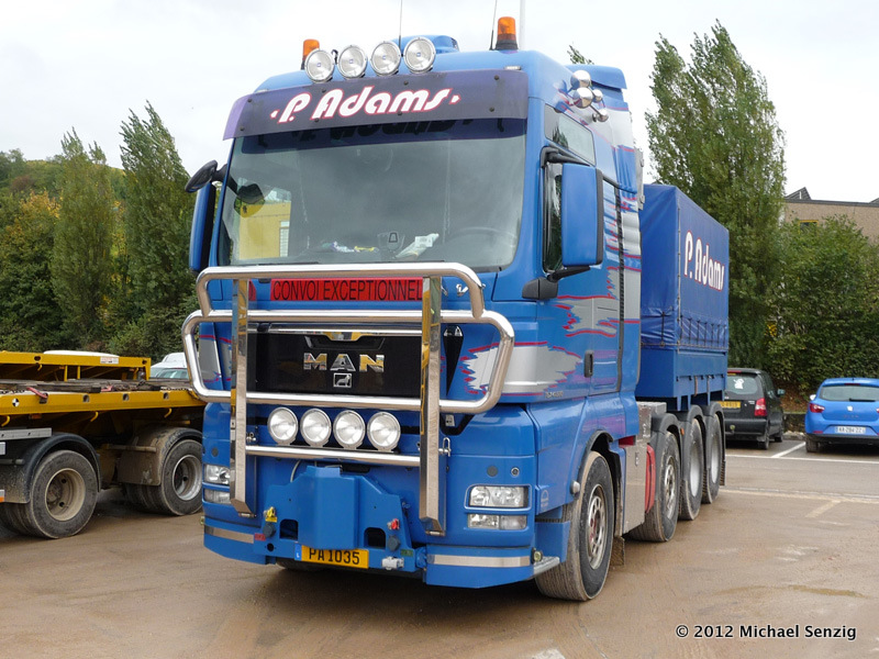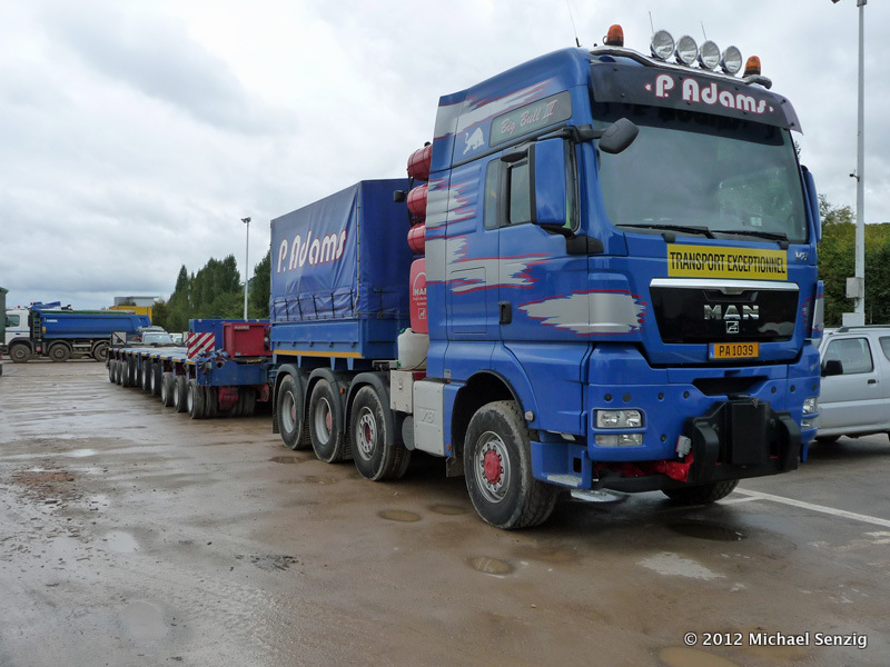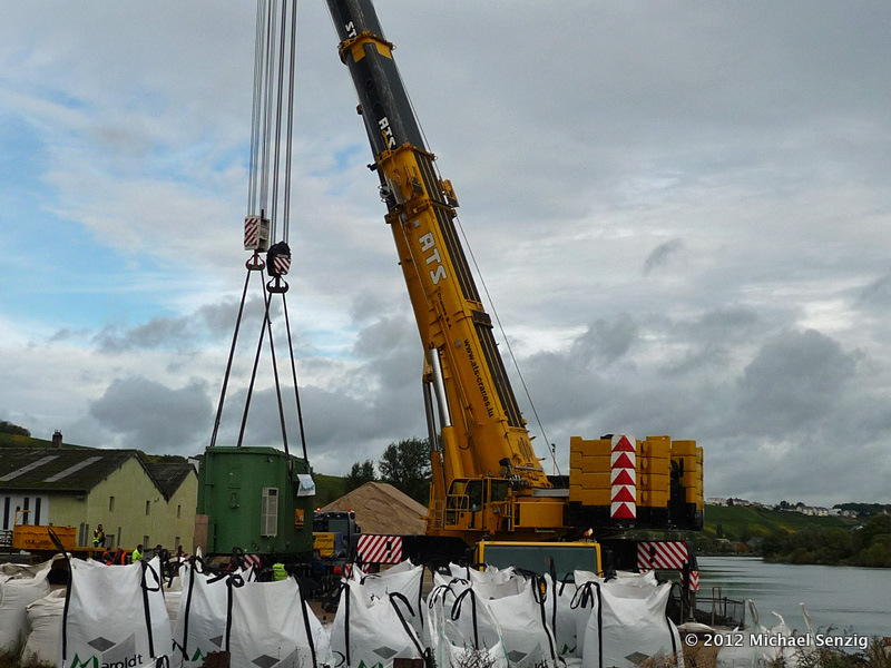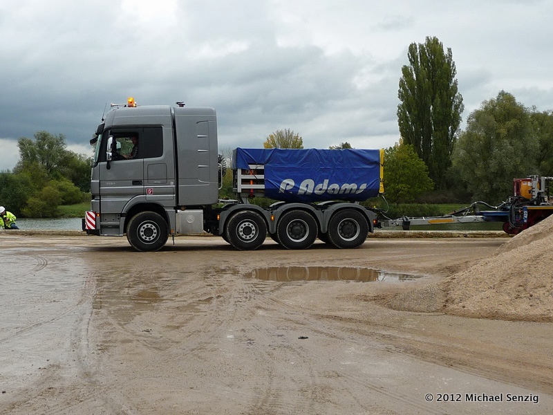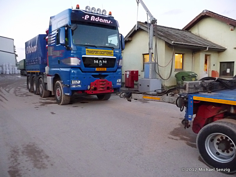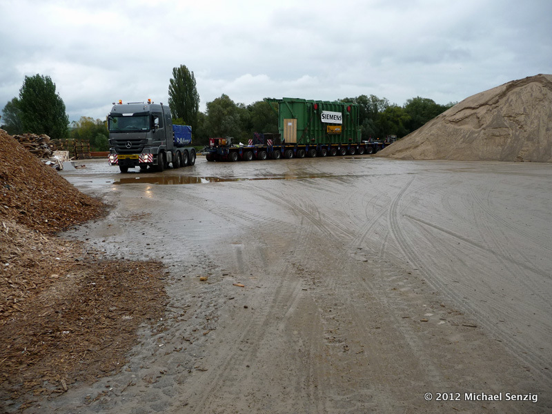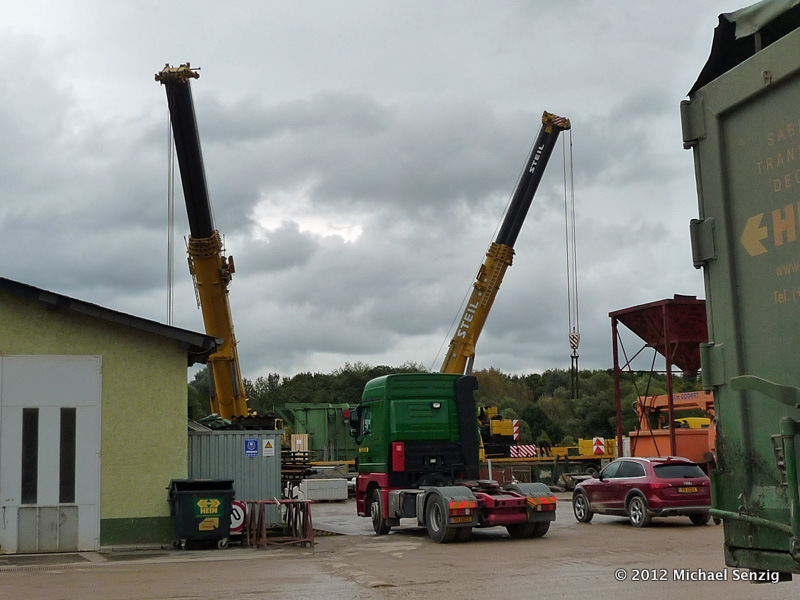 Am 12.10.2012 fand der Umschlag eines Trafos vom Binnenschiff auf einen Schwertransport von P. Adams statt. Der Trafo kam per Binnenschiff über die Mosel nach Bech-Maacher (Luxemburg) zum Gelände der Firma Groupe Hein. Hier gab es genug Platz, um den Trafo auf den Schwertransport umzuschlagen. Steil und ATS (= Steil Luxemburg) war mit zwei Kranen vor Ort, um den Tandemhub durchzuführen. Michael Senzig hat die Verladung beobachtet und auf Fotos dokumentiert. Es ist noch anzumerken, dass P. Adams für den Transport zum Testen einen Mercedes-Benz Actros 4165 verwendet hat. Zusätzlich waren die bieden MAN TGX 41.680 (8x4 und 8x6) dabei.