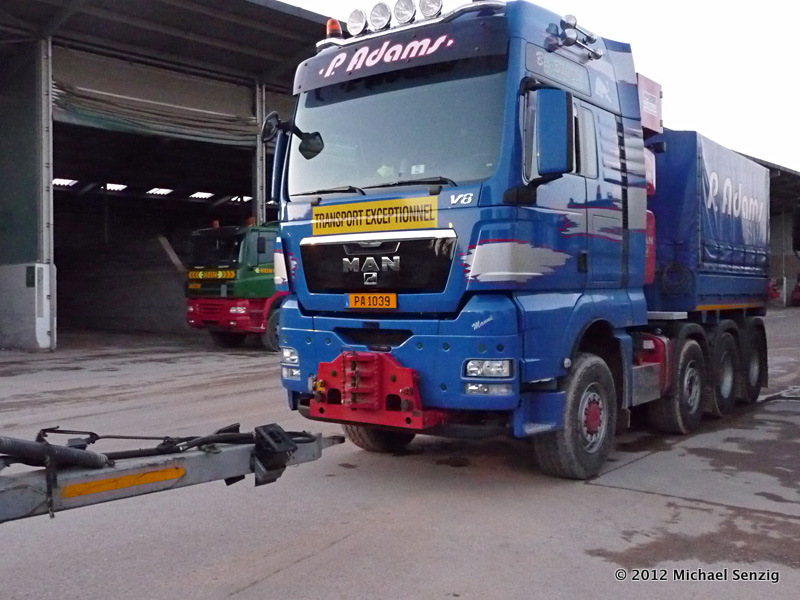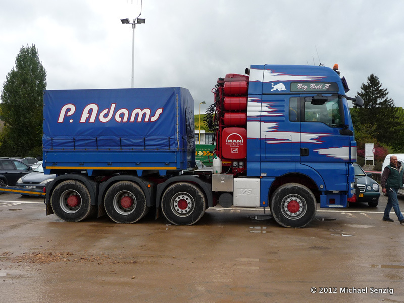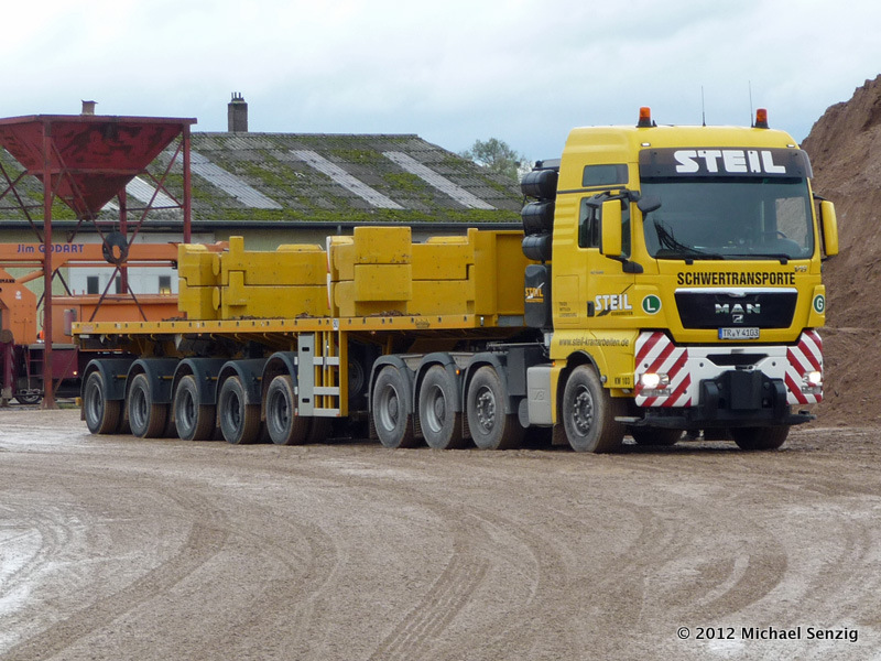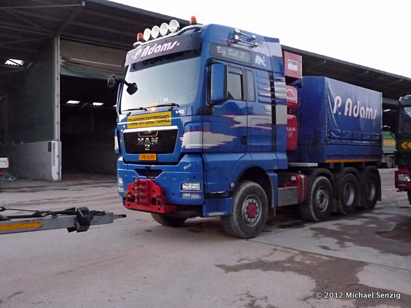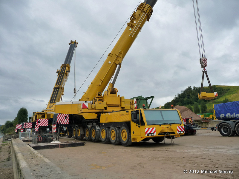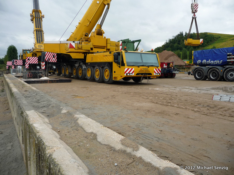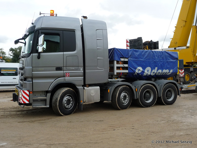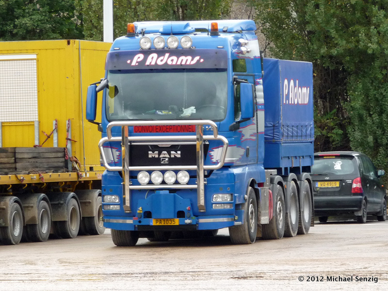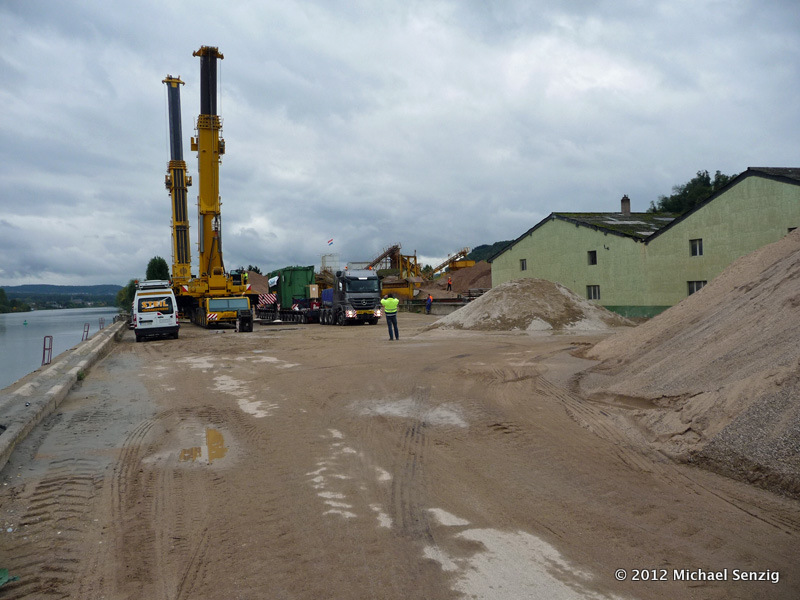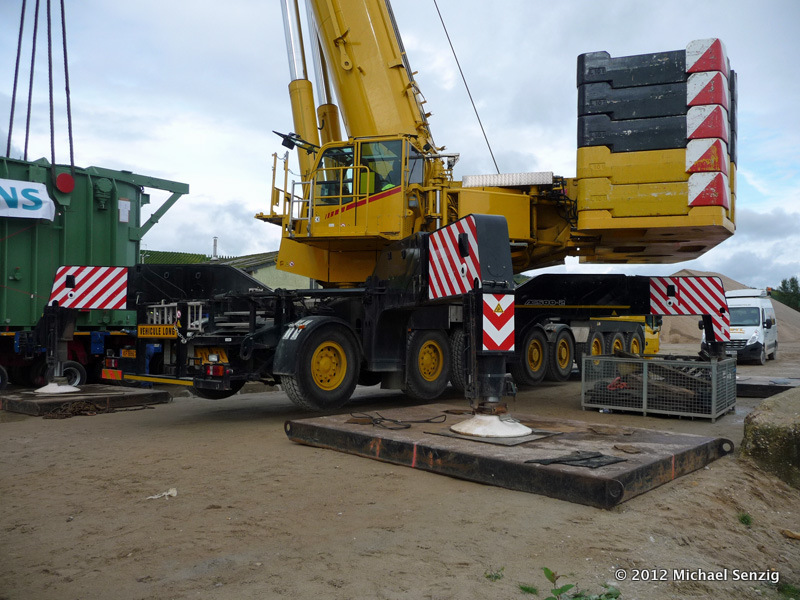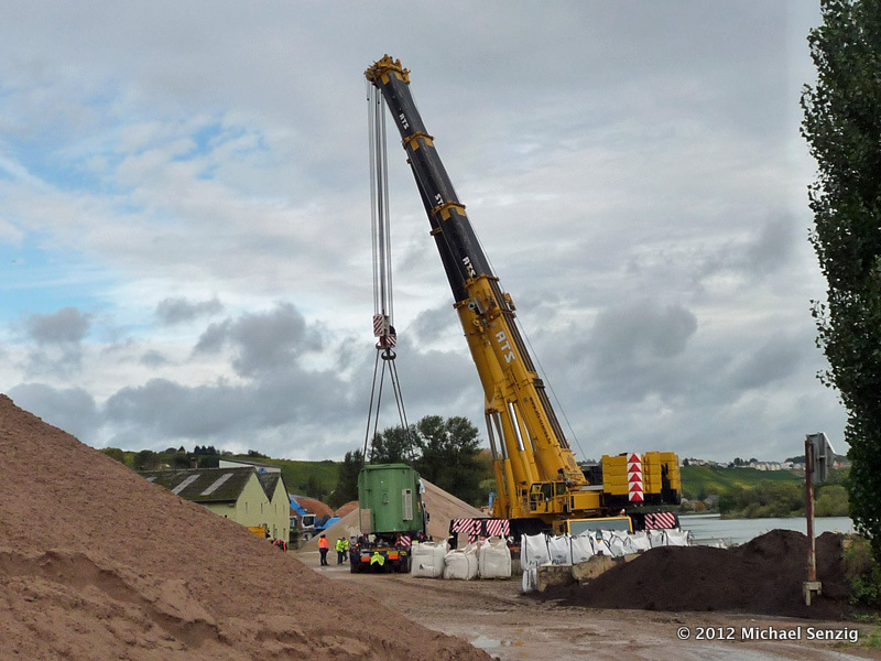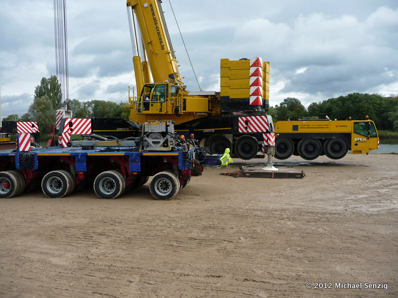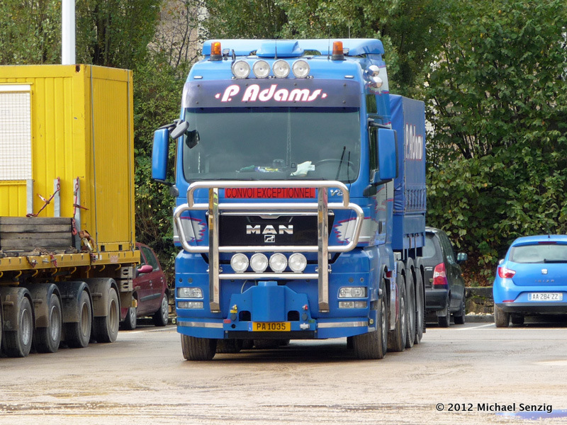 Am 12.10.2012 fand der Umschlag eines Trafos vom Binnenschiff auf einen Schwertransport von P. Adams statt. Der Trafo kam per Binnenschiff über die Mosel nach Bech-Maacher (Luxemburg) zum Gelände der Firma Groupe Hein. Hier gab es genug Platz, um den Trafo auf den Schwertransport umzuschlagen. Steil und ATS (= Steil Luxemburg) war mit zwei Kranen vor Ort, um den Tandemhub durchzuführen. Michael Senzig hat die Verladung beobachtet und auf Fotos dokumentiert. Es ist noch anzumerken, dass P. Adams für den Transport zum Testen einen Mercedes-Benz Actros 4165 verwendet hat. Zusätzlich waren die bieden MAN TGX 41.680 (8x4 und 8x6) dabei.