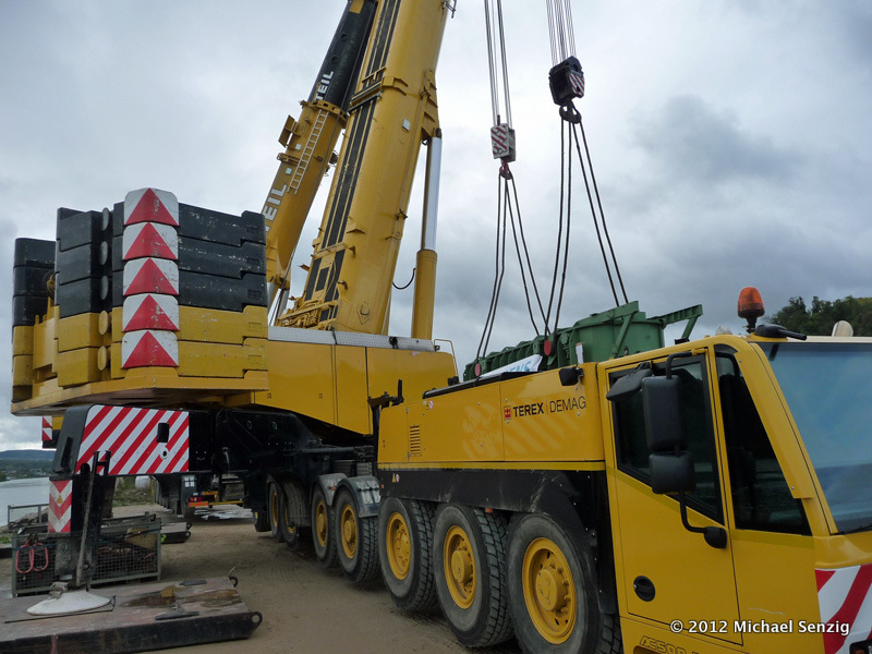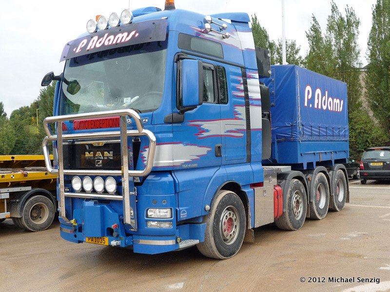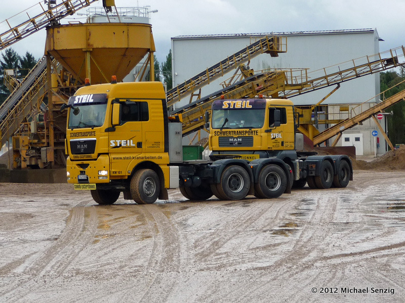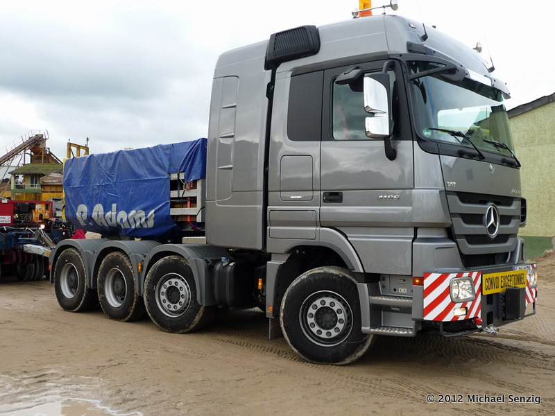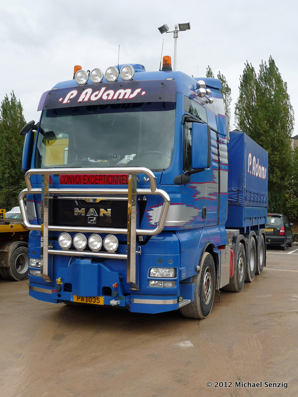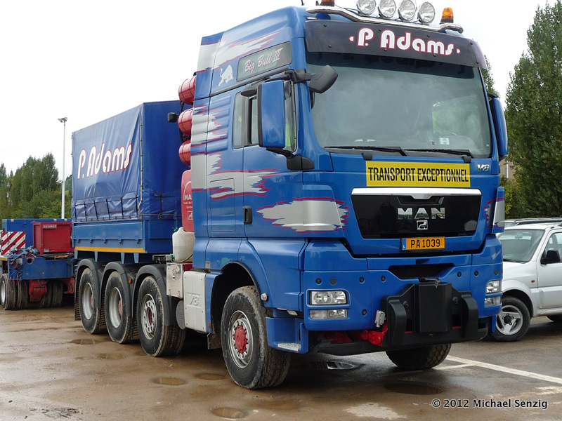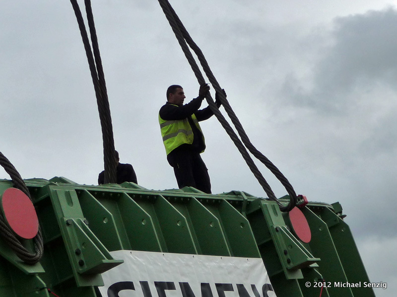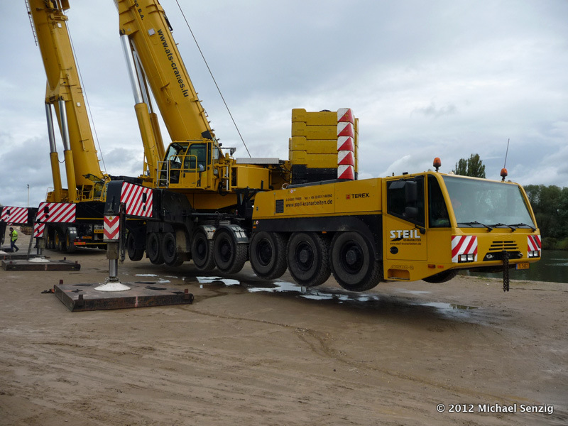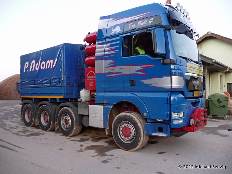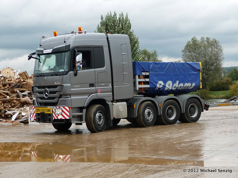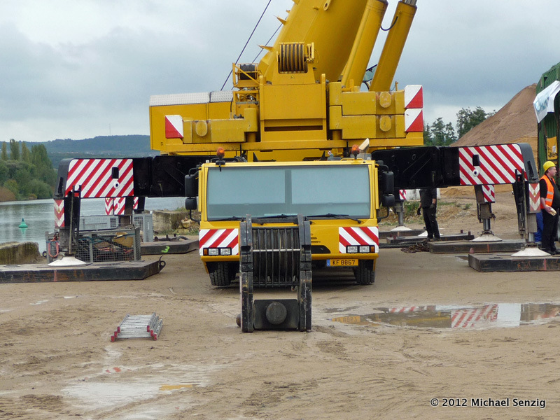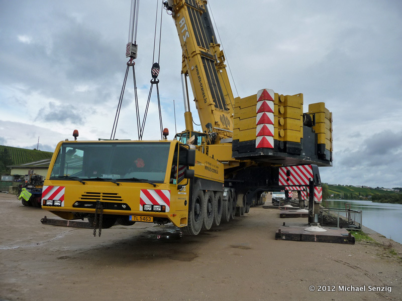 Am 12.10.2012 fand der Umschlag eines Trafos vom Binnenschiff auf einen Schwertransport von P. Adams statt. Der Trafo kam per Binnenschiff über die Mosel nach Bech-Maacher (Luxemburg) zum Gelände der Firma Groupe Hein. Hier gab es genug Platz, um den Trafo auf den Schwertransport umzuschlagen. Steil und ATS (= Steil Luxemburg) war mit zwei Kranen vor Ort, um den Tandemhub durchzuführen. Michael Senzig hat die Verladung beobachtet und auf Fotos dokumentiert. Es ist noch anzumerken, dass P. Adams für den Transport zum Testen einen Mercedes-Benz Actros 4165 verwendet hat. Zusätzlich waren die bieden MAN TGX 41.680 (8x4 und 8x6) dabei.